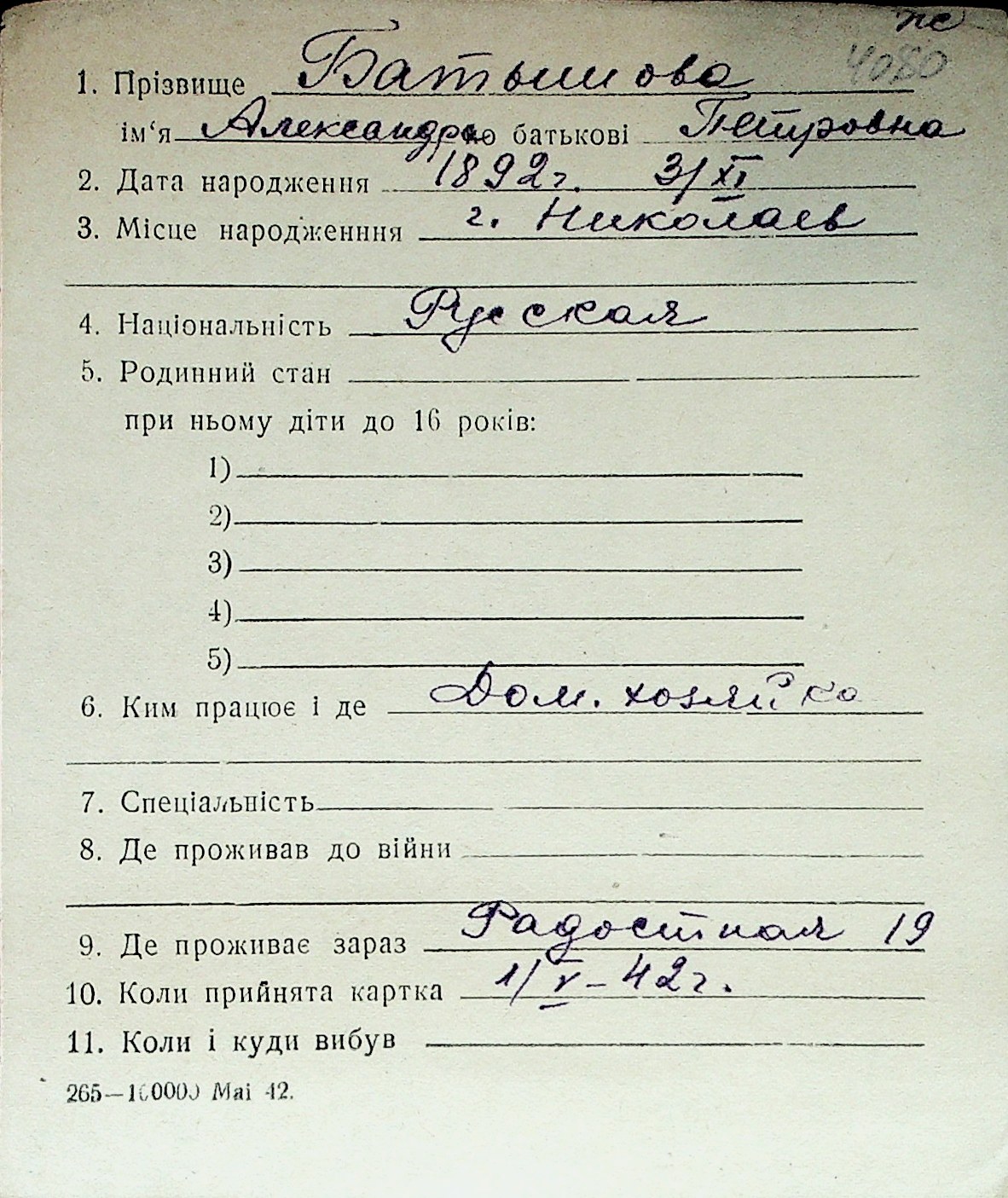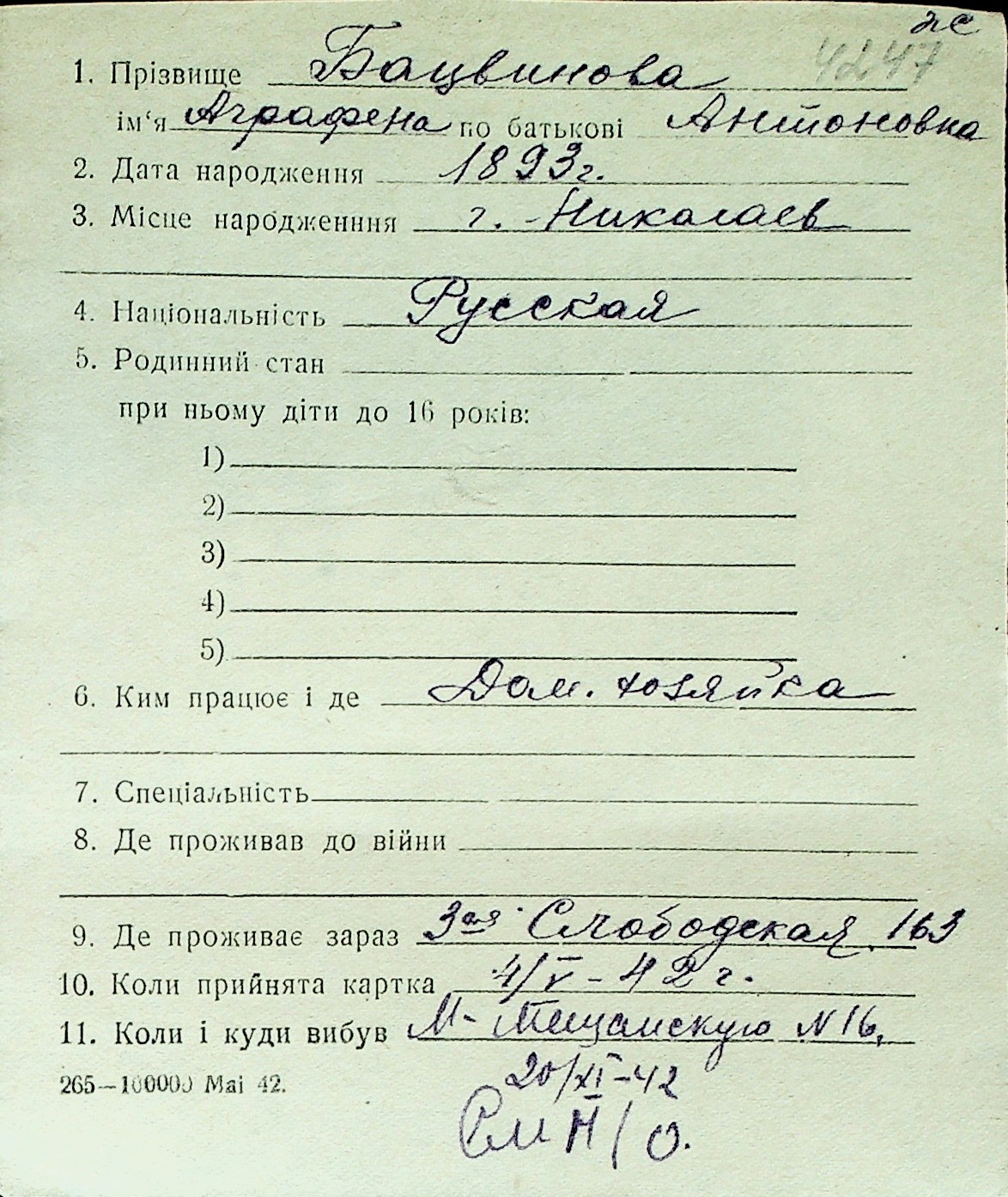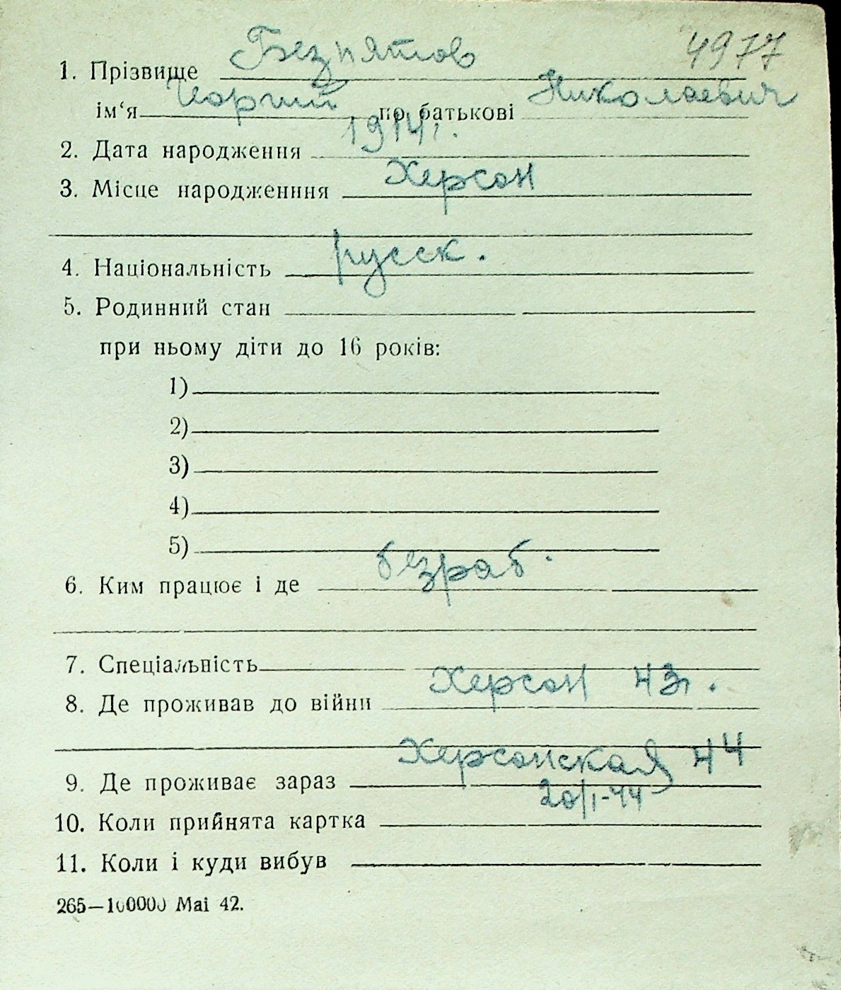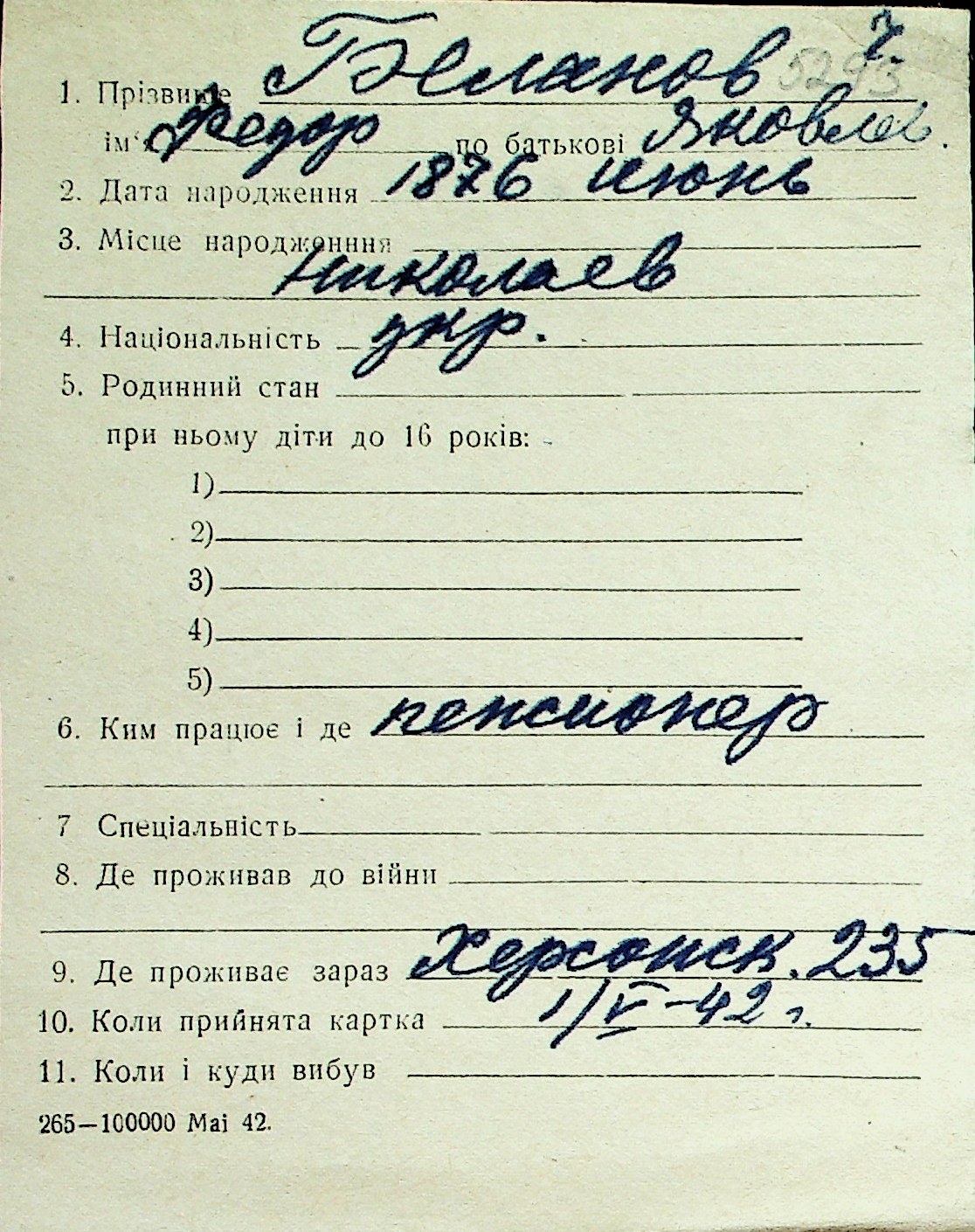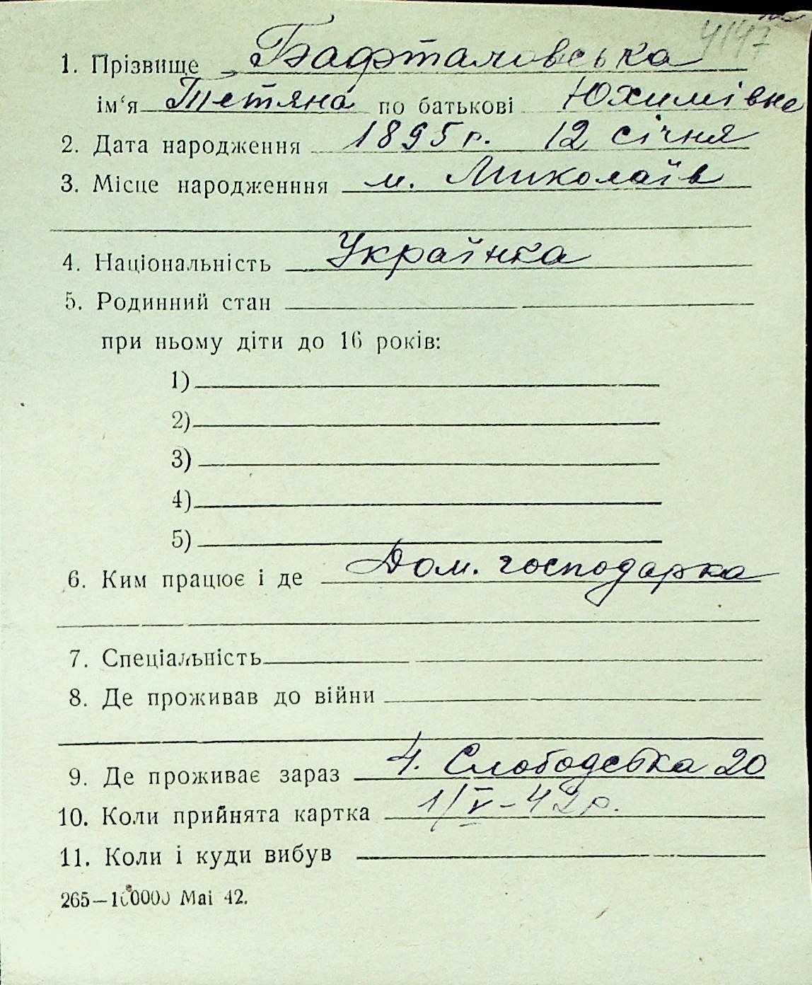◦ ◦ Перелік карток на осіб, які мешкали у м. Миколаїв у період окупації 1941–1944 років