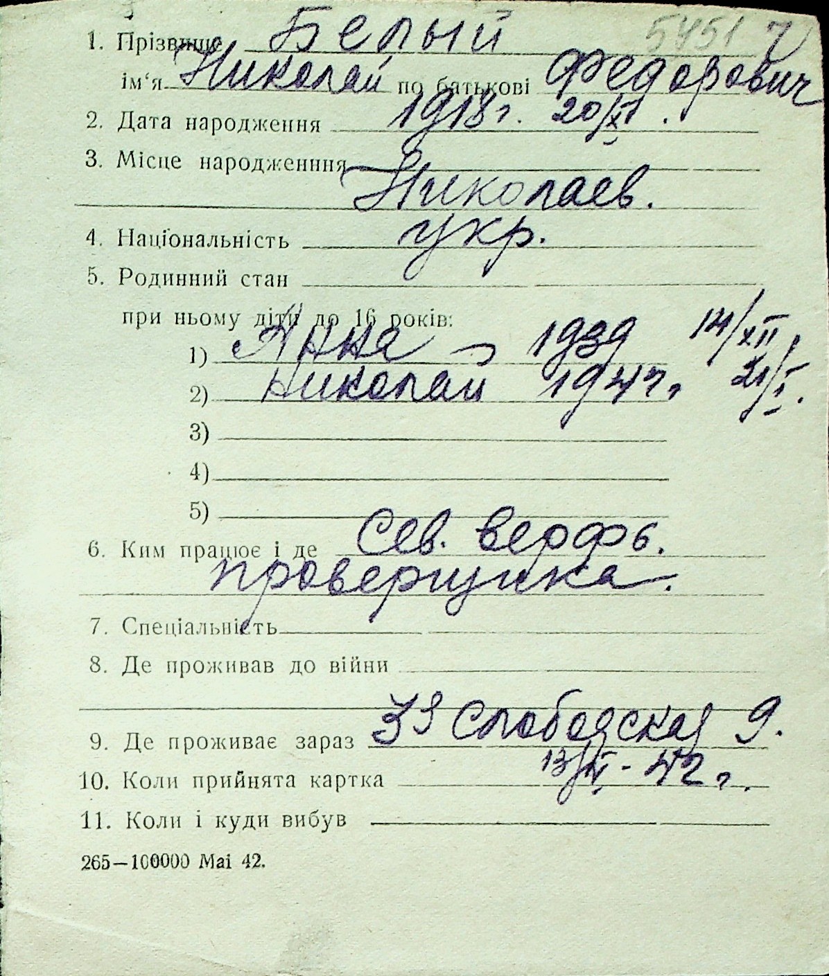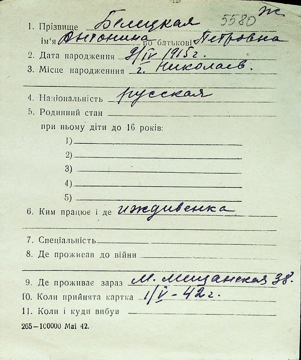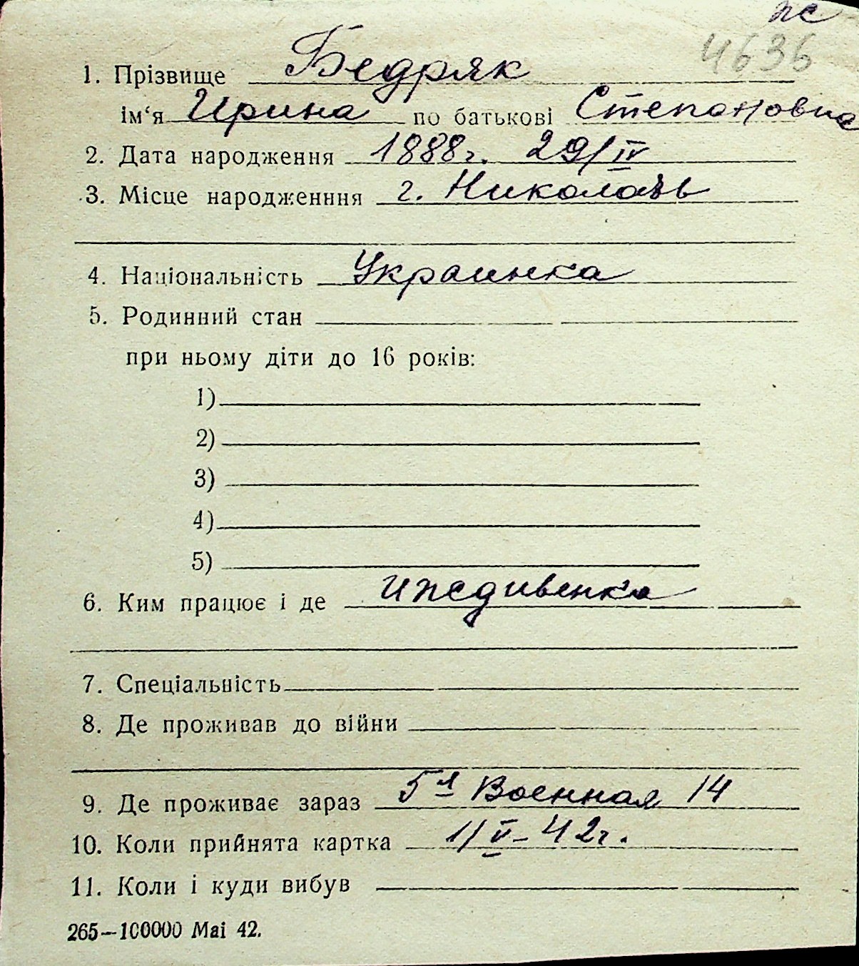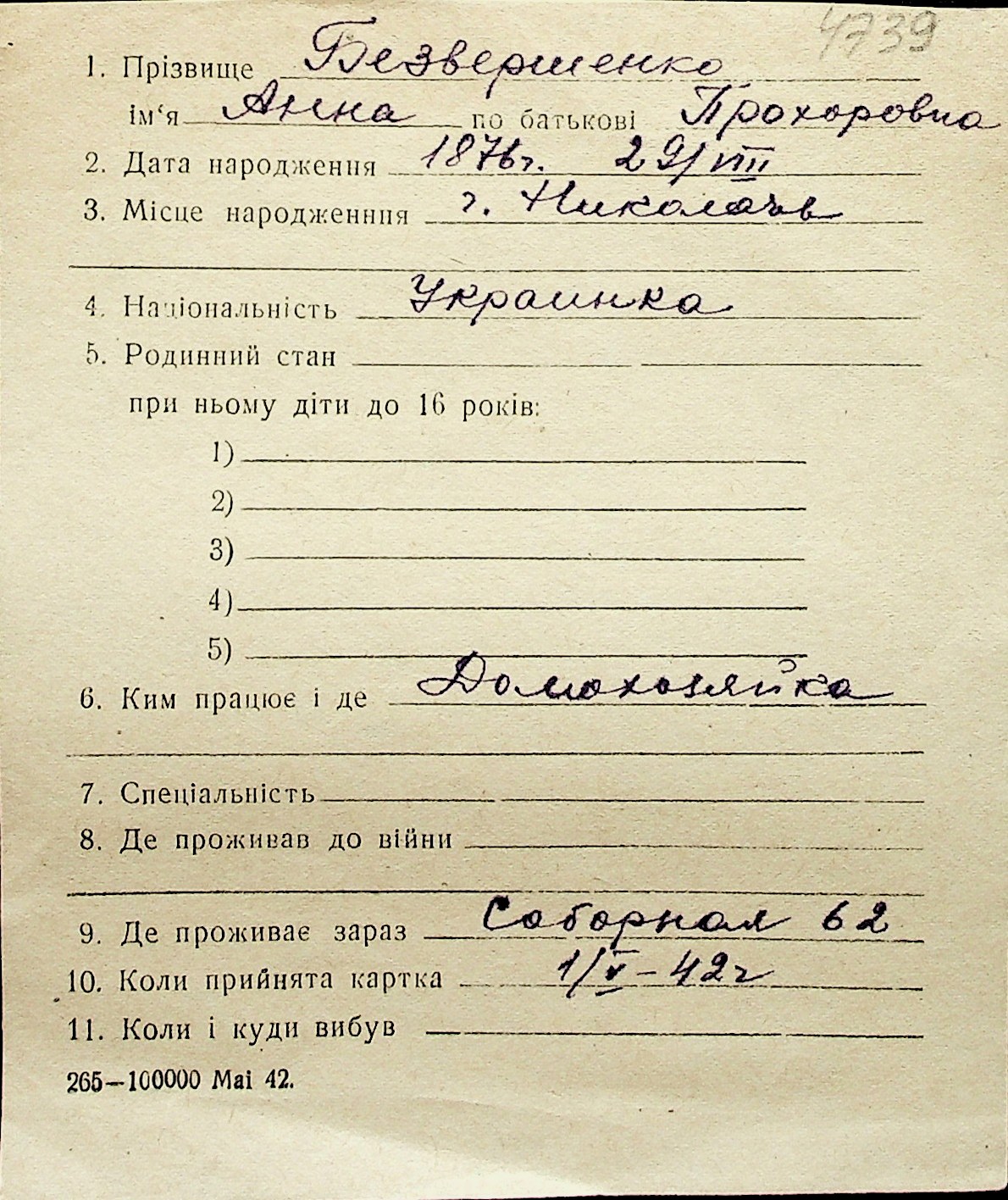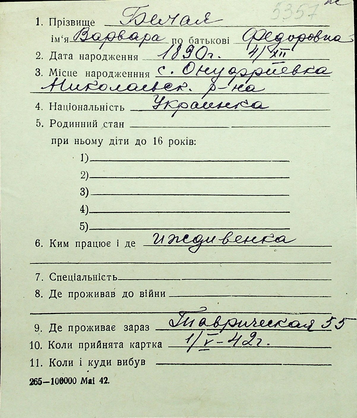 ◦ ◦ Перелік карток на осіб, які мешкали у м. Миколаїв у період окупації 1941–1944 років