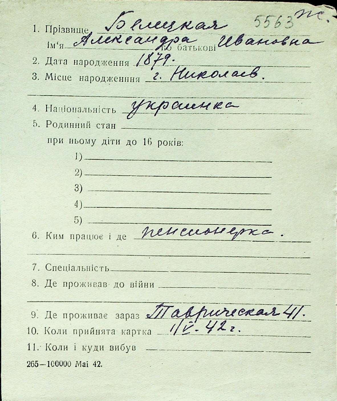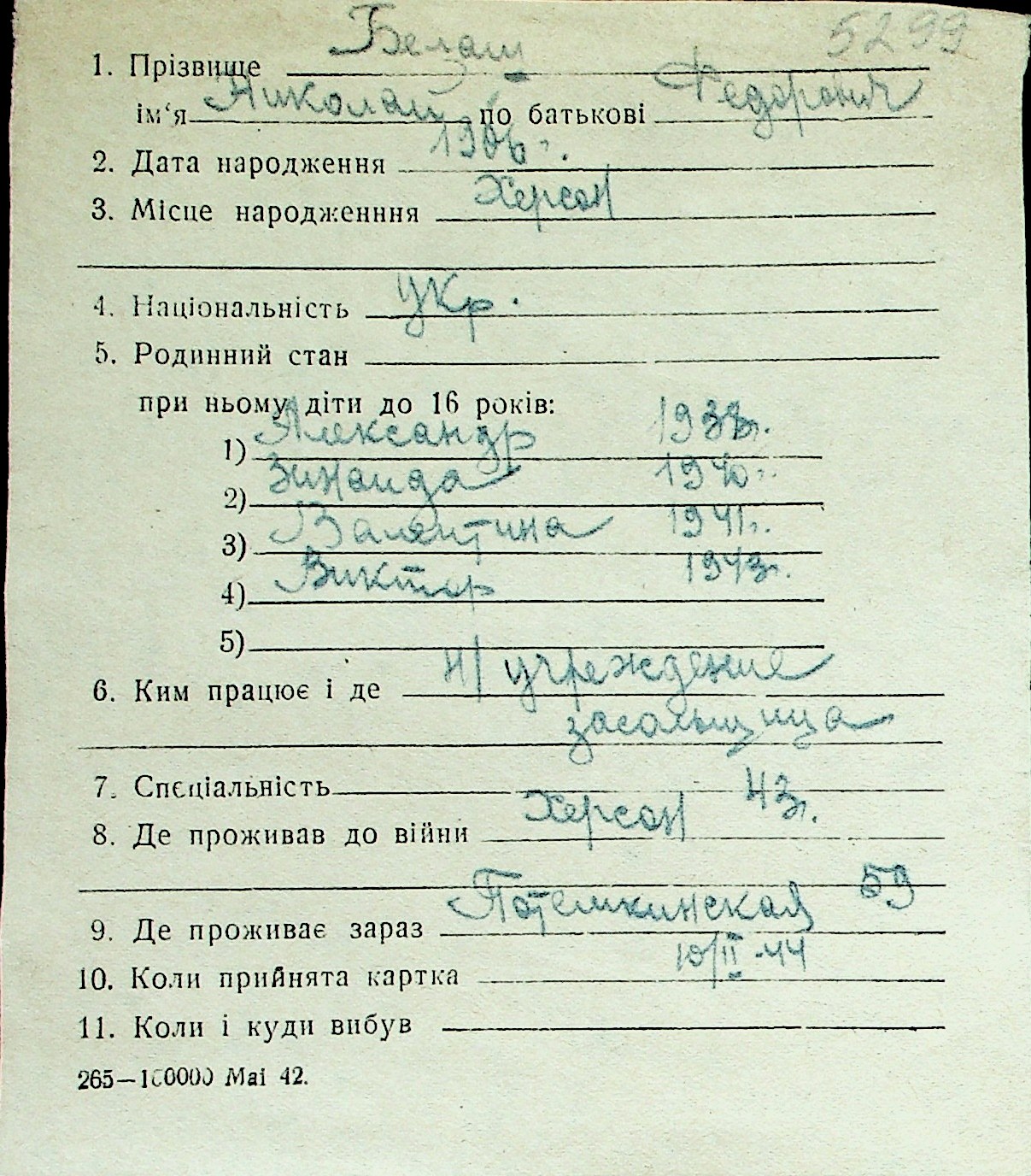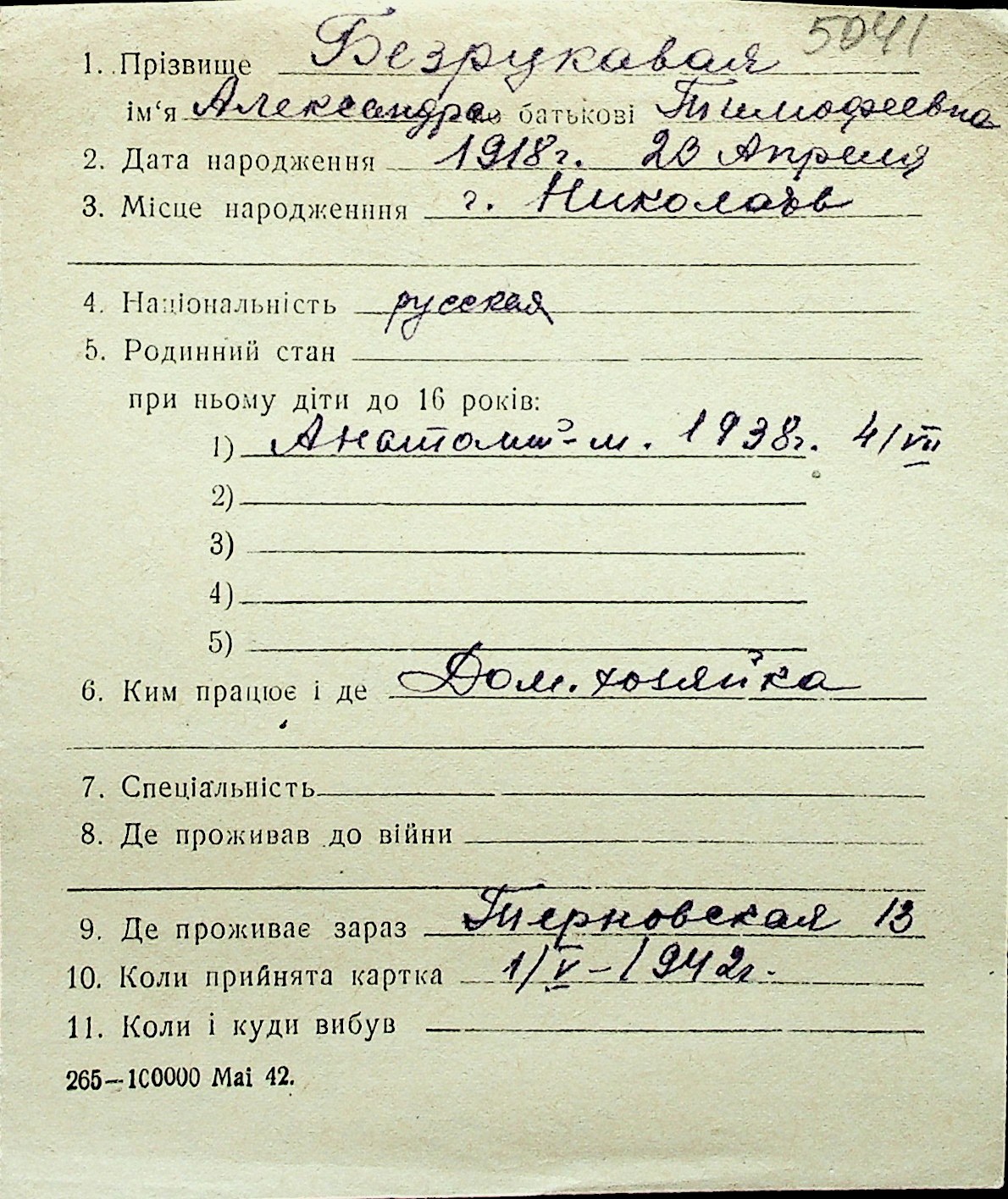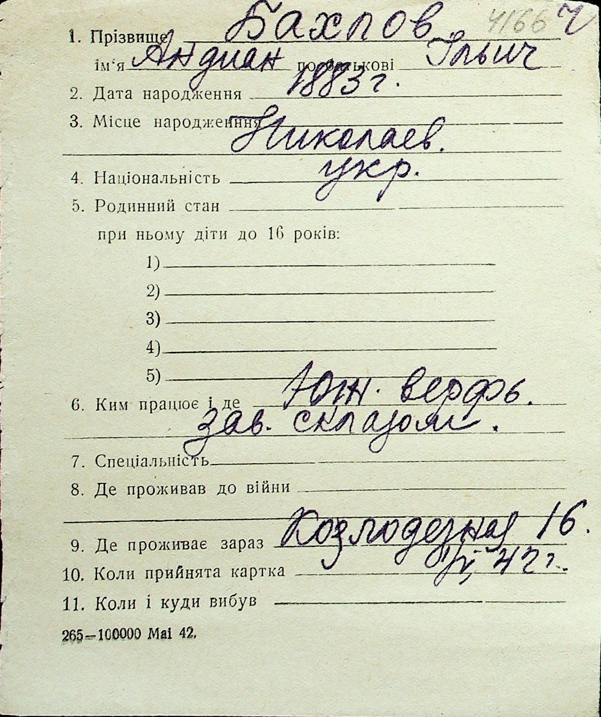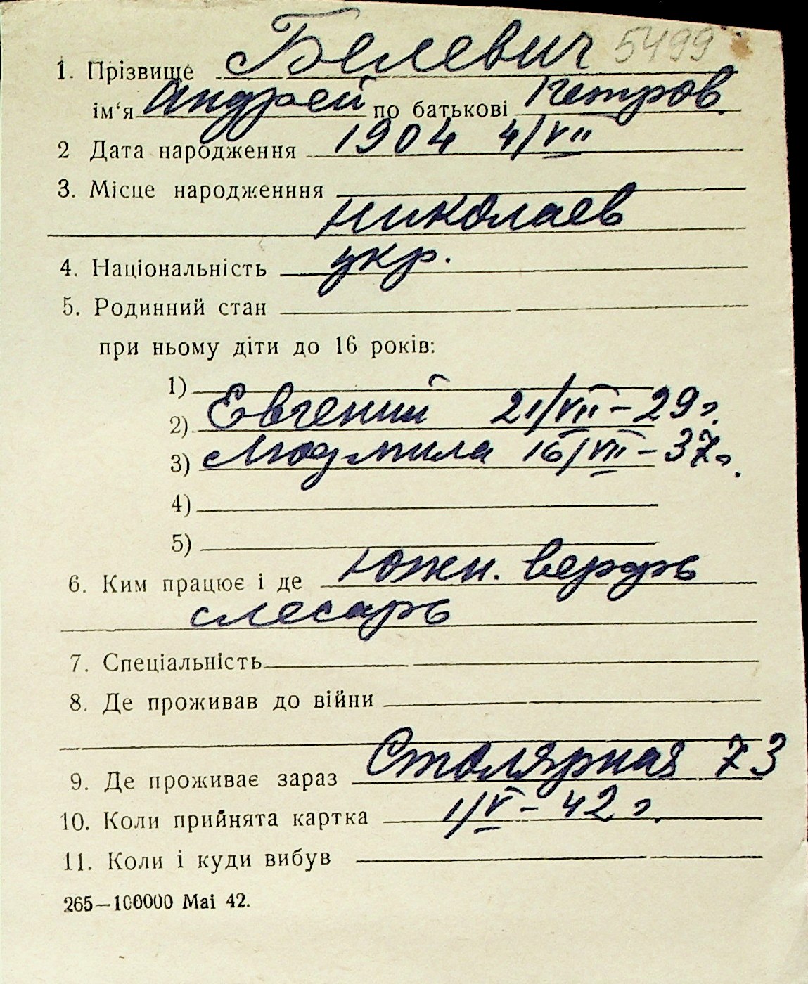 ◦ ◦ Перелік карток на осіб, які мешкали у м. Миколаїв у період окупації 1941–1944 років