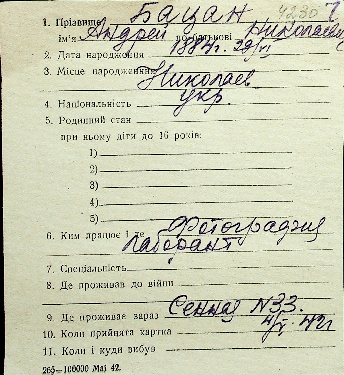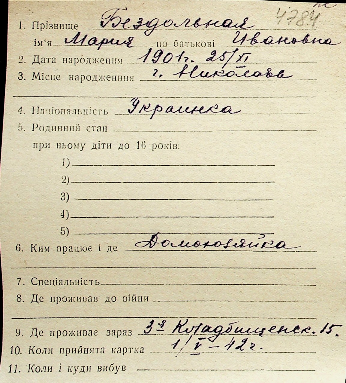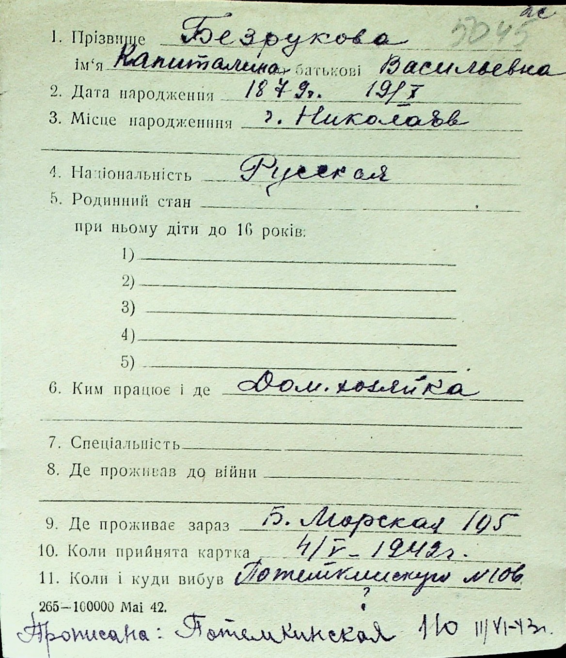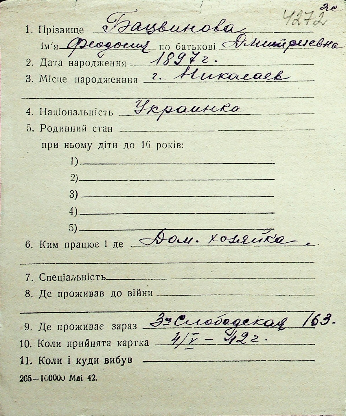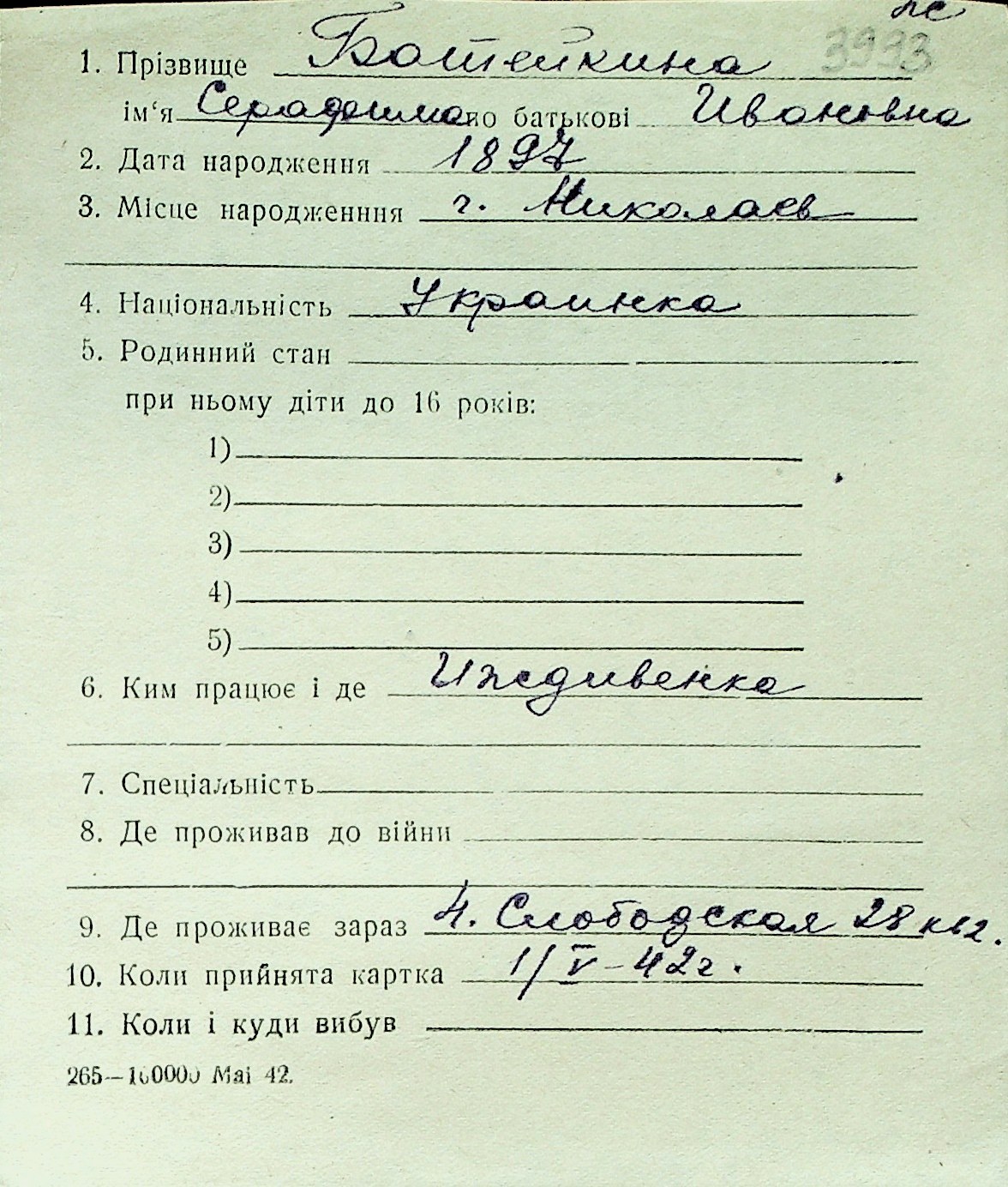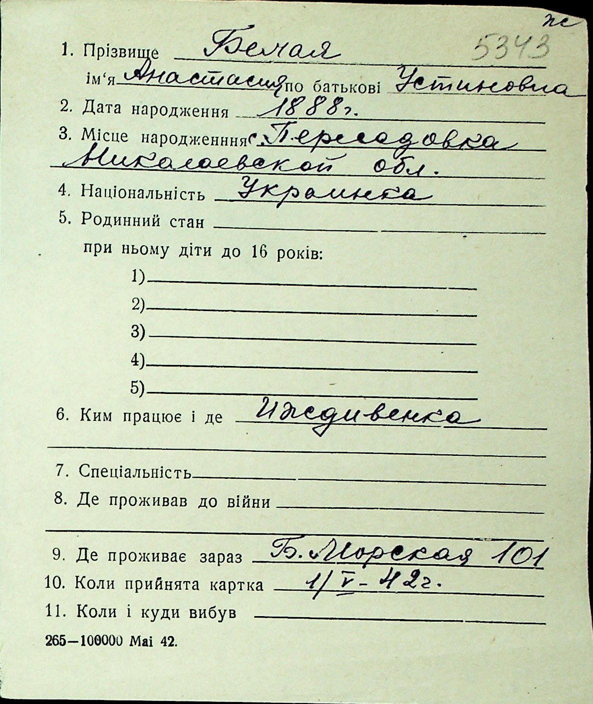 ◦ ◦ Перелік карток на осіб, які мешкали у м. Миколаїв у період окупації 1941–1944 років