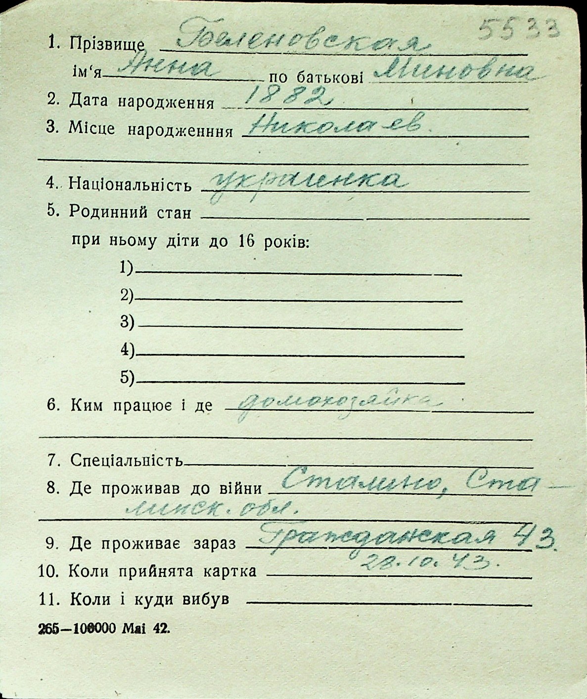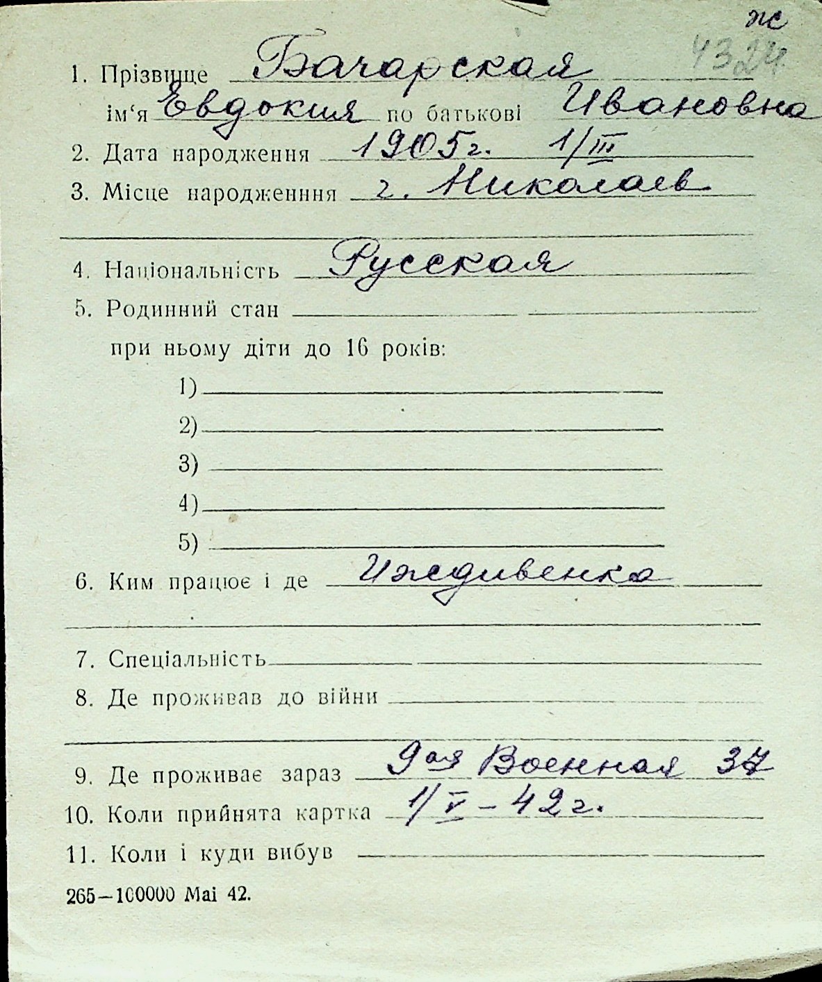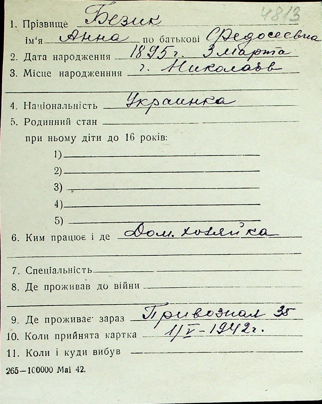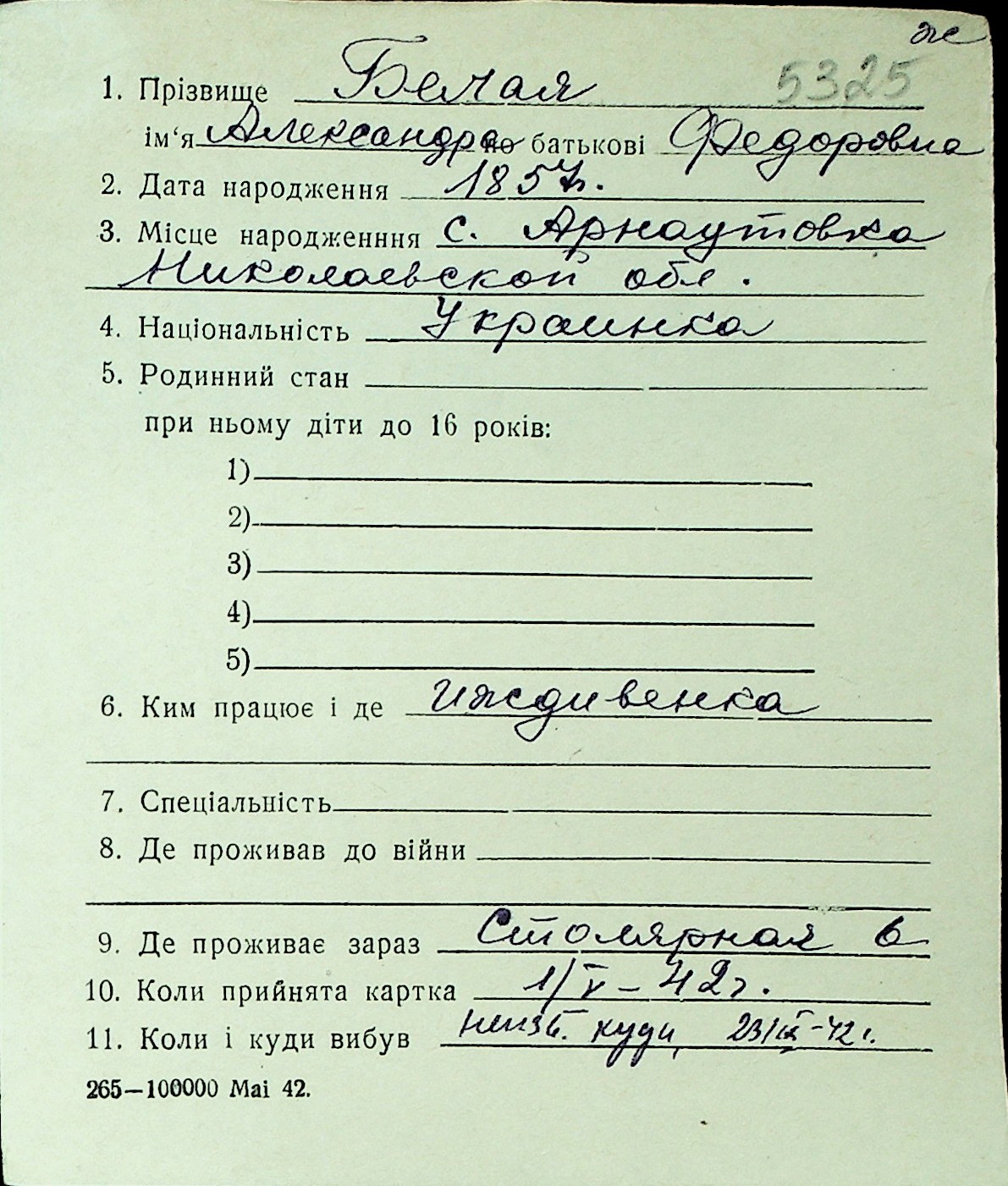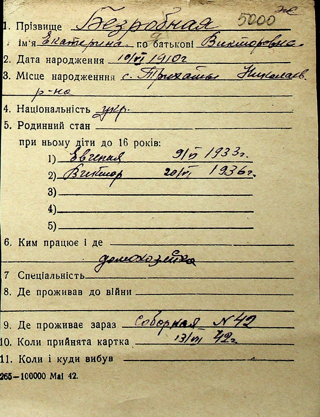 ◦ ◦ Перелік карток на осіб, які мешкали у м. Миколаїв у період окупації 1941–1944 років