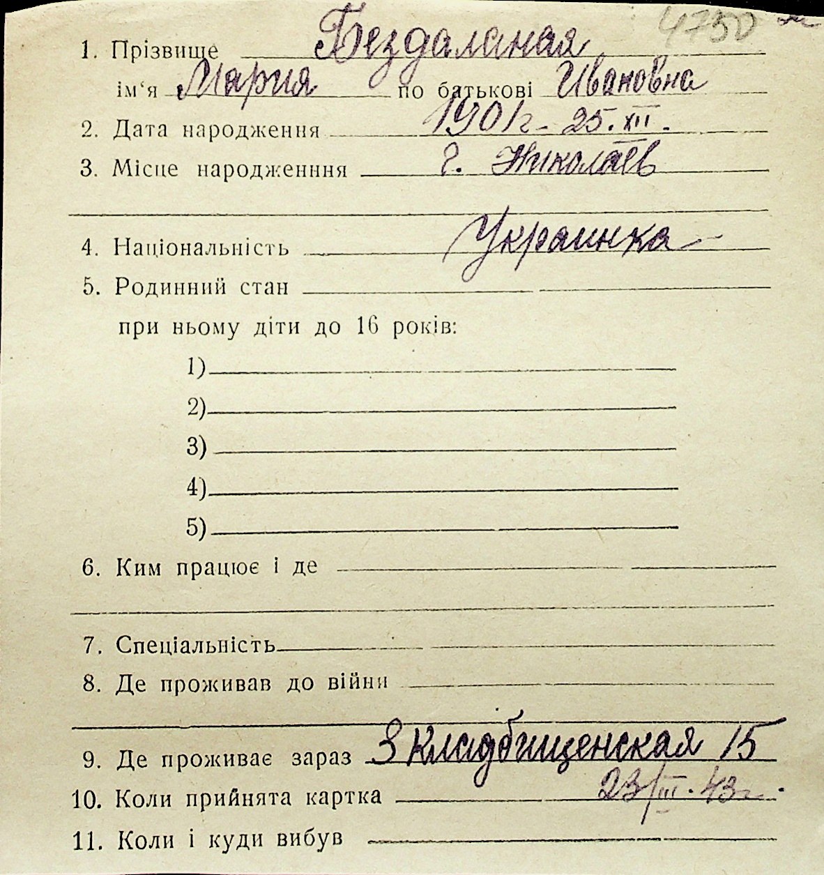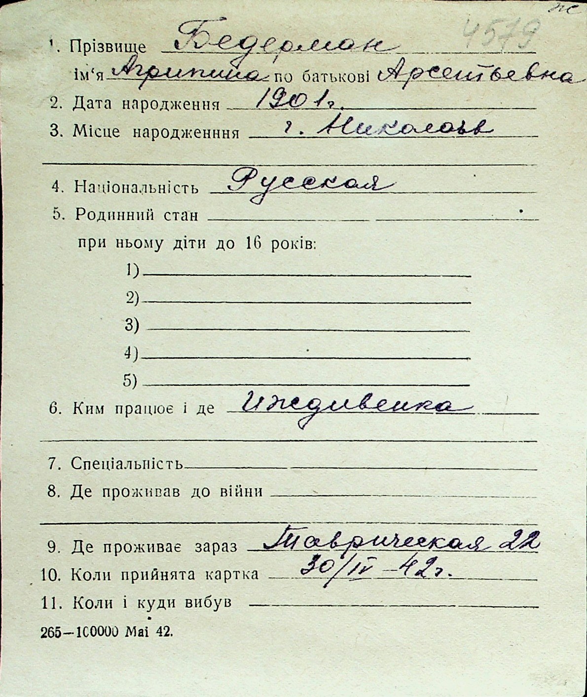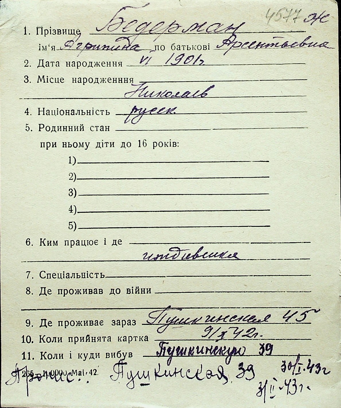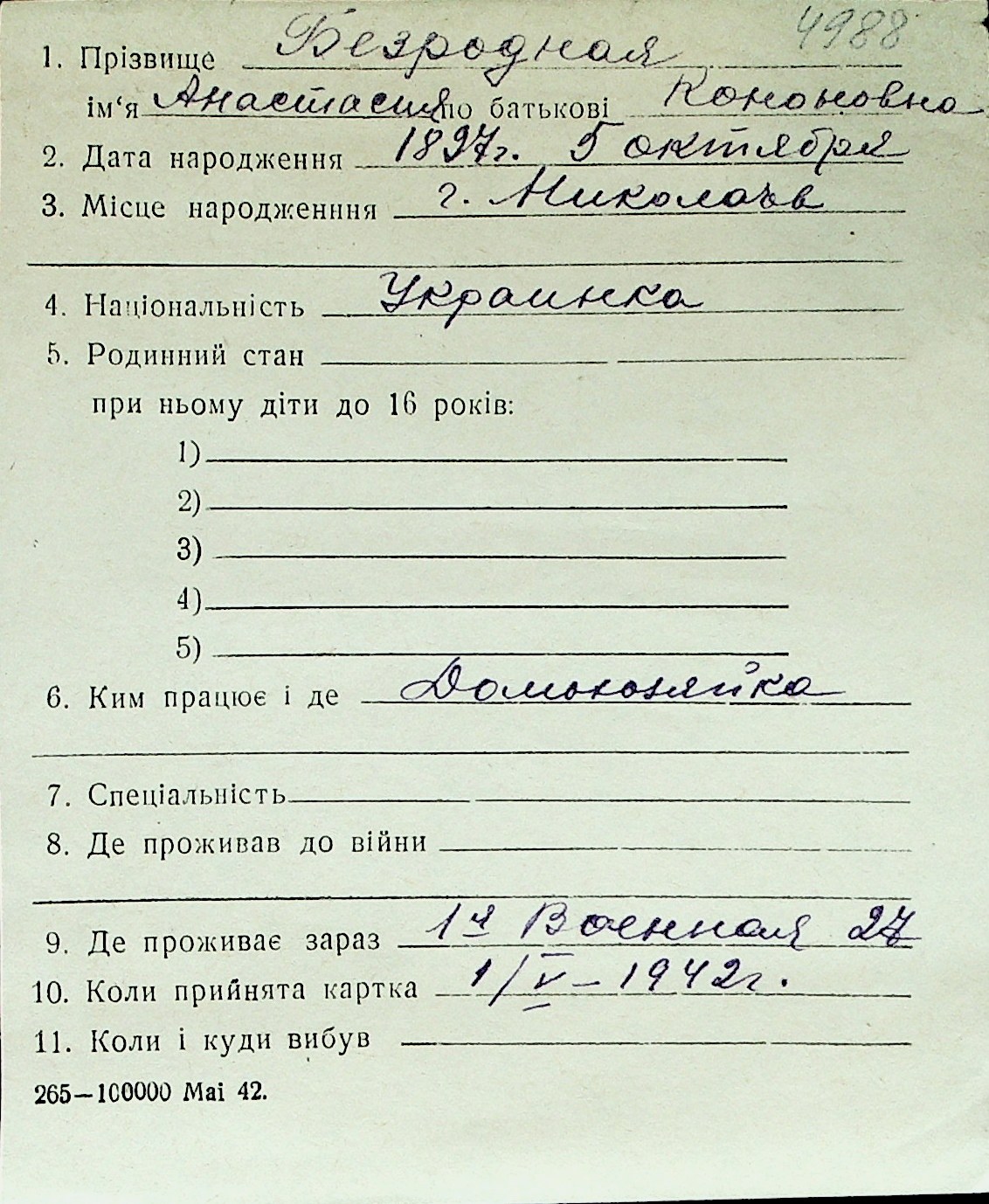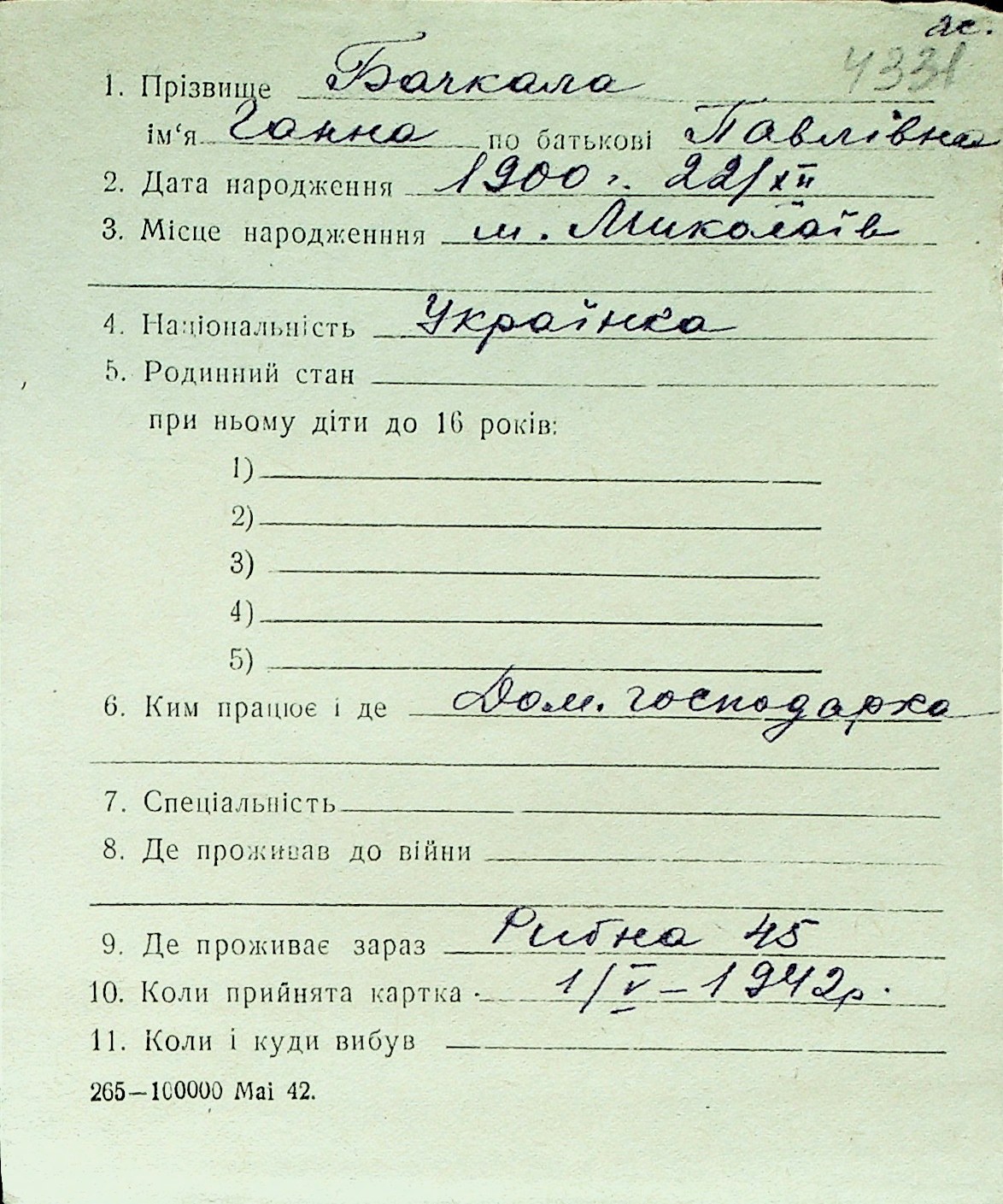 ◦ ◦ Перелік карток на осіб, які мешкали у м. Миколаїв у період окупації 1941–1944 років