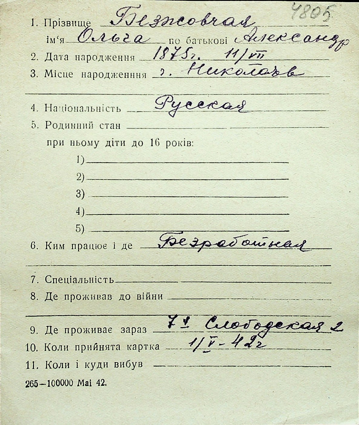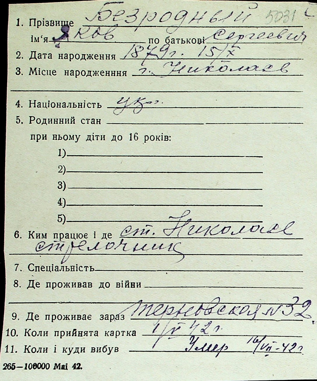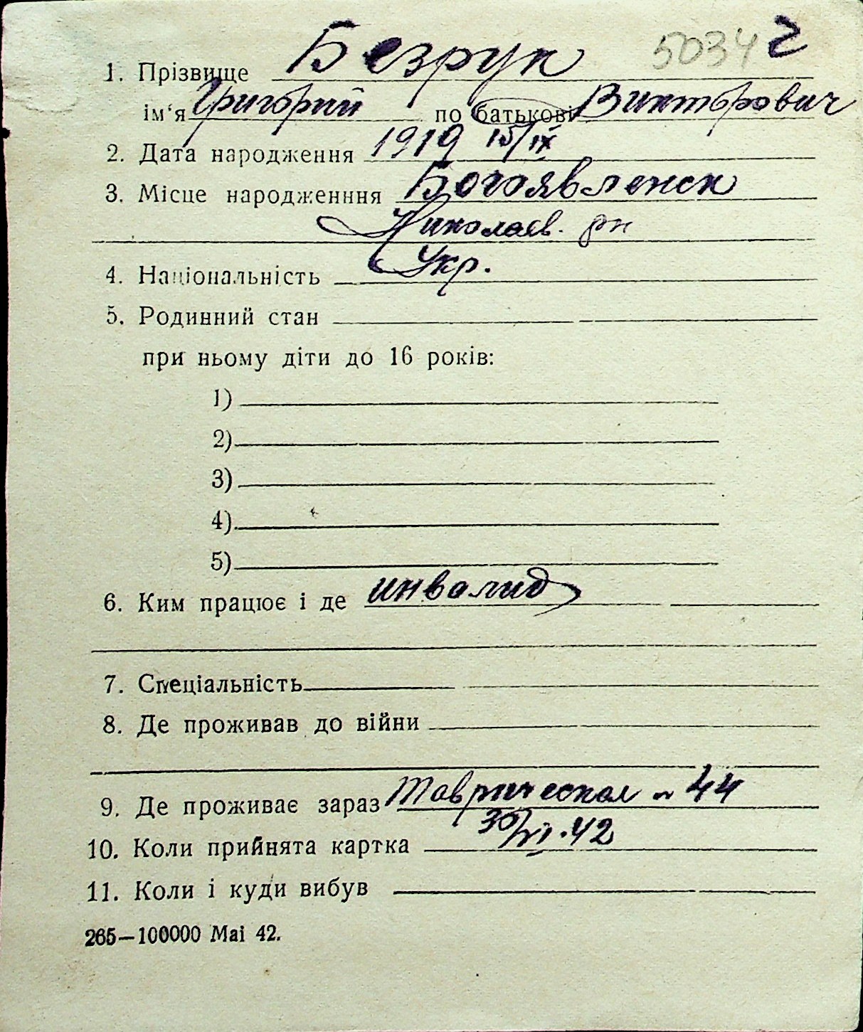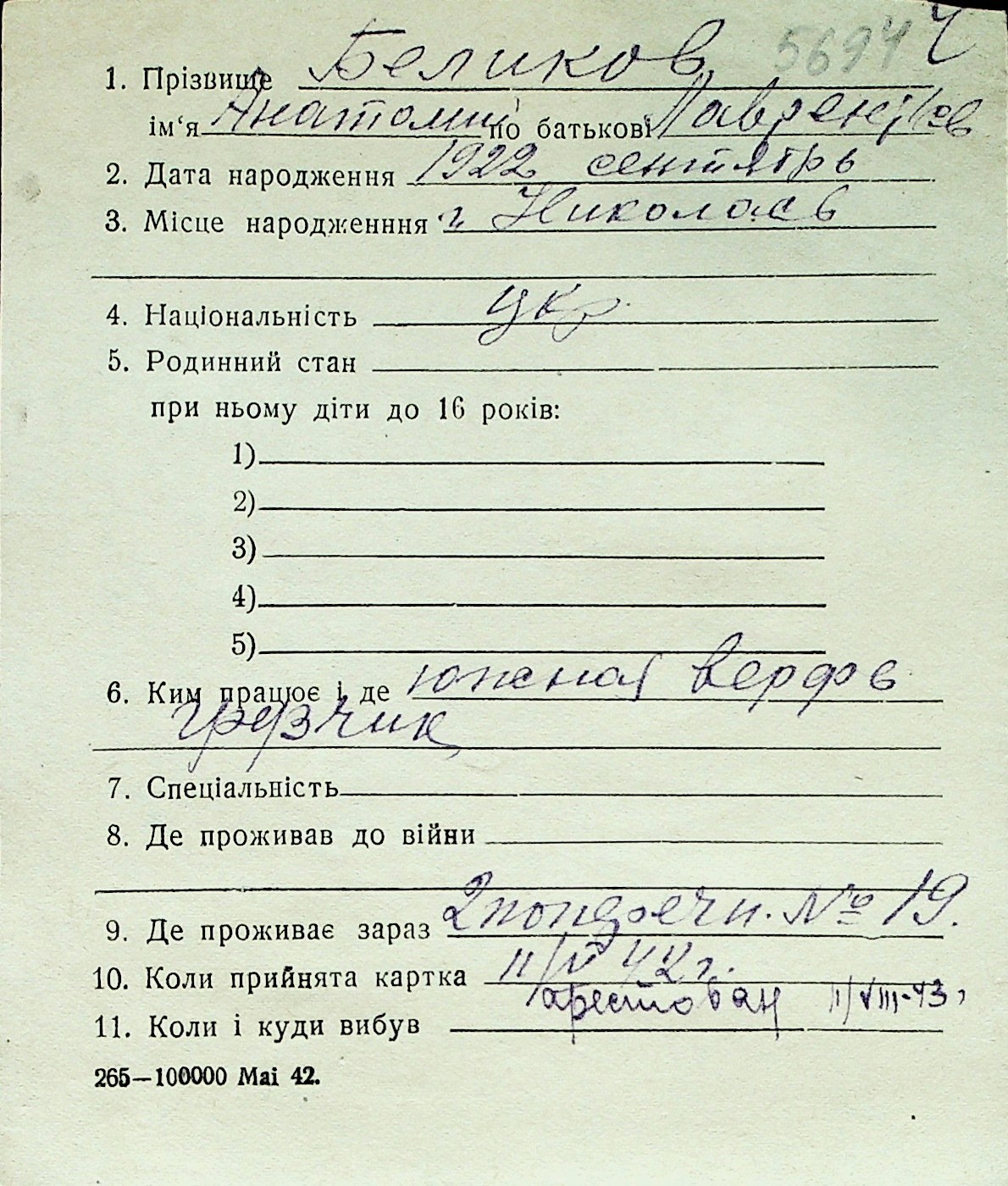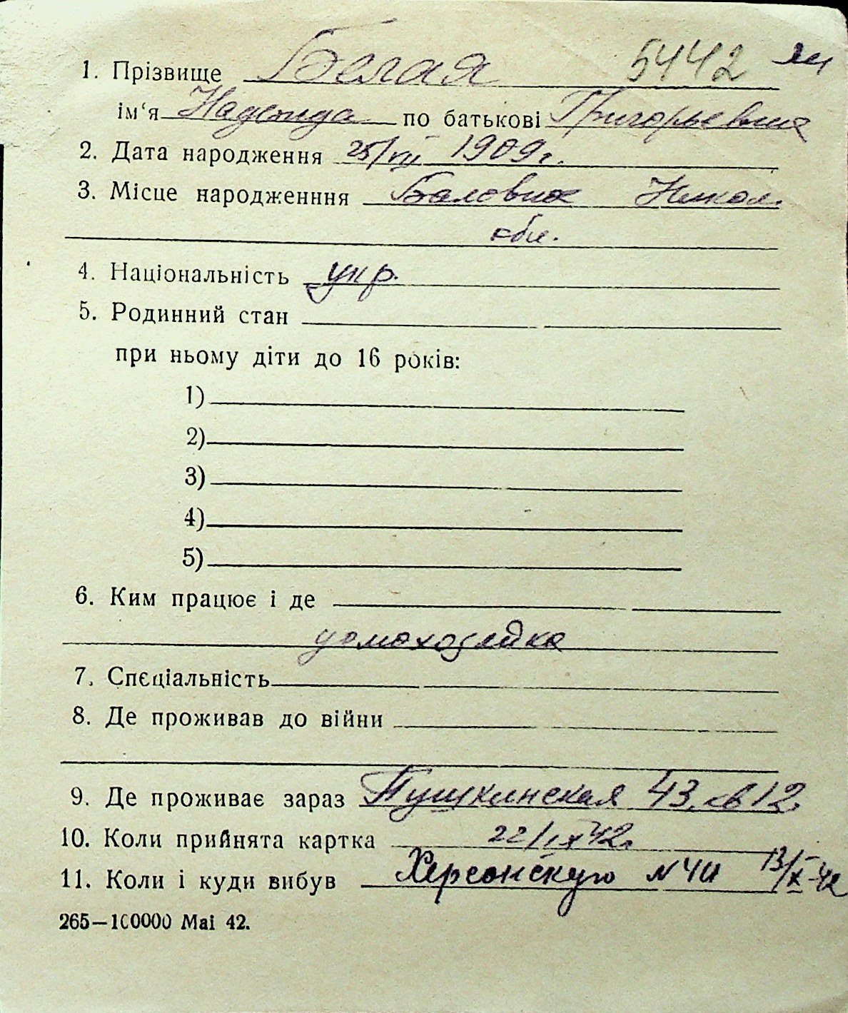 ◦ ◦ Перелік карток на осіб, які мешкали у м. Миколаїв у період окупації 1941–1944 років