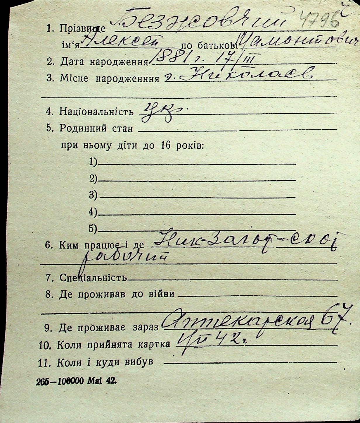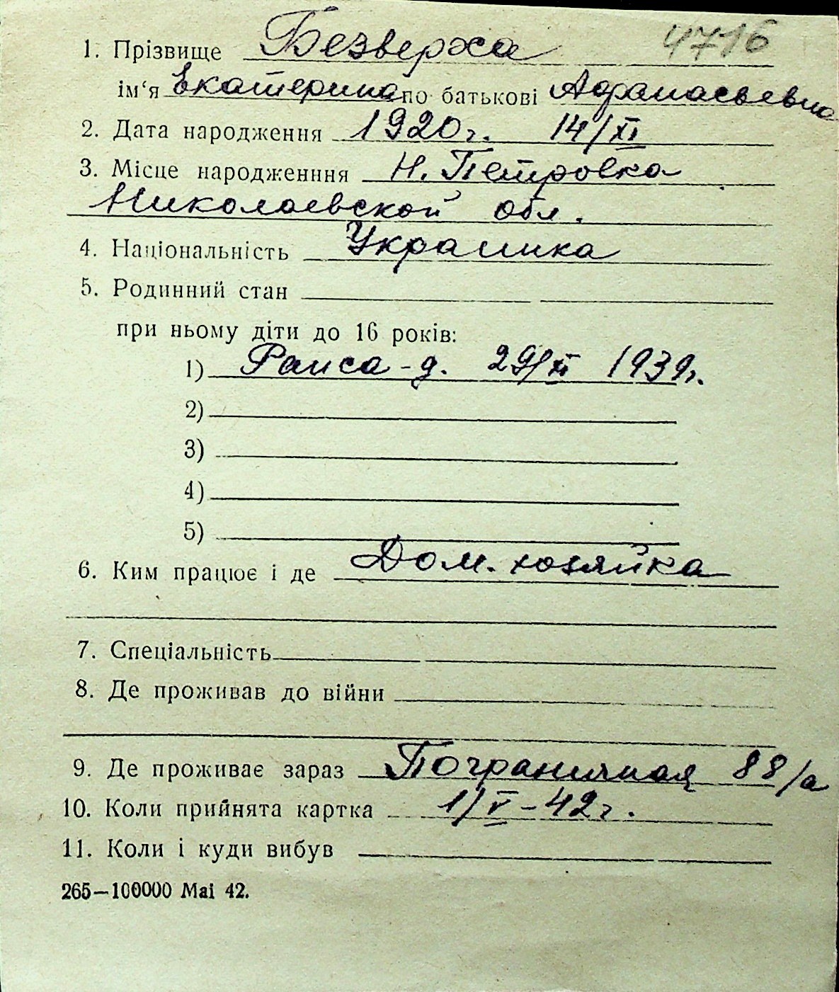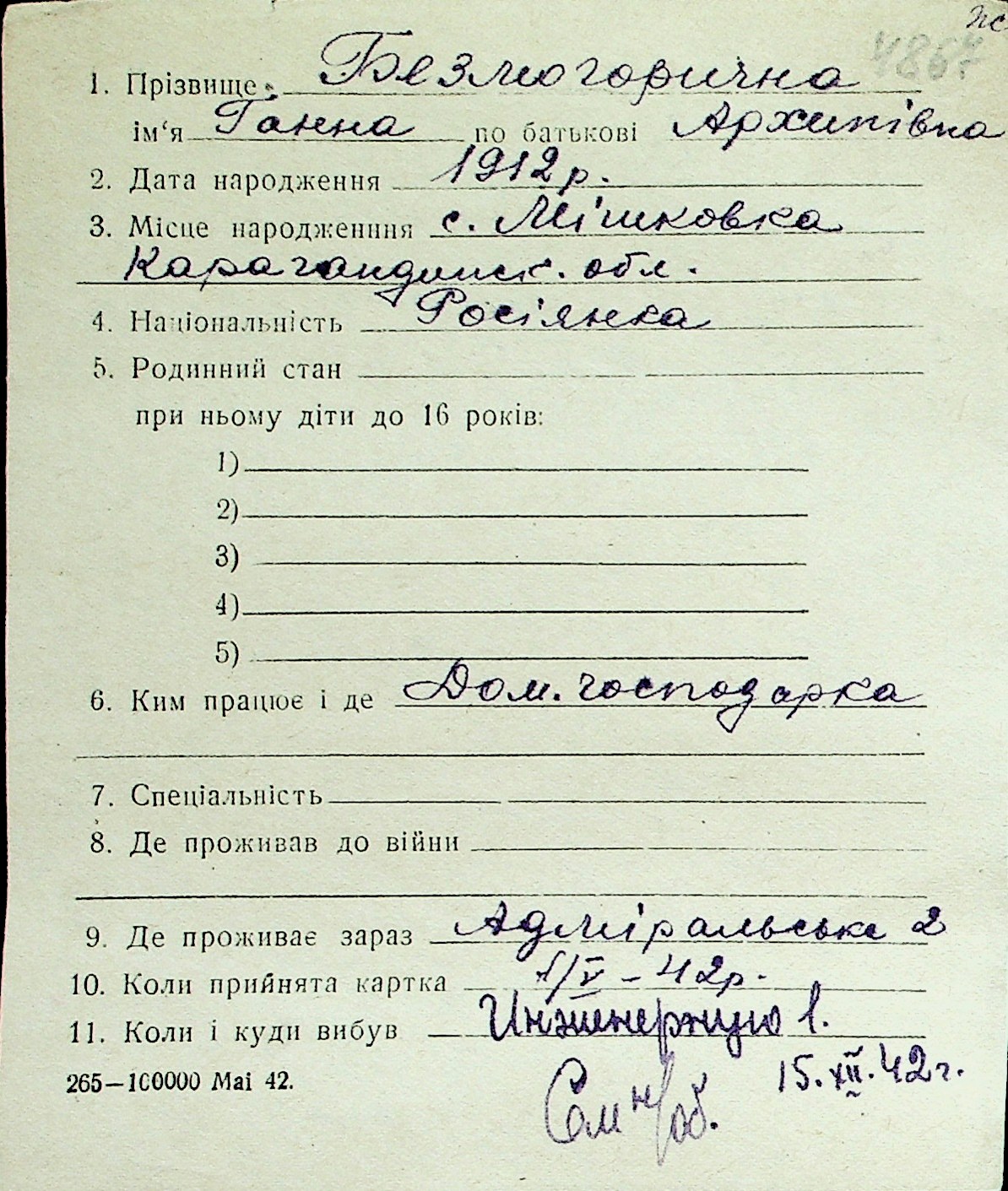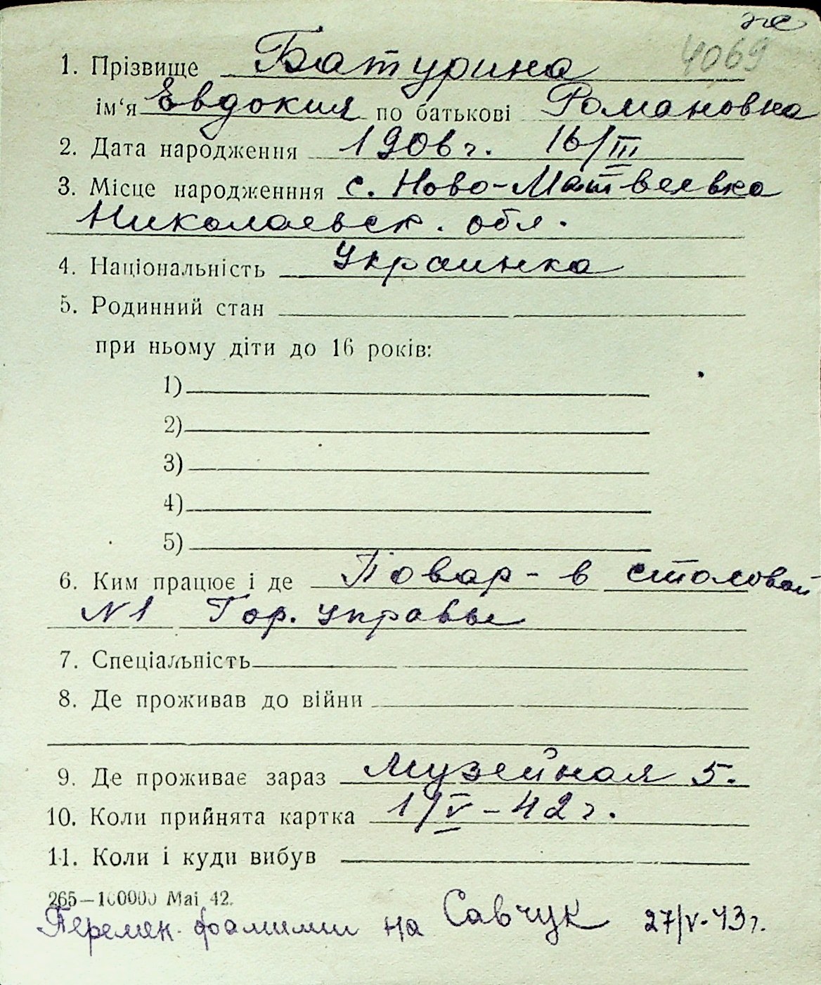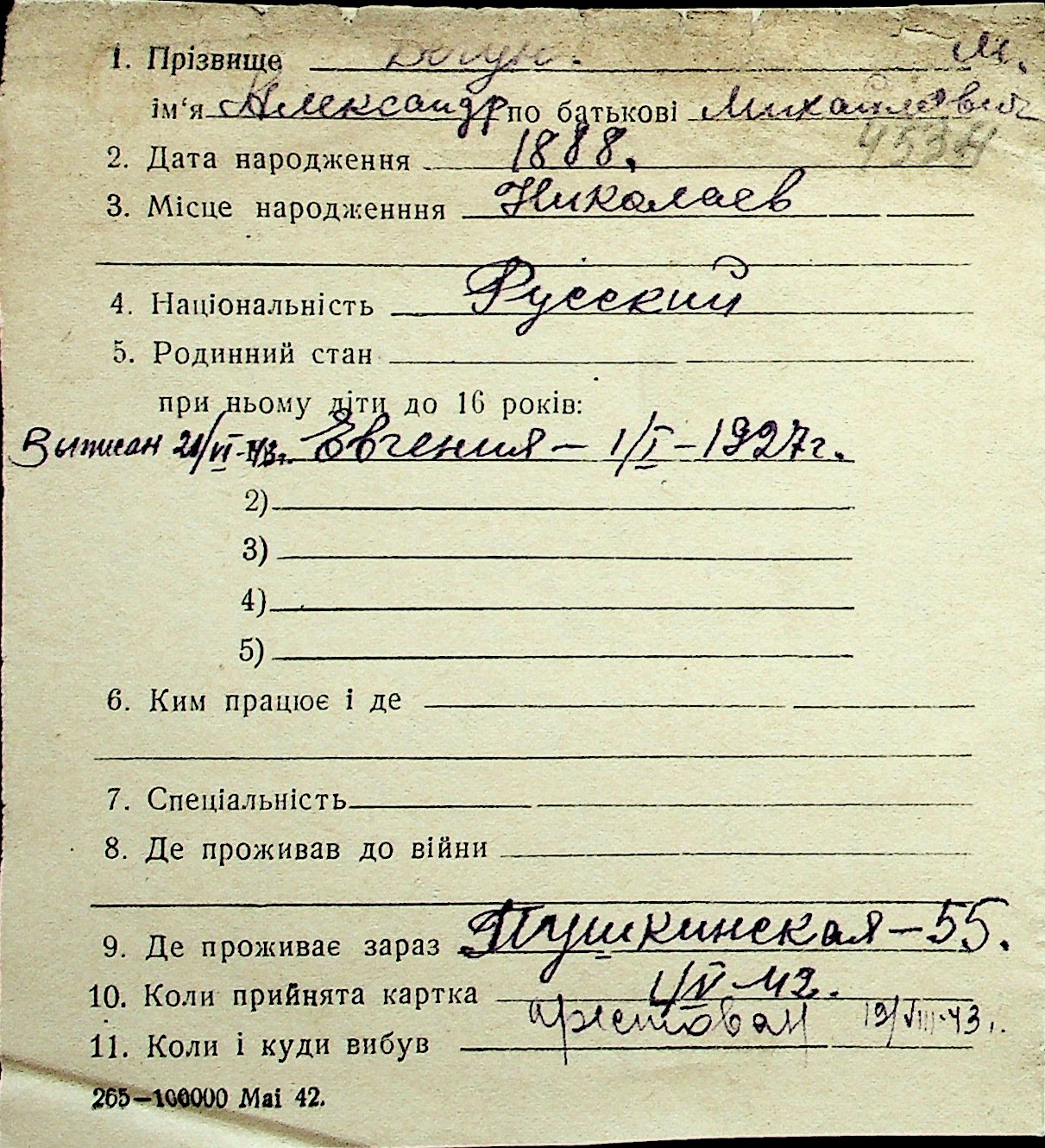 ◦ ◦ Перелік карток на осіб, які мешкали у м. Миколаїв у період окупації 1941–1944 років