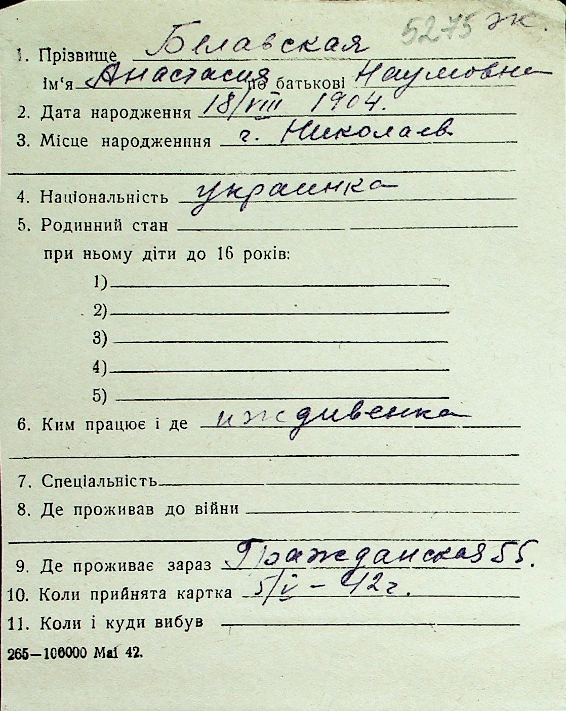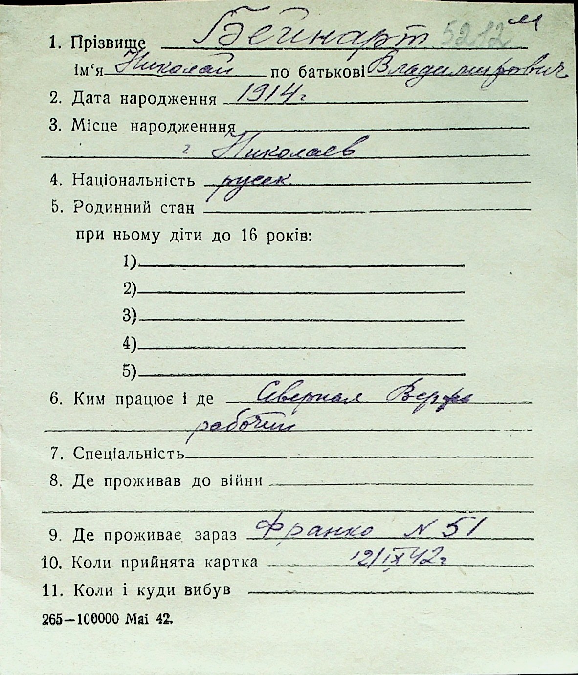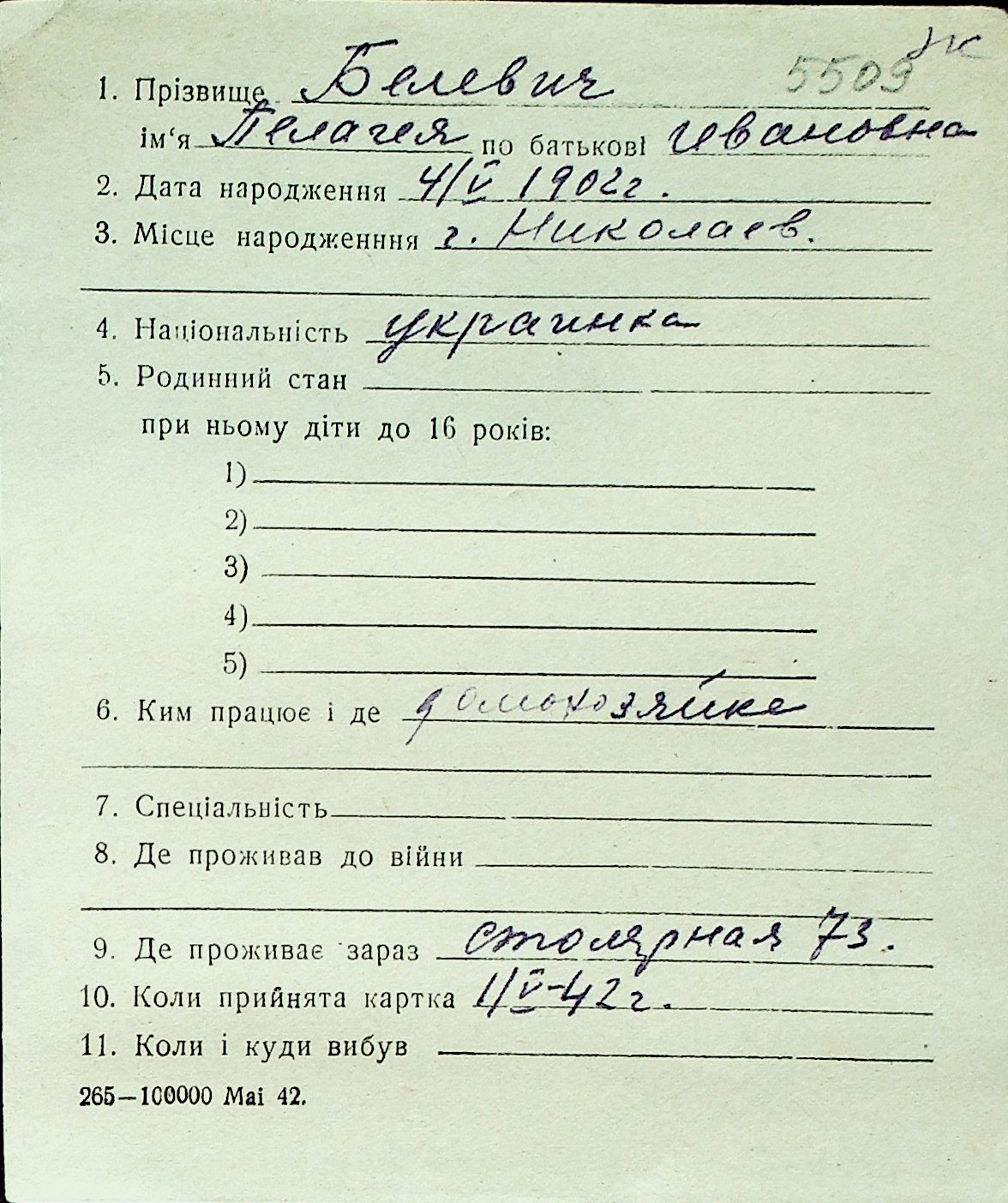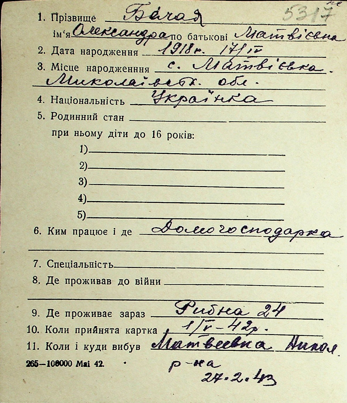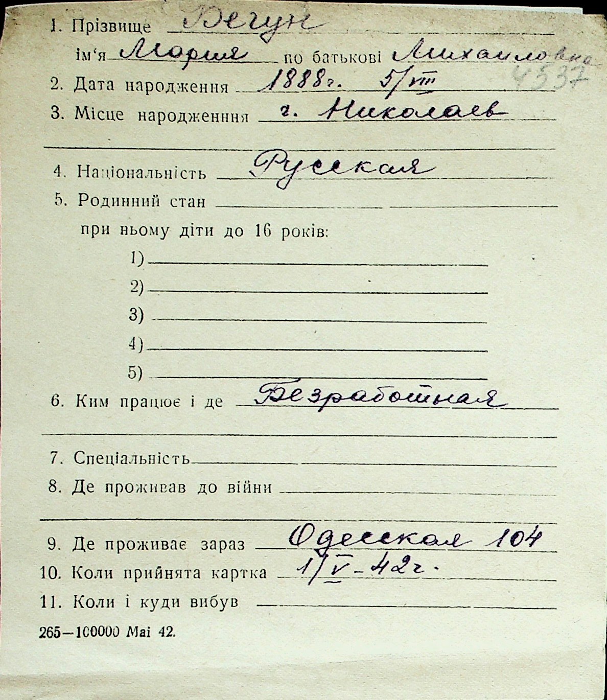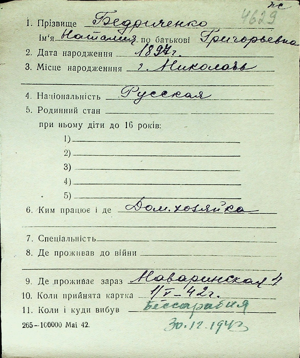 ◦ ◦ Перелік карток на осіб, які мешкали у м. Миколаїв у період окупації 1941–1944 років