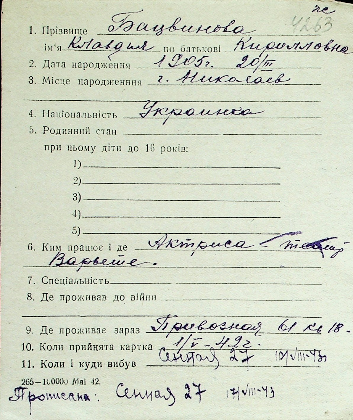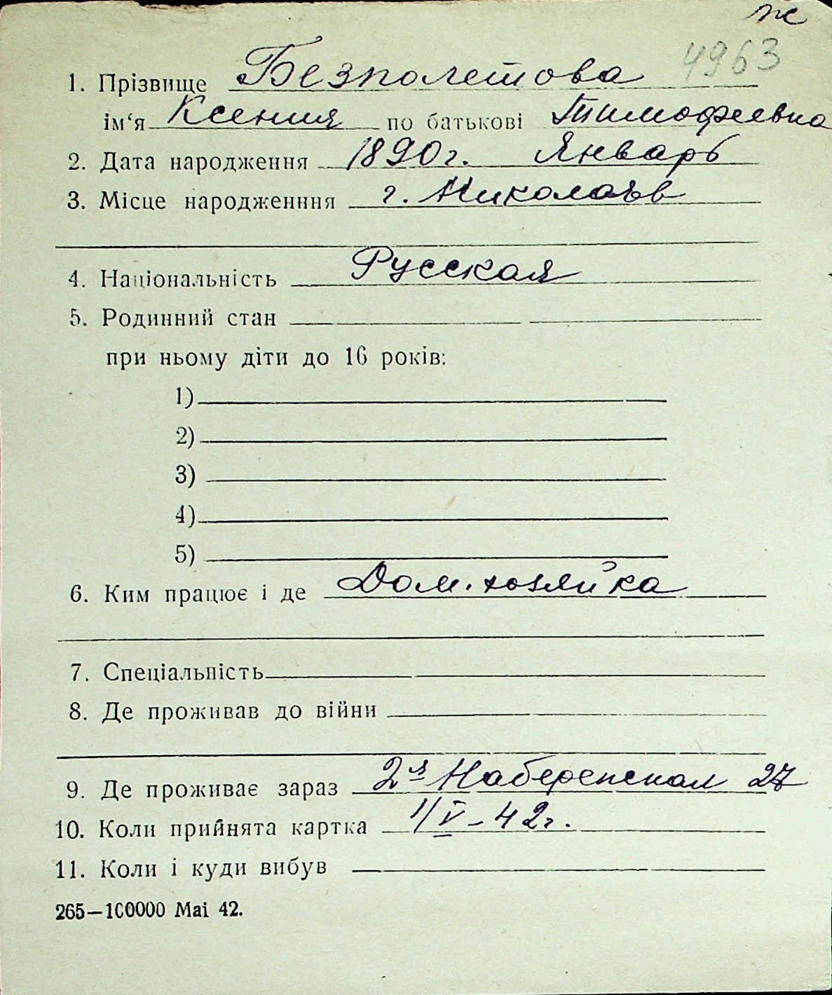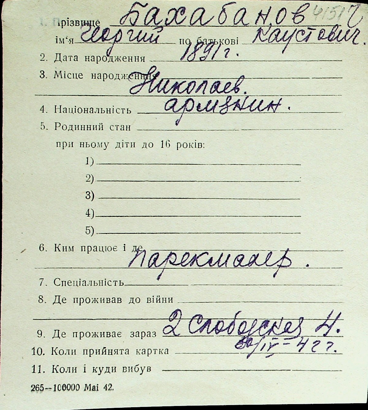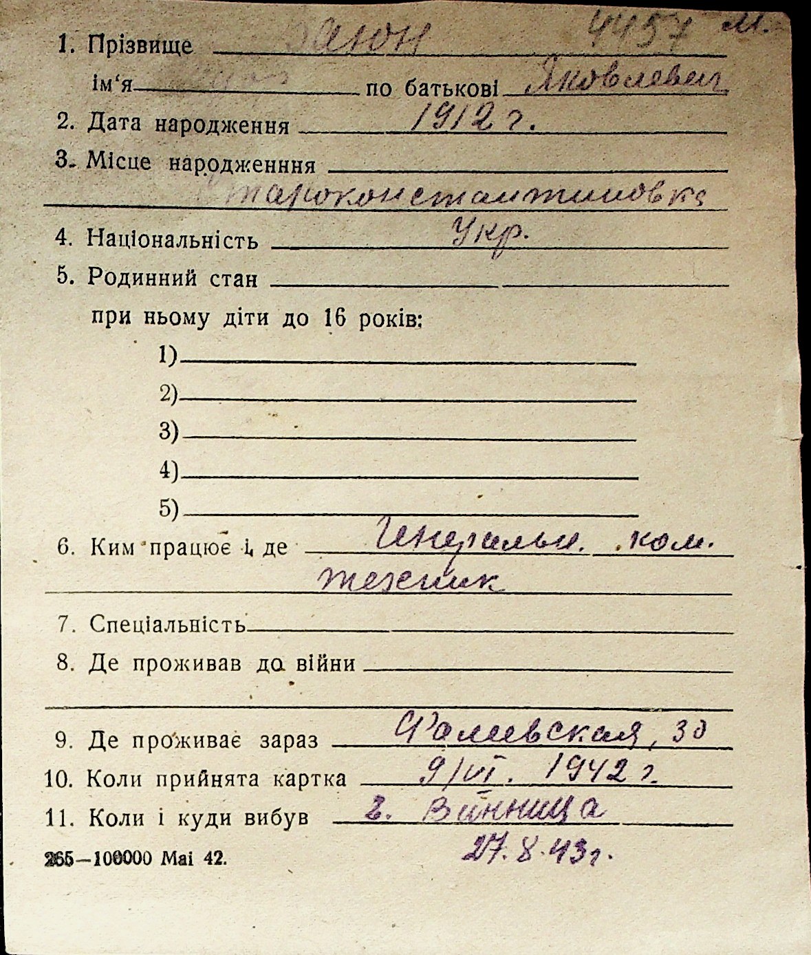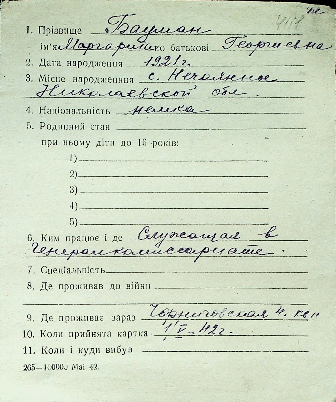 ◦ ◦ Перелік карток на осіб, які мешкали у м. Миколаїв у період окупації 1941–1944 років