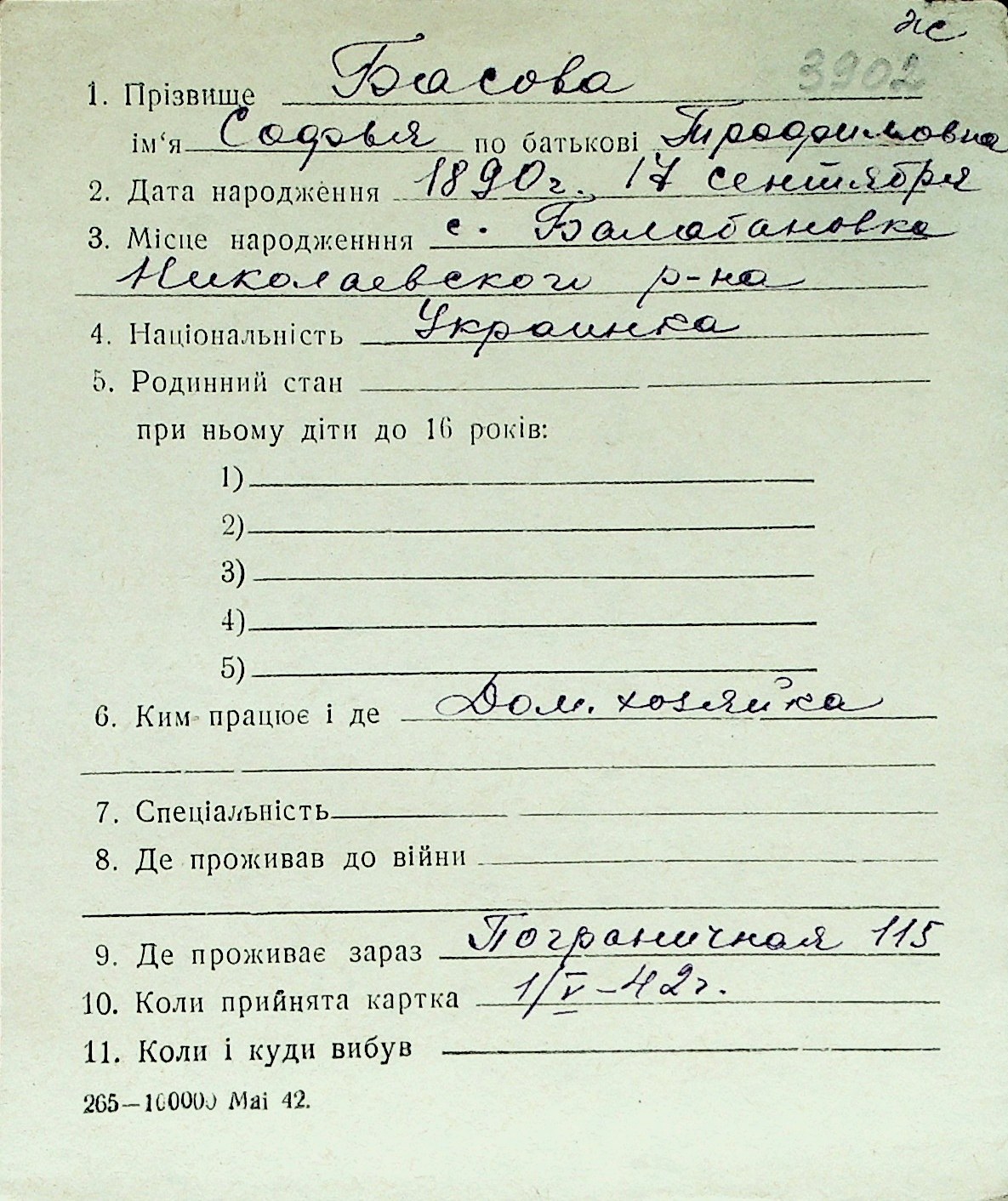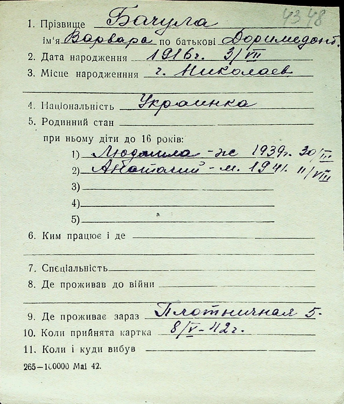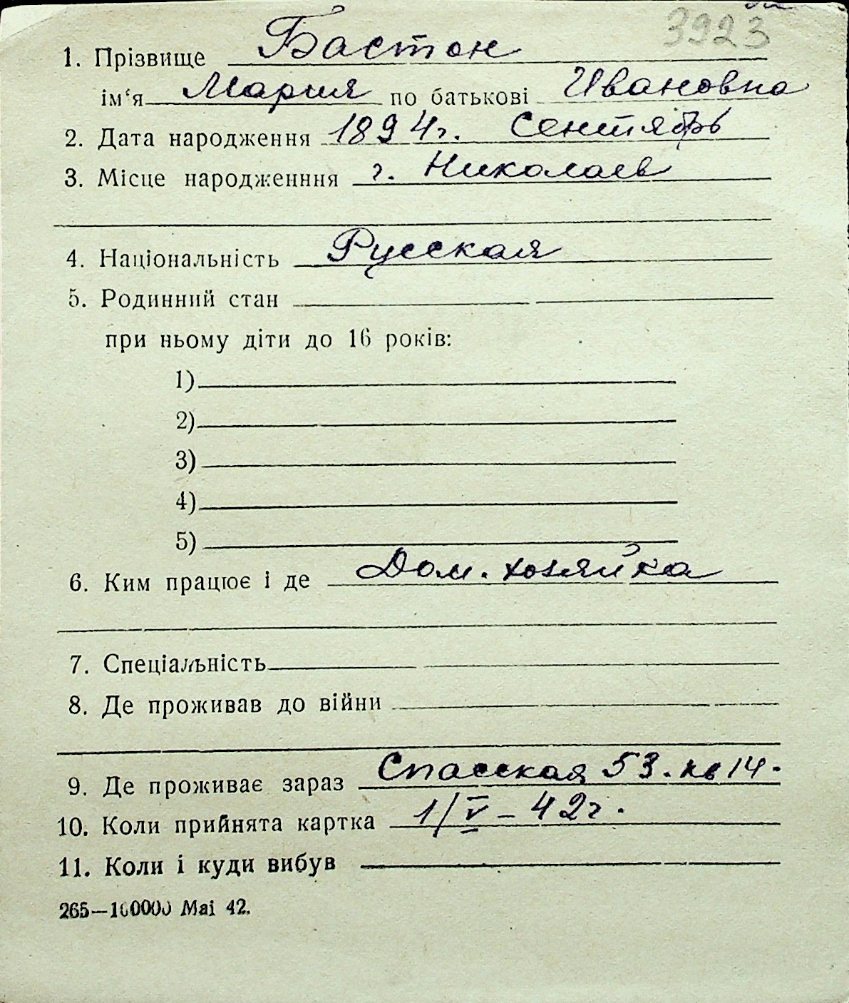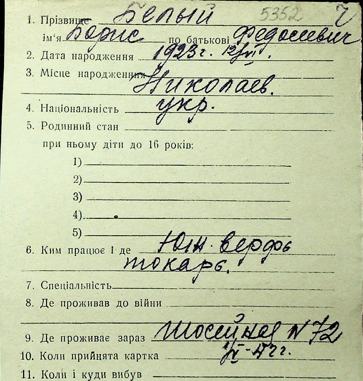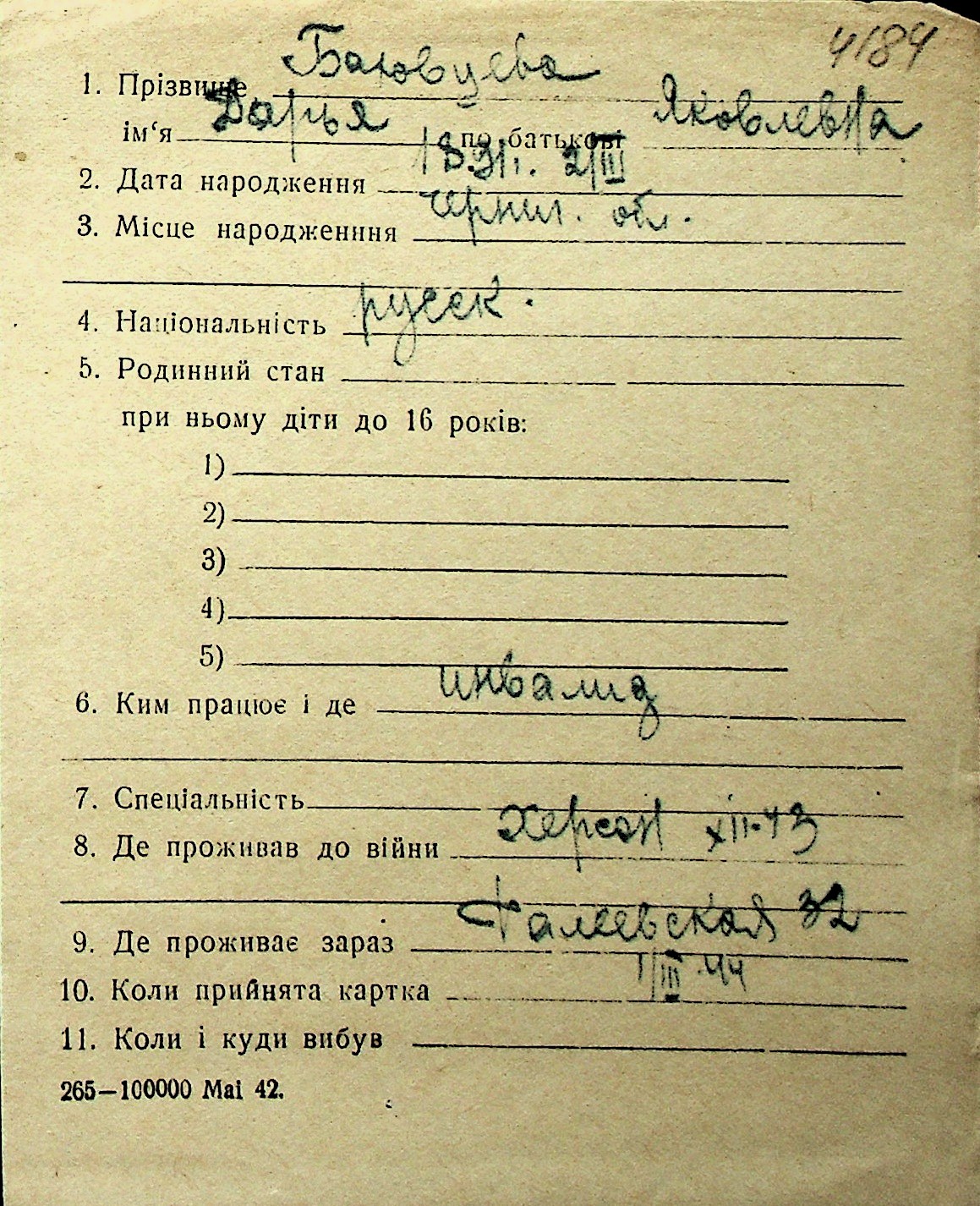 ◦ ◦ Перелік карток на осіб, які мешкали у м. Миколаїв у період окупації 1941–1944 років