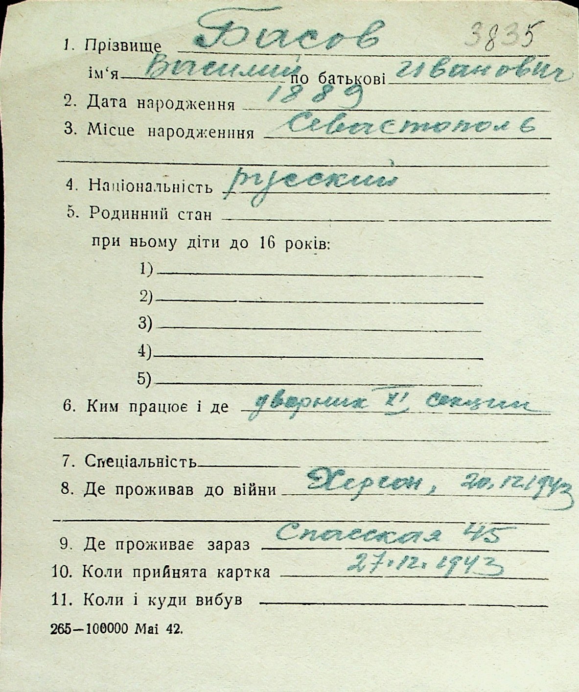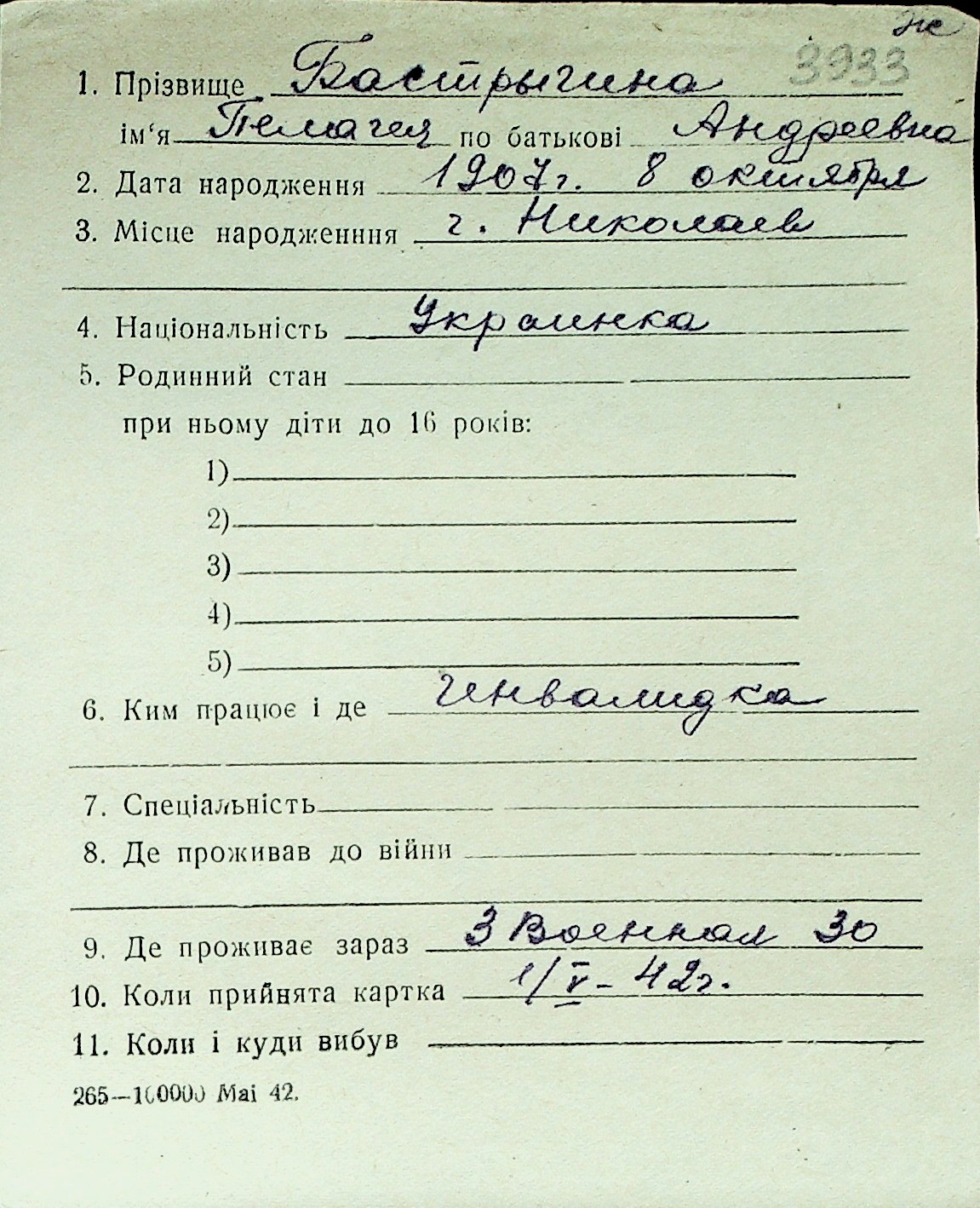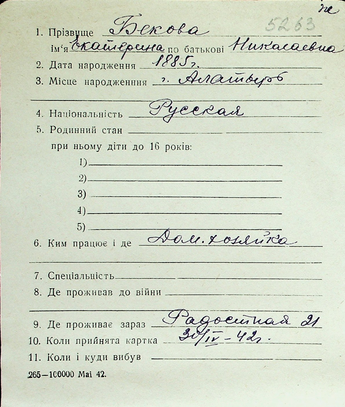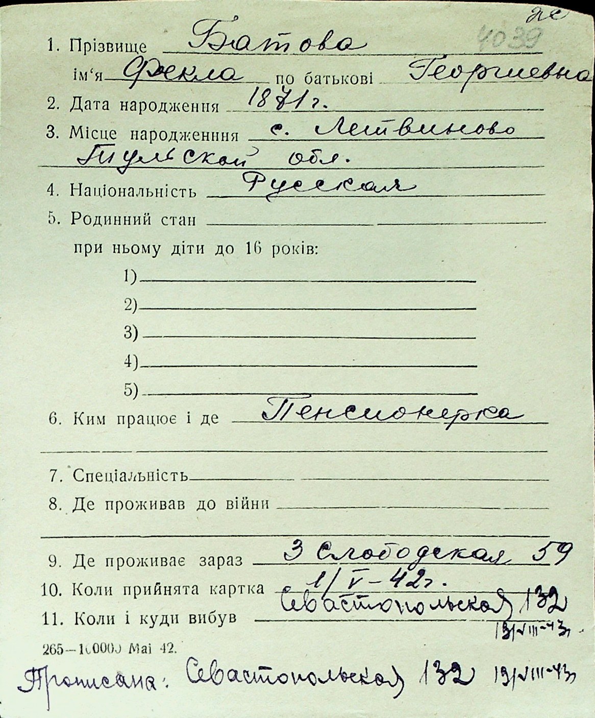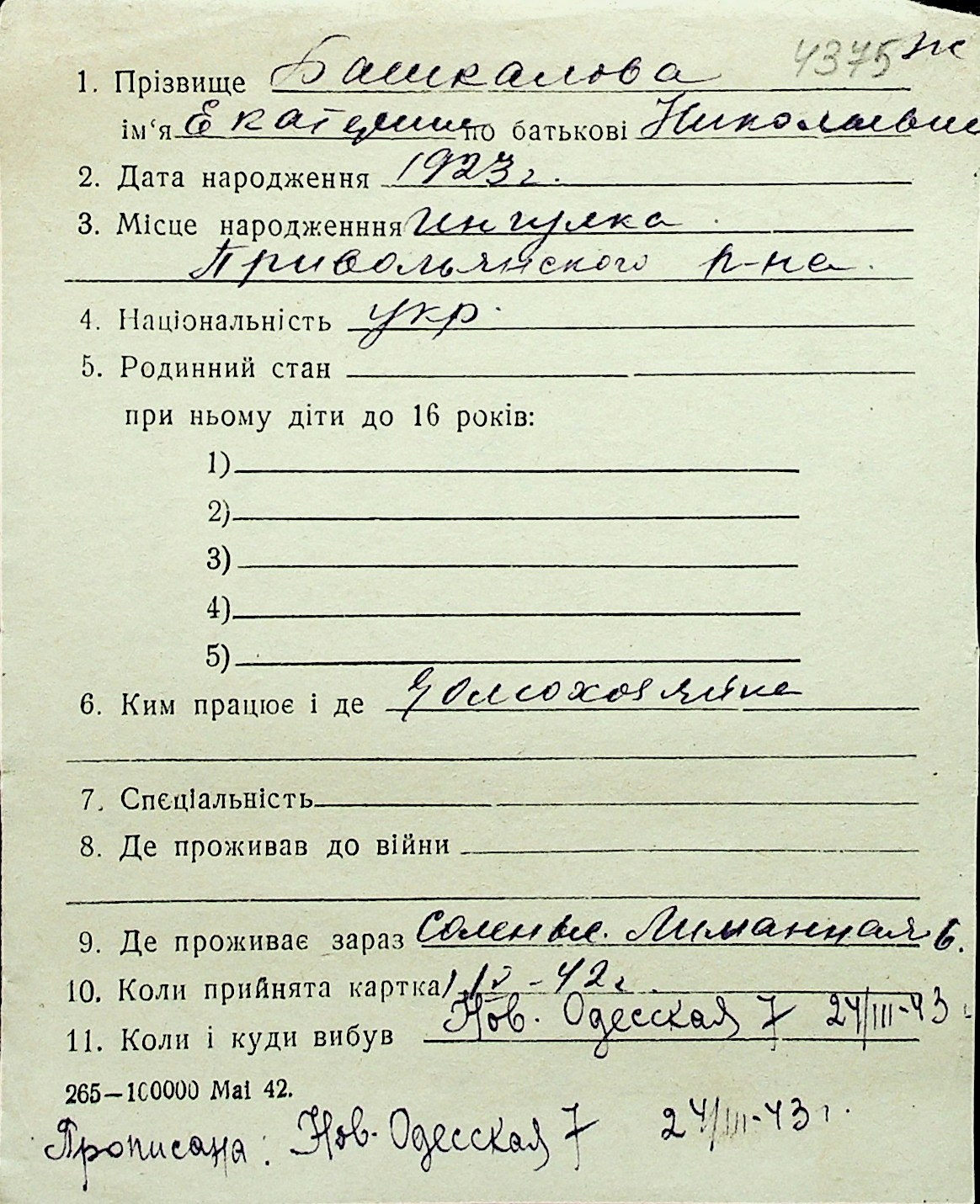 ◦ ◦ Перелік карток на осіб, які мешкали у м. Миколаїв у період окупації 1941–1944 років