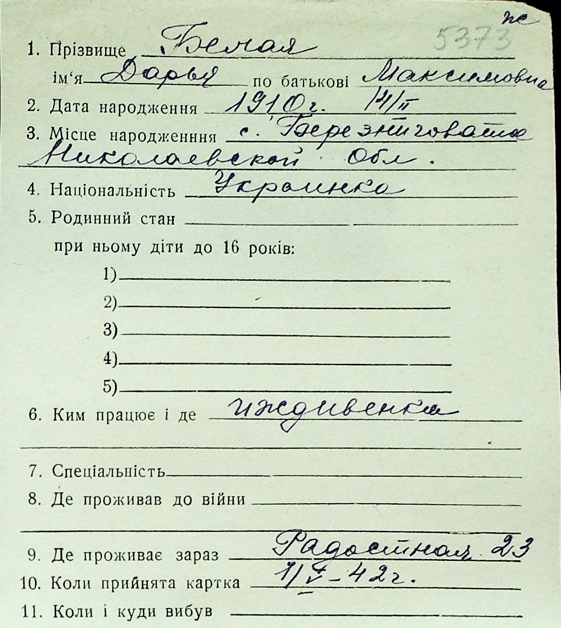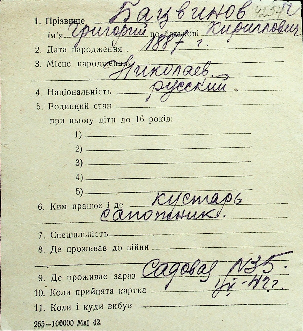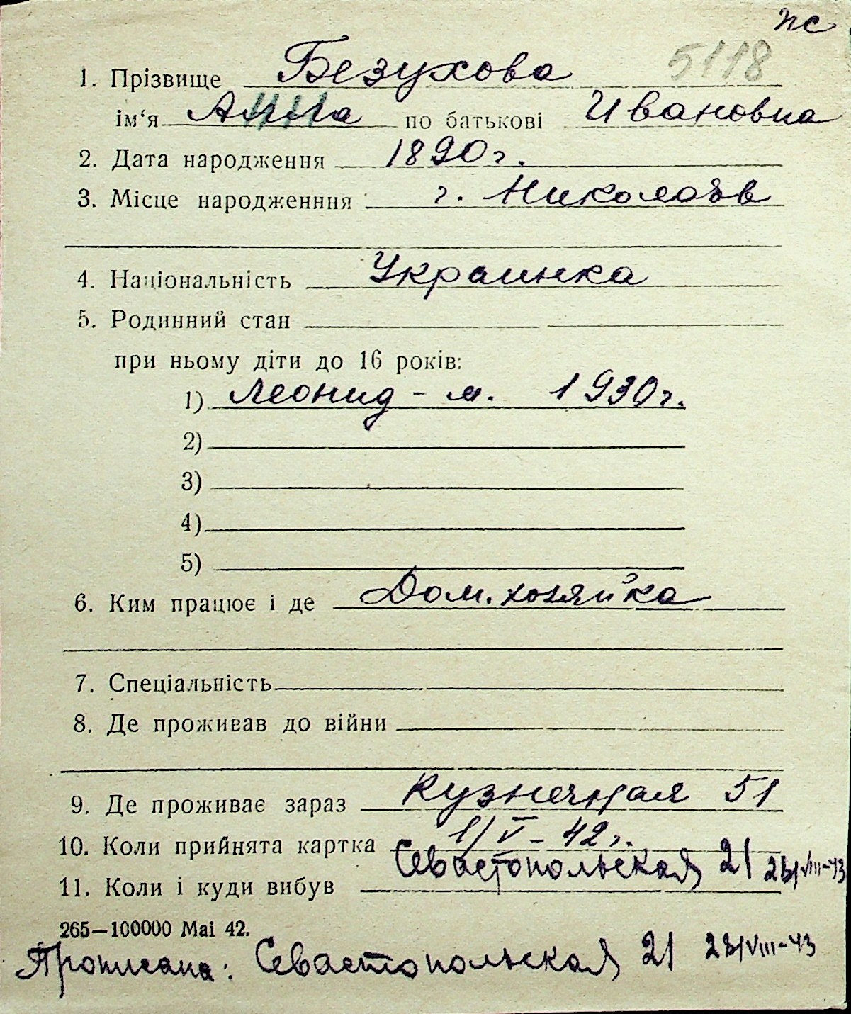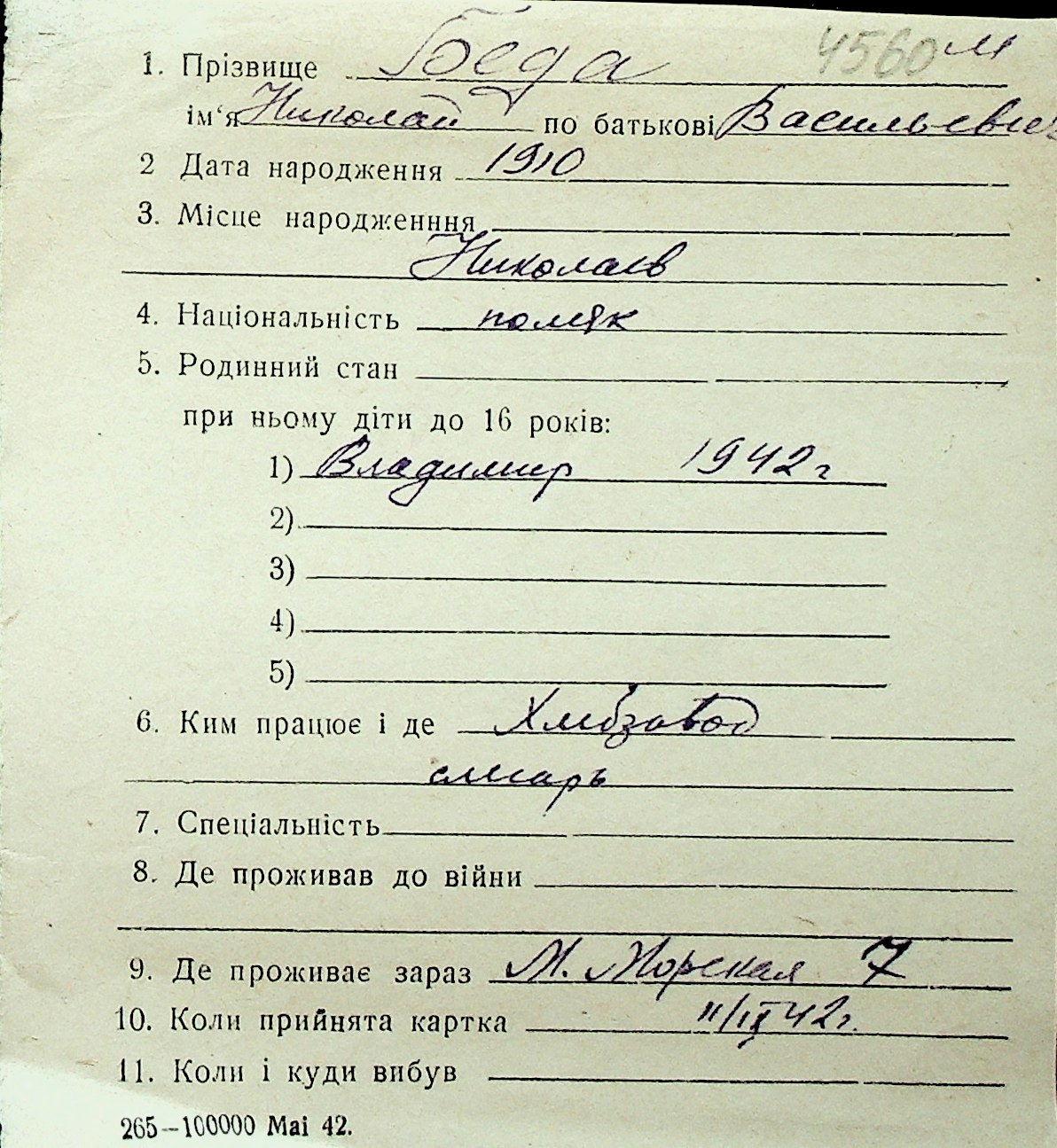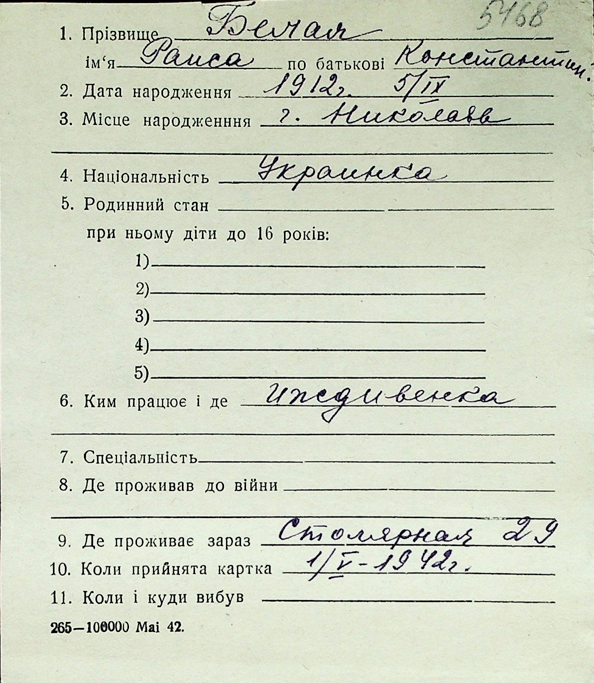 ◦ ◦ Перелік карток на осіб, які мешкали у м. Миколаїв у період окупації 1941–1944 років