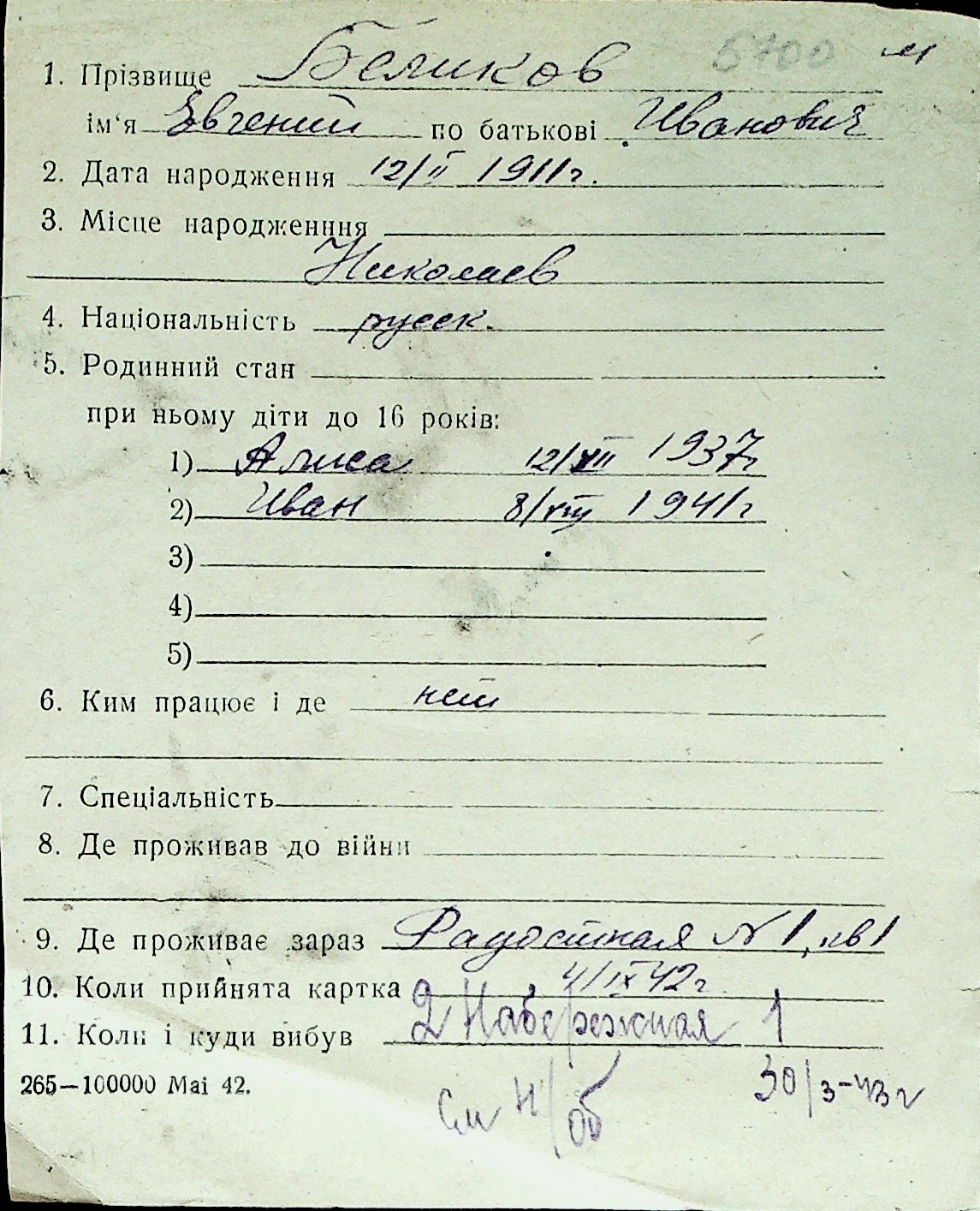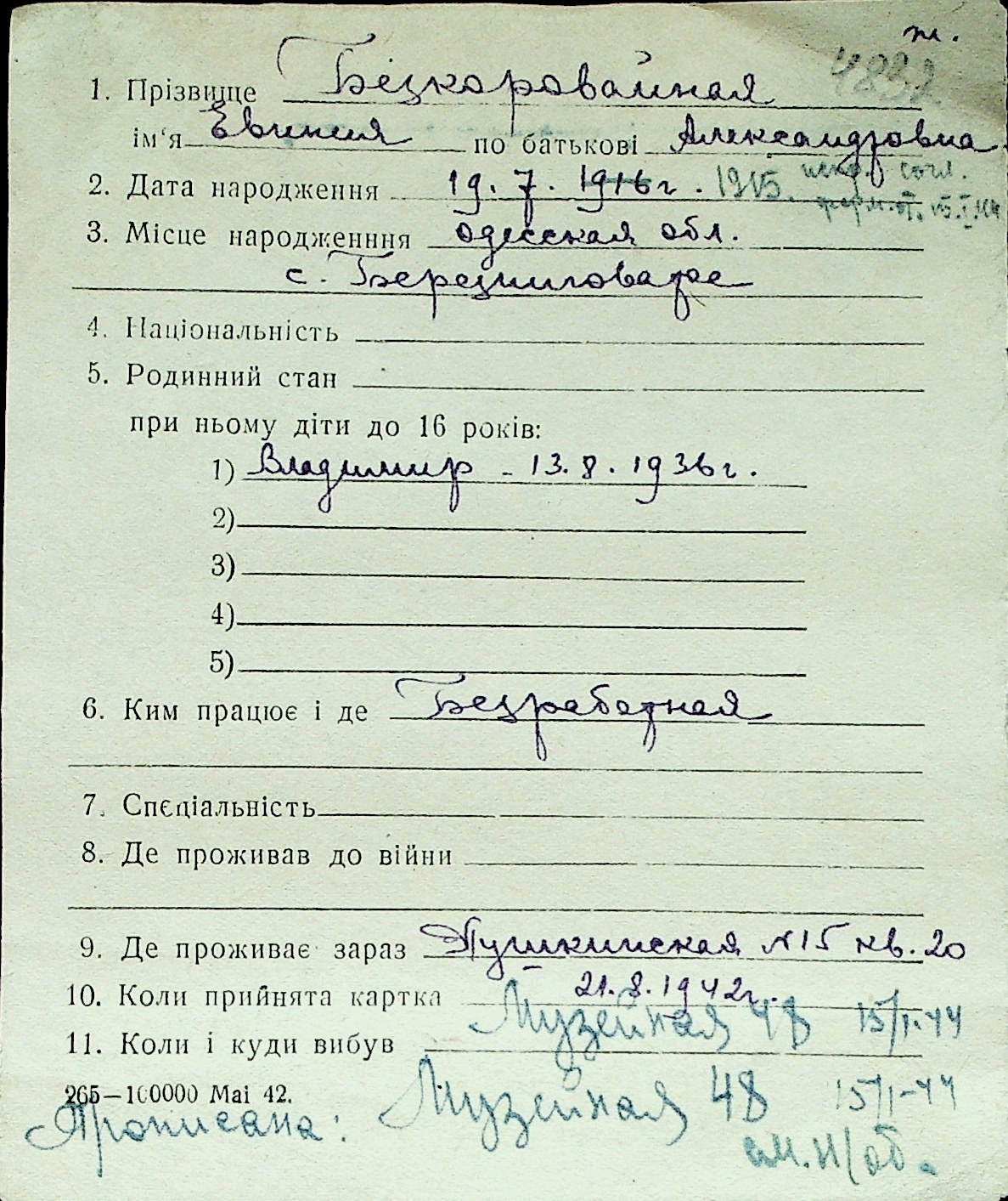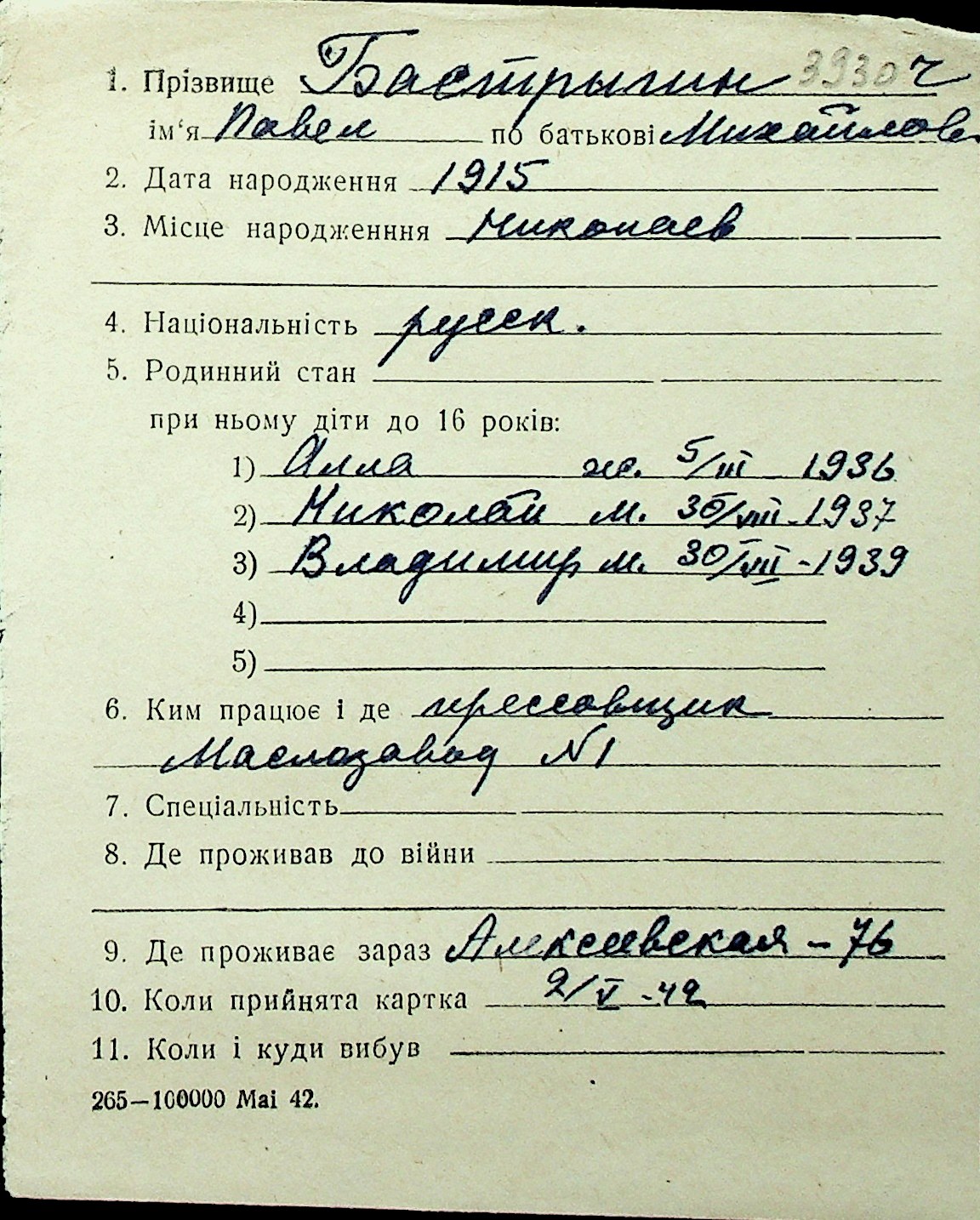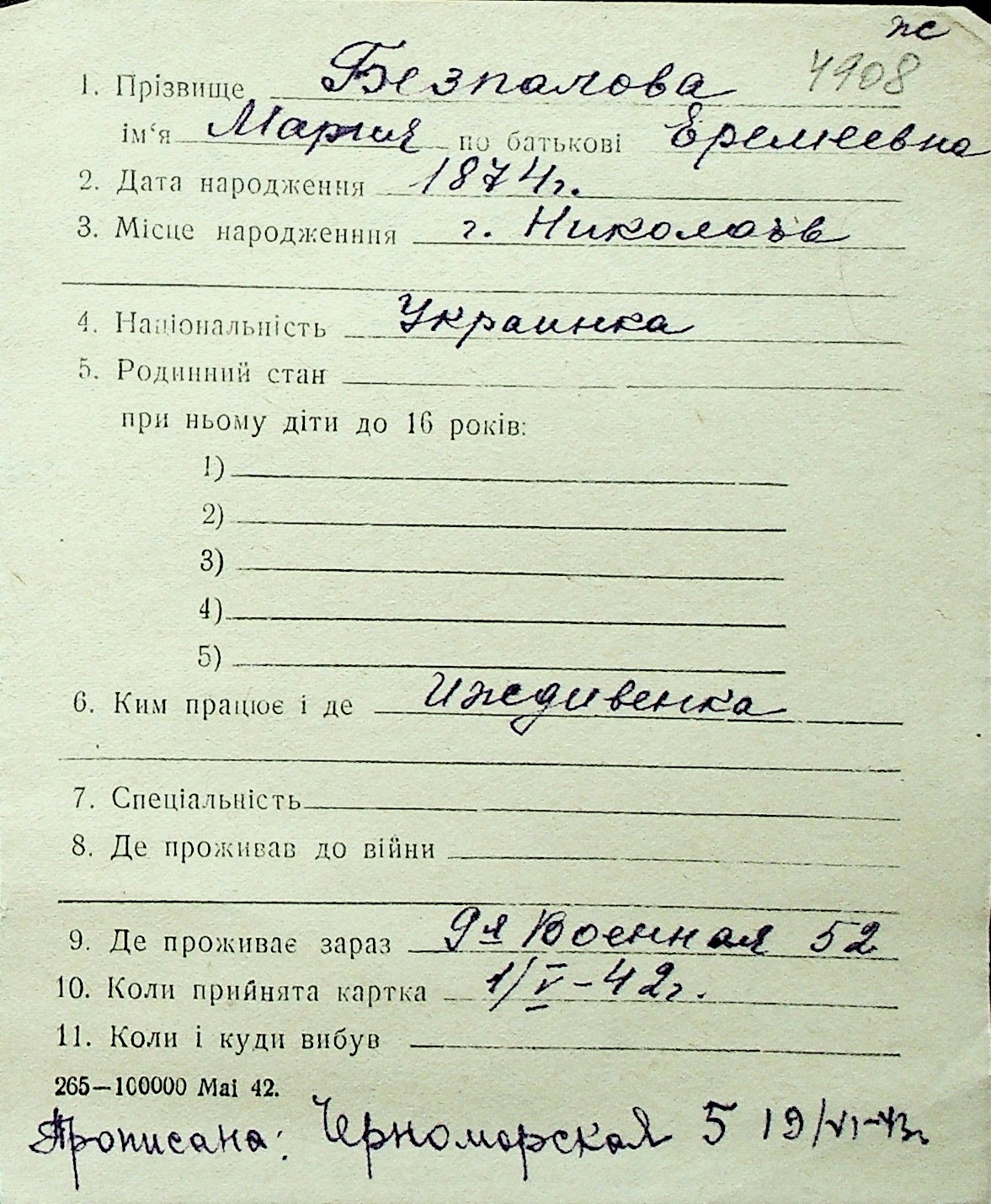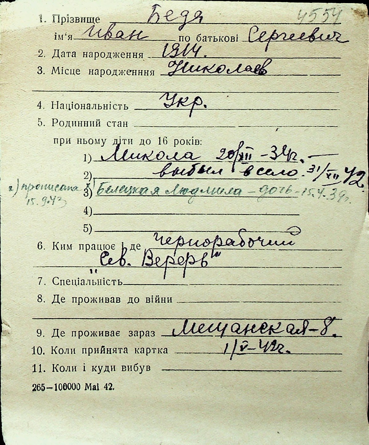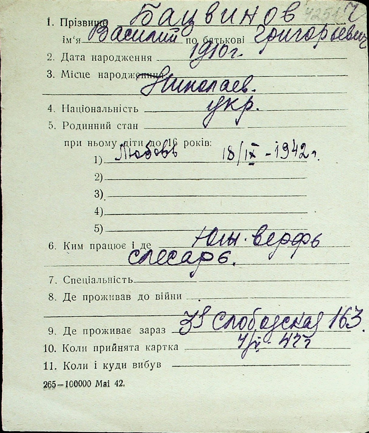 ◦ ◦ Перелік карток на осіб, які мешкали у м. Миколаїв у період окупації 1941–1944 років