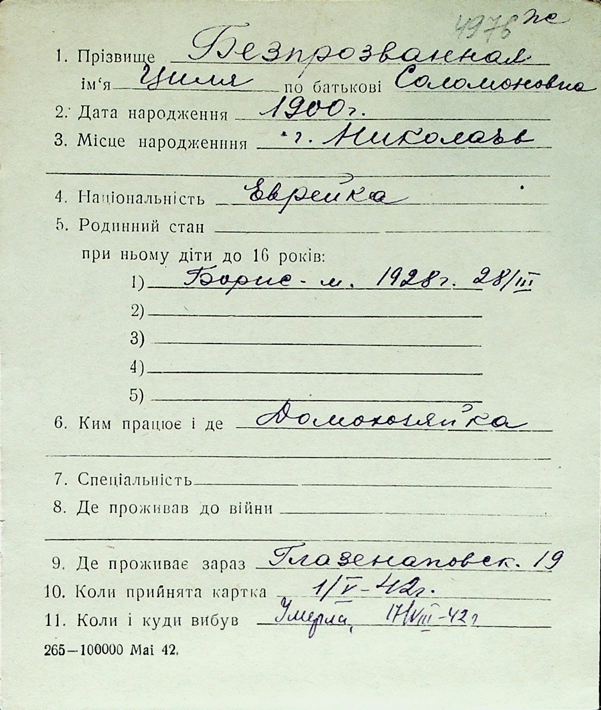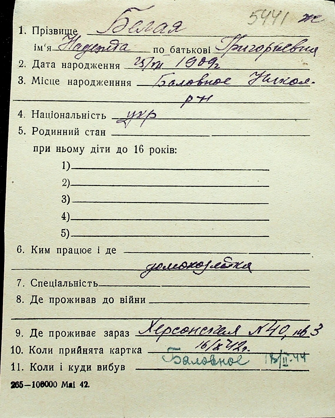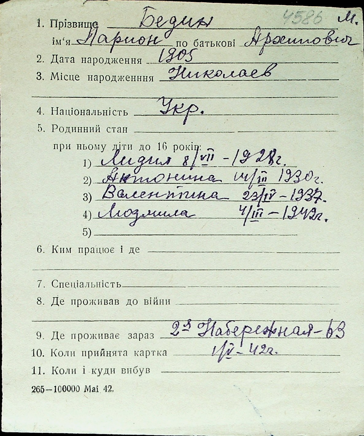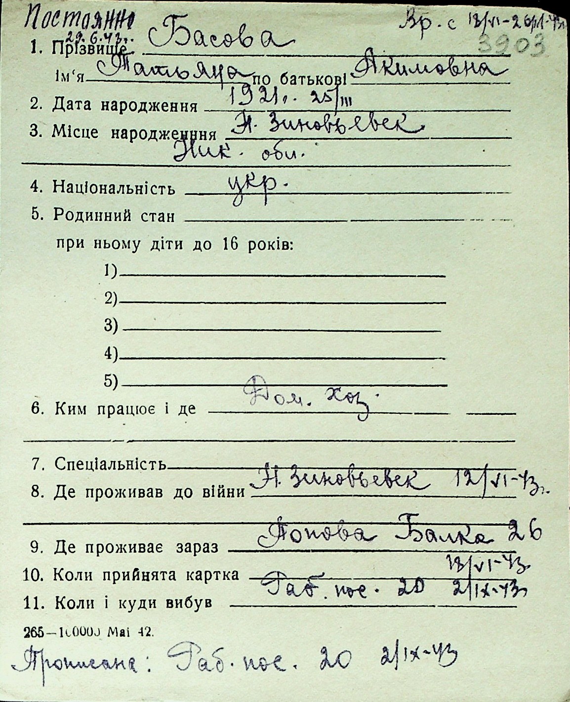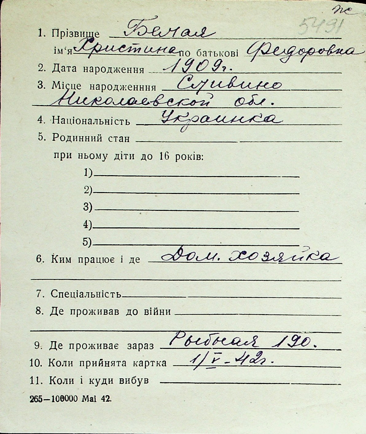 ◦ ◦ Перелік карток на осіб, які мешкали у м. Миколаїв у період окупації 1941–1944 років