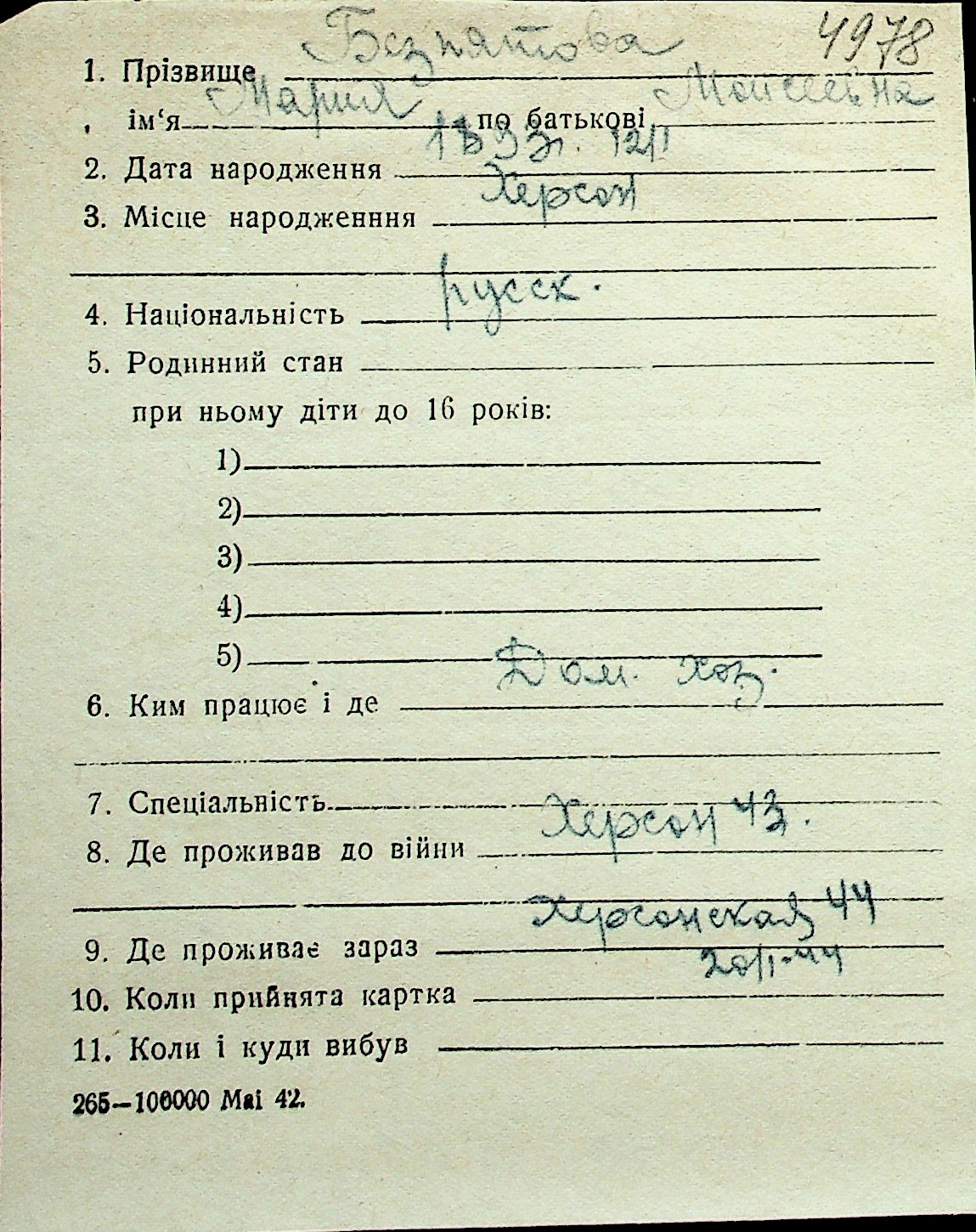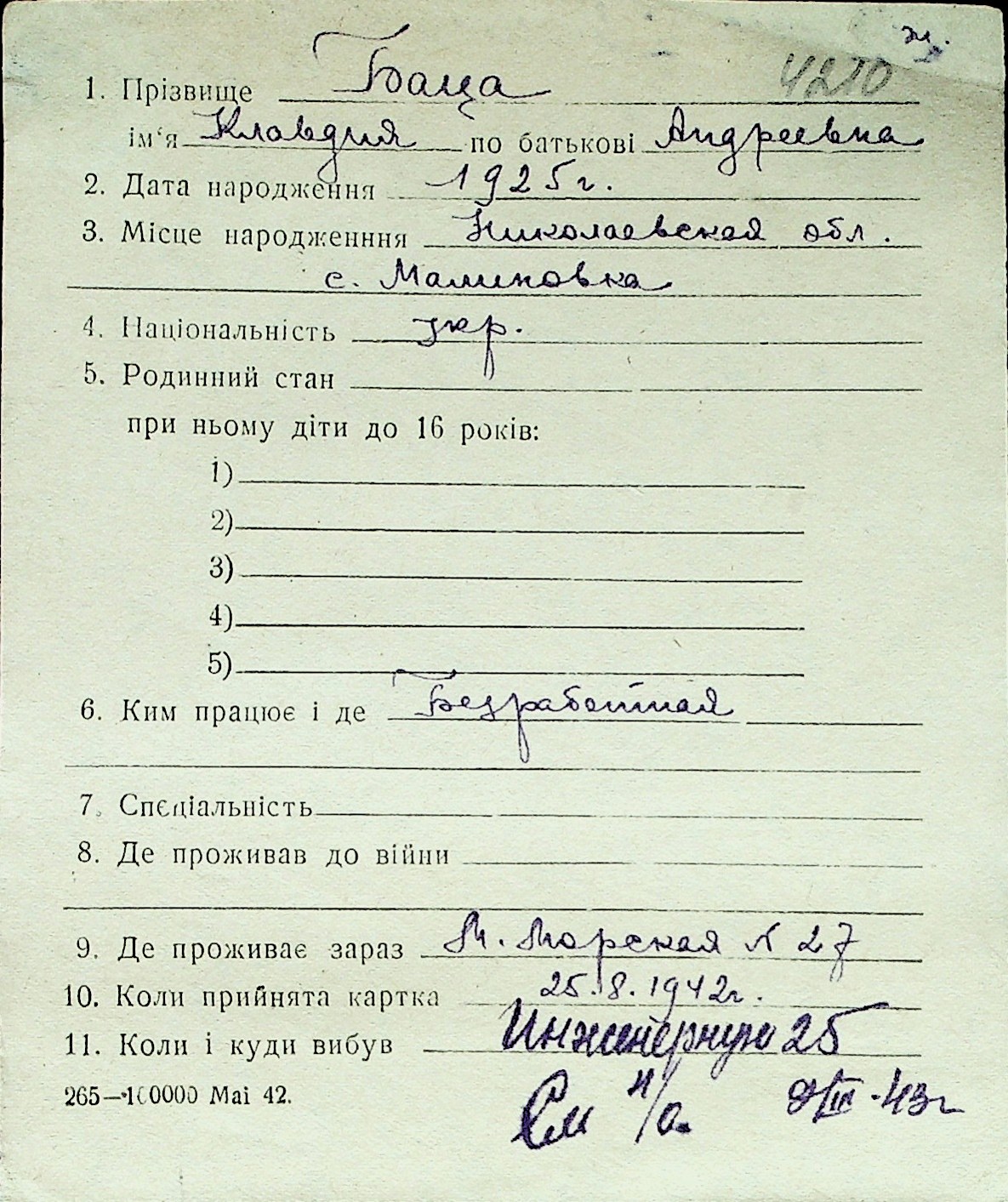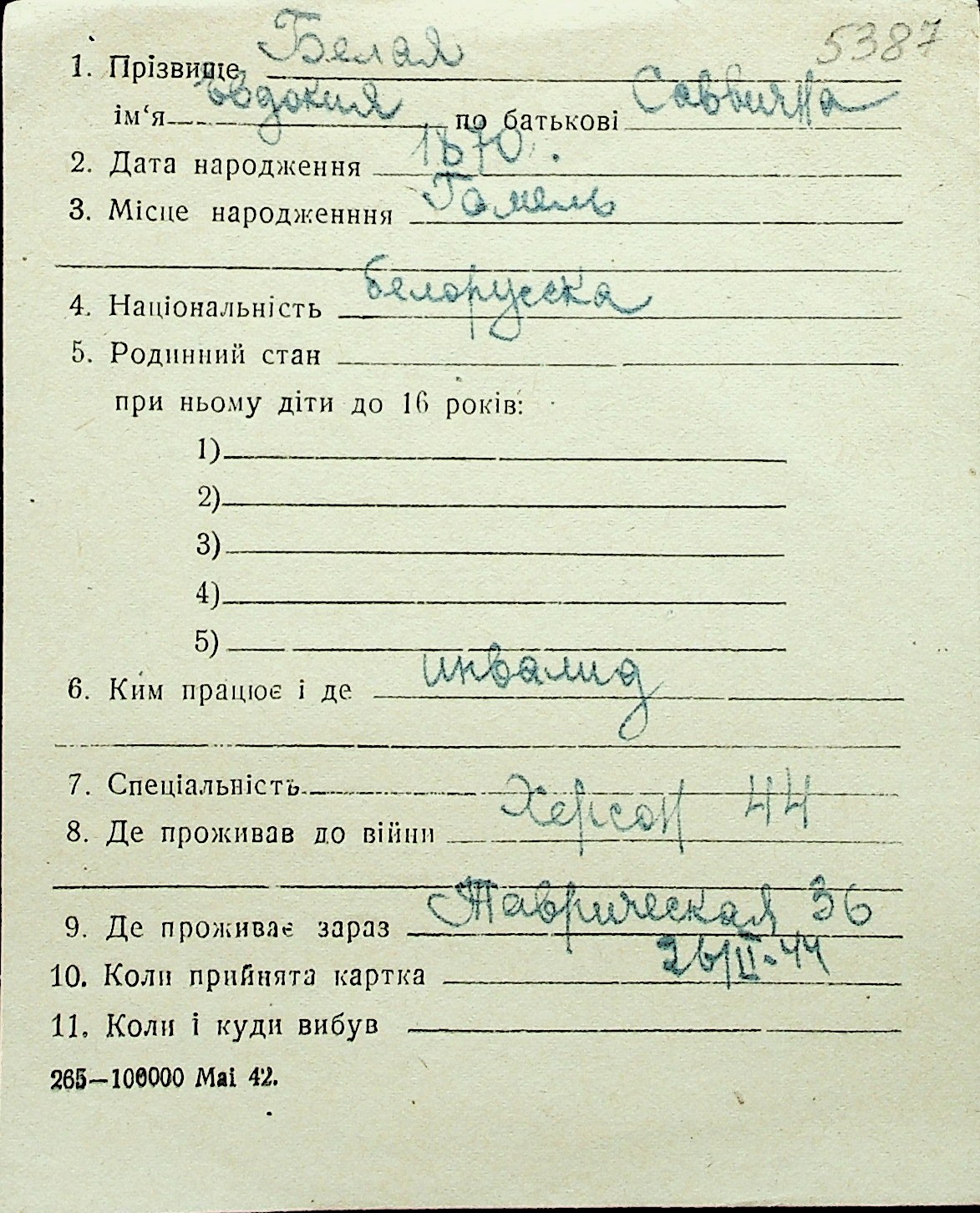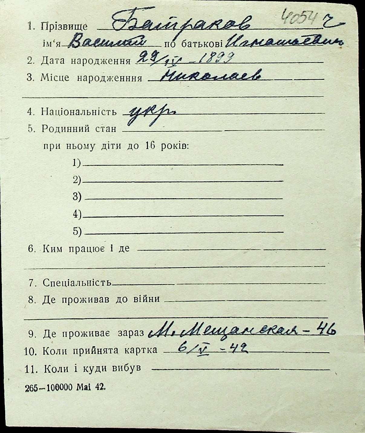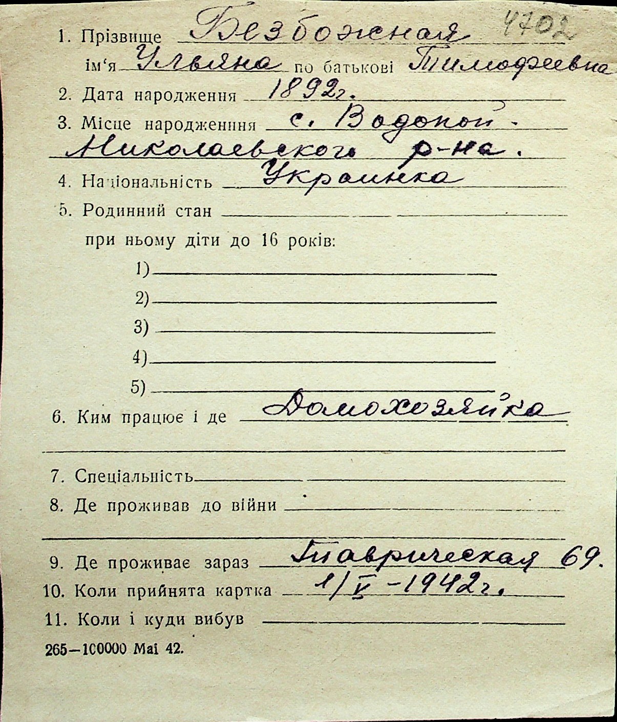 ◦ ◦ Перелік карток на осіб, які мешкали у м. Миколаїв у період окупації 1941–1944 років