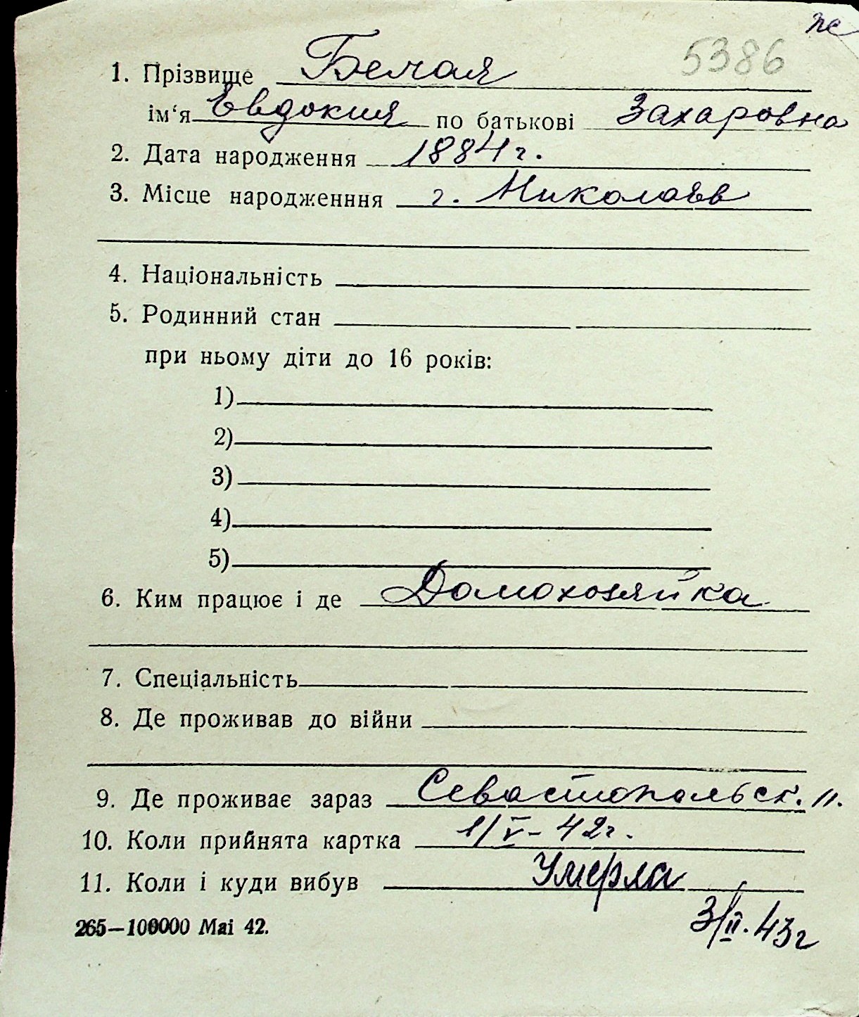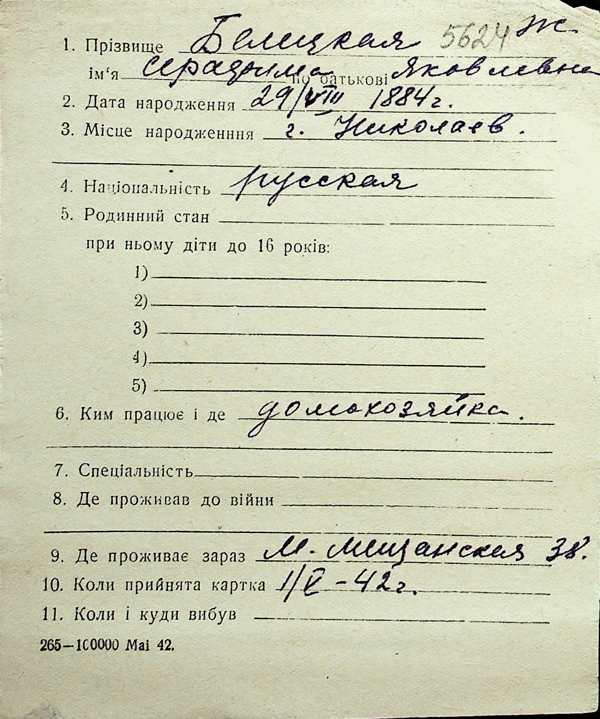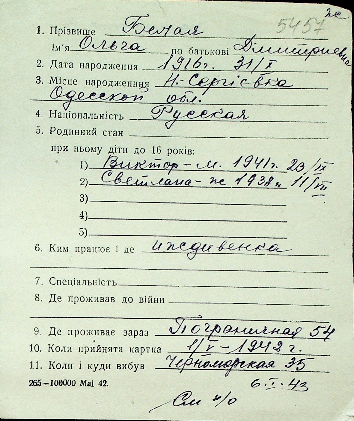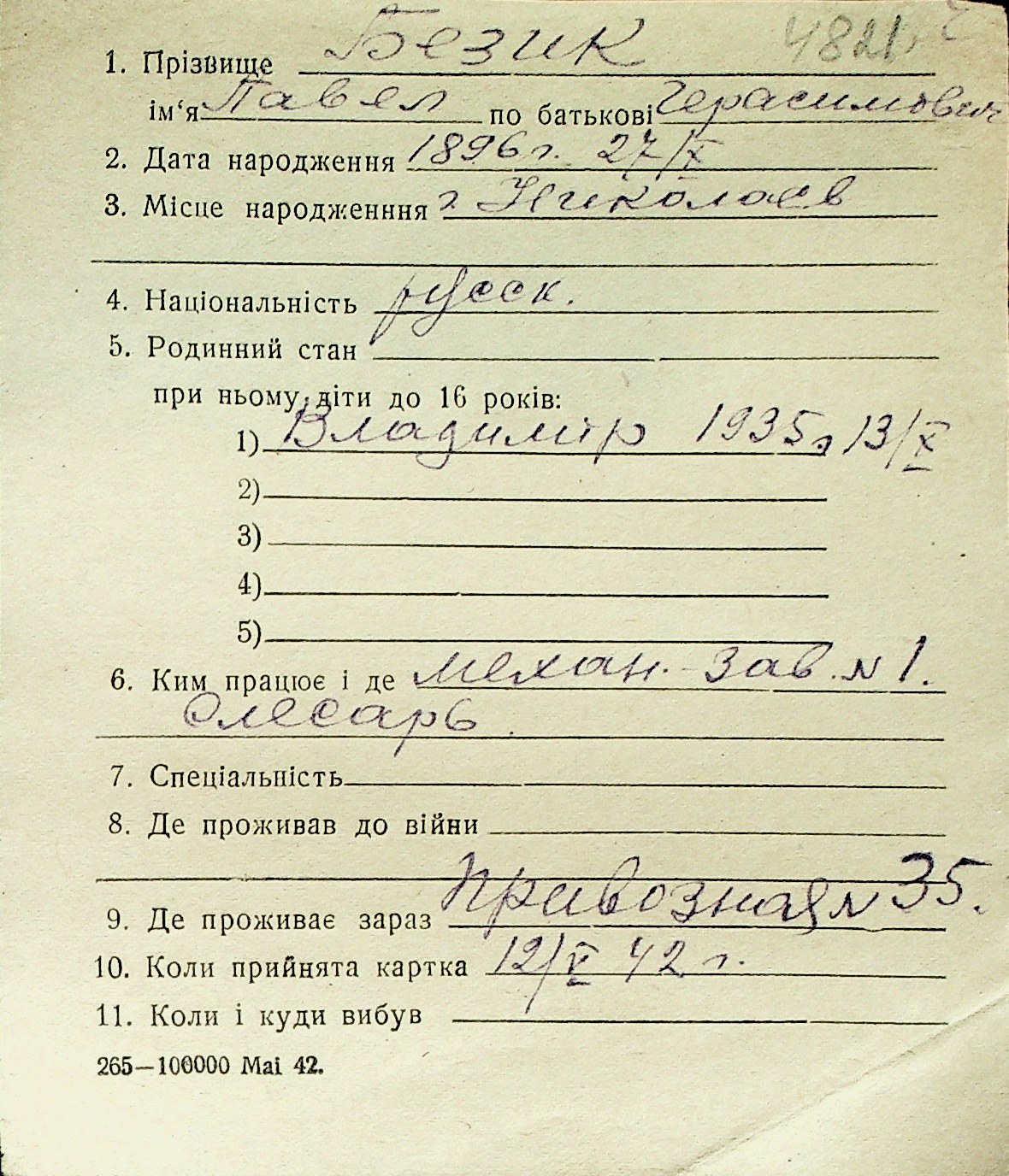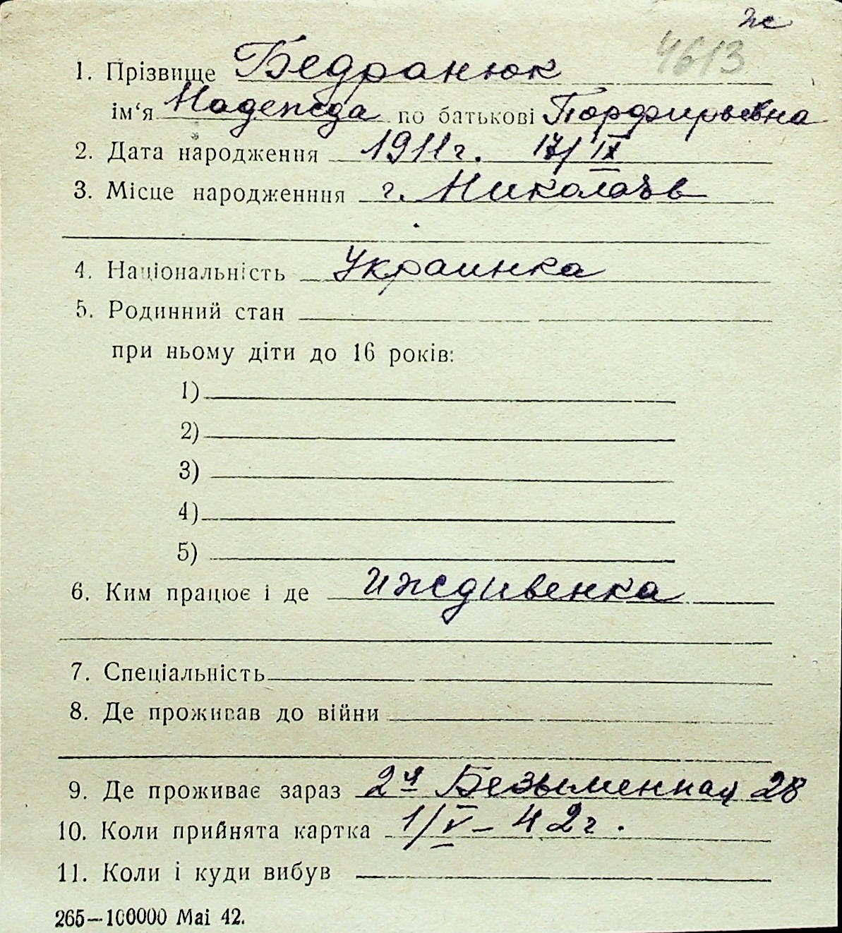 ◦ ◦ Перелік карток на осіб, які мешкали у м. Миколаїв у період окупації 1941–1944 років