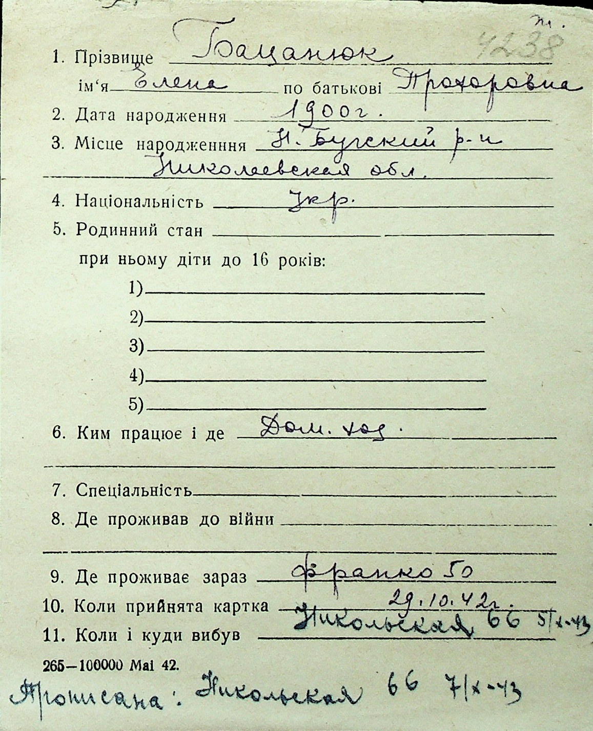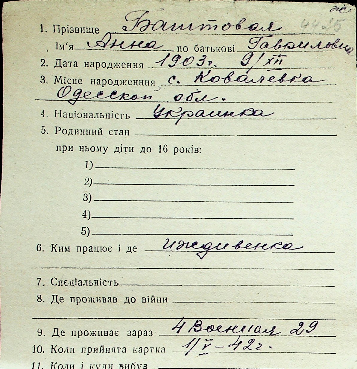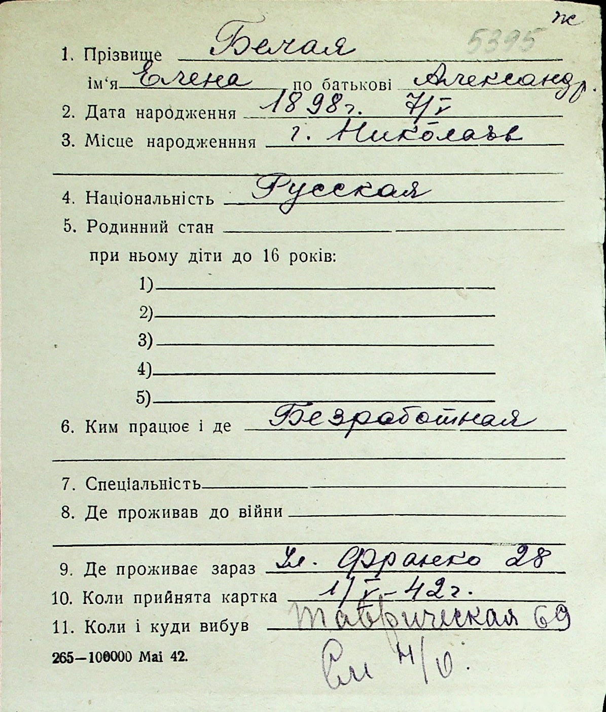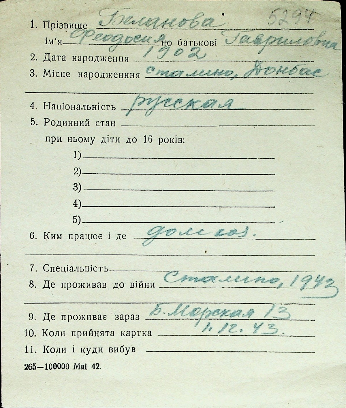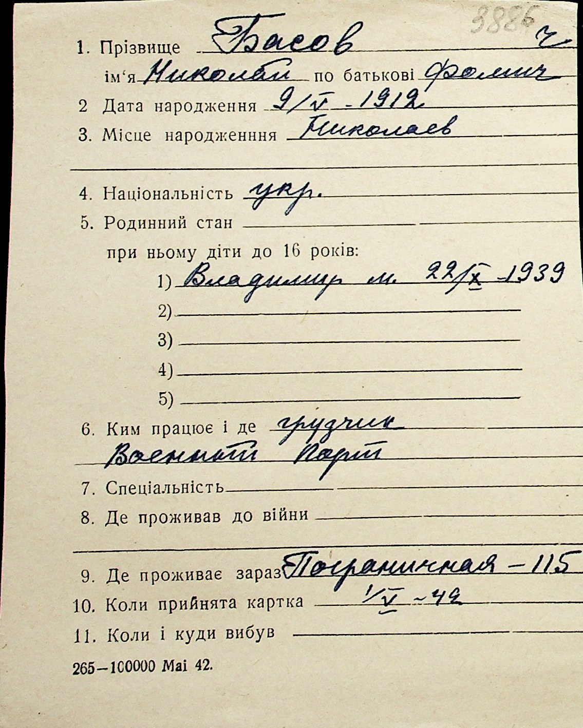 ◦ ◦ Перелік карток на осіб, які мешкали у м. Миколаїв у період окупації 1941–1944 років