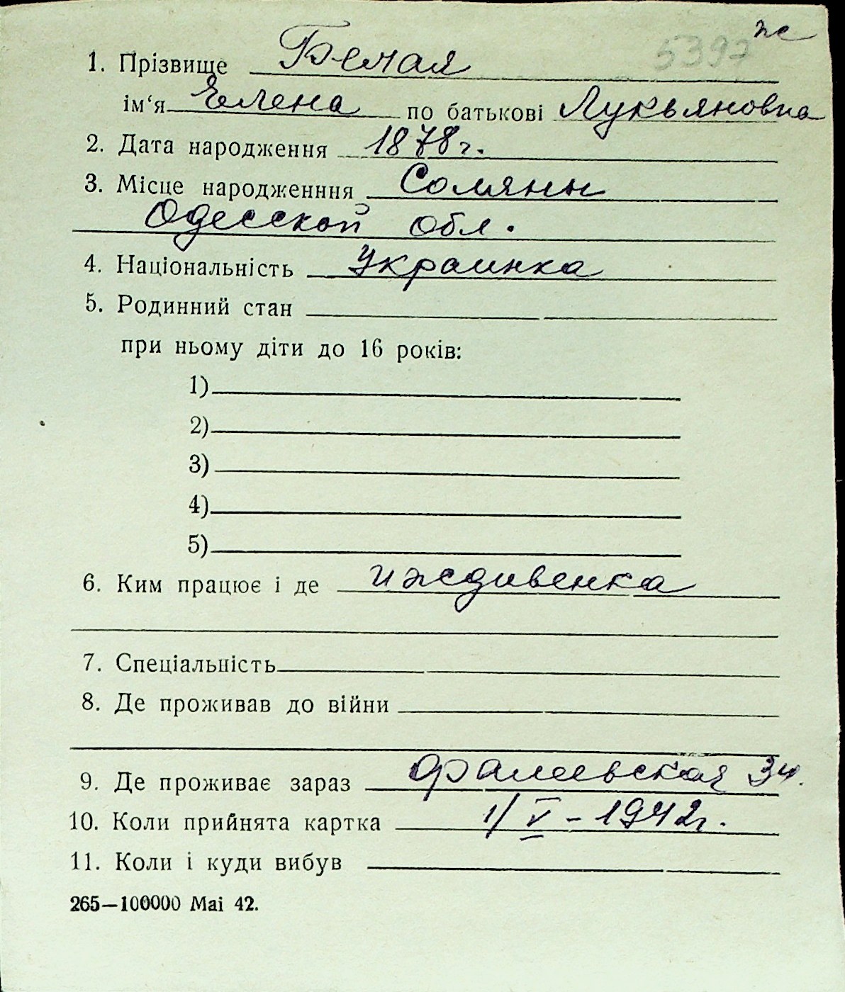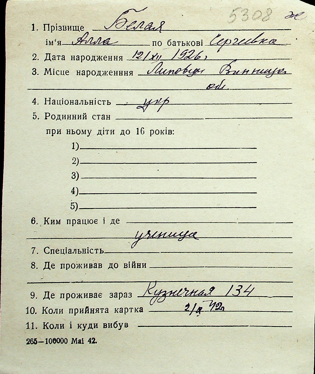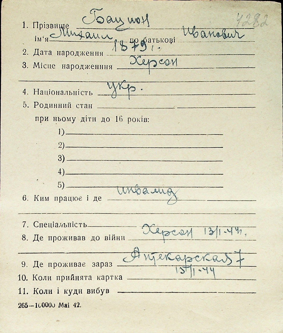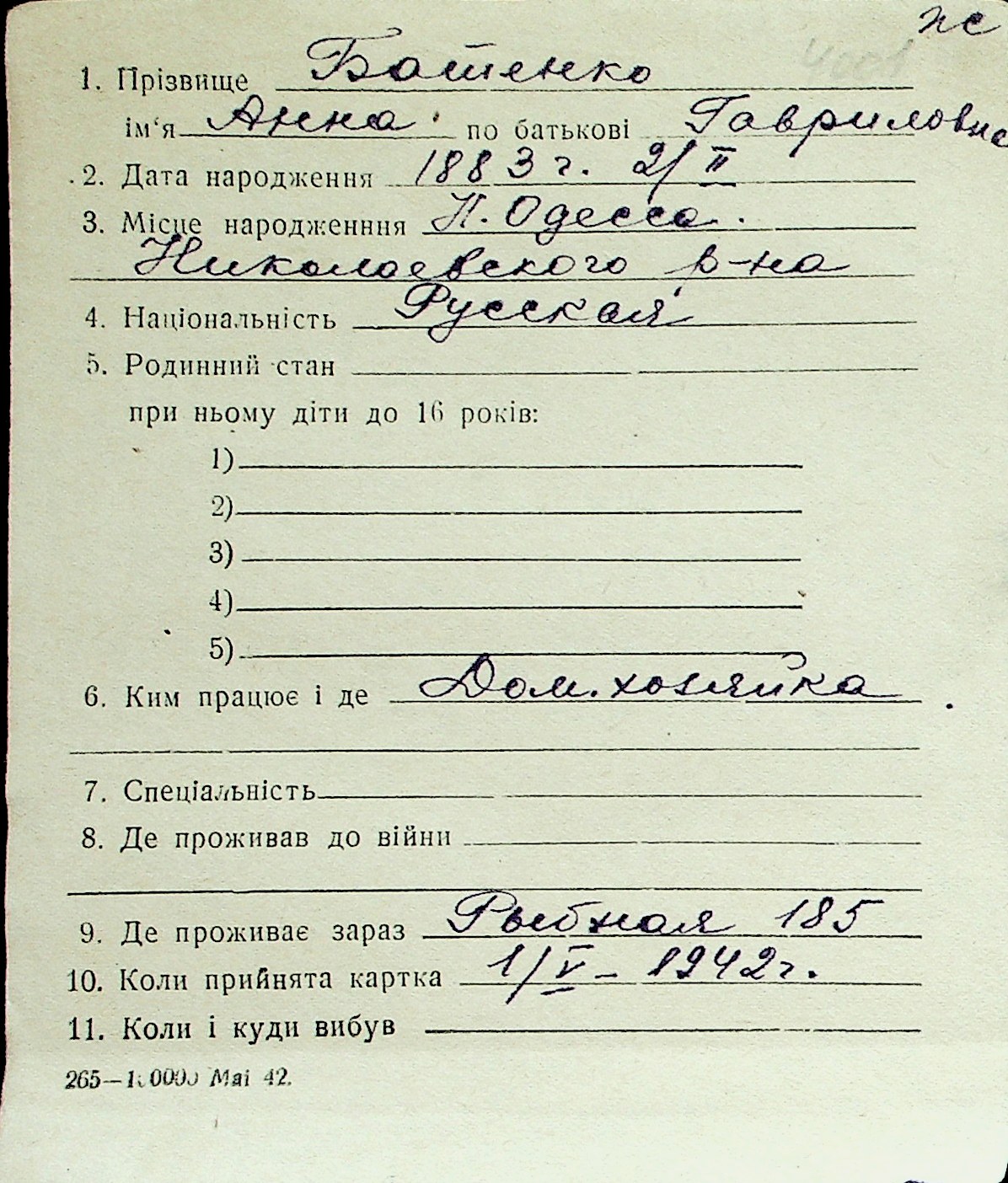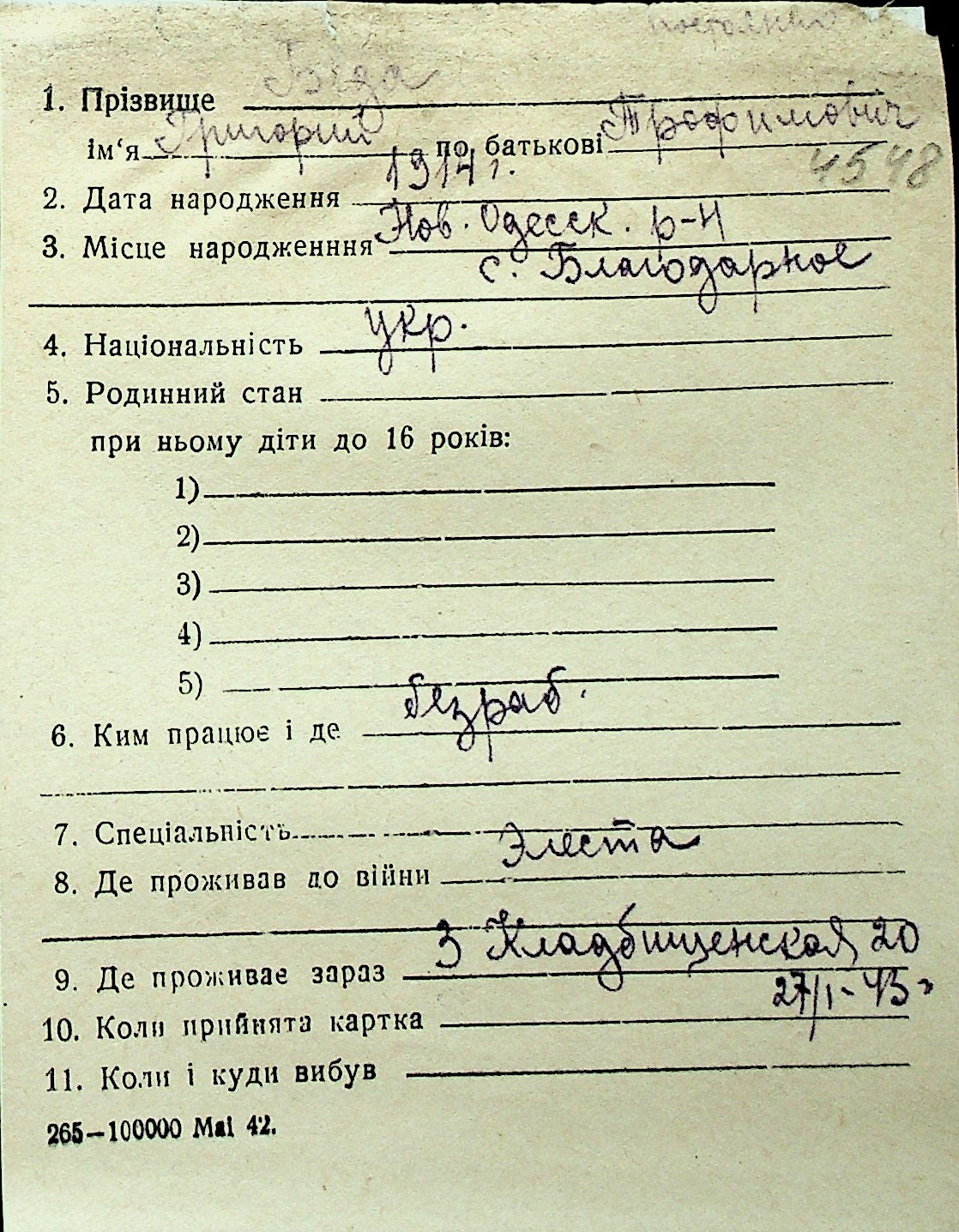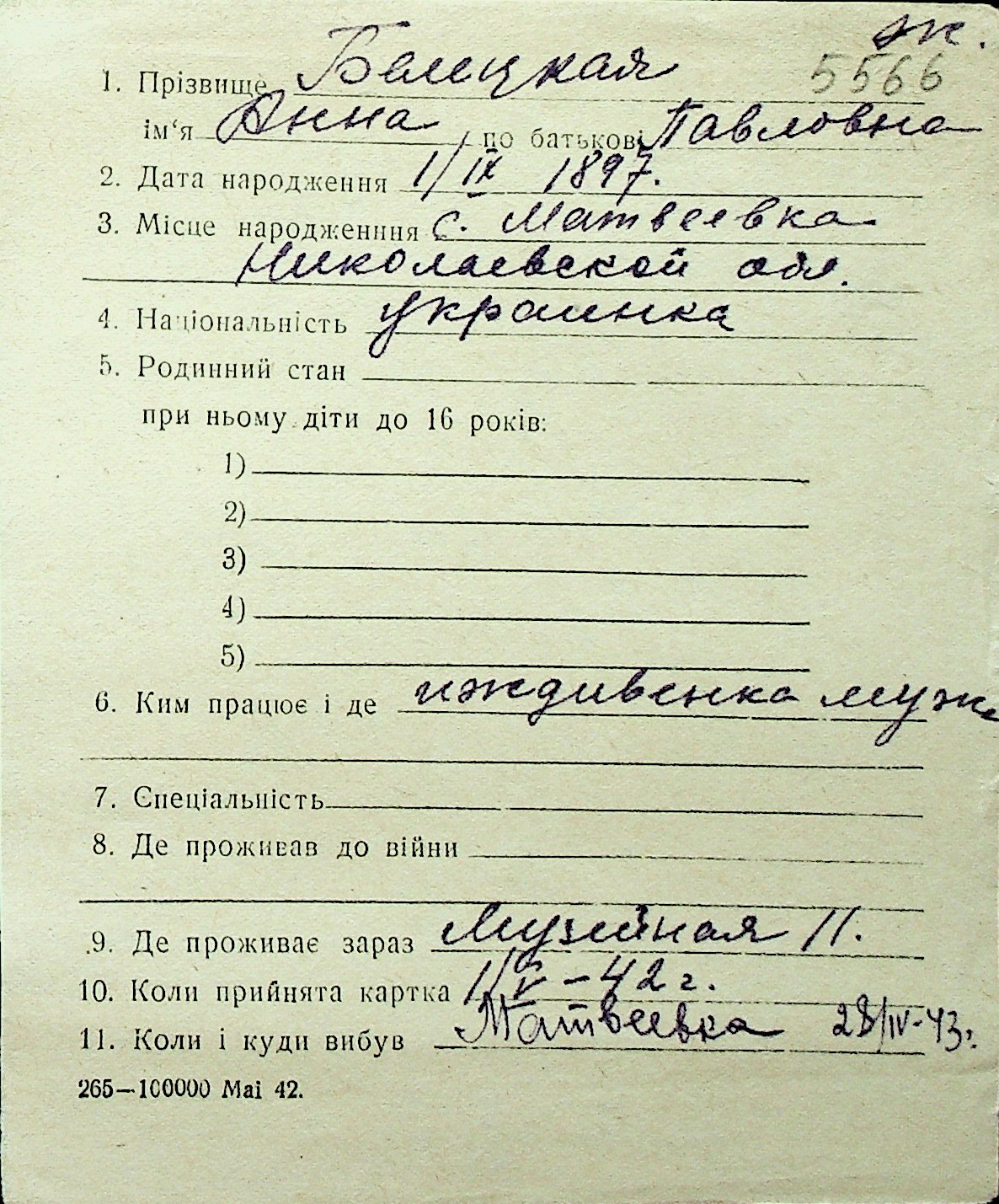 ◦ ◦ Перелік карток на осіб, які мешкали у м. Миколаїв у період окупації 1941–1944 років