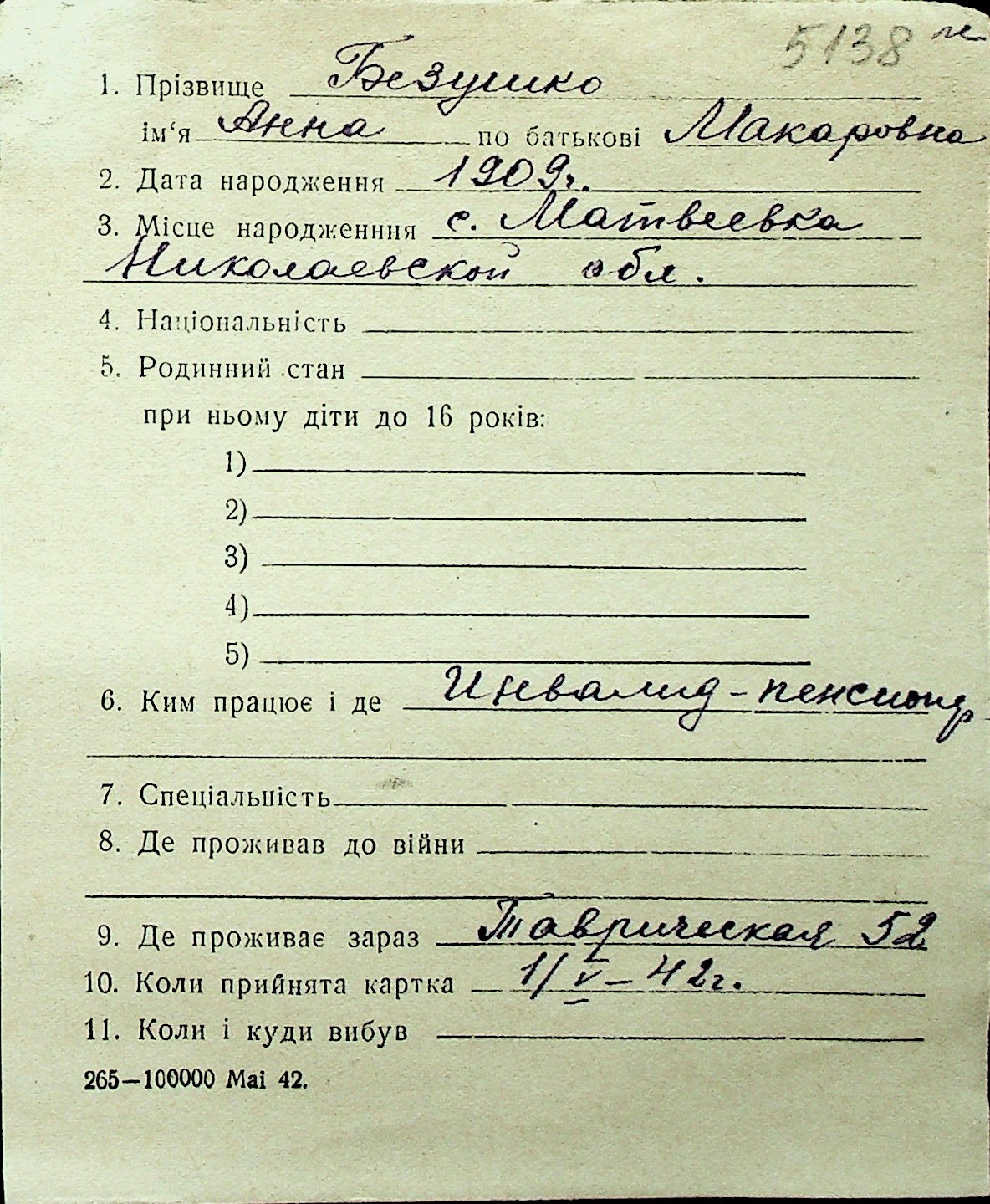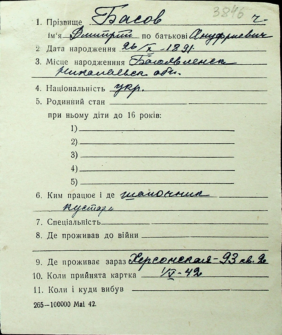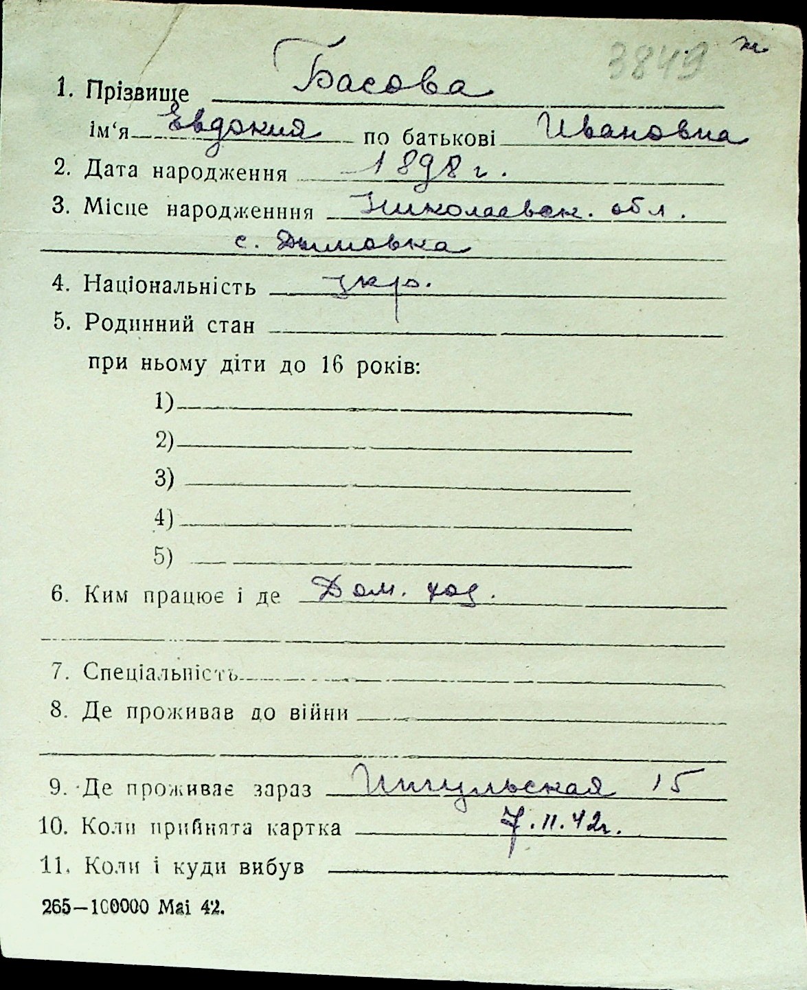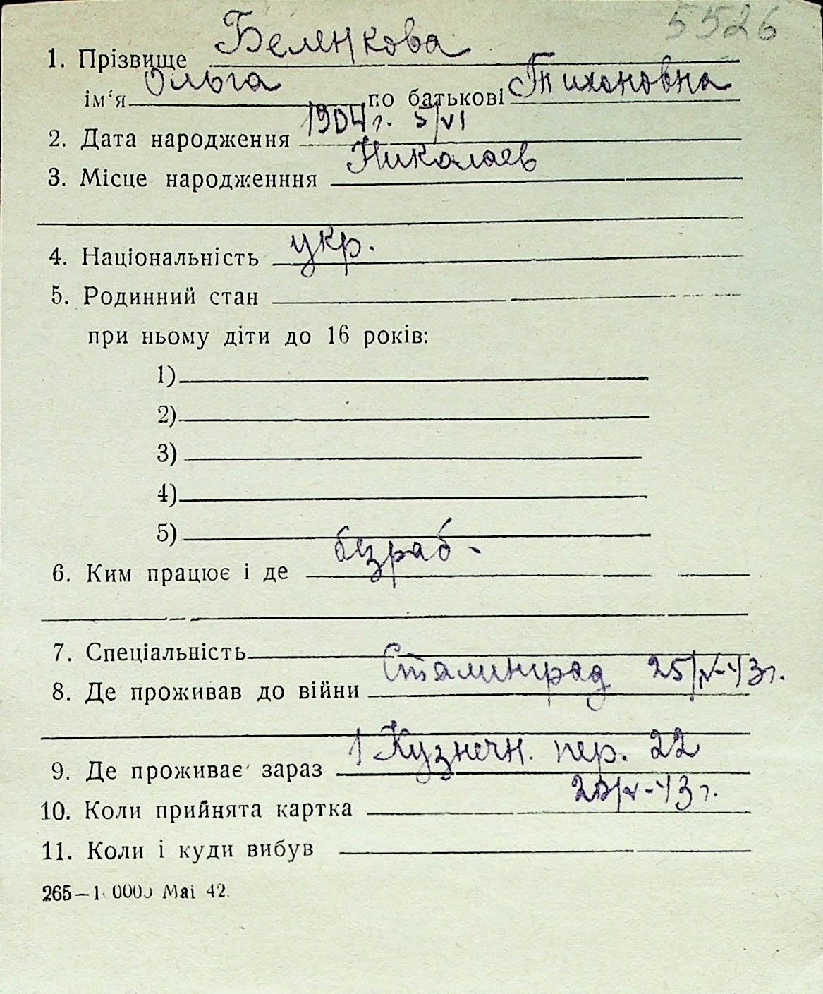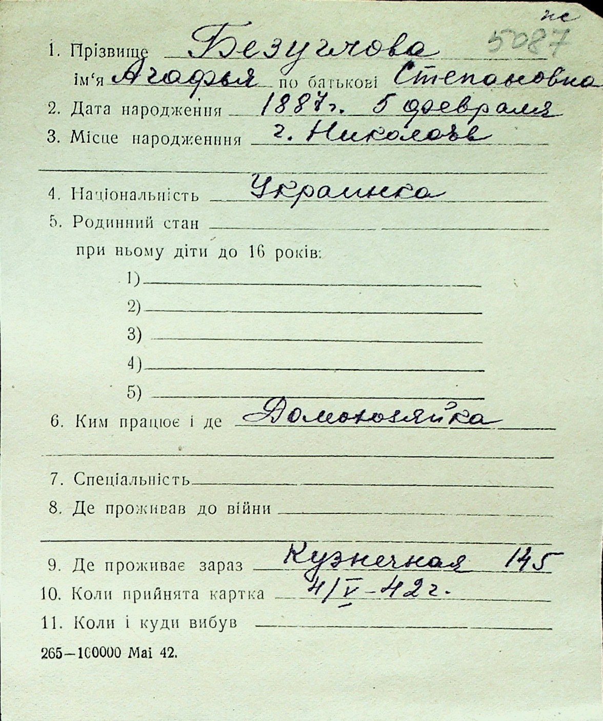 ◦ ◦ Перелік карток на осіб, які мешкали у м. Миколаїв у період окупації 1941–1944 років