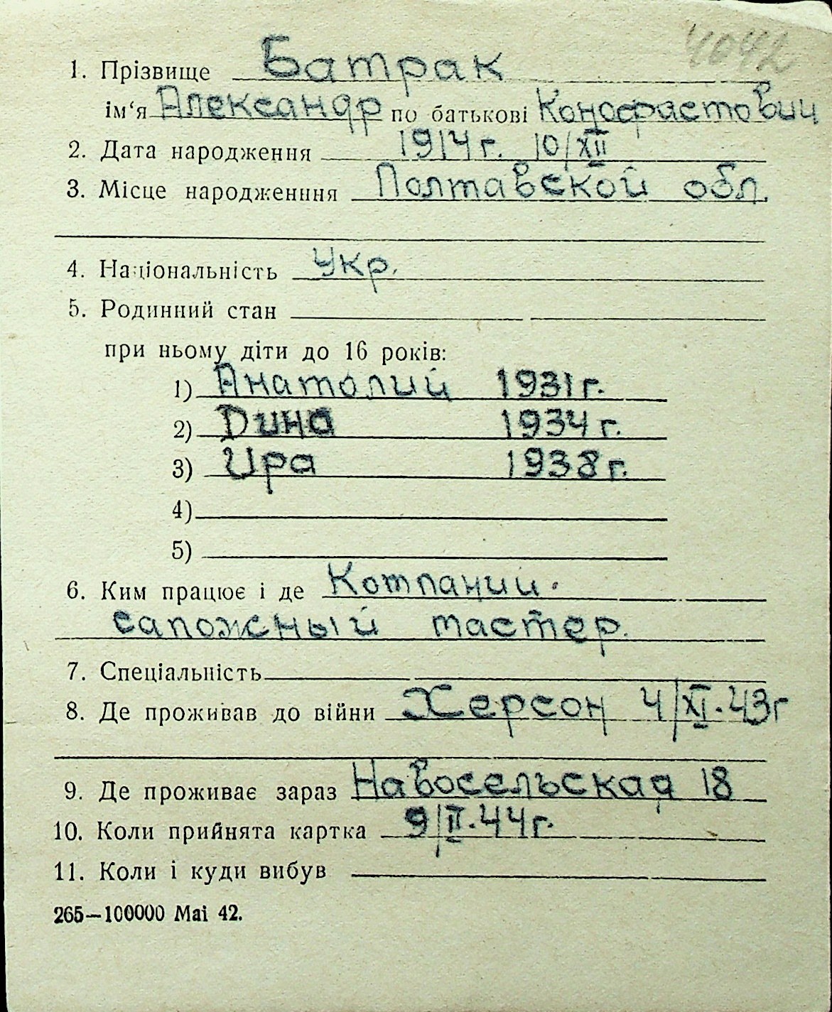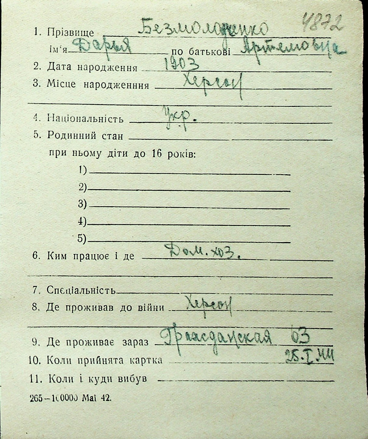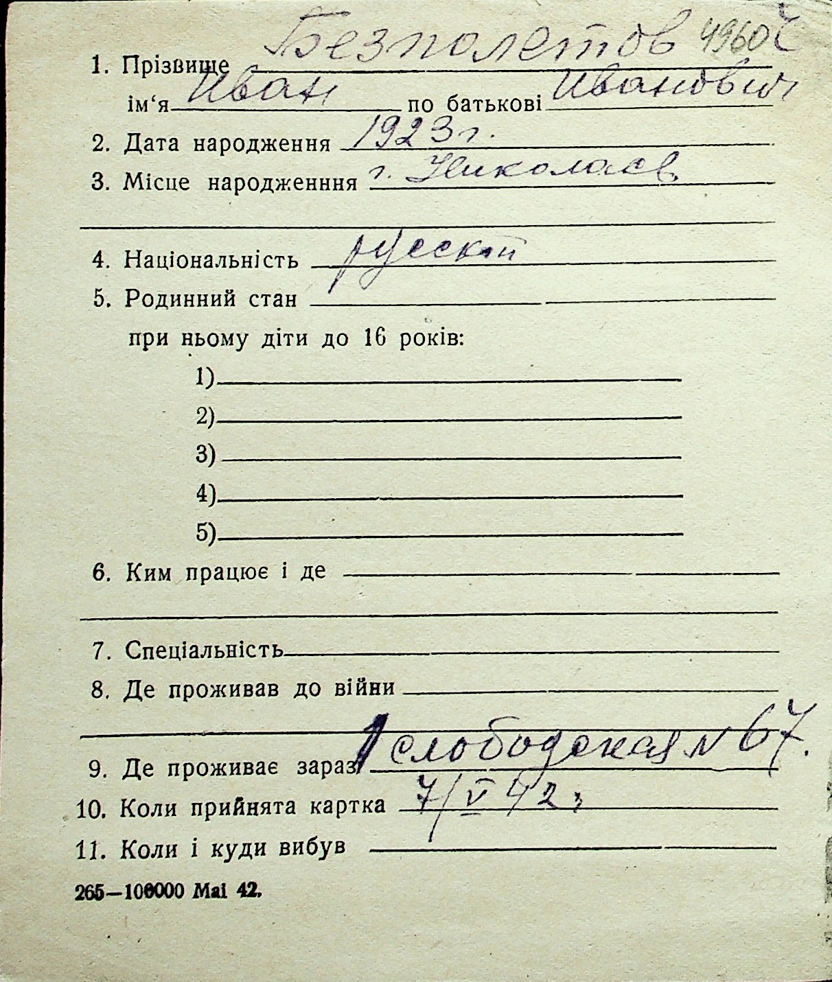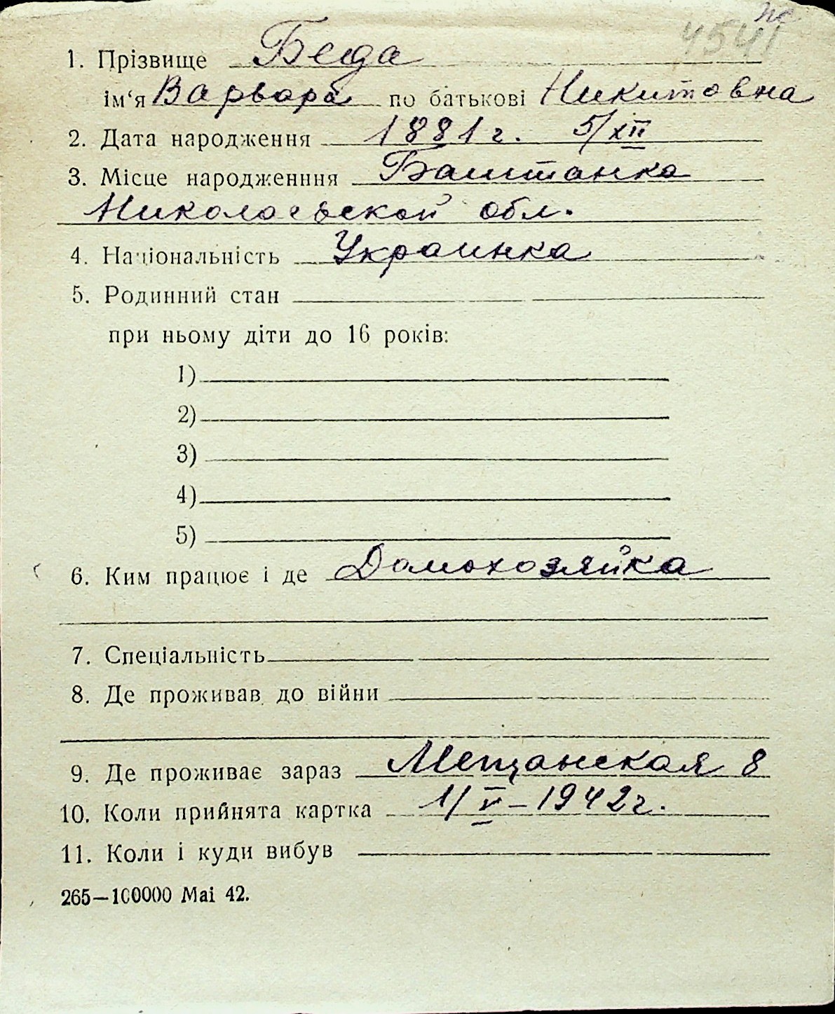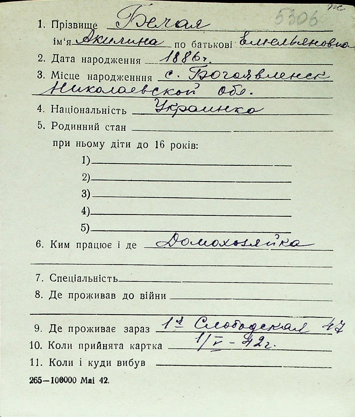 ◦ ◦ Перелік карток на осіб, які мешкали у м. Миколаїв у період окупації 1941–1944 років