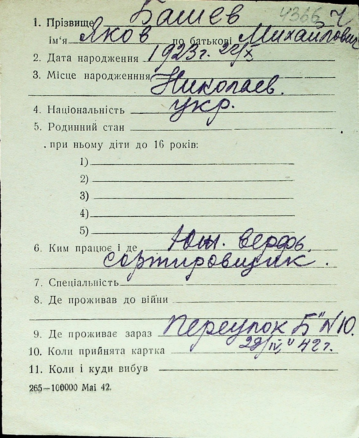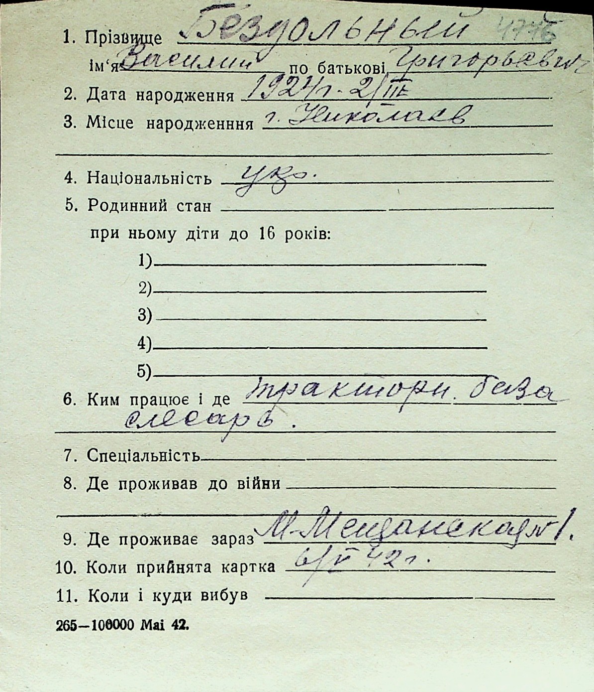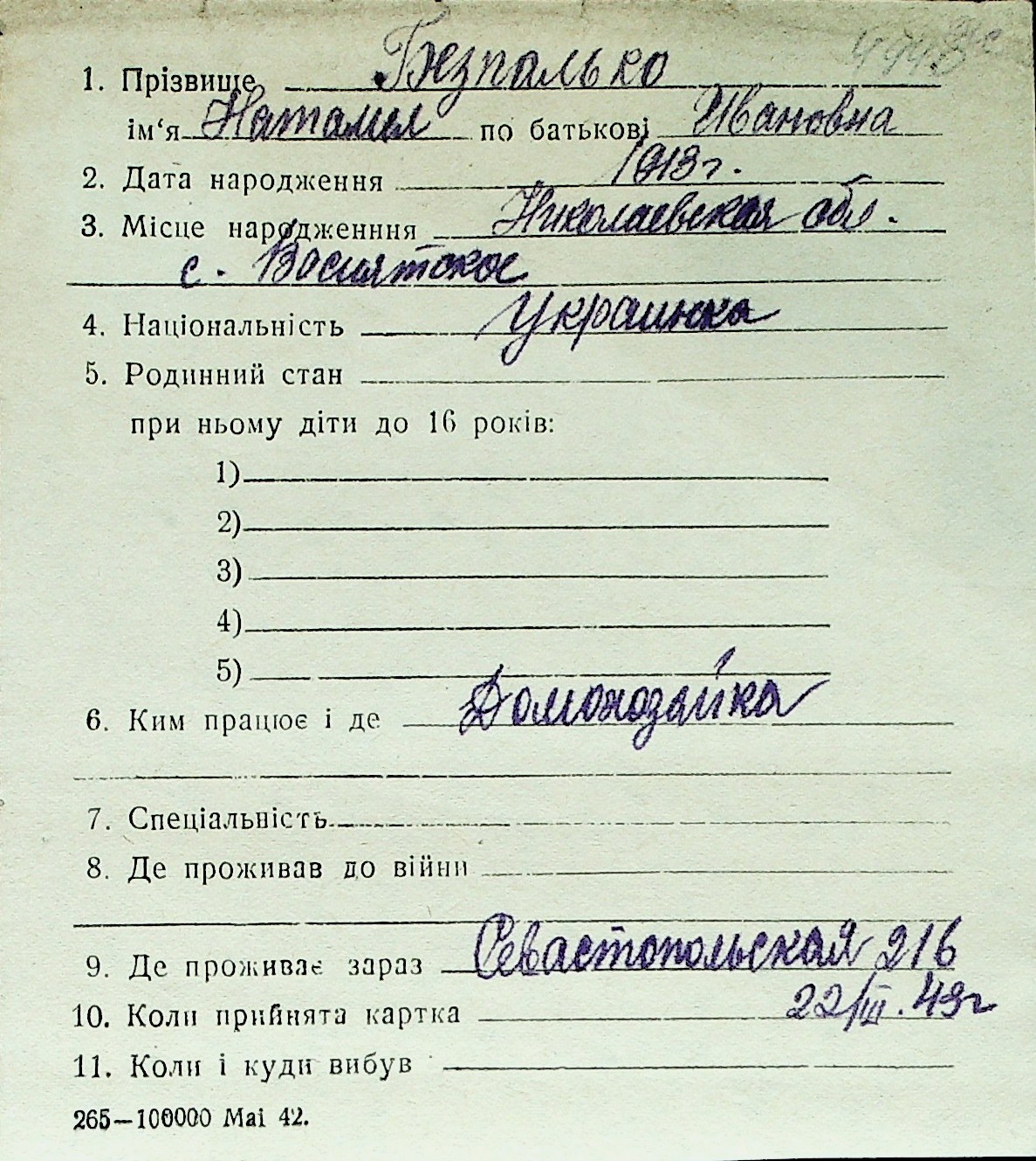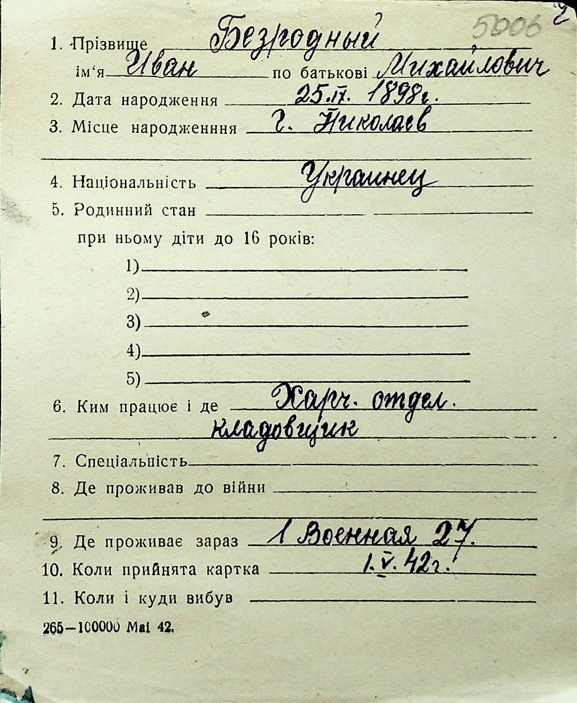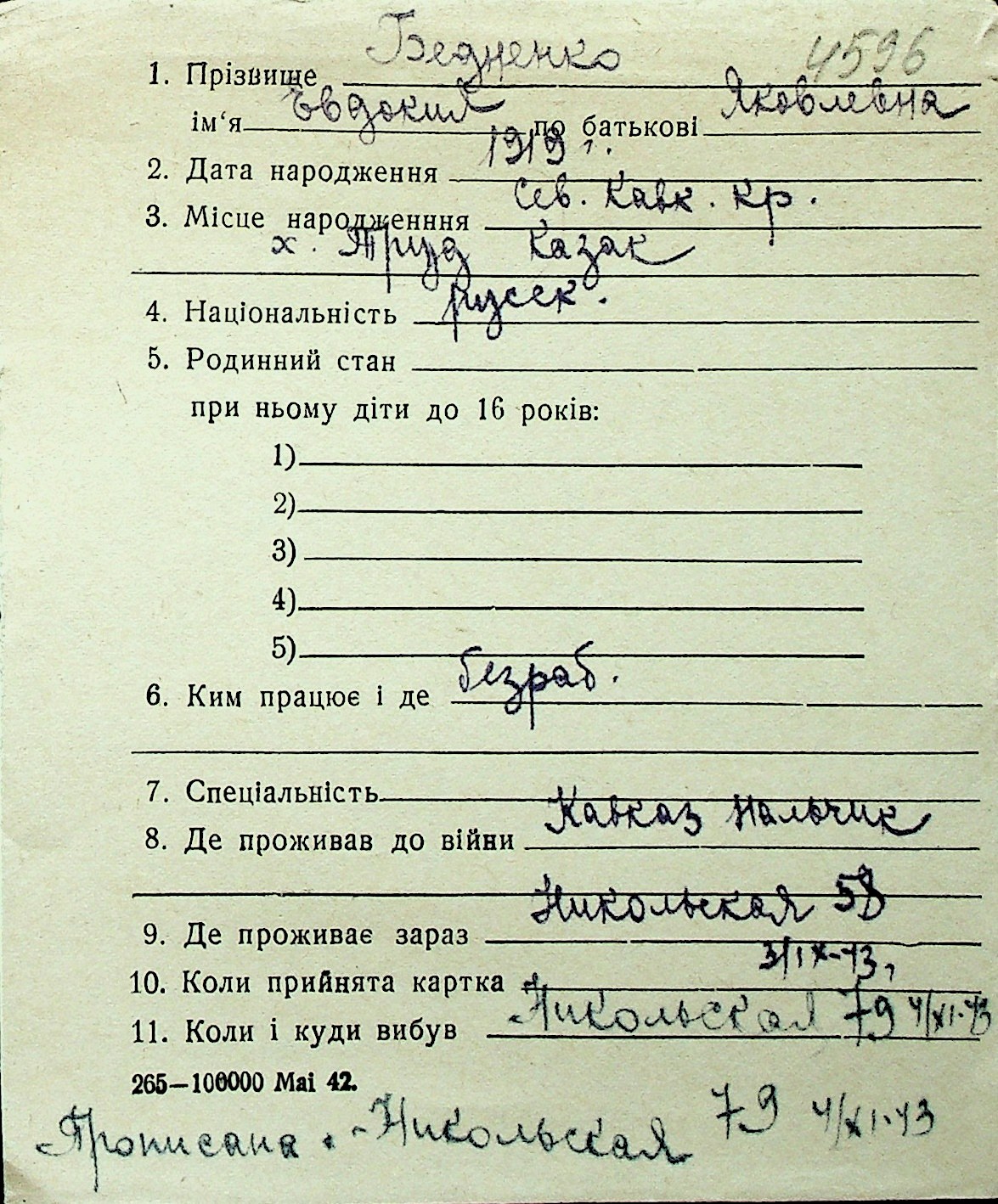 ◦ ◦ Перелік карток на осіб, які мешкали у м. Миколаїв у період окупації 1941–1944 років