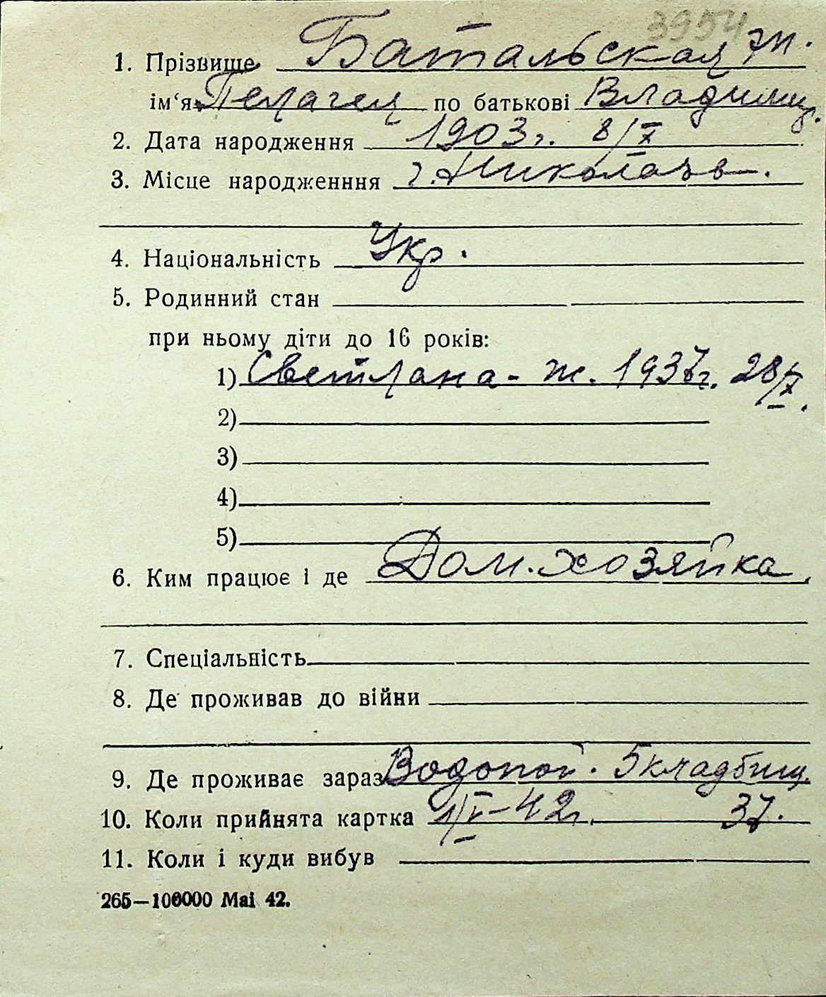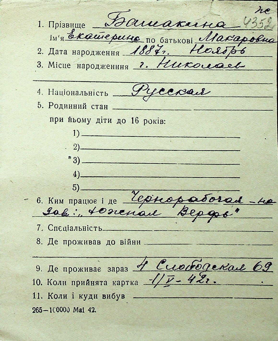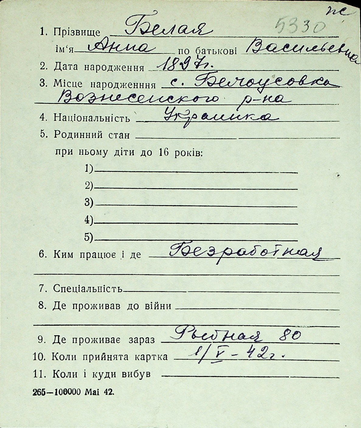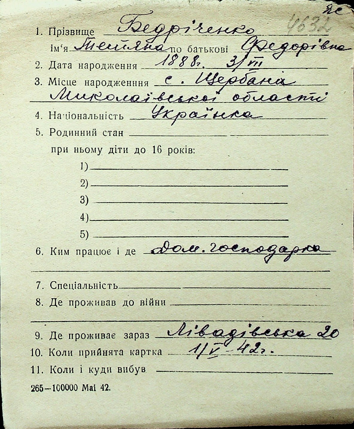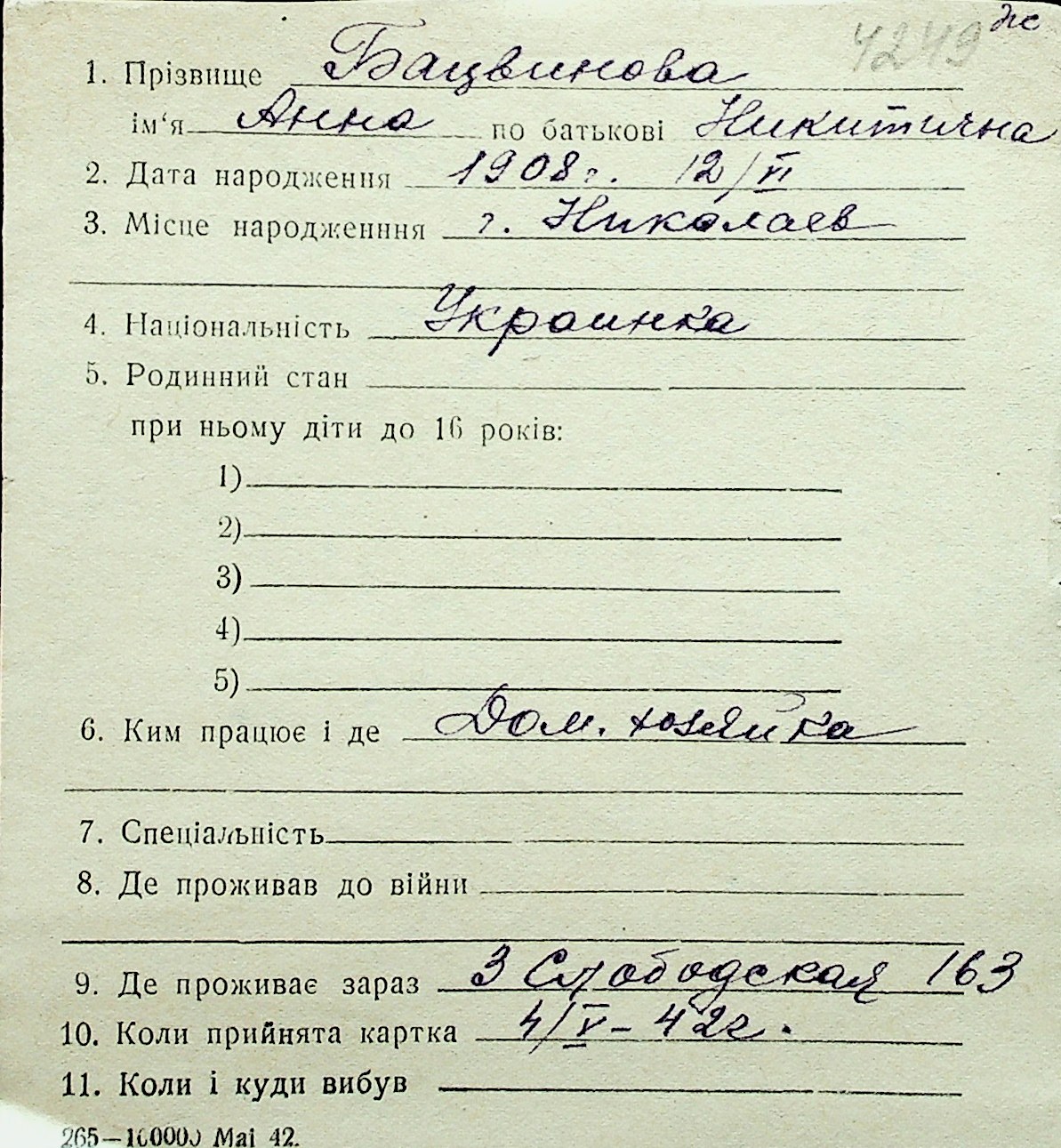 ◦ ◦ Перелік карток на осіб, які мешкали у м. Миколаїв у період окупації 1941–1944 років