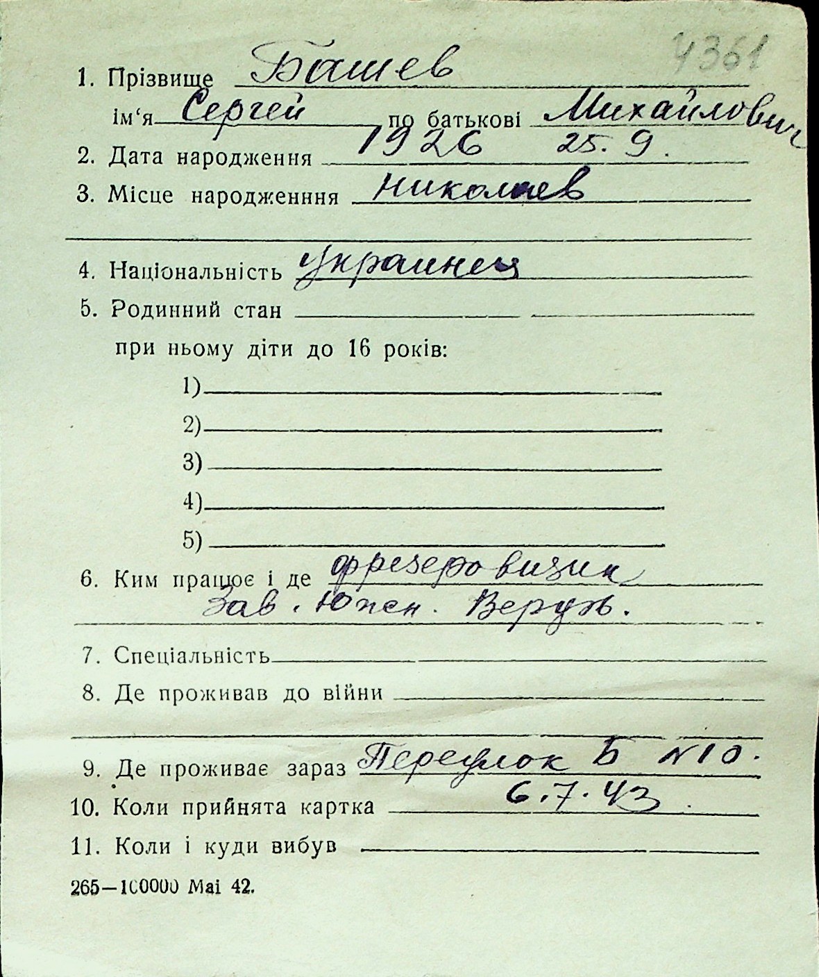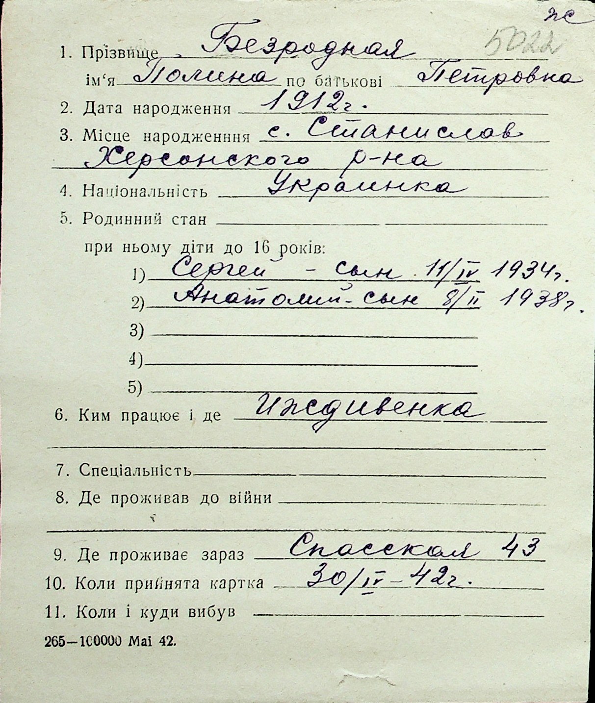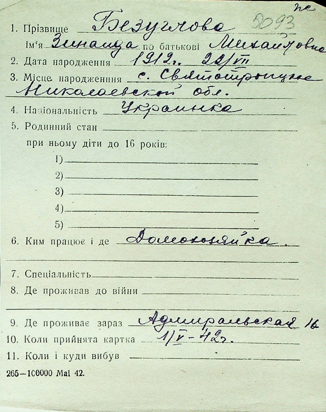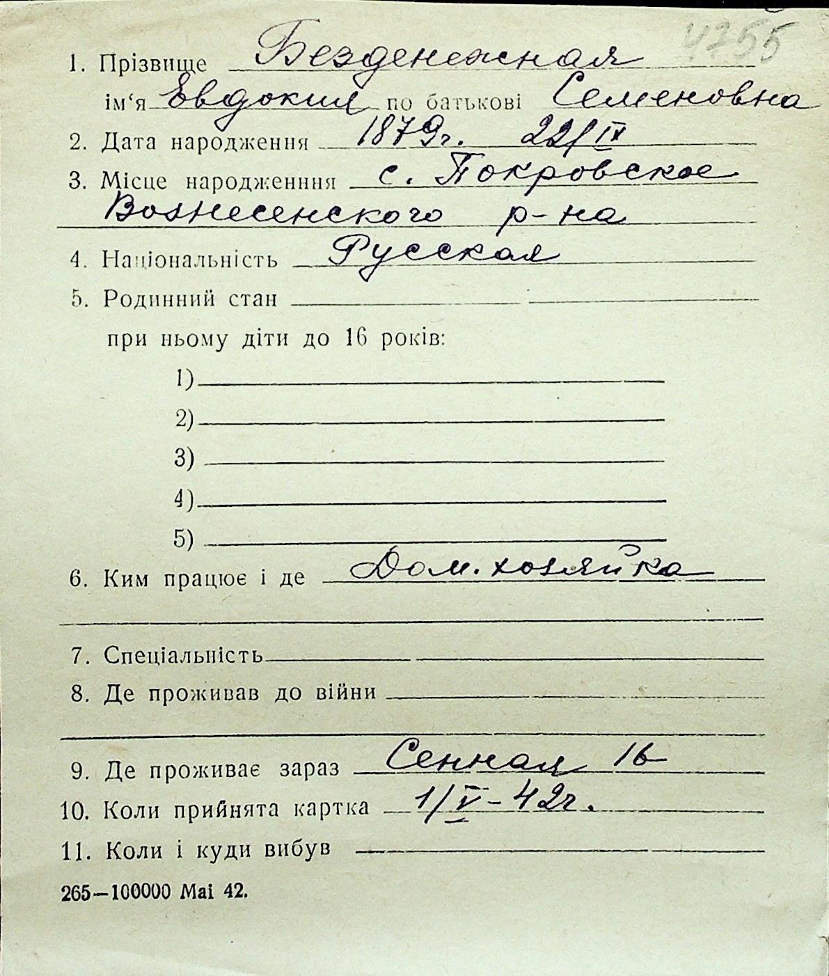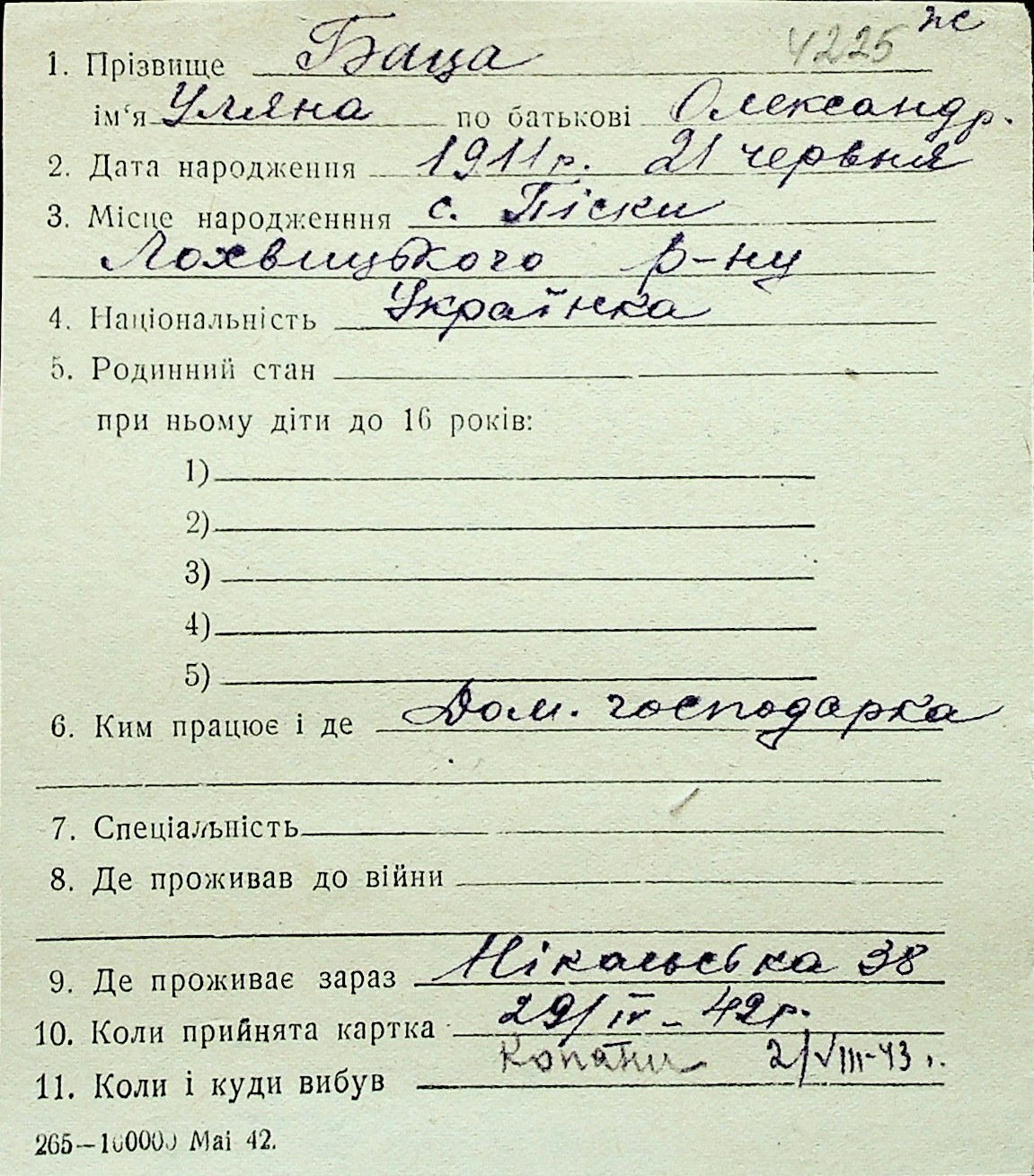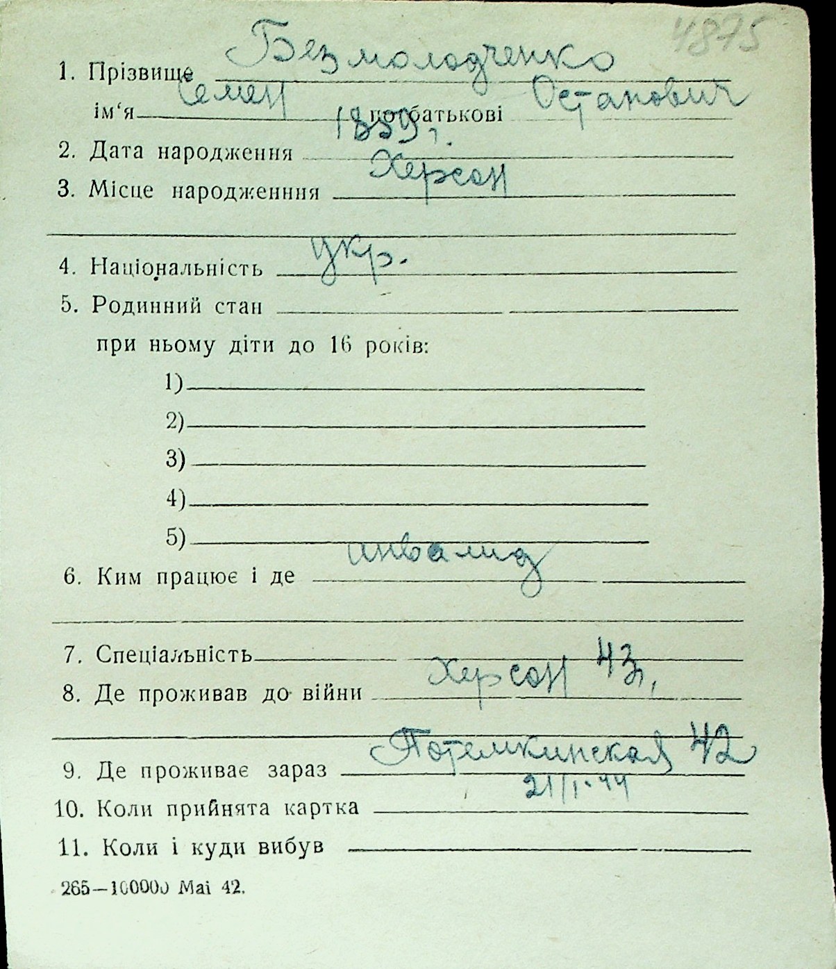 ◦ ◦ Перелік карток на осіб, які мешкали у м. Миколаїв у період окупації 1941–1944 років