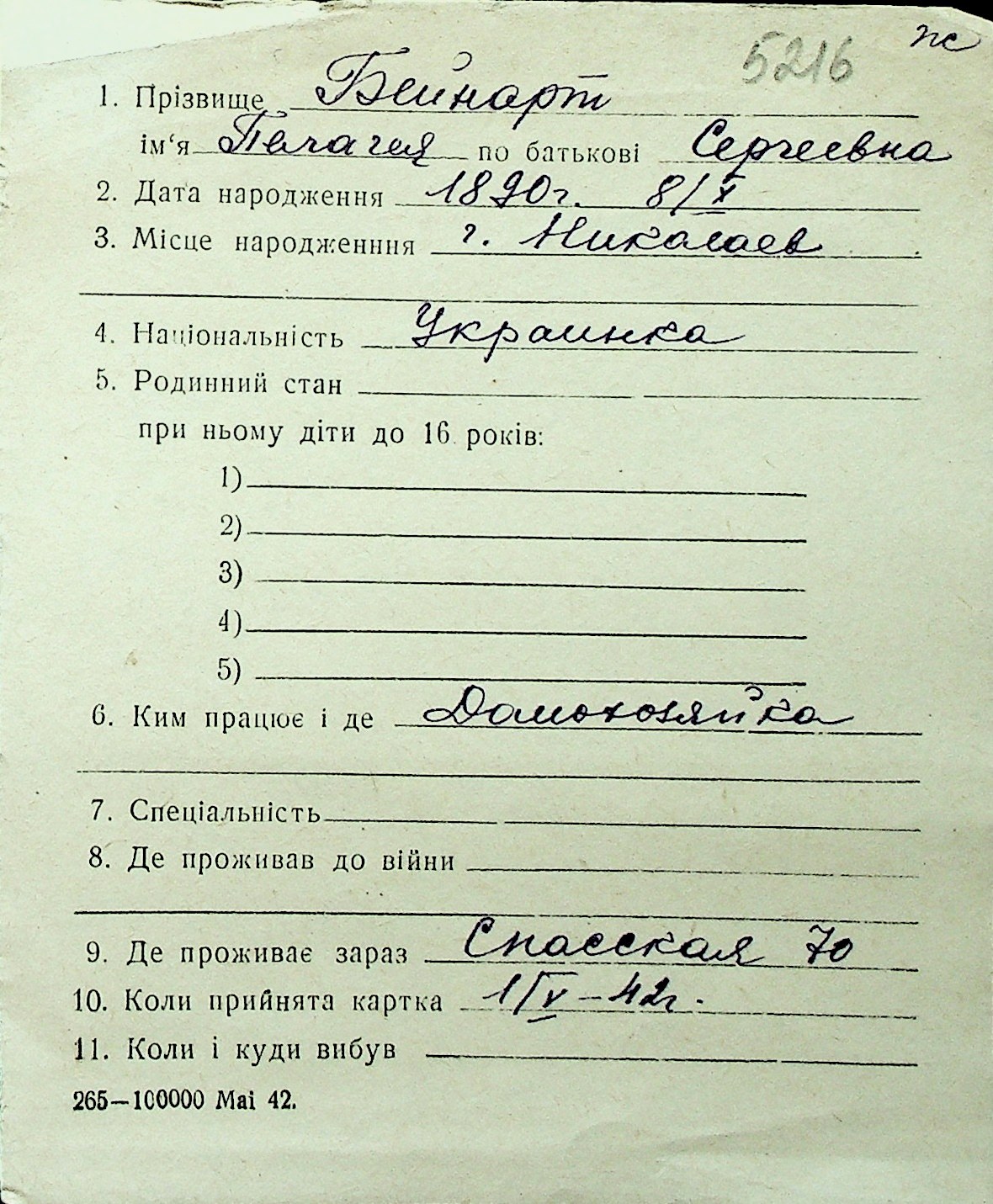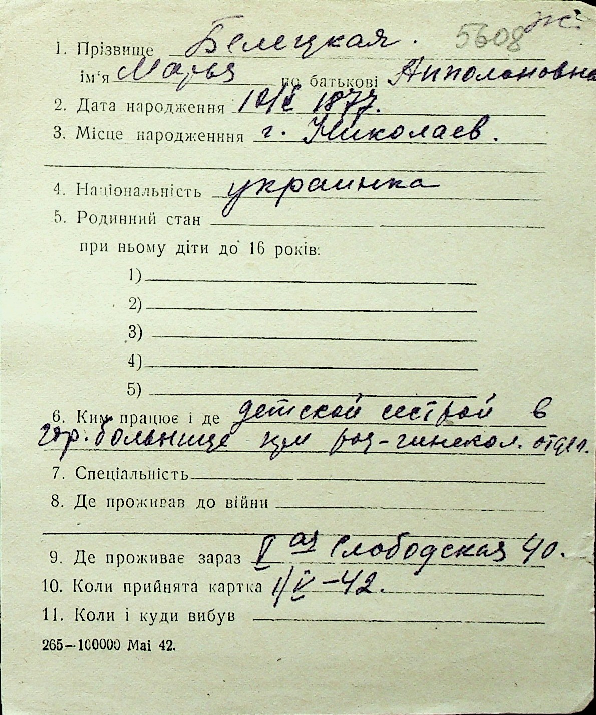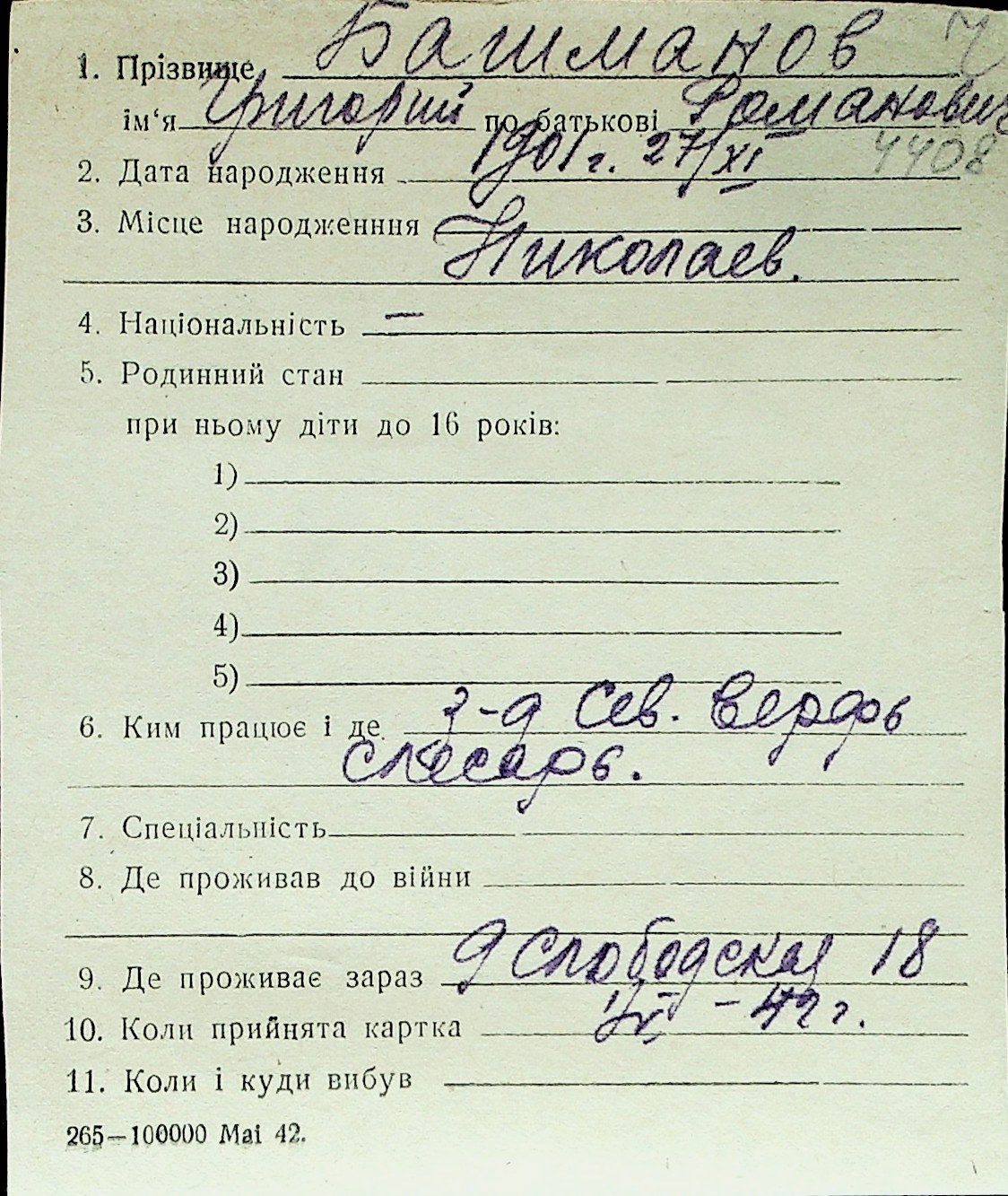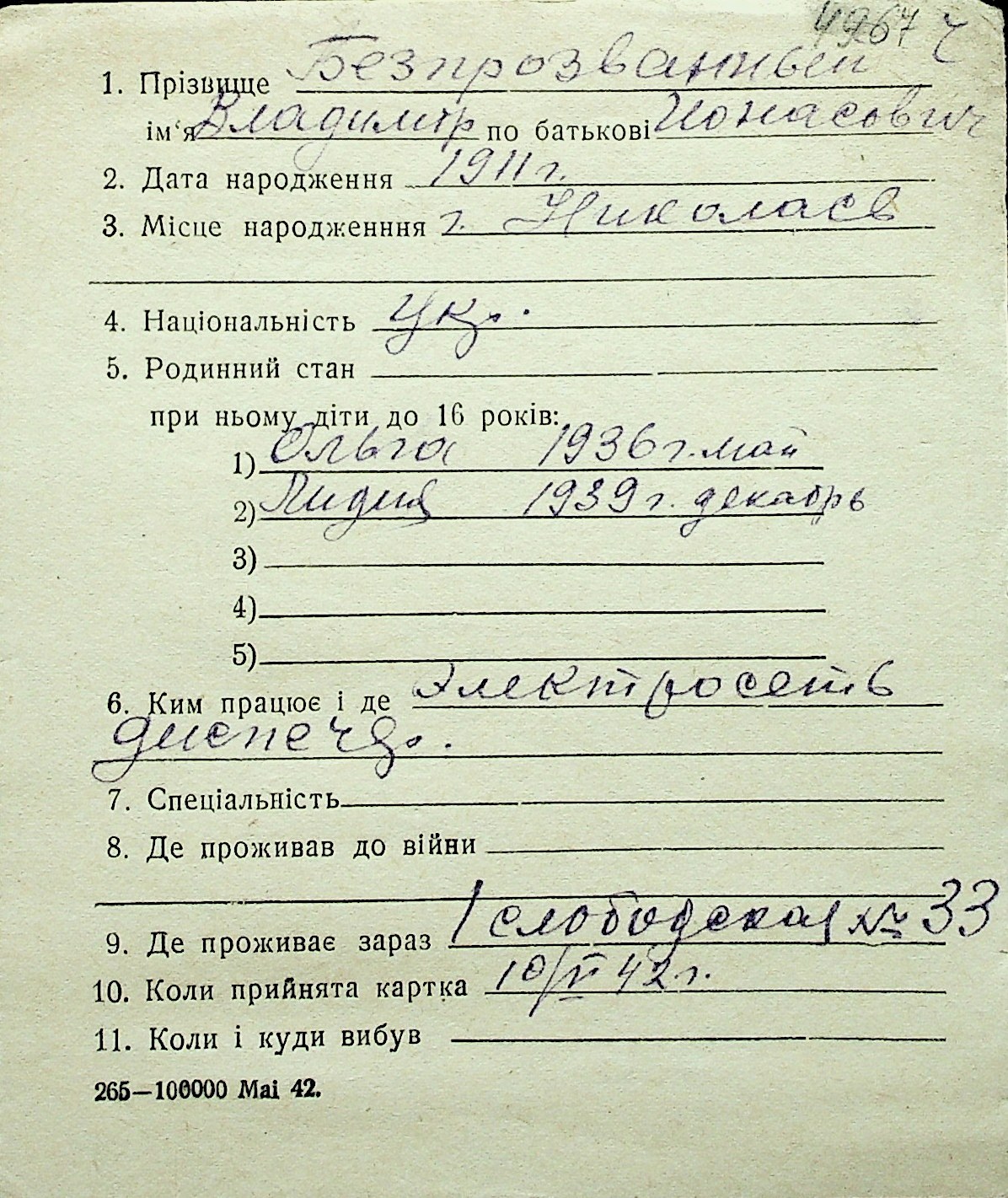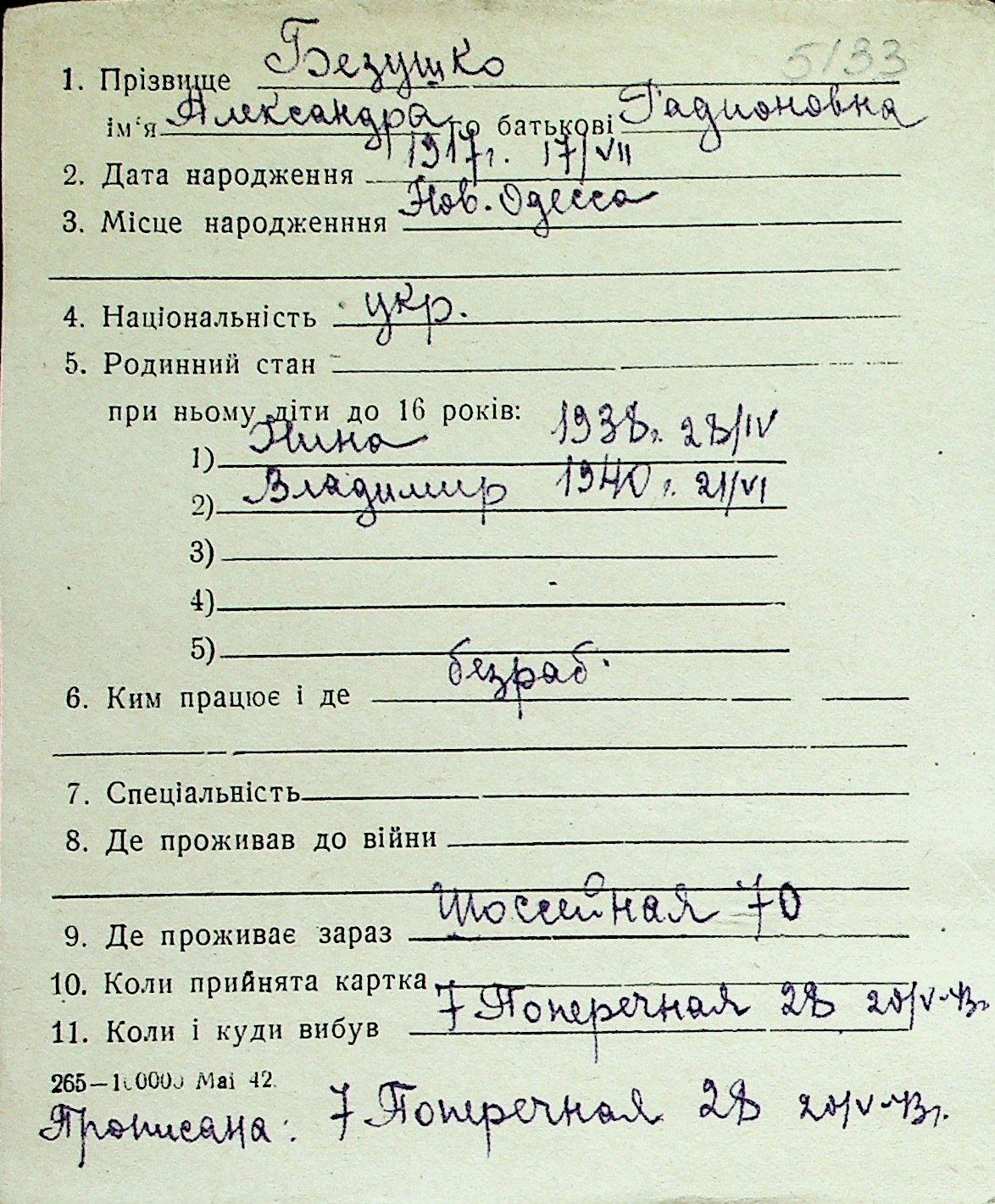 ◦ ◦ Перелік карток на осіб, які мешкали у м. Миколаїв у період окупації 1941–1944 років