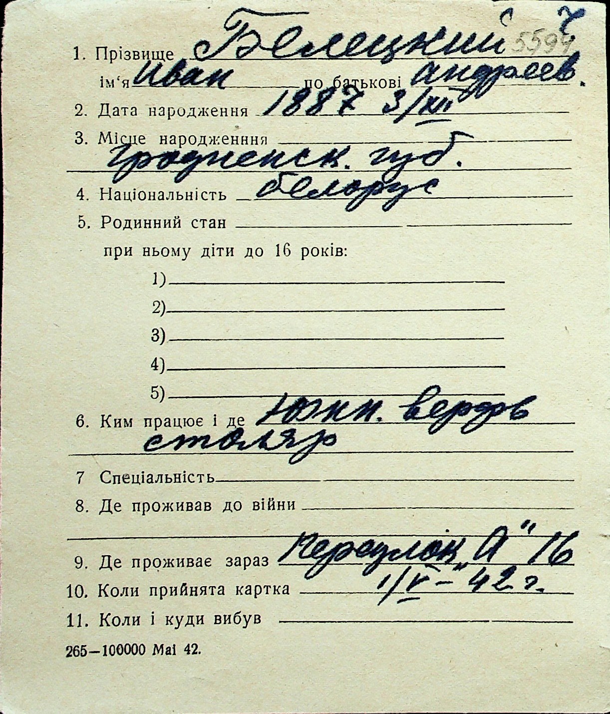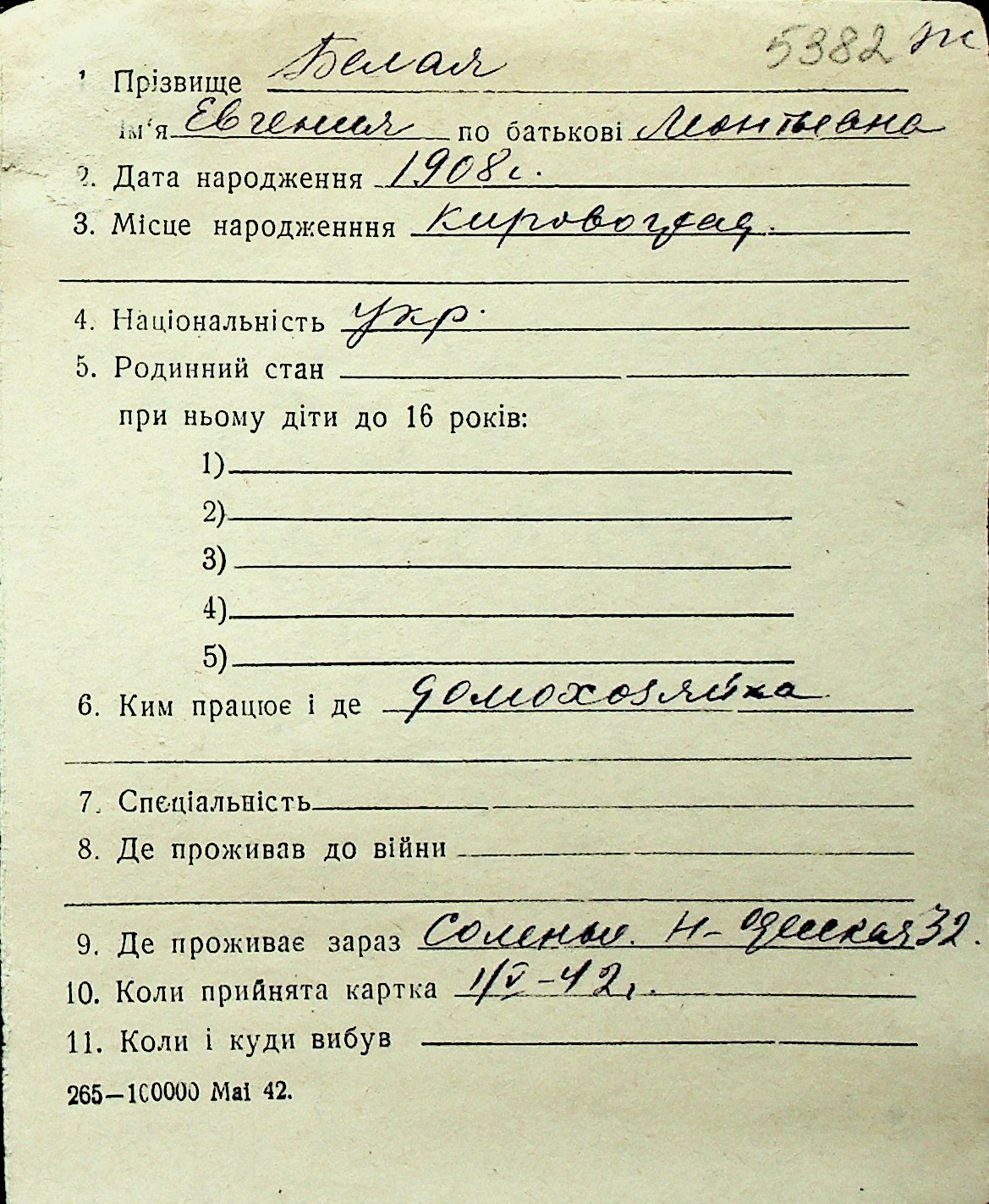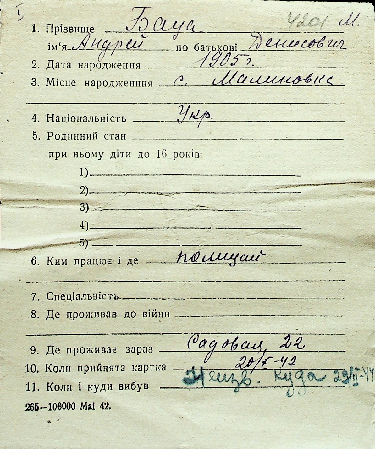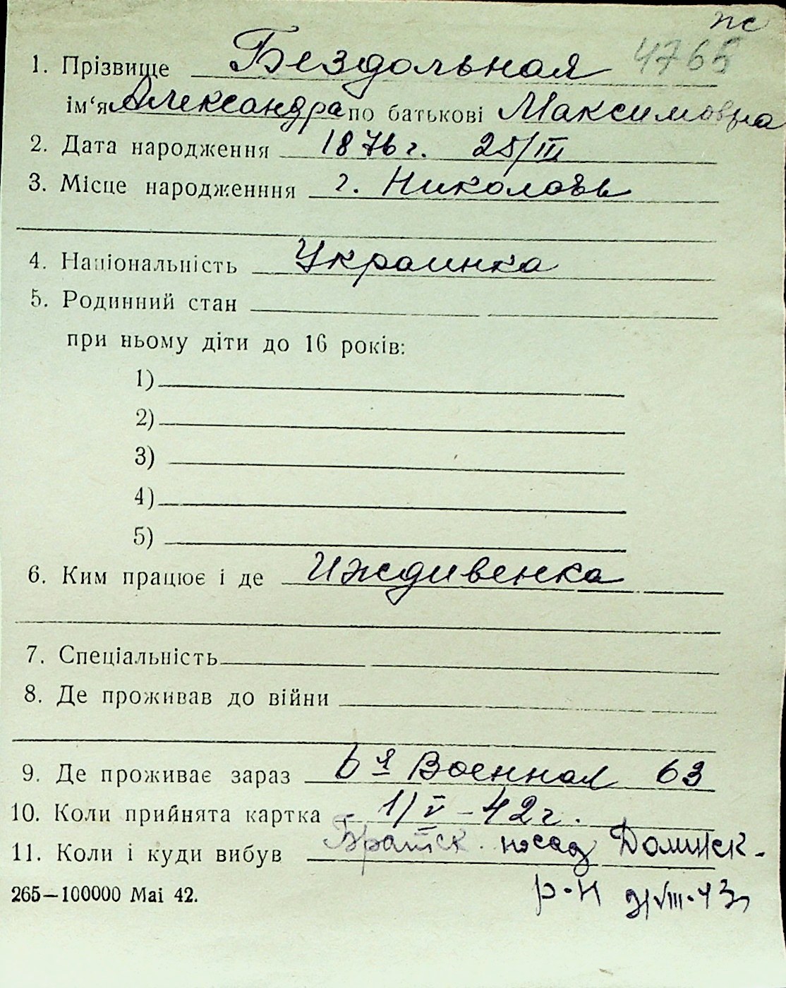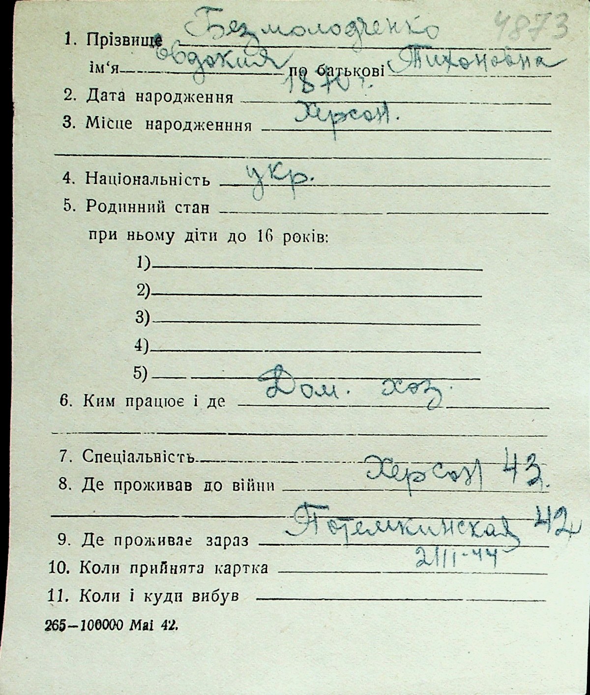 ◦ ◦ Перелік карток на осіб, які мешкали у м. Миколаїв у період окупації 1941–1944 років