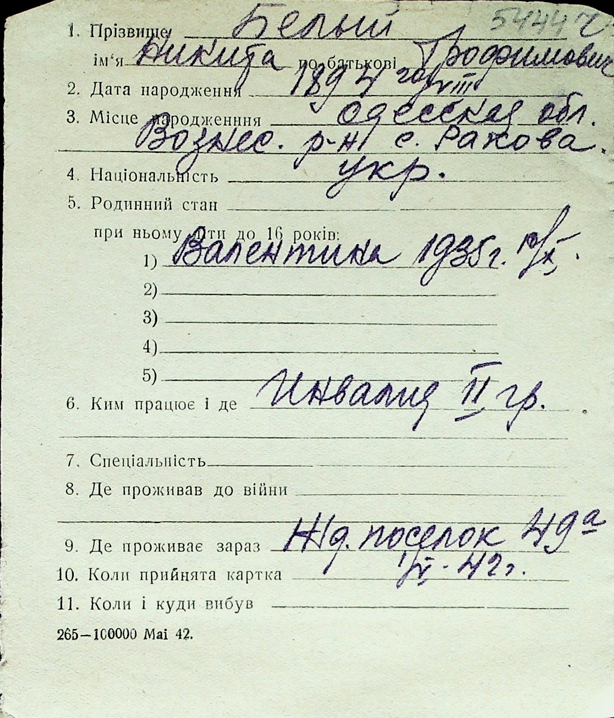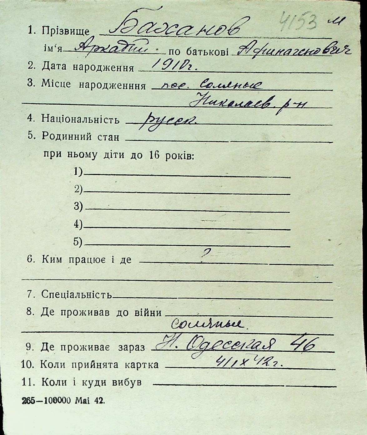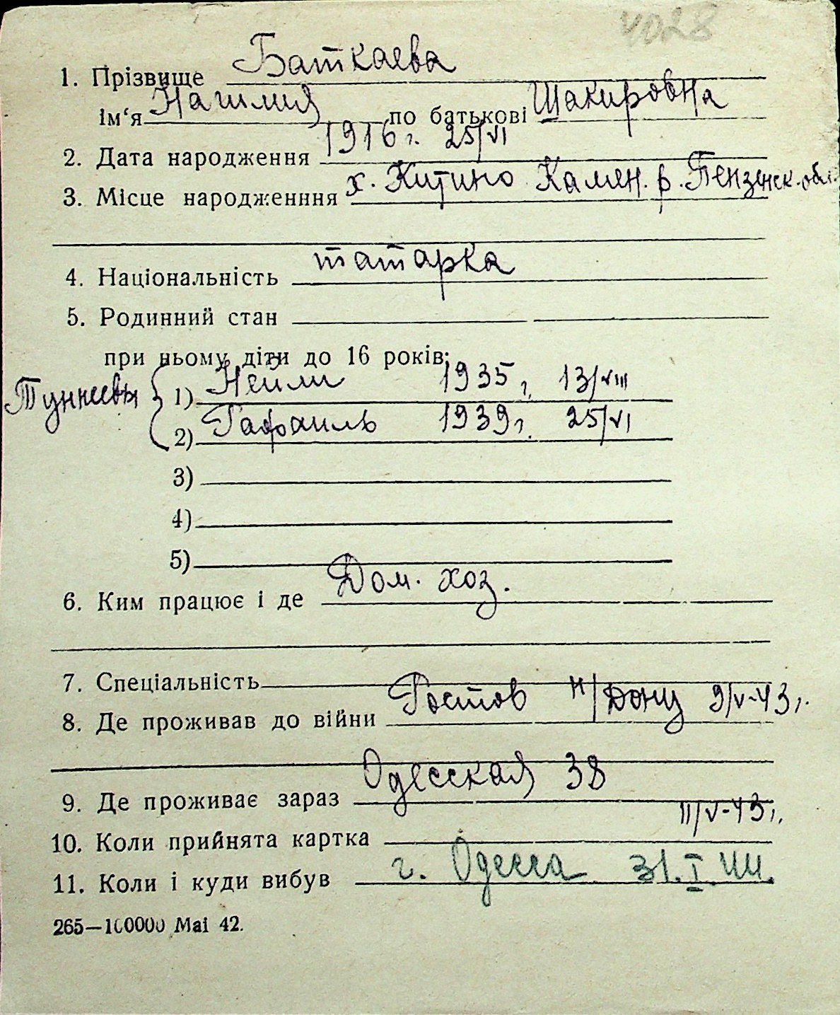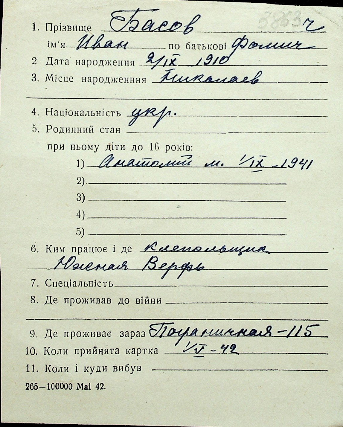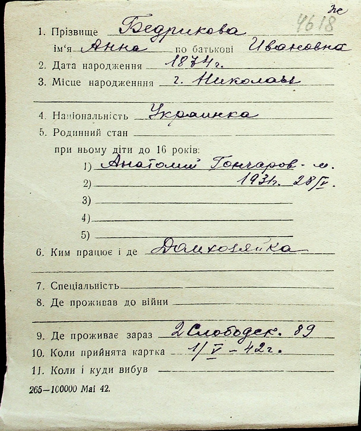 ◦ ◦ Перелік карток на осіб, які мешкали у м. Миколаїв у період окупації 1941–1944 років