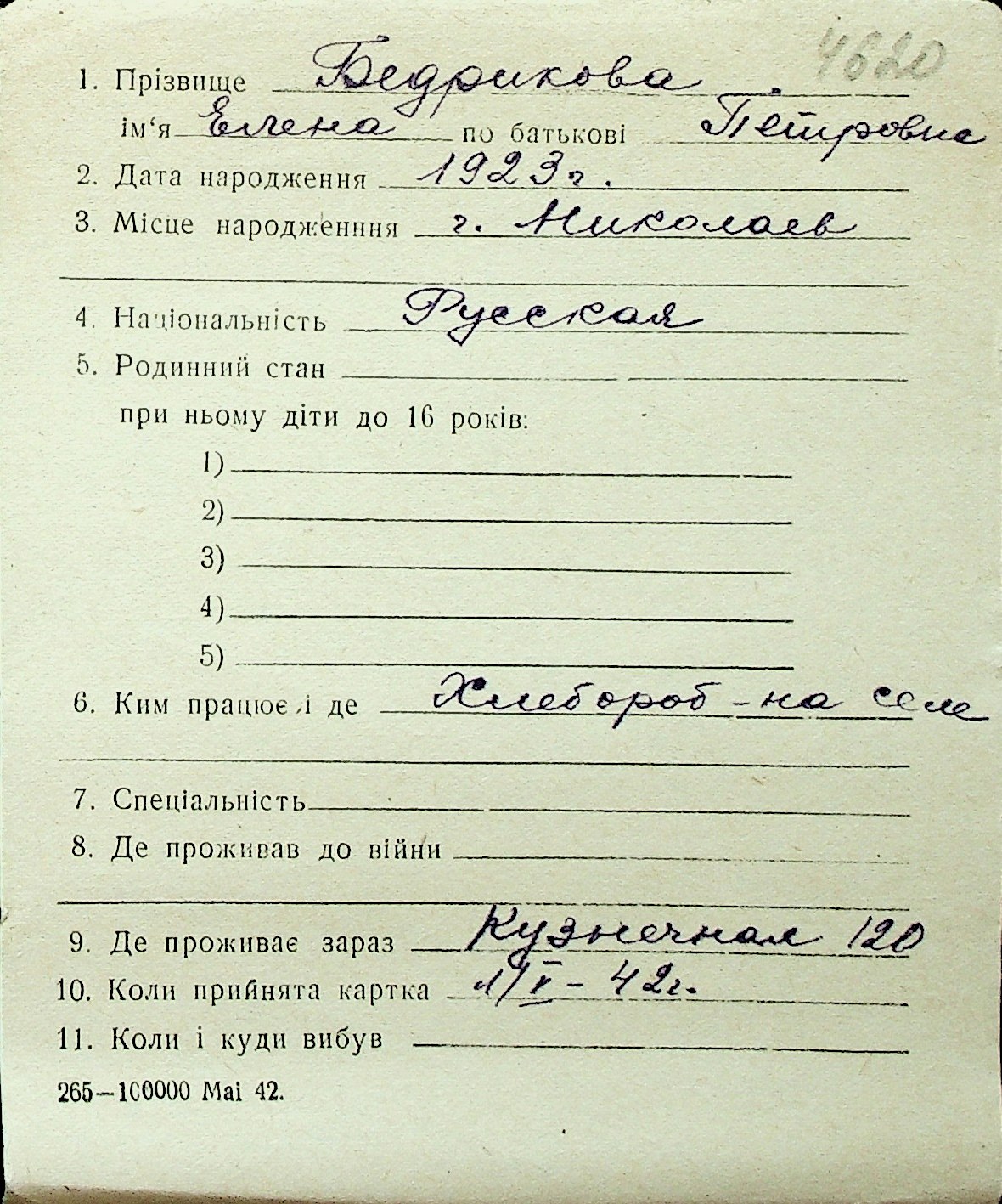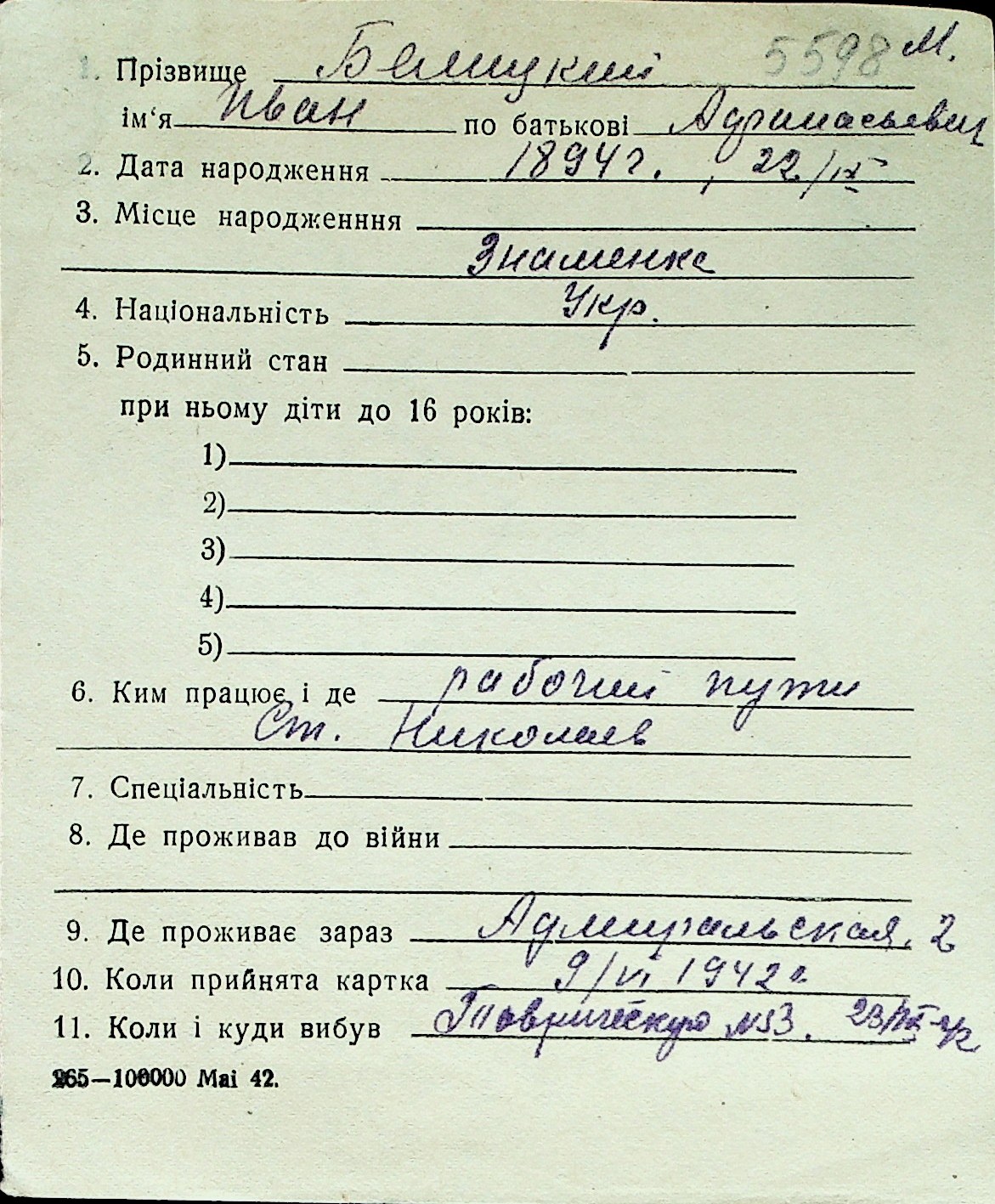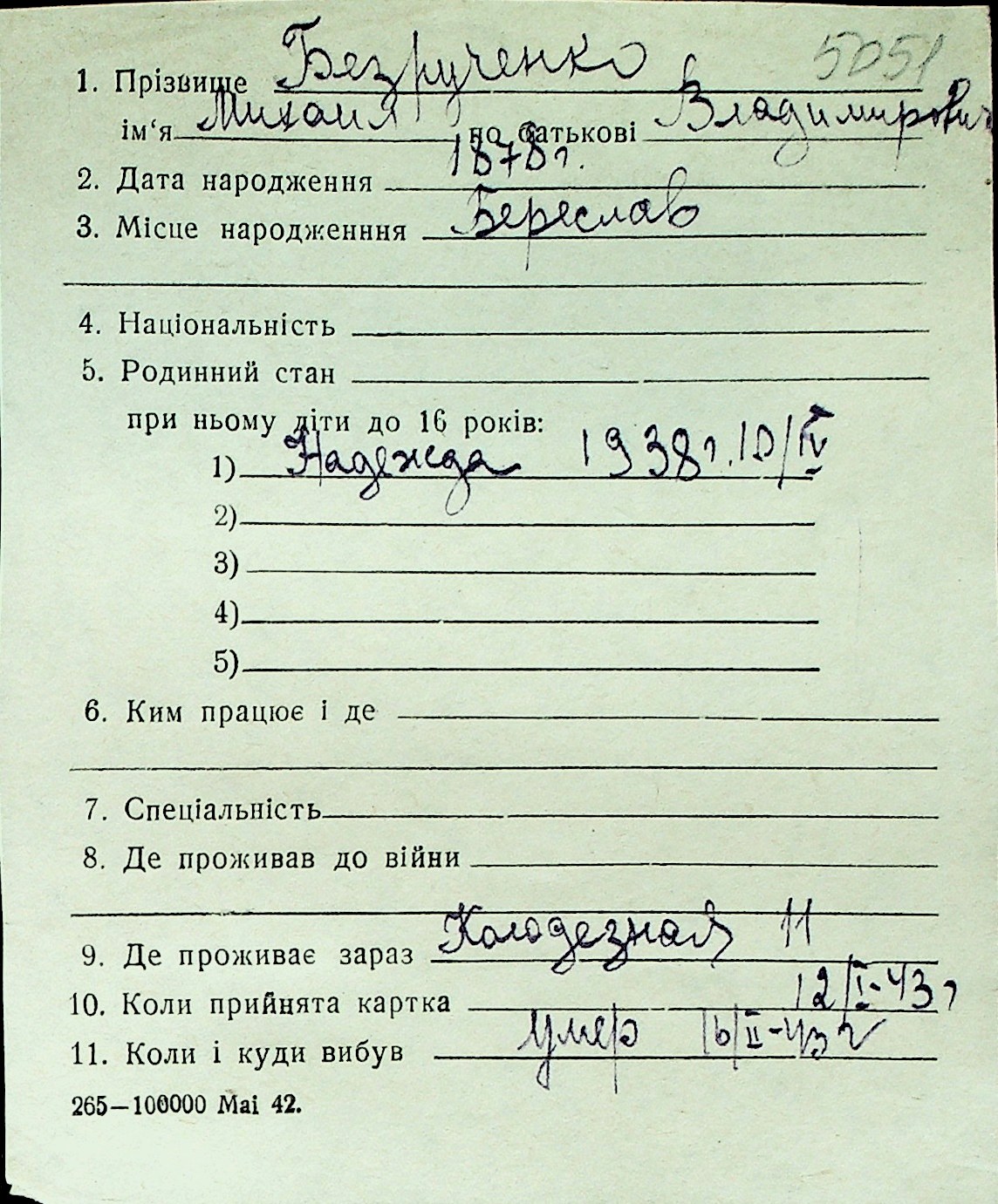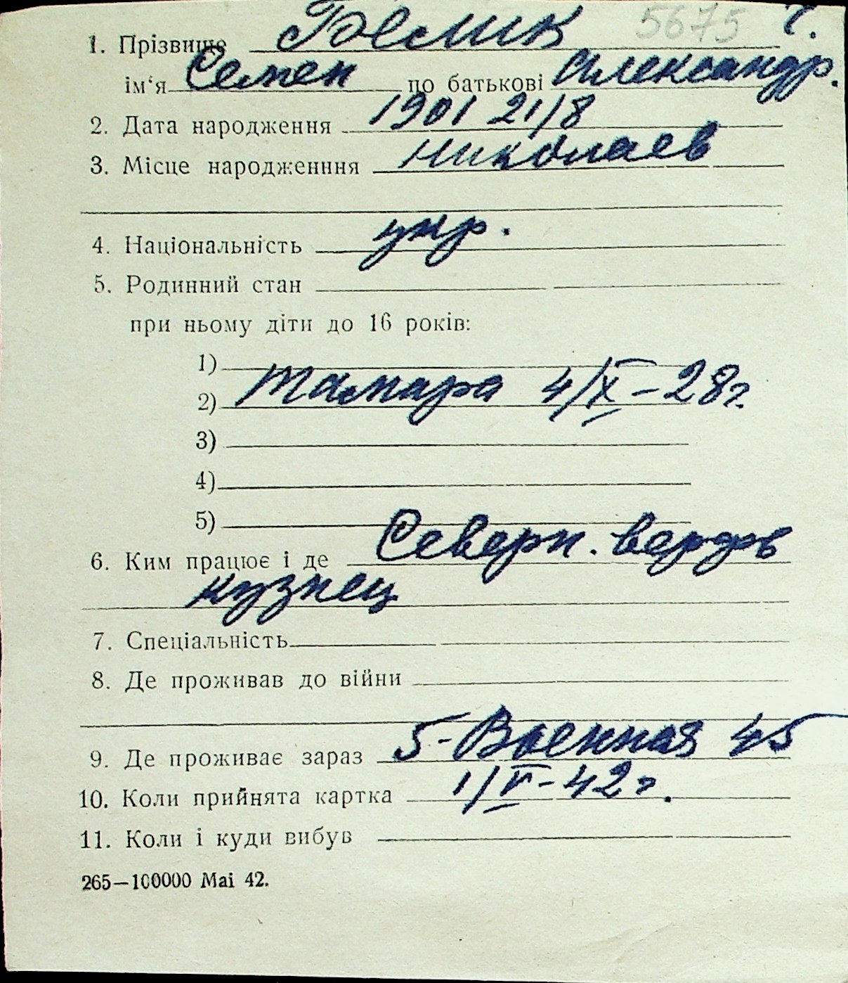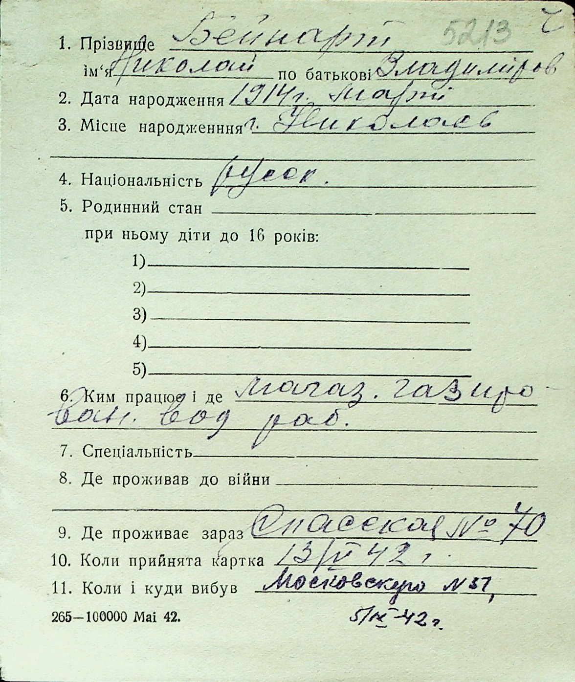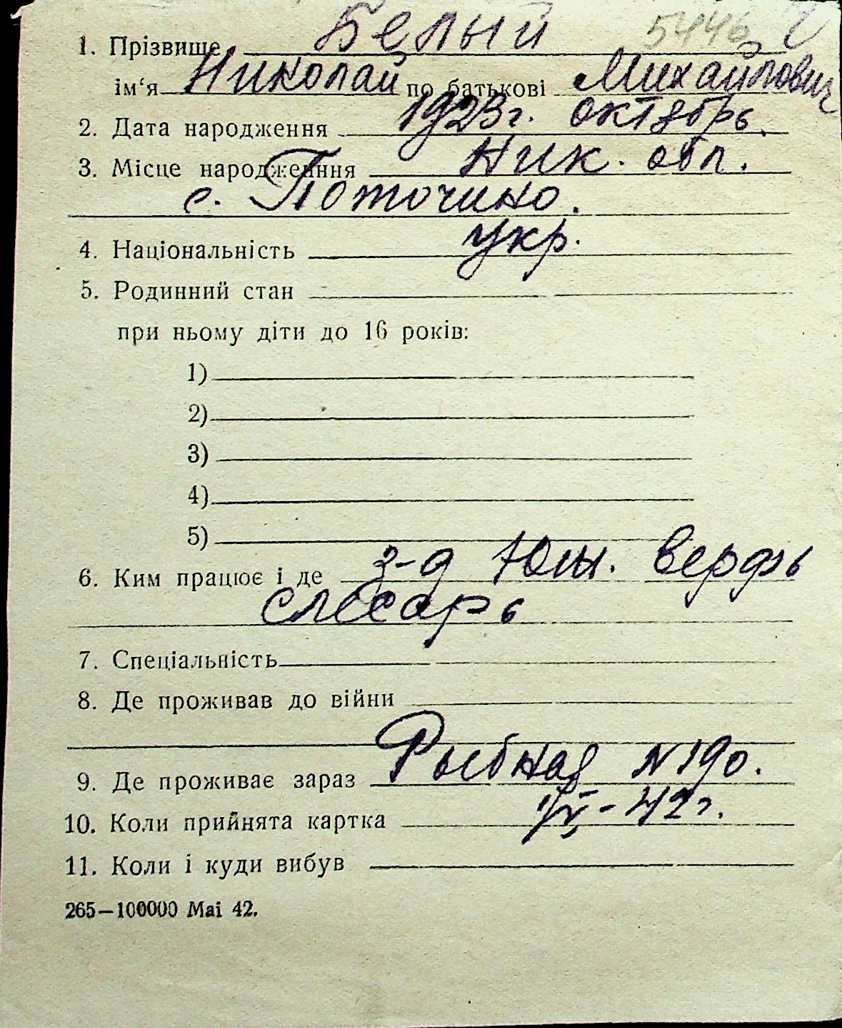 ◦ ◦ Перелік карток на осіб, які мешкали у м. Миколаїв у період окупації 1941–1944 років