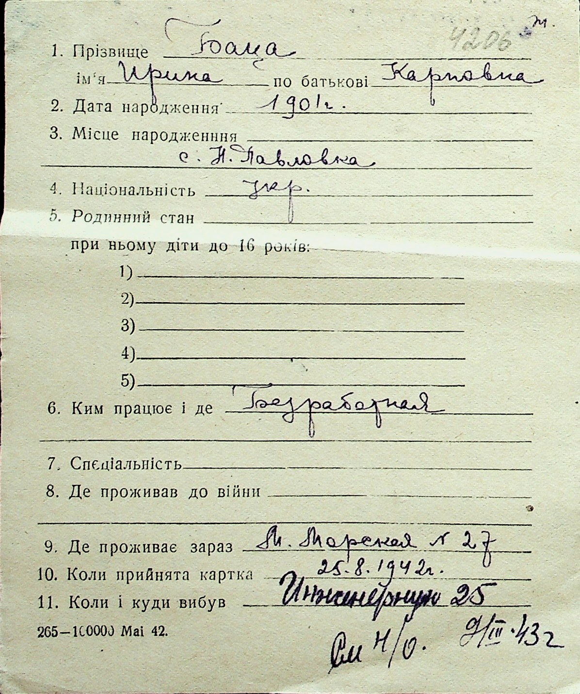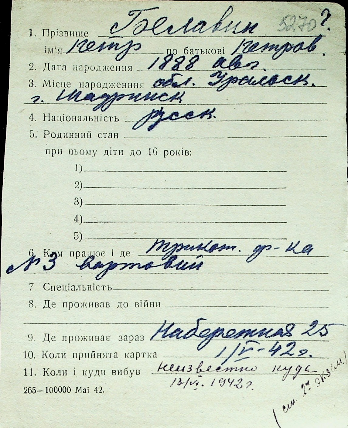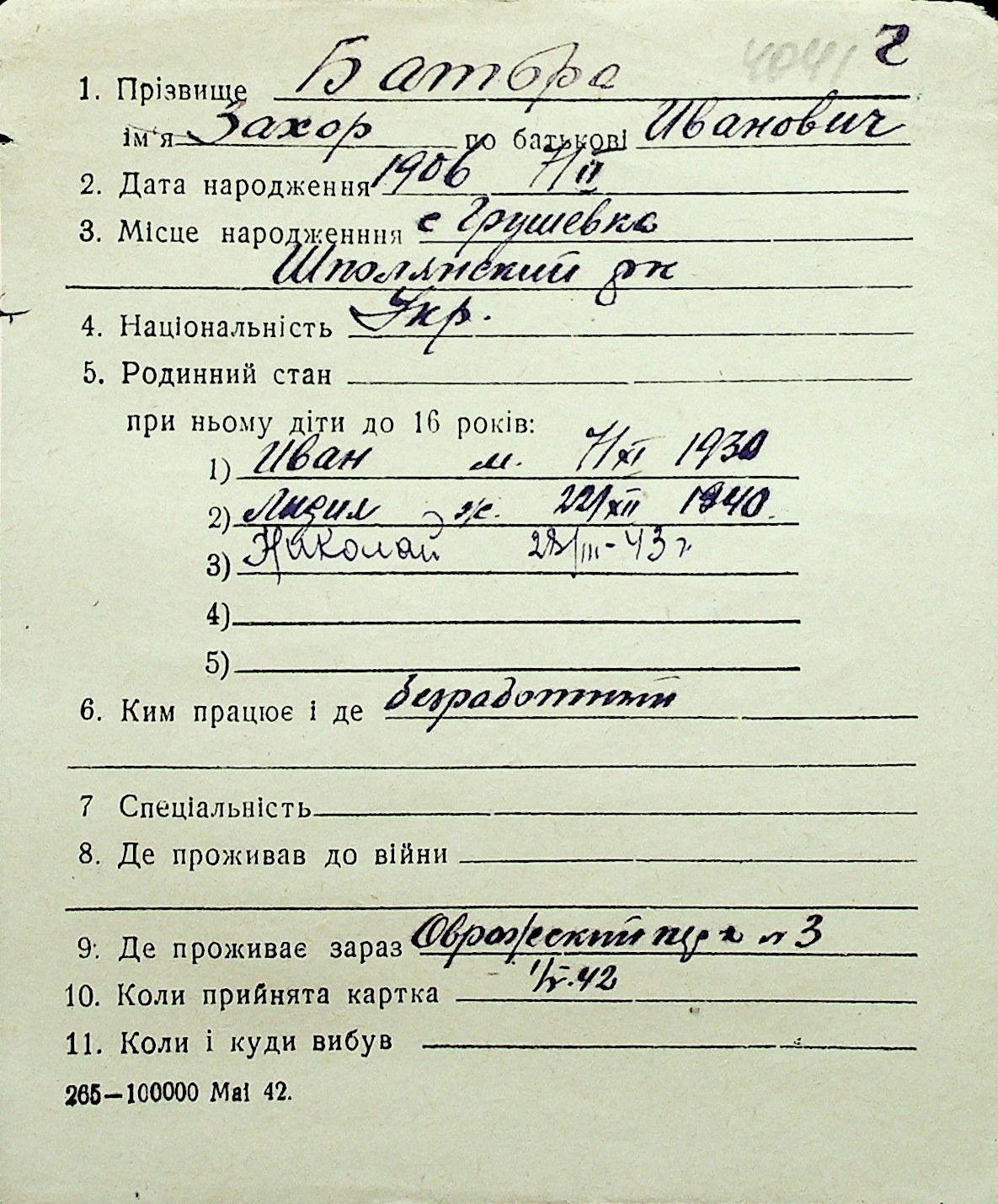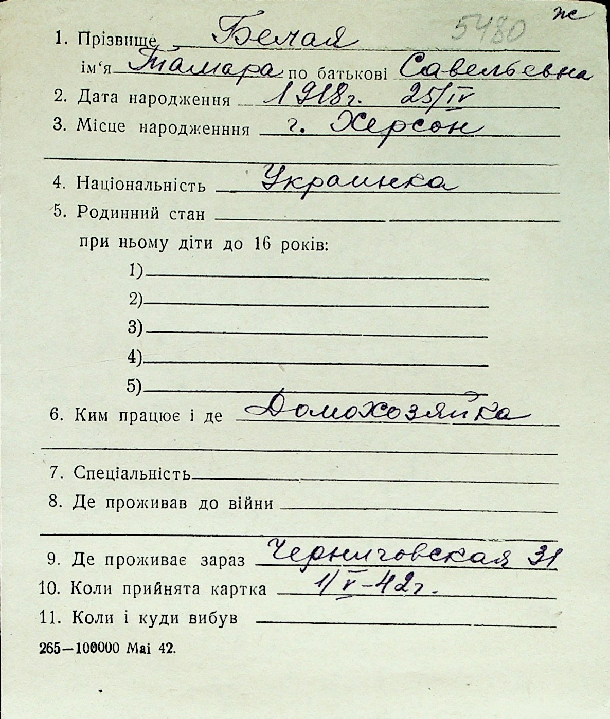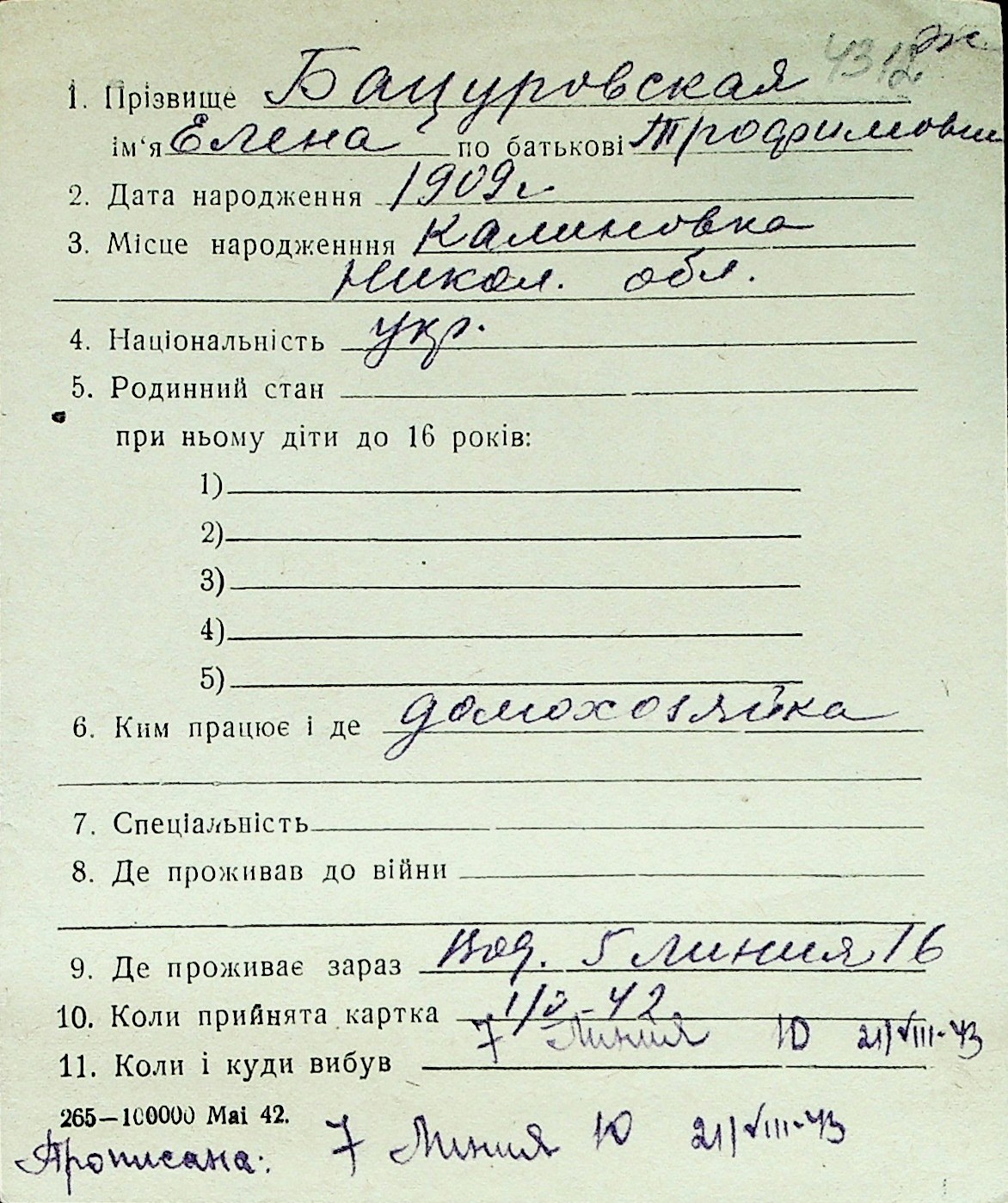 ◦ ◦ Перелік карток на осіб, які мешкали у м. Миколаїв у період окупації 1941–1944 років