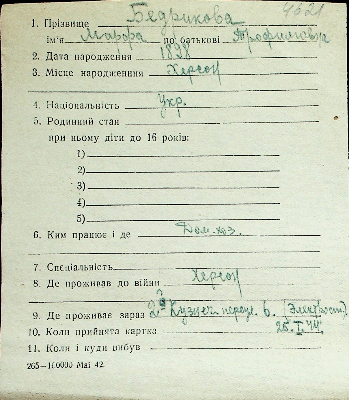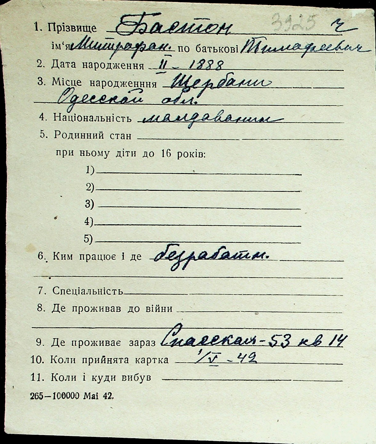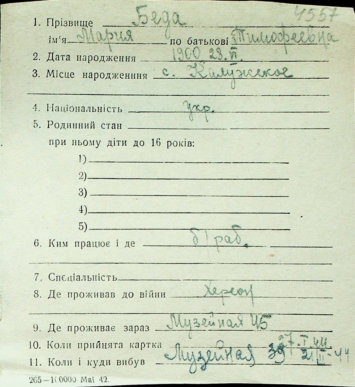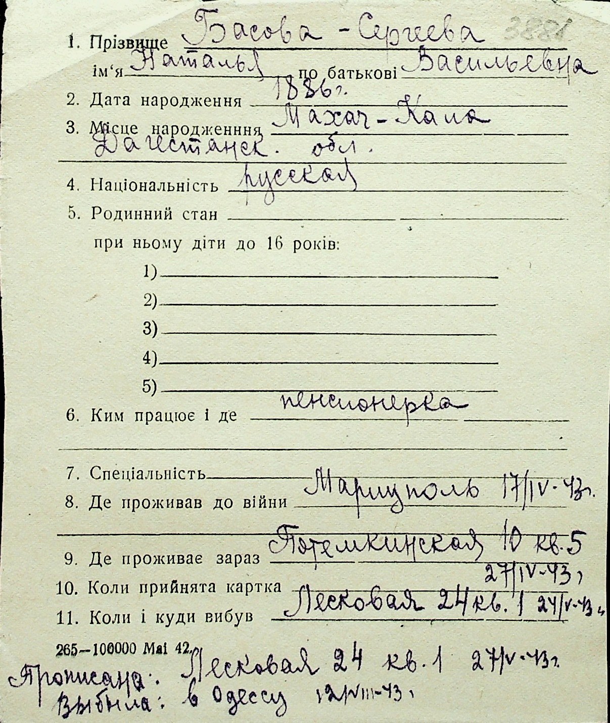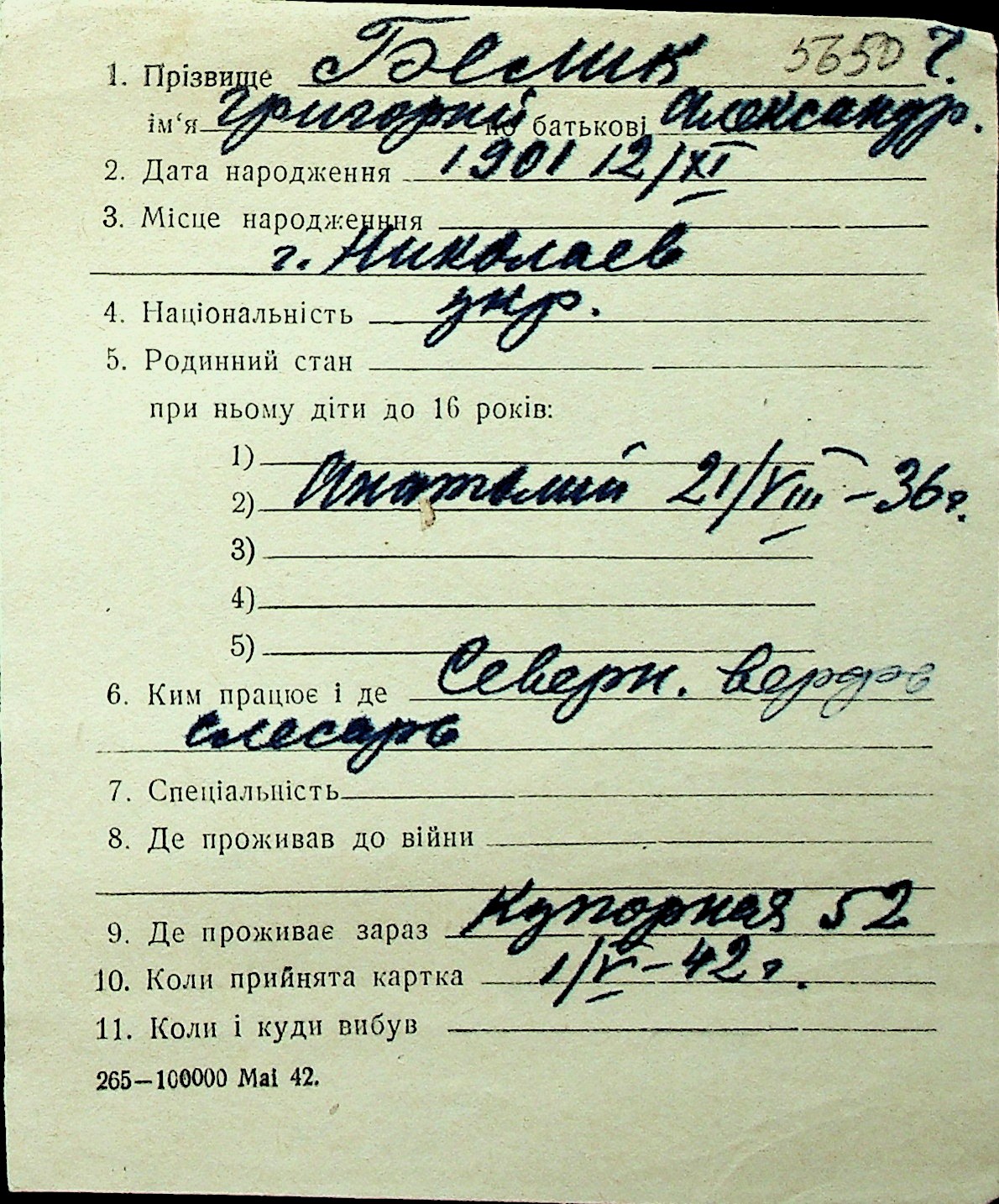 ◦ ◦ Перелік карток на осіб, які мешкали у м. Миколаїв у період окупації 1941–1944 років