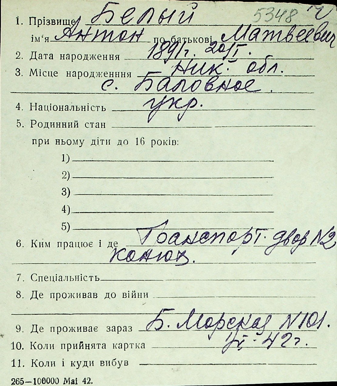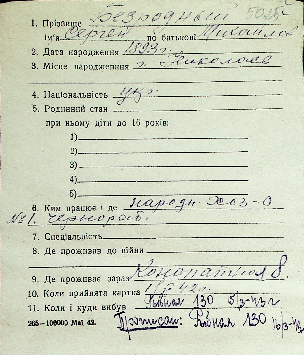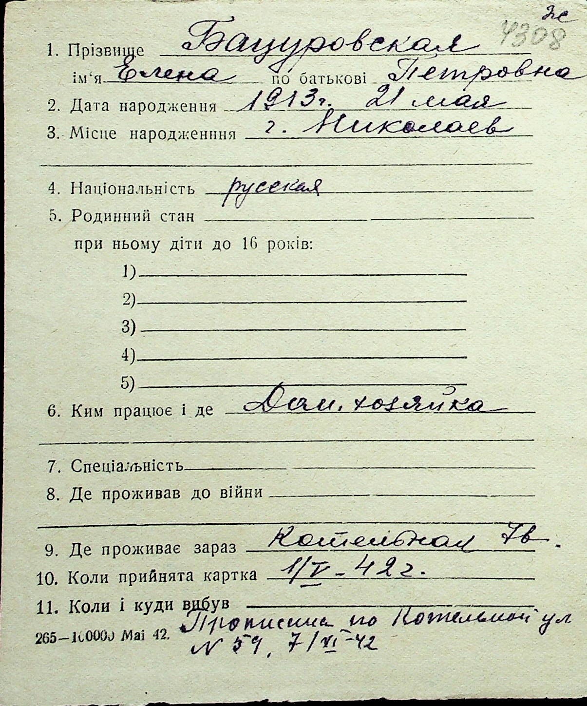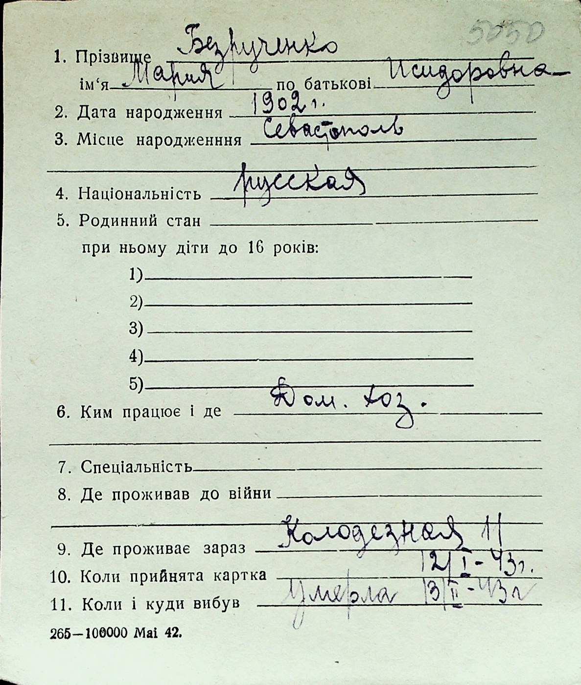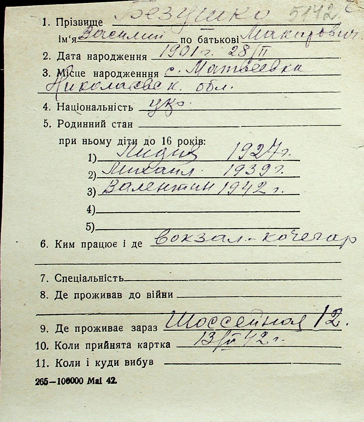 ◦ ◦ Перелік карток на осіб, які мешкали у м. Миколаїв у період окупації 1941–1944 років