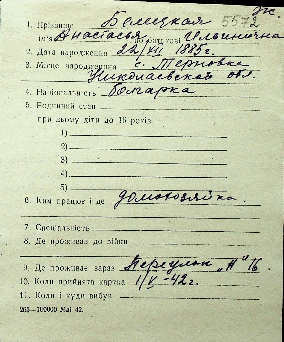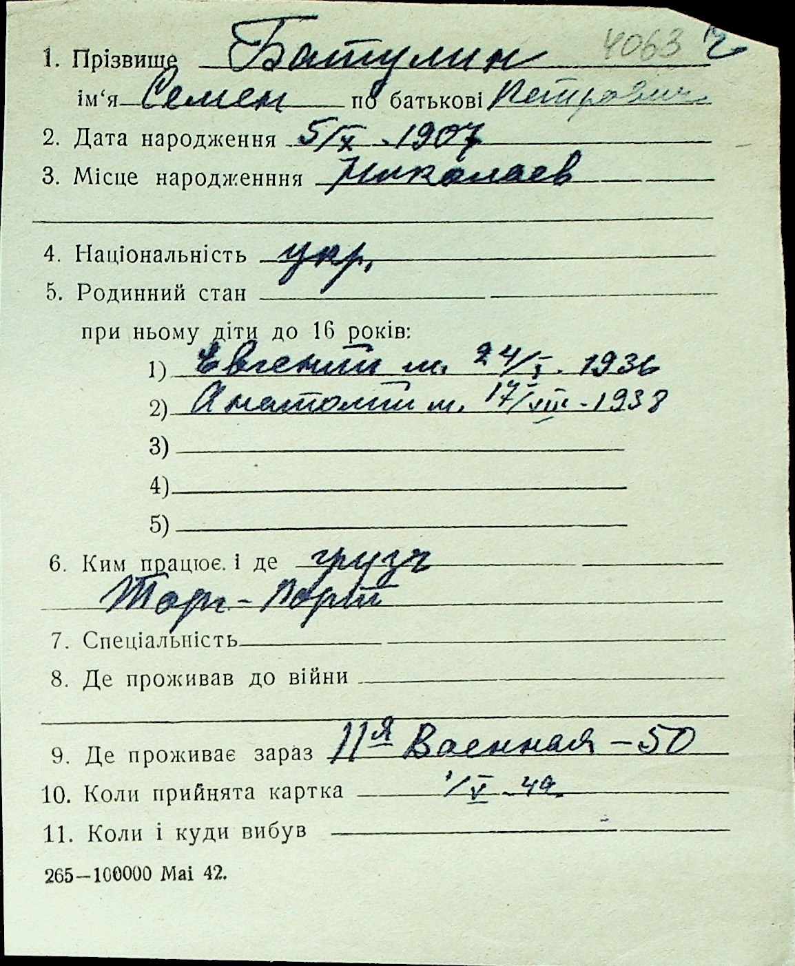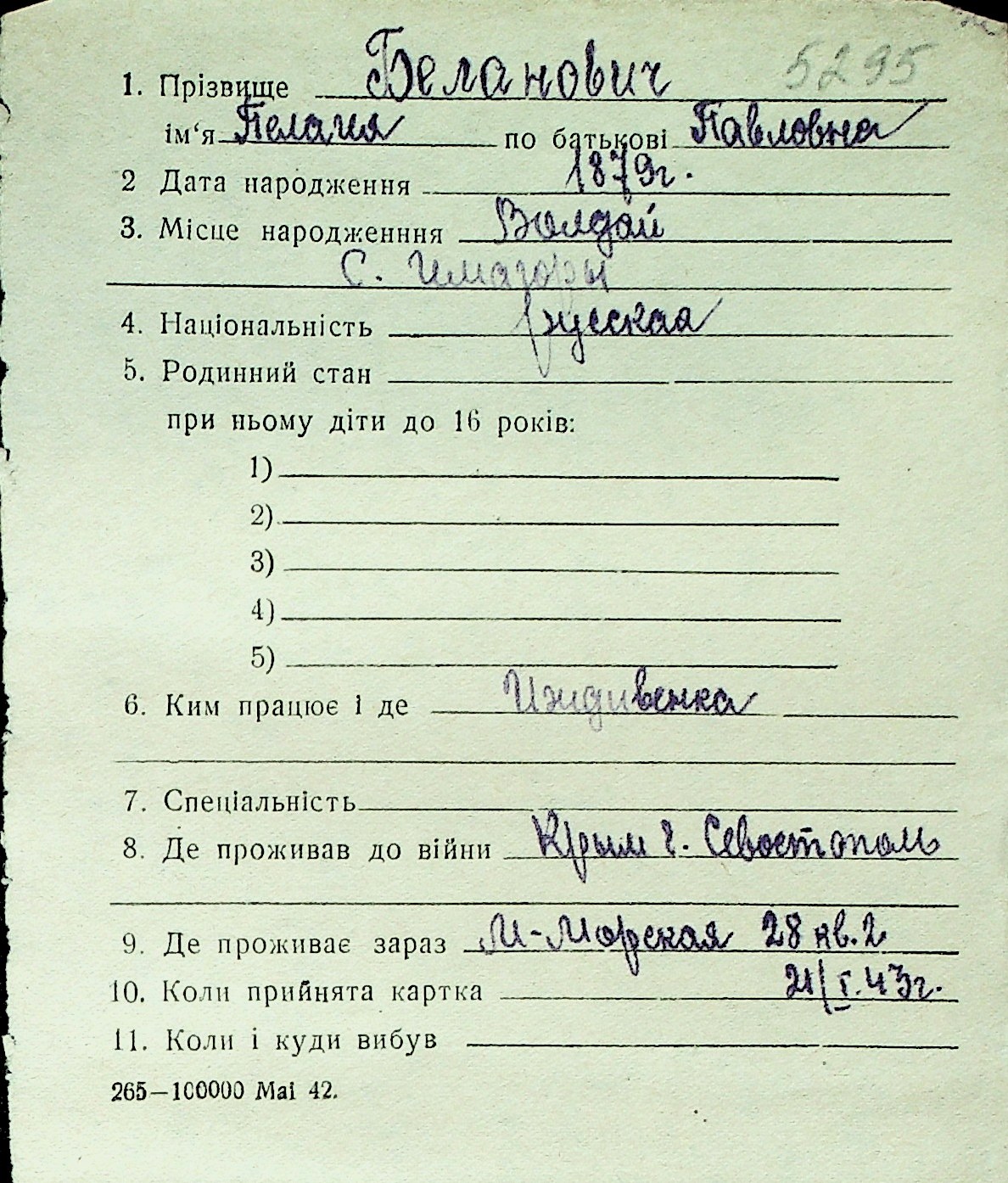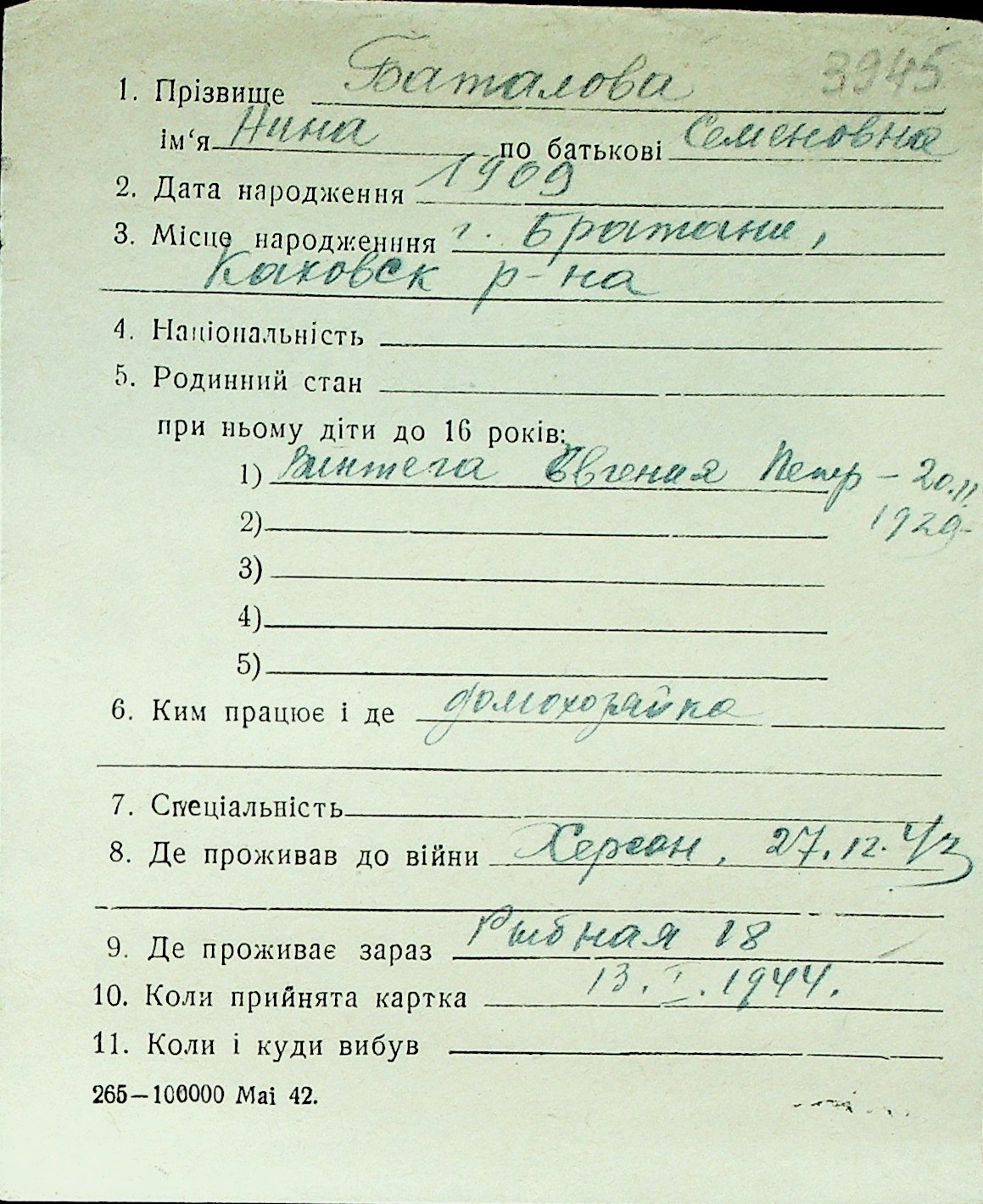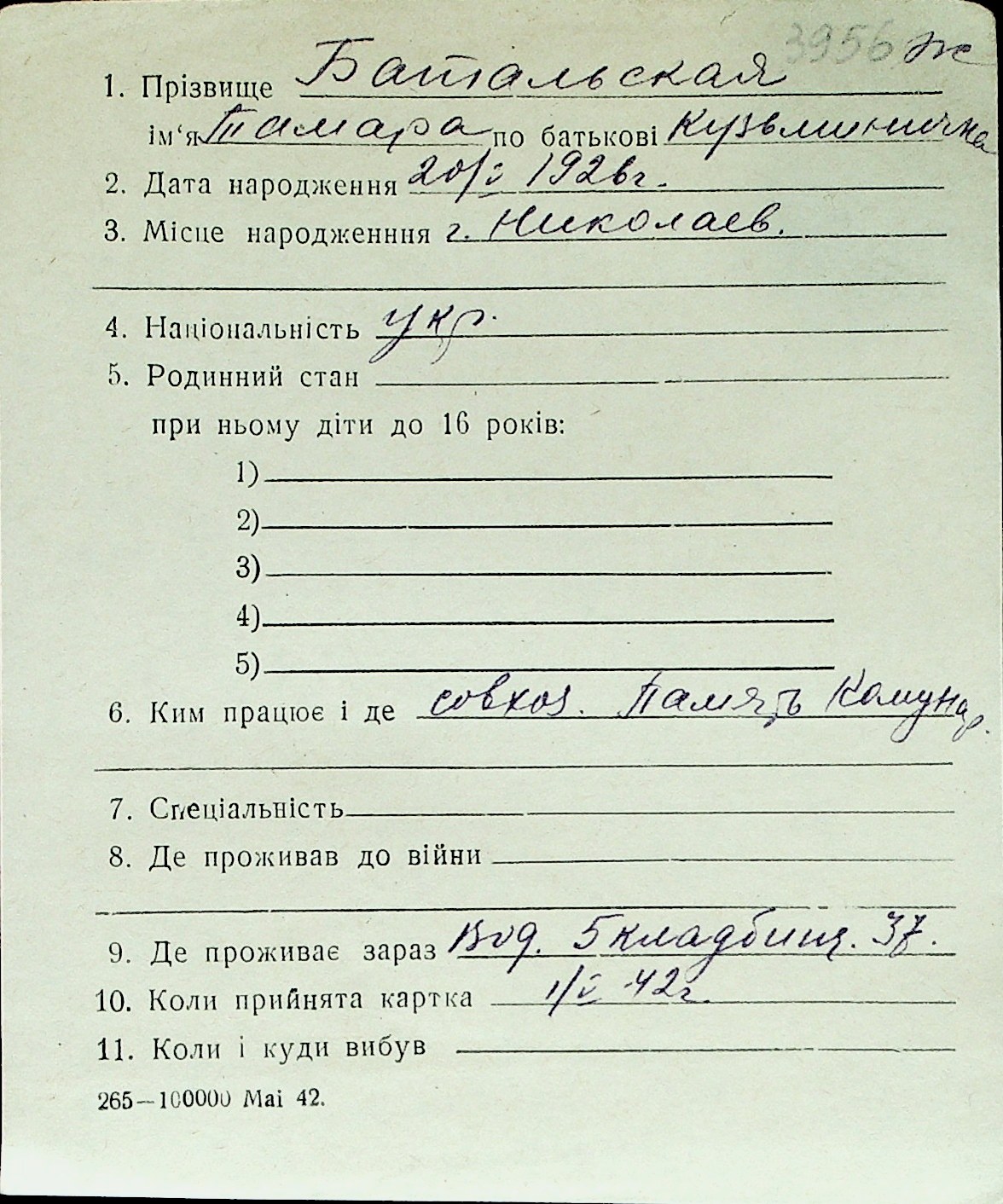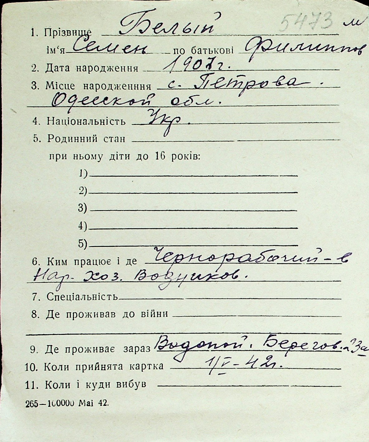 ◦ ◦ Перелік карток на осіб, які мешкали у м. Миколаїв у період окупації 1941–1944 років