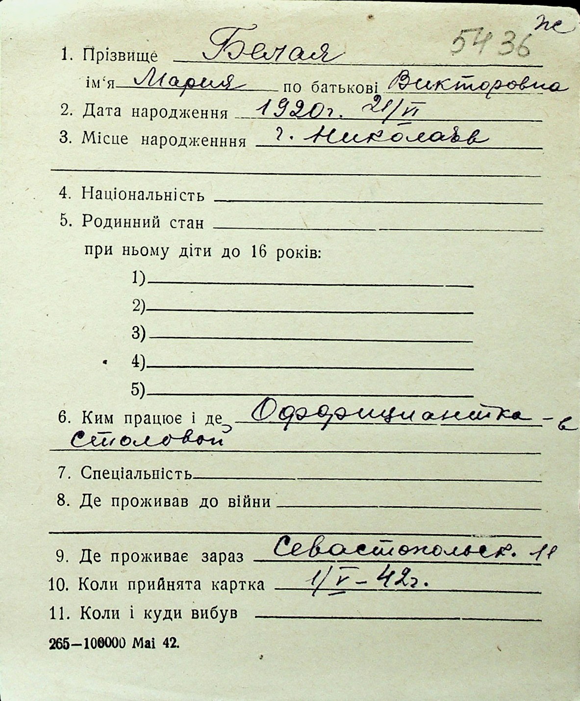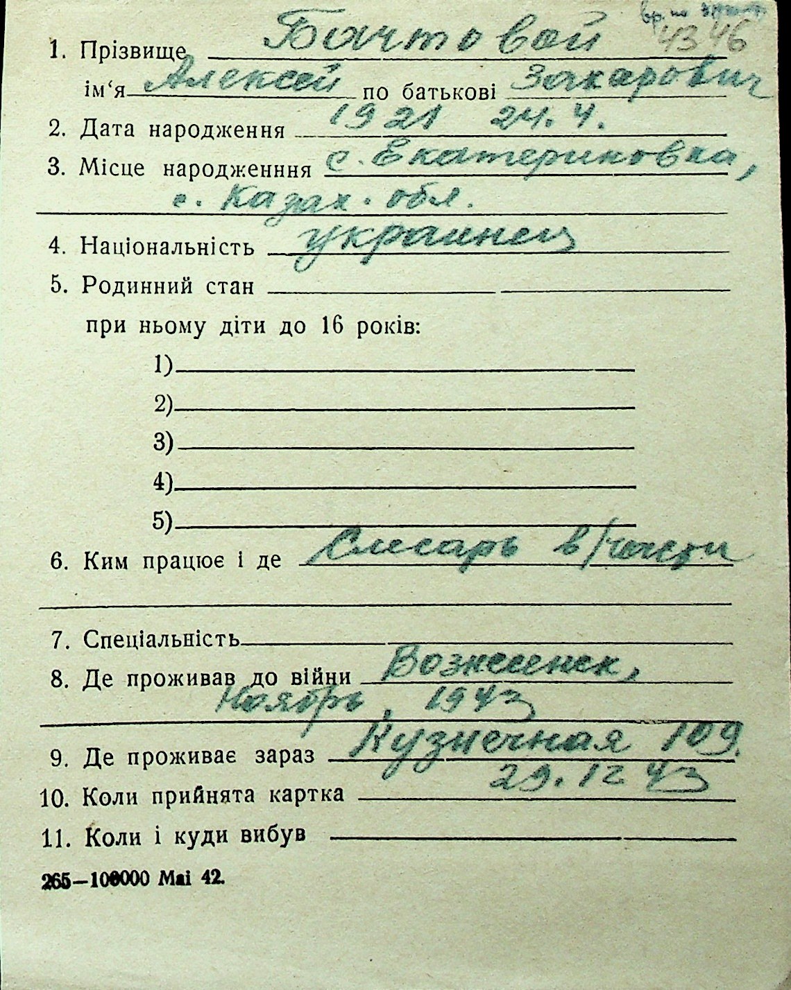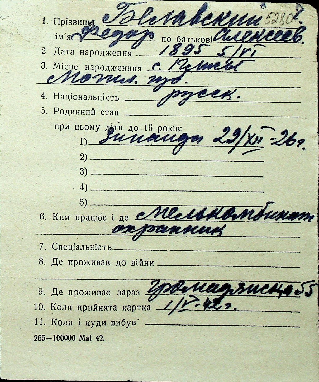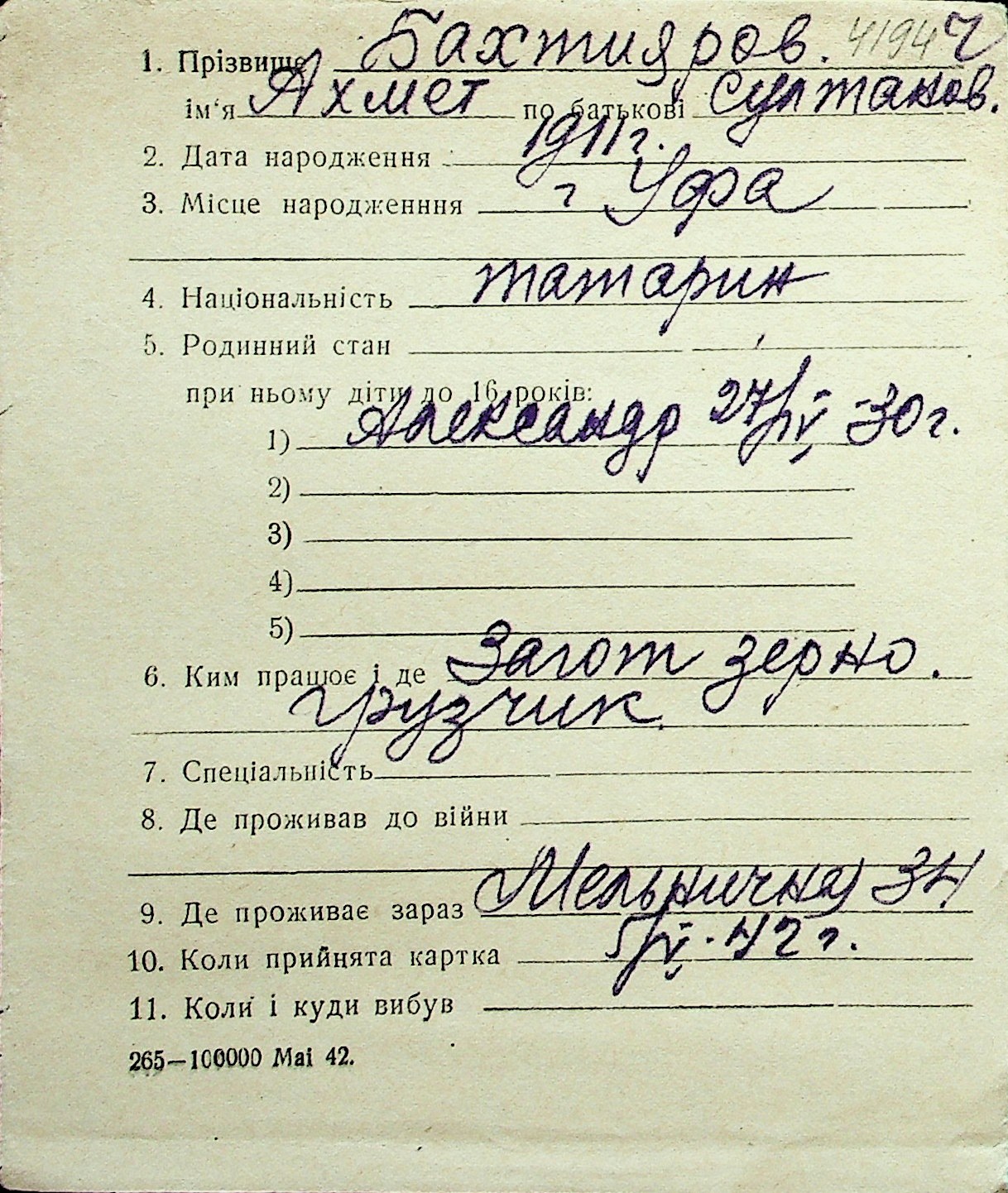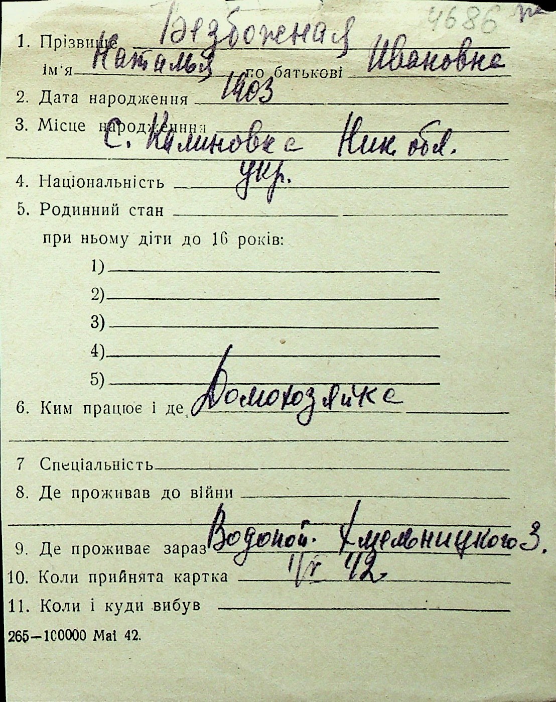 ◦ ◦ Перелік карток на осіб, які мешкали у м. Миколаїв у період окупації 1941–1944 років