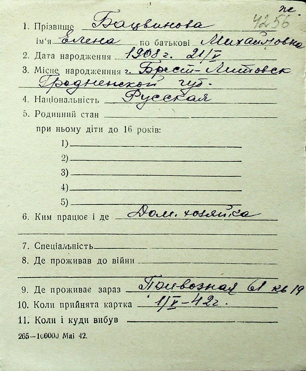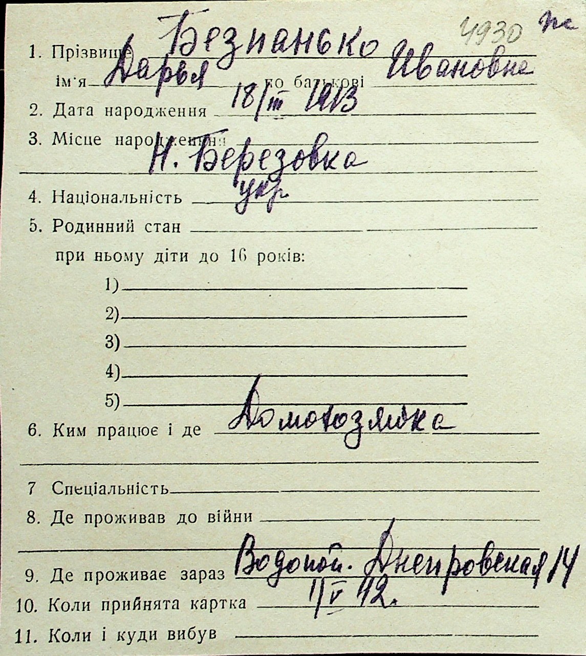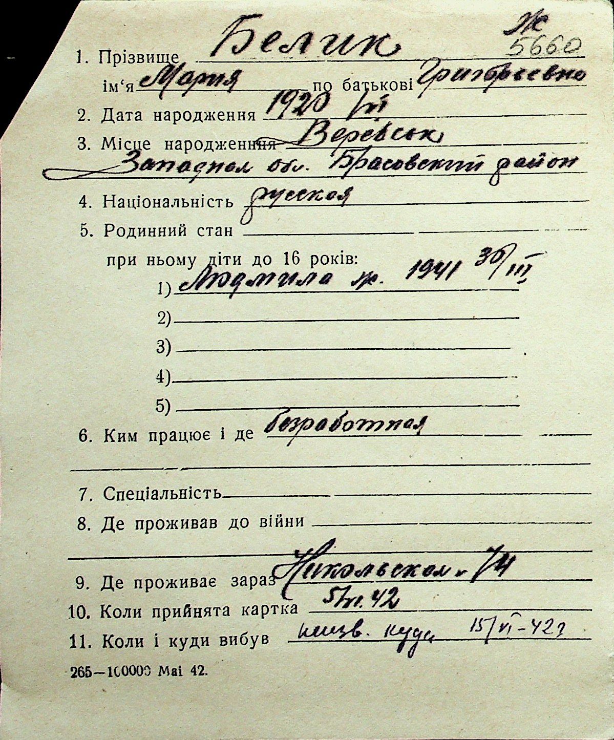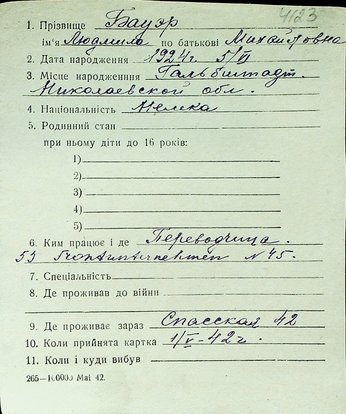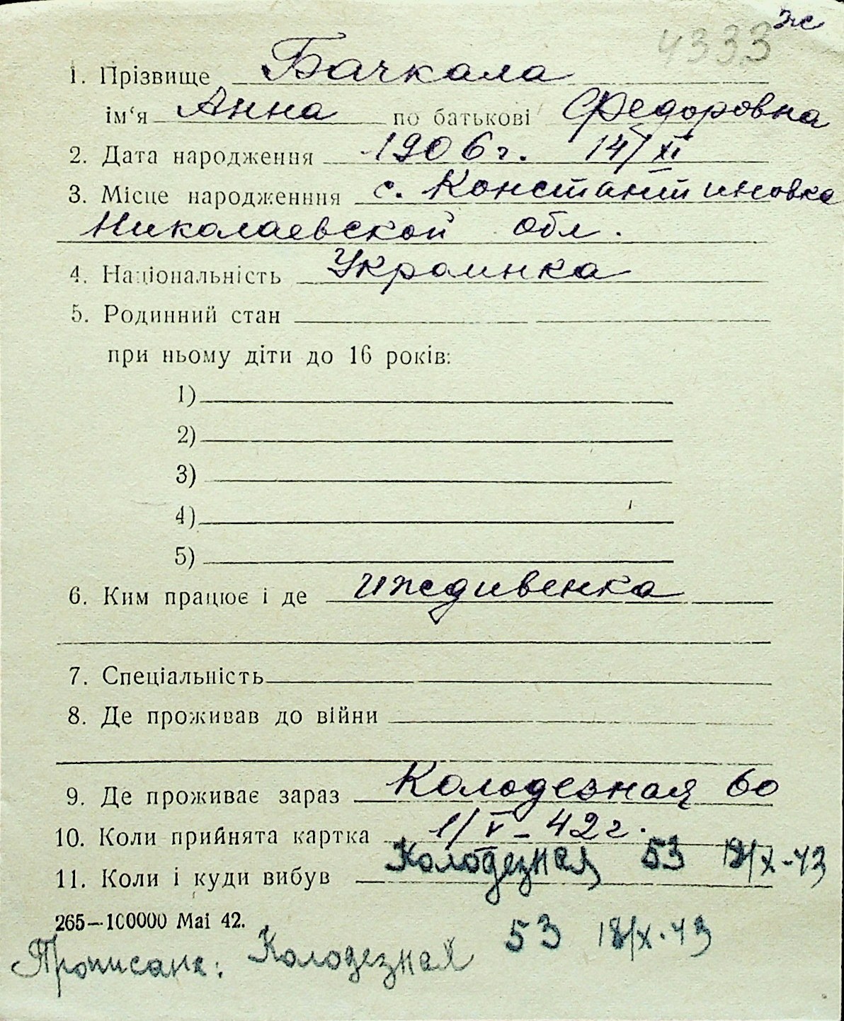 ◦ ◦ Перелік карток на осіб, які мешкали у м. Миколаїв у період окупації 1941–1944 років
