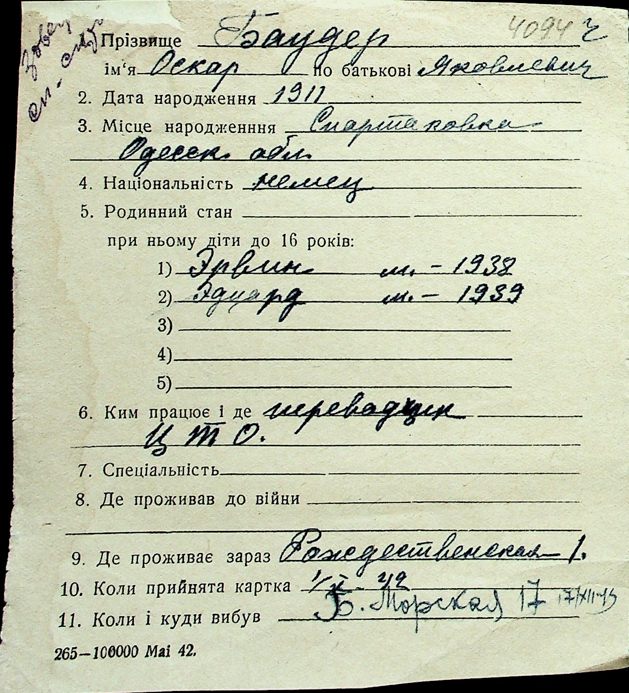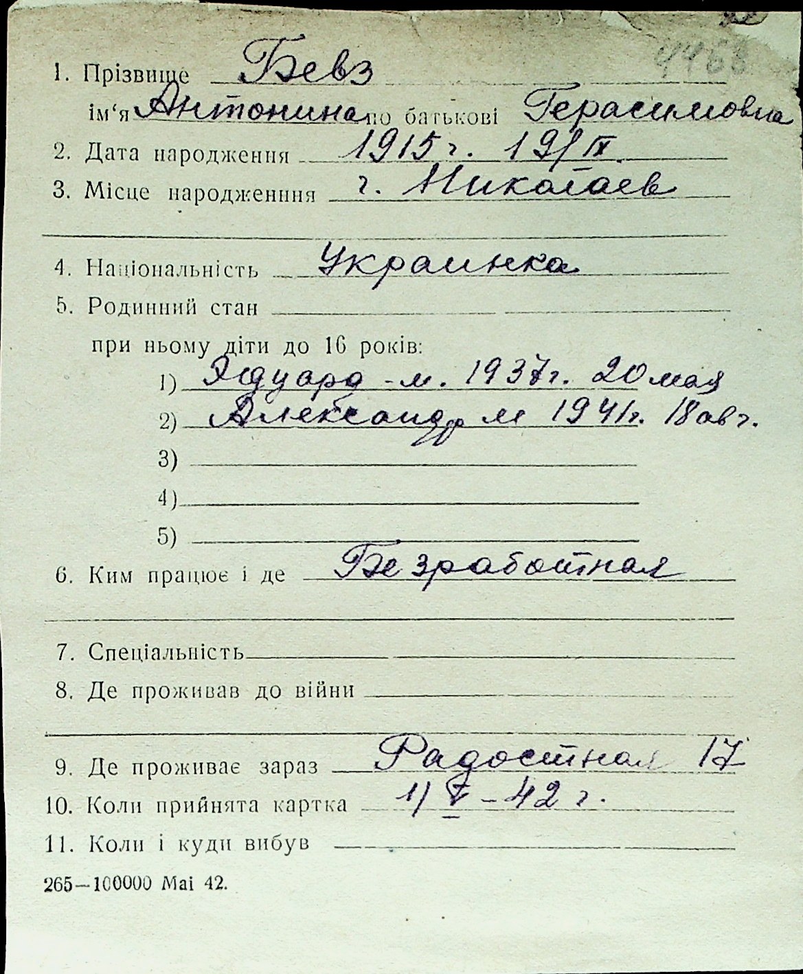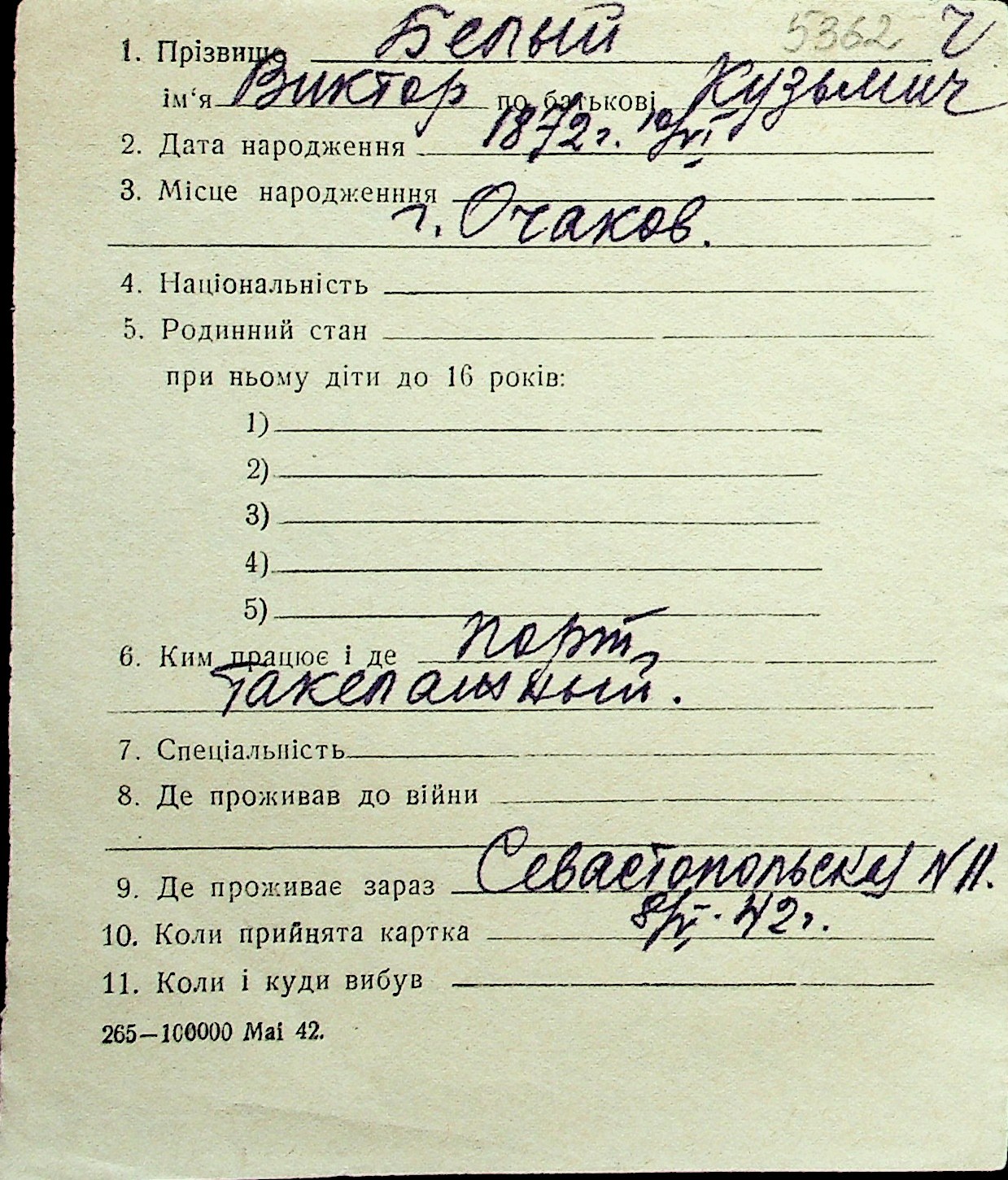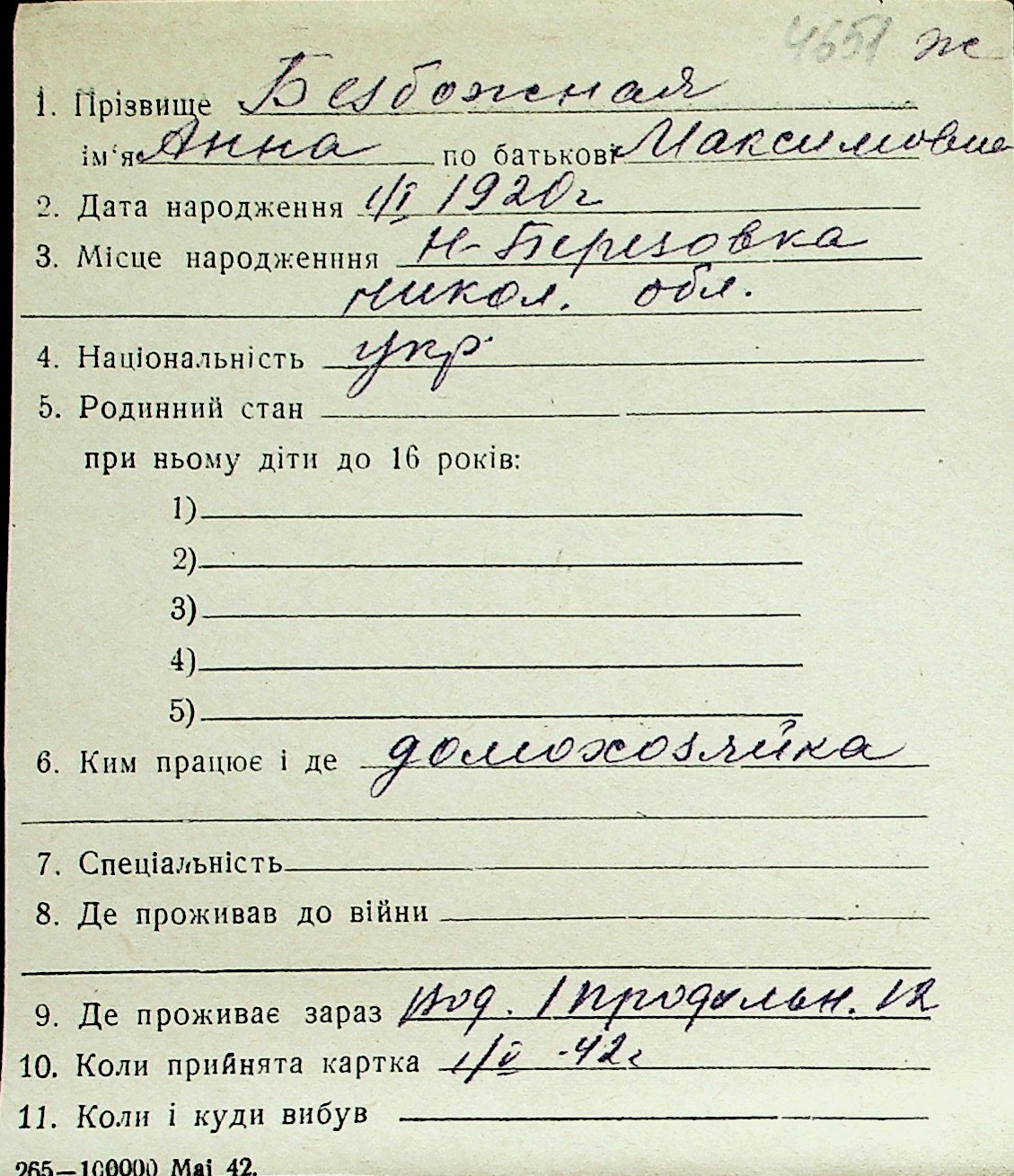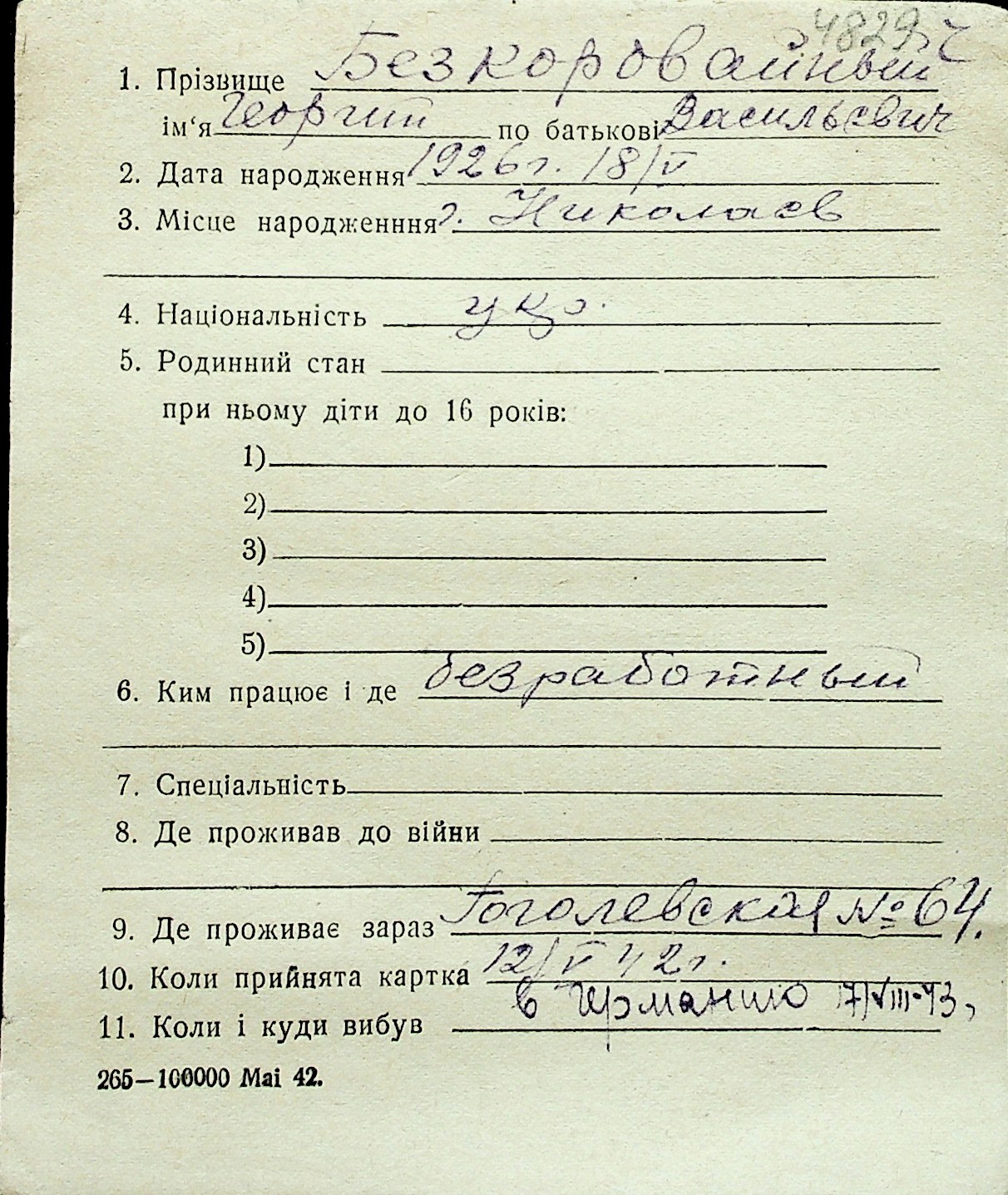 ◦ ◦ Перелік карток на осіб, які мешкали у м. Миколаїв у період окупації 1941–1944 років