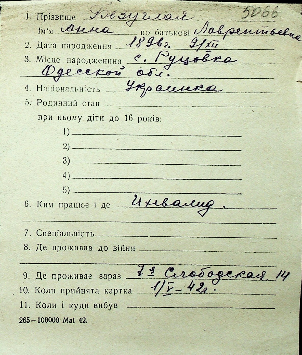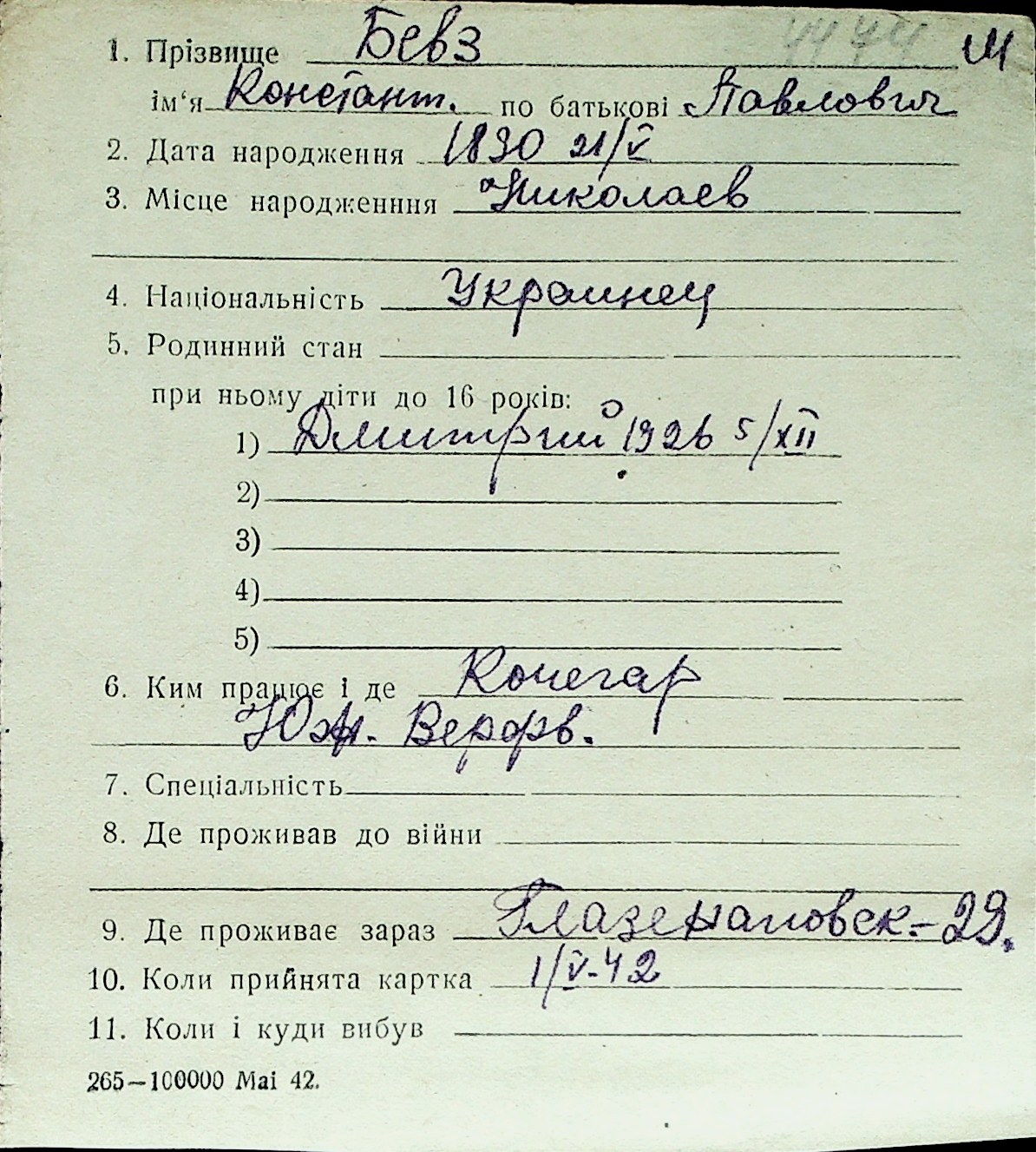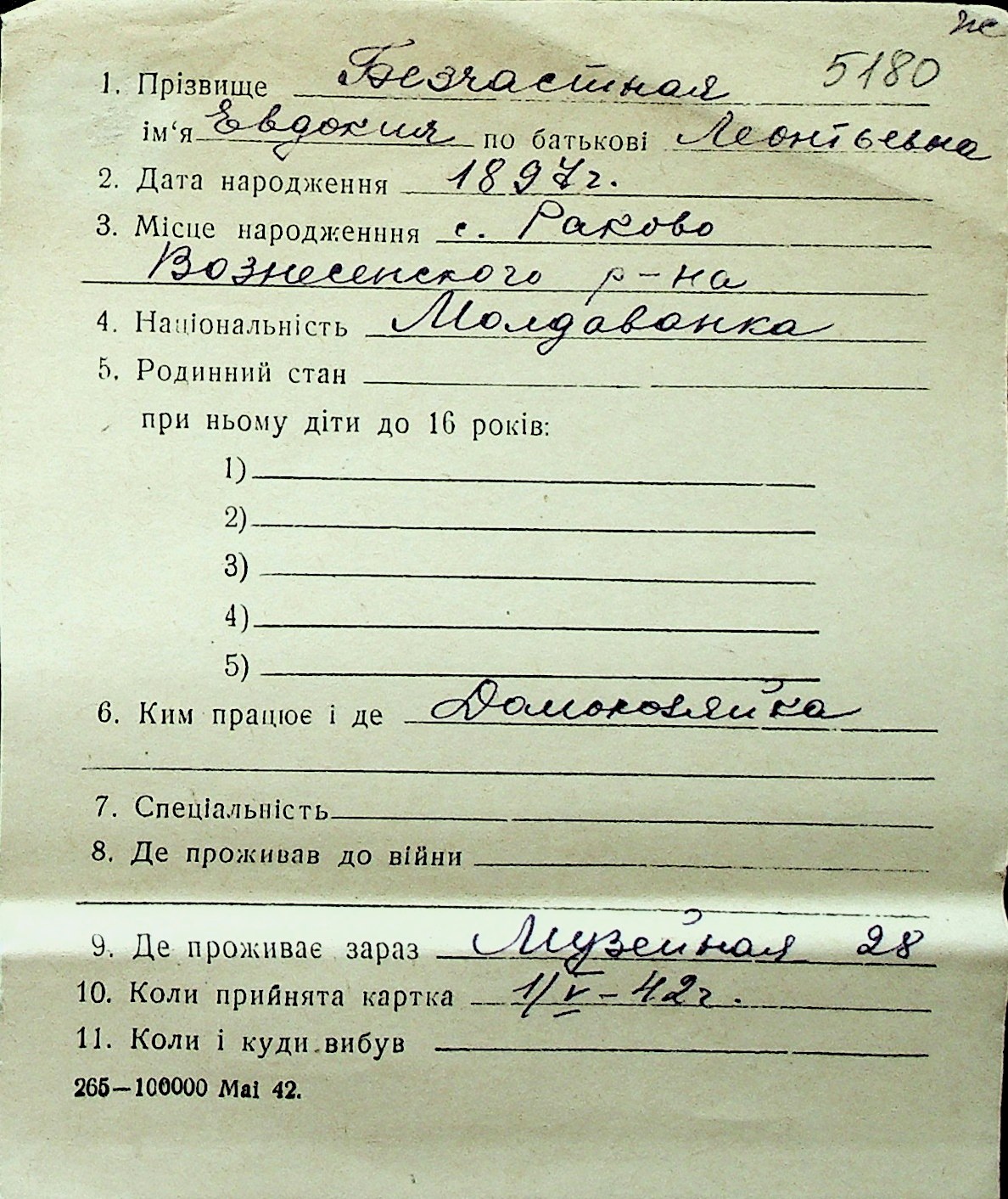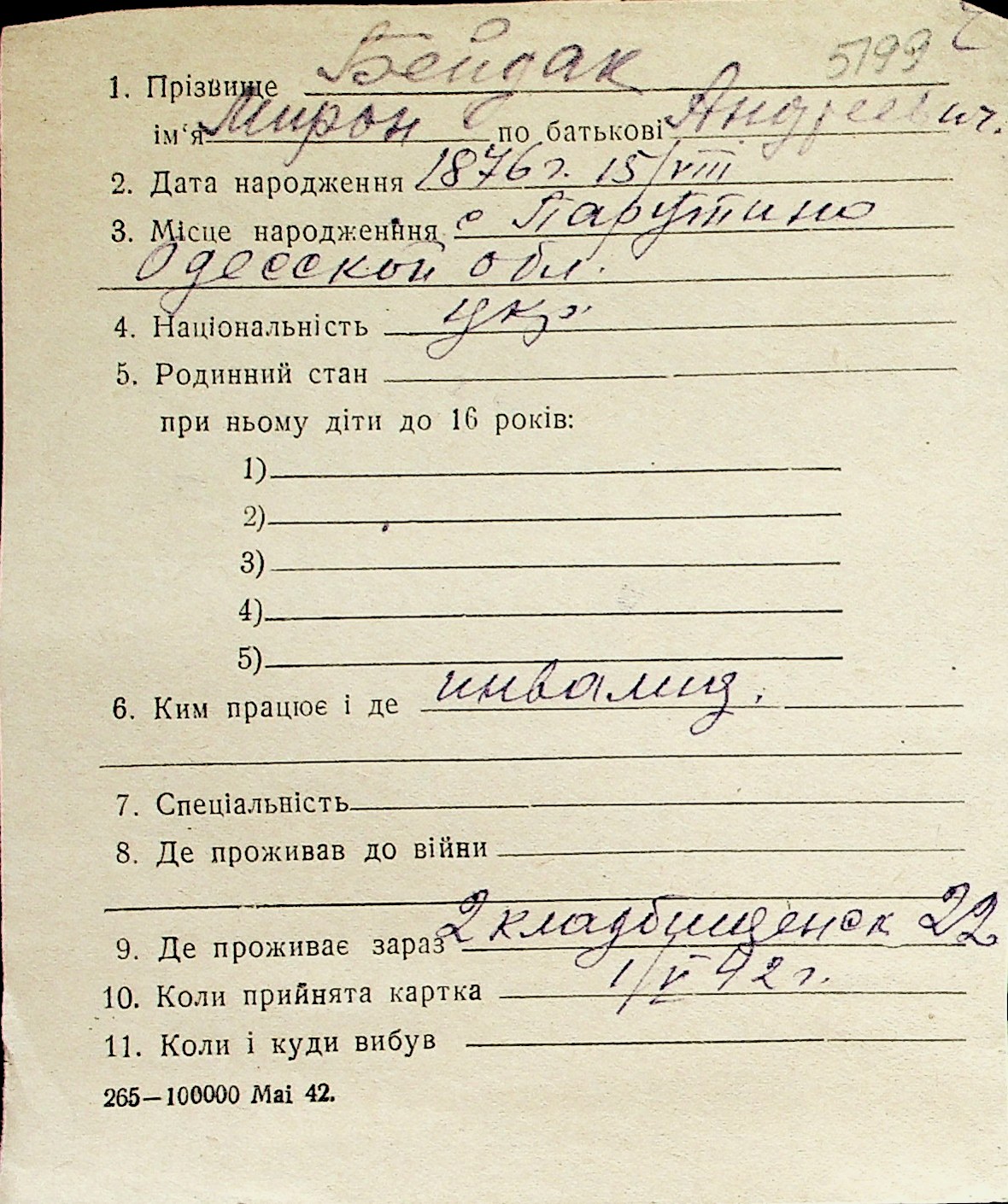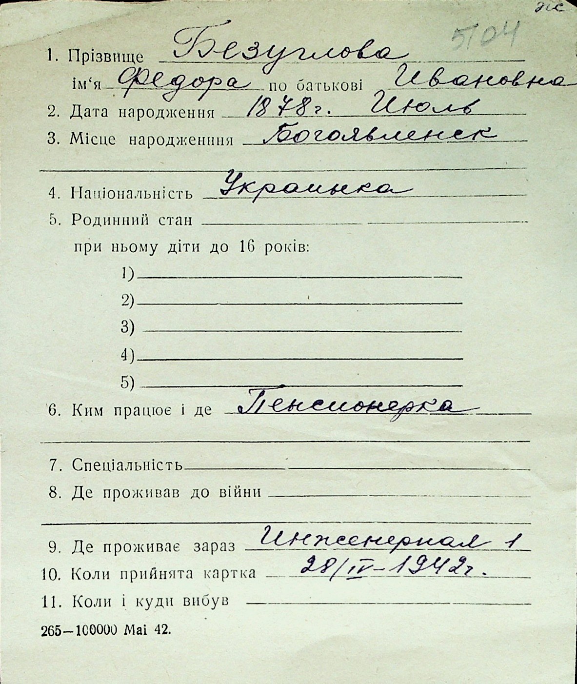 ◦ ◦ Перелік карток на осіб, які мешкали у м. Миколаїв у період окупації 1941–1944 років