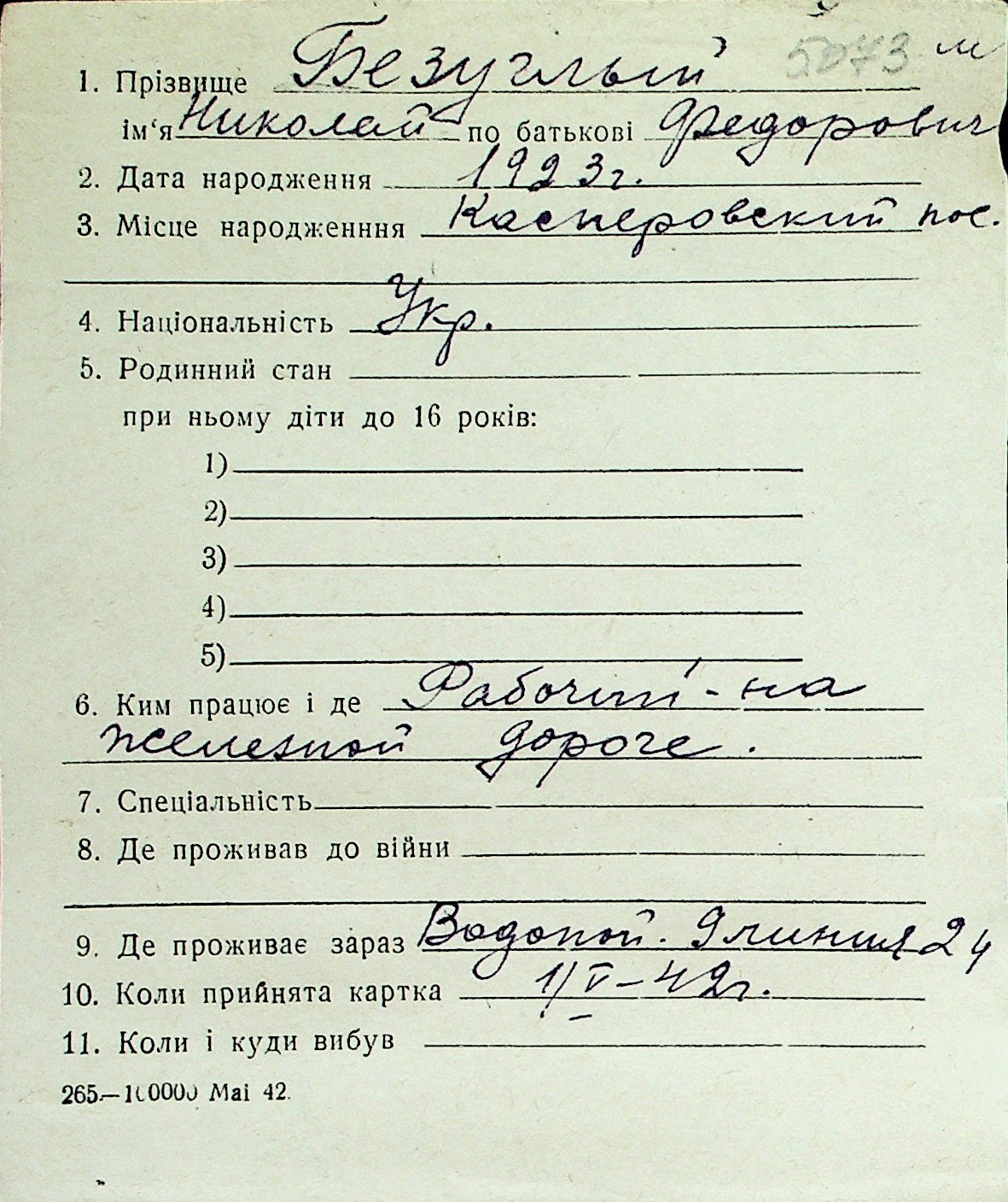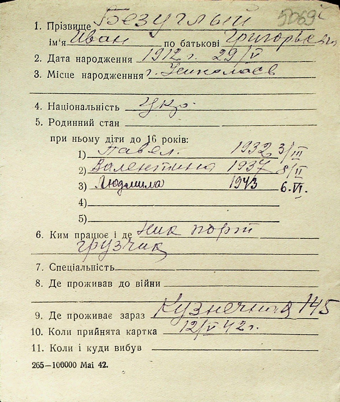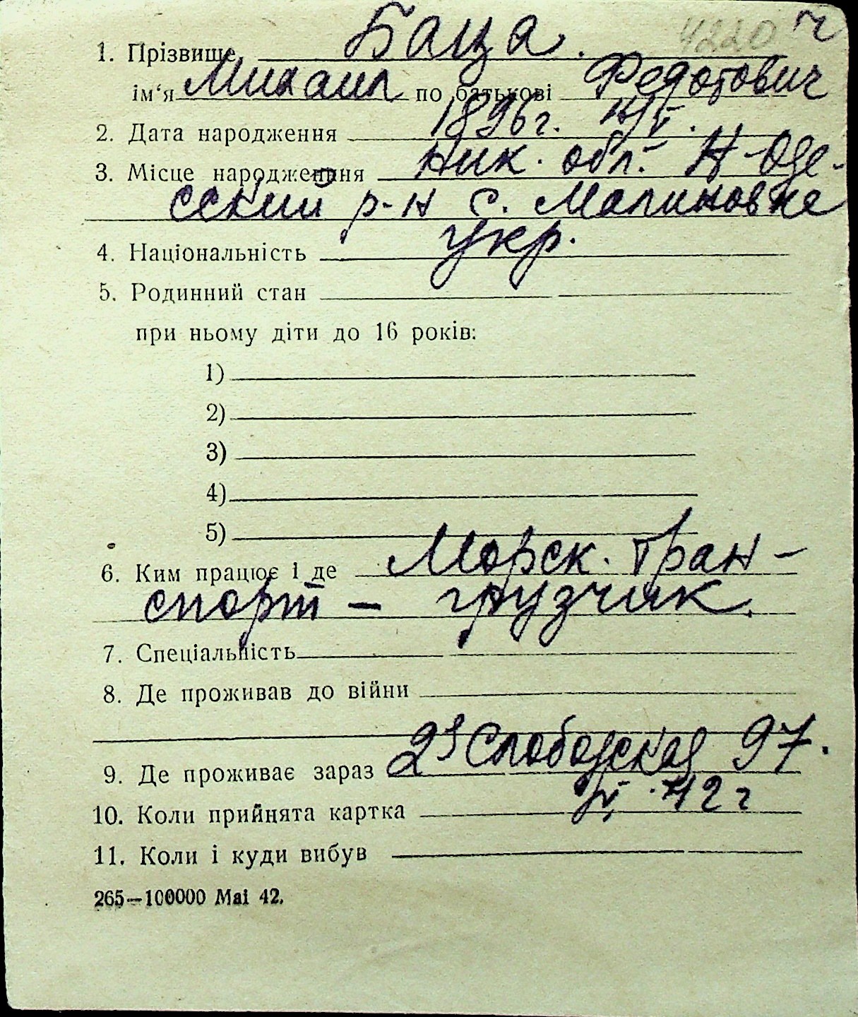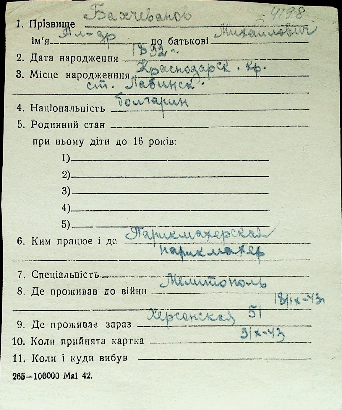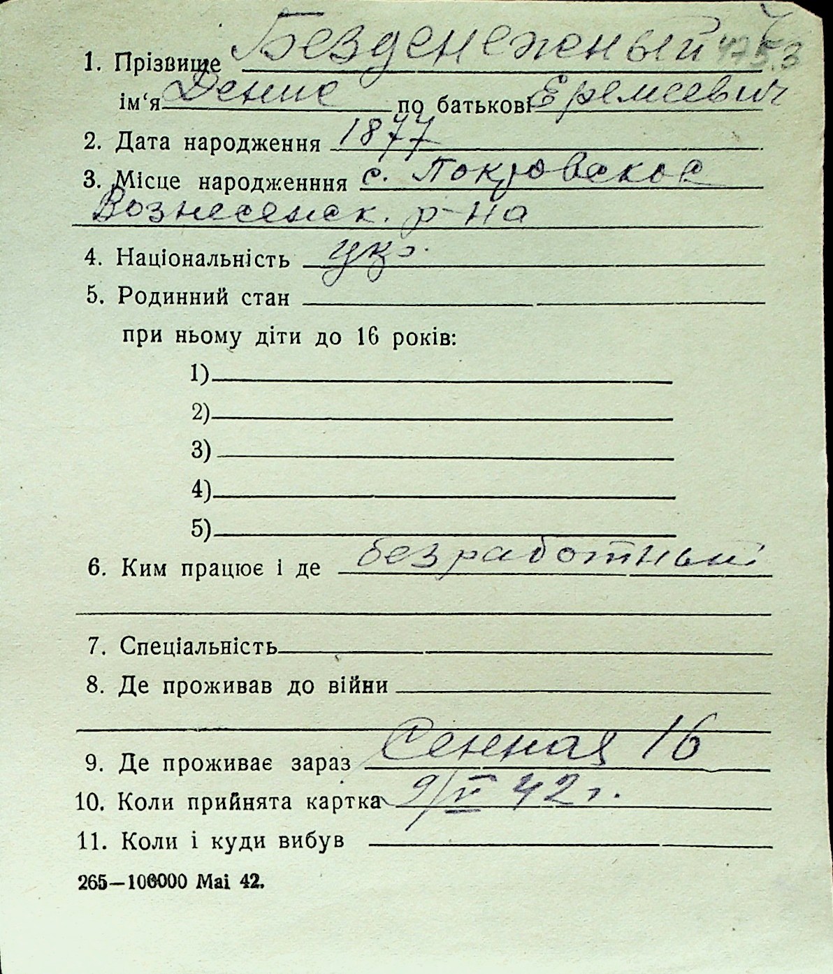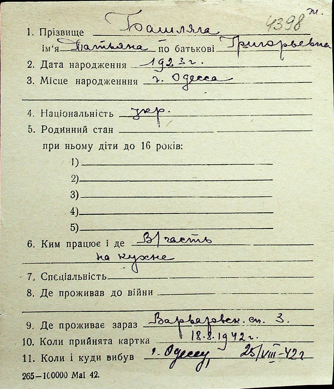 ◦ ◦ Перелік карток на осіб, які мешкали у м. Миколаїв у період окупації 1941–1944 років