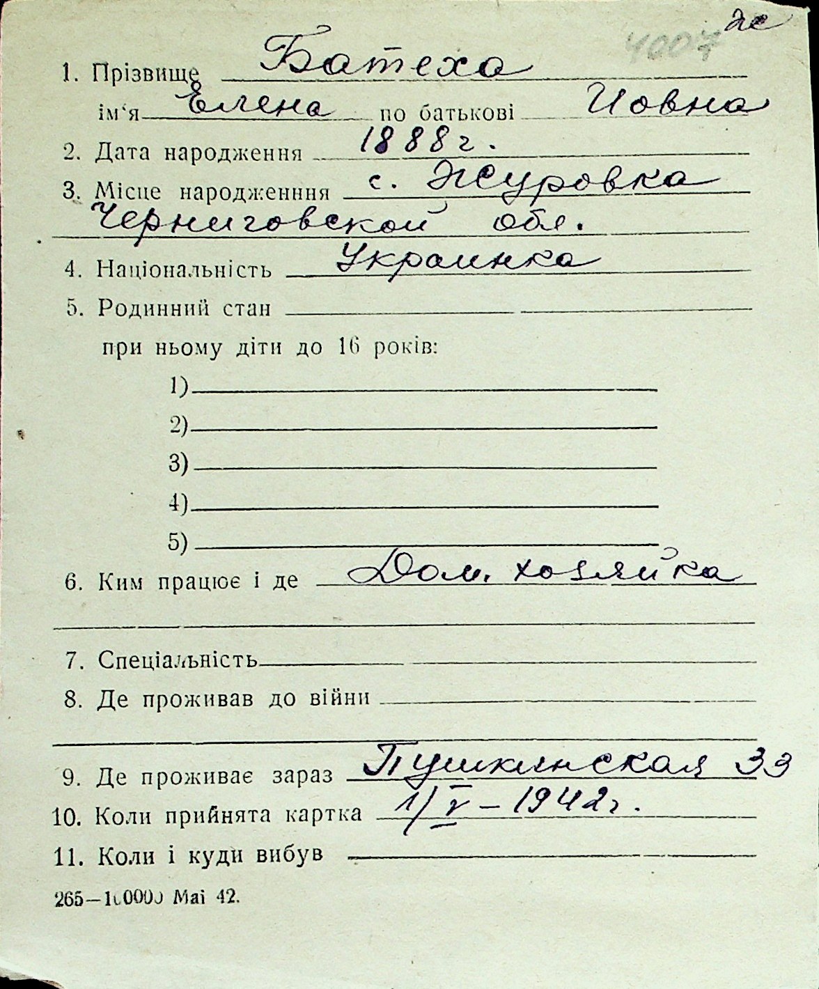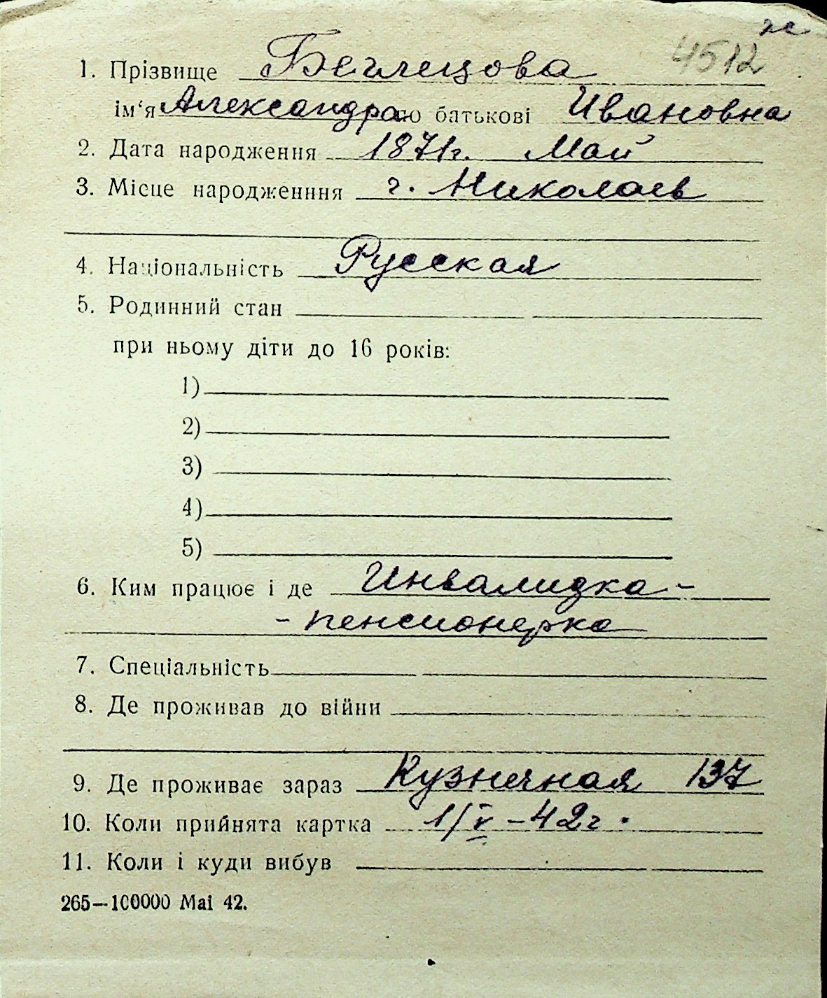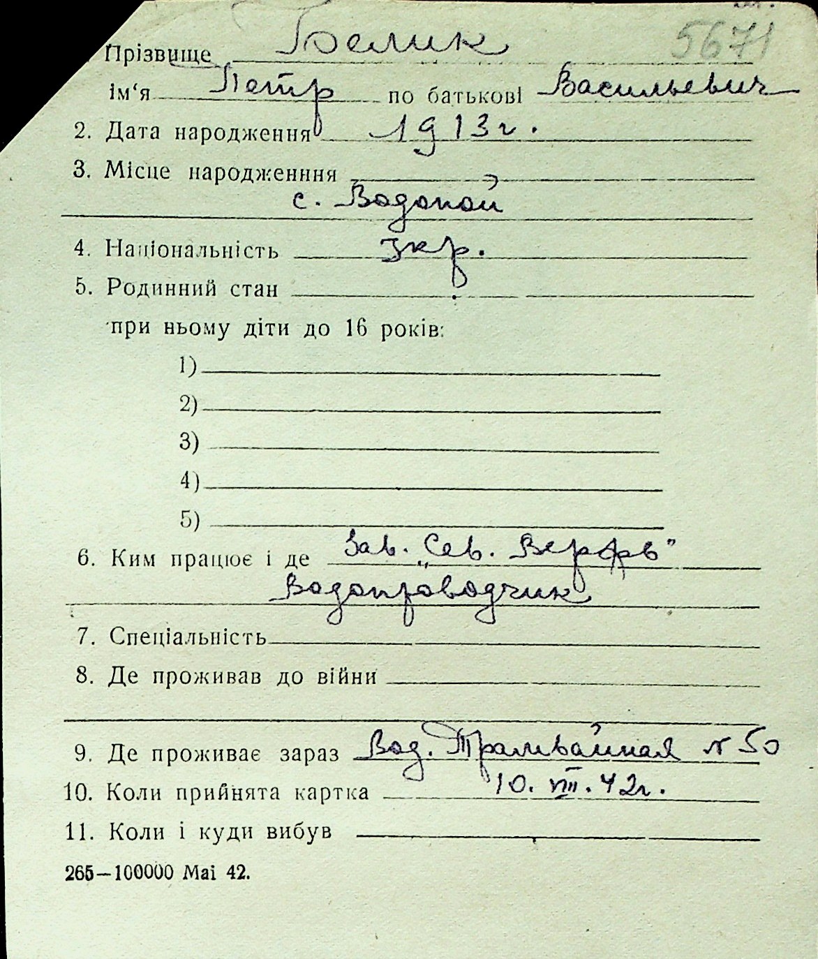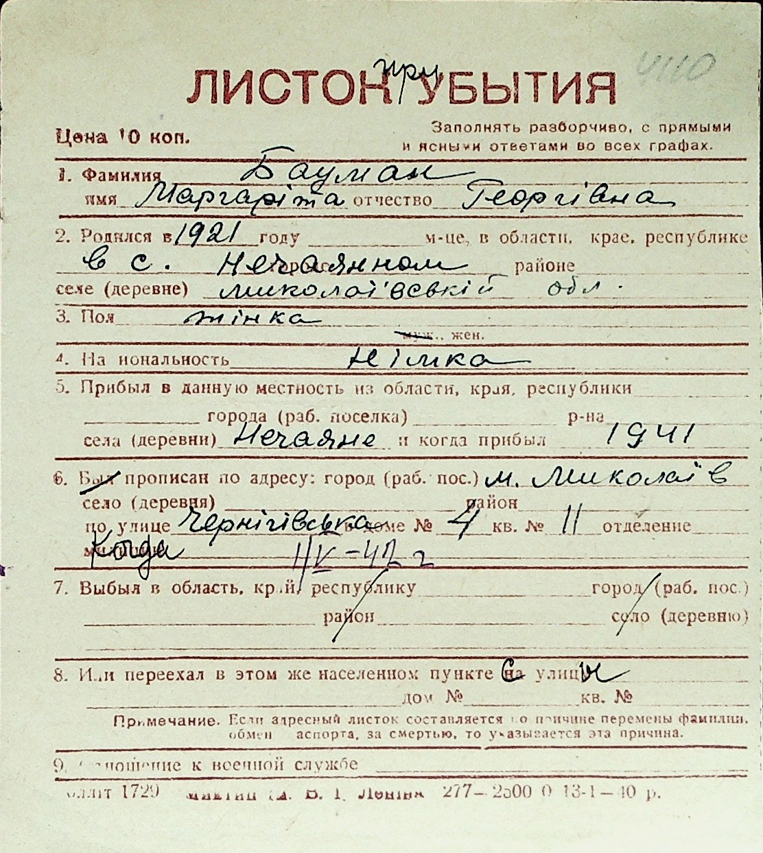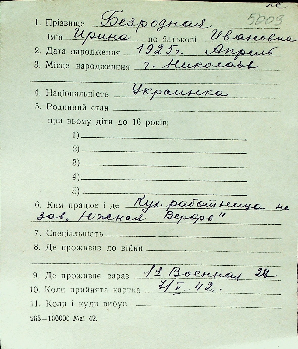 ◦ ◦ Перелік карток на осіб, які мешкали у м. Миколаїв у період окупації 1941–1944 років