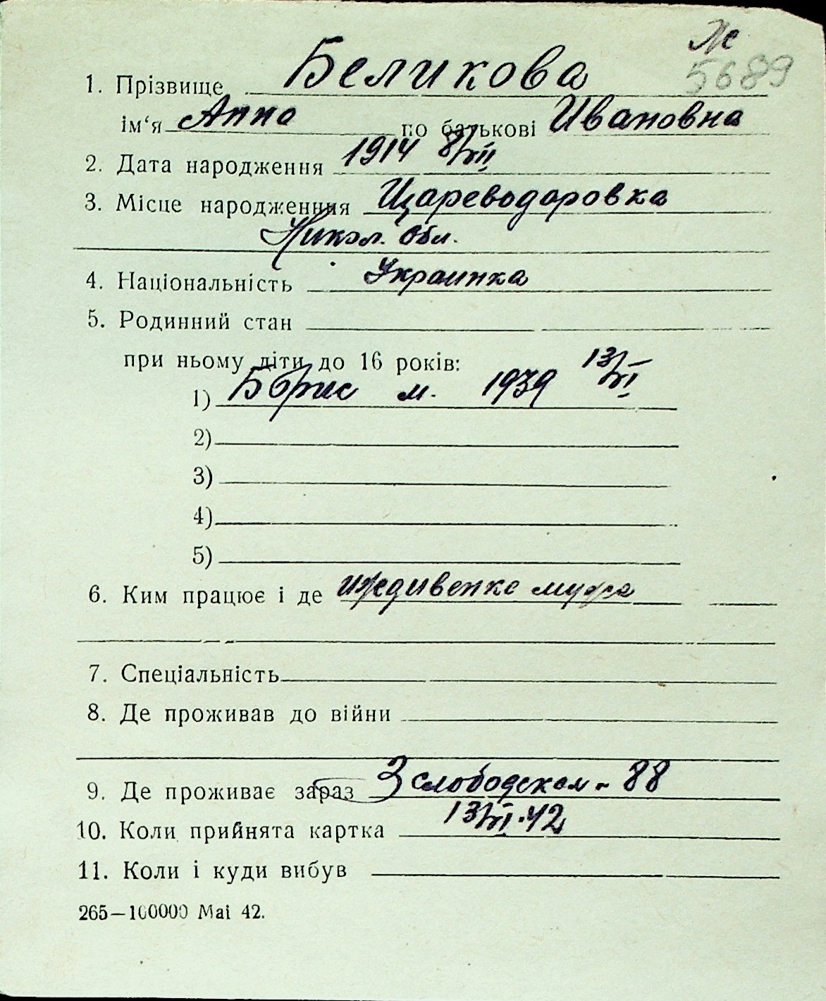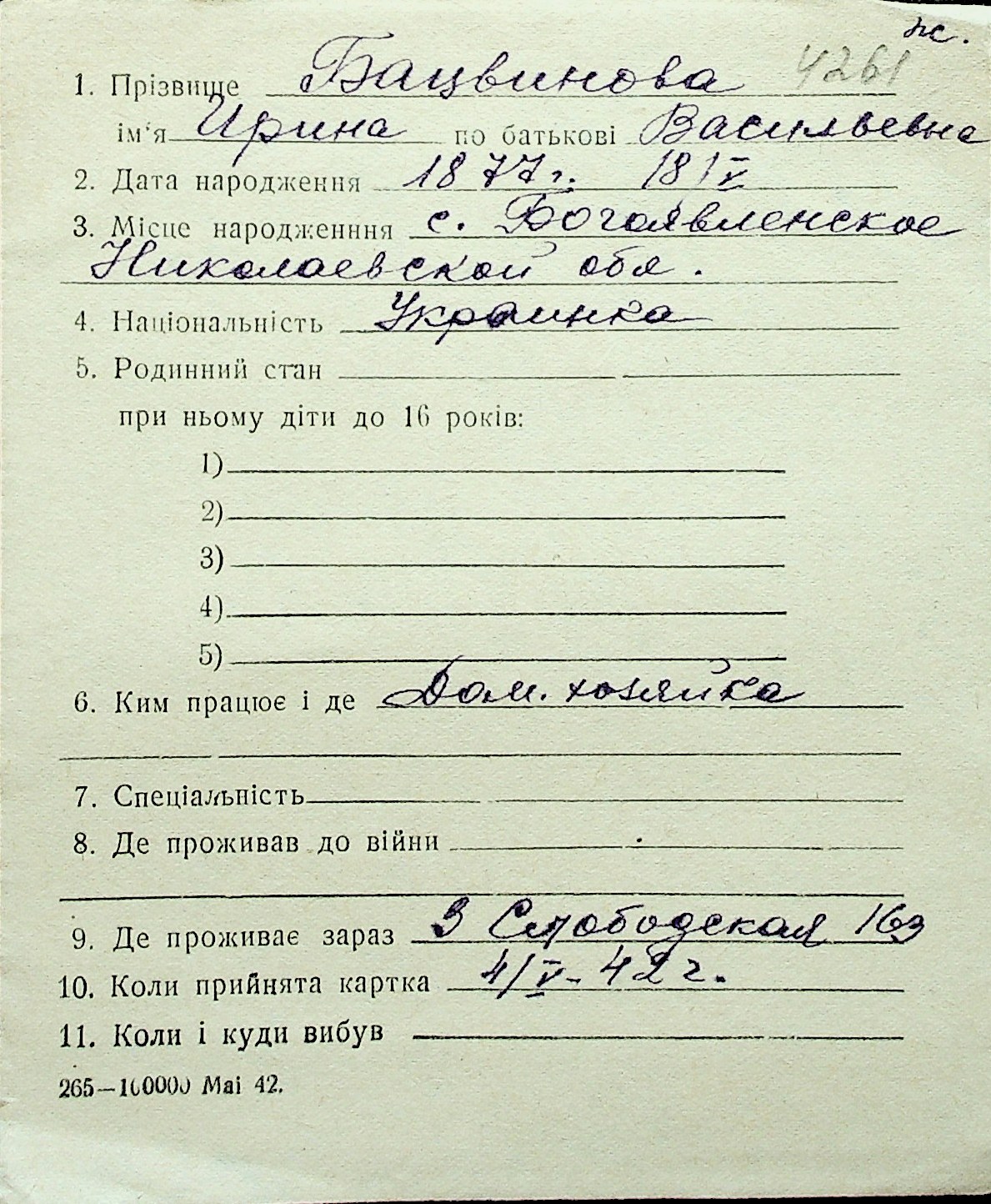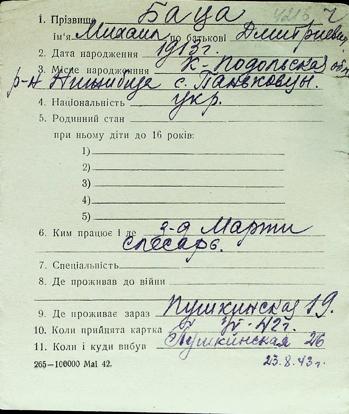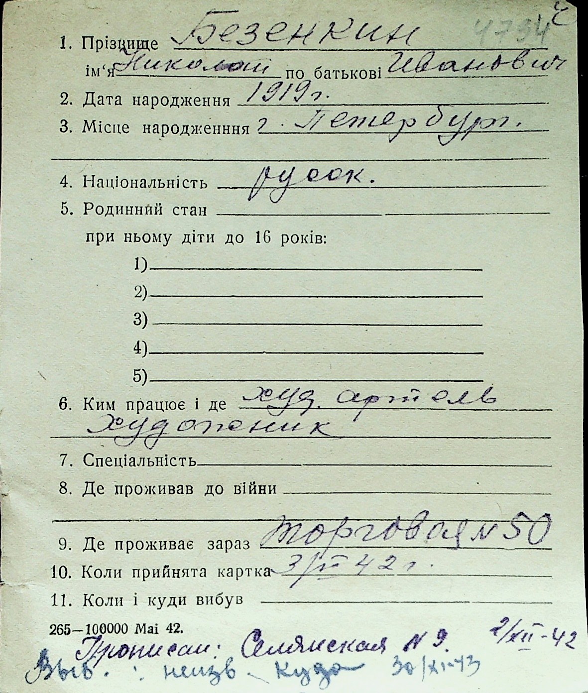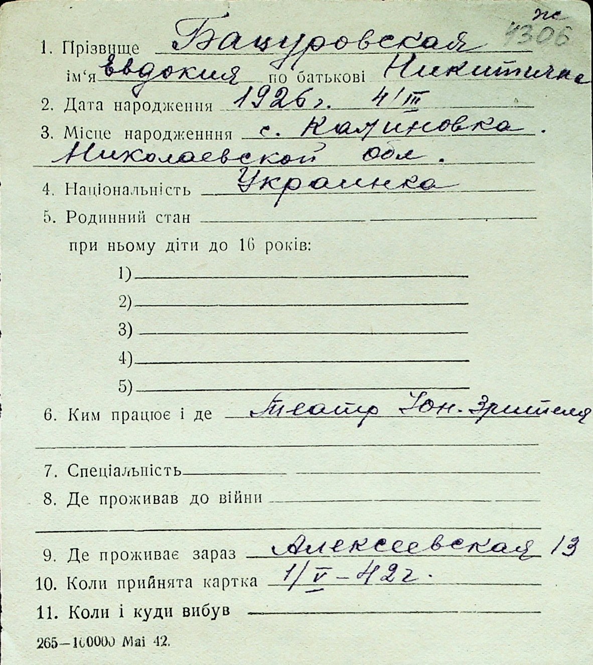 ◦ ◦ Перелік карток на осіб, які мешкали у м. Миколаїв у період окупації 1941–1944 років