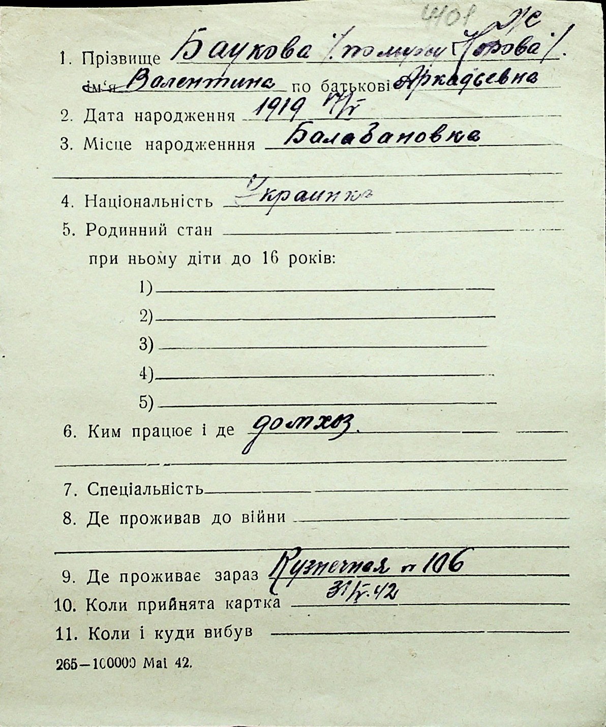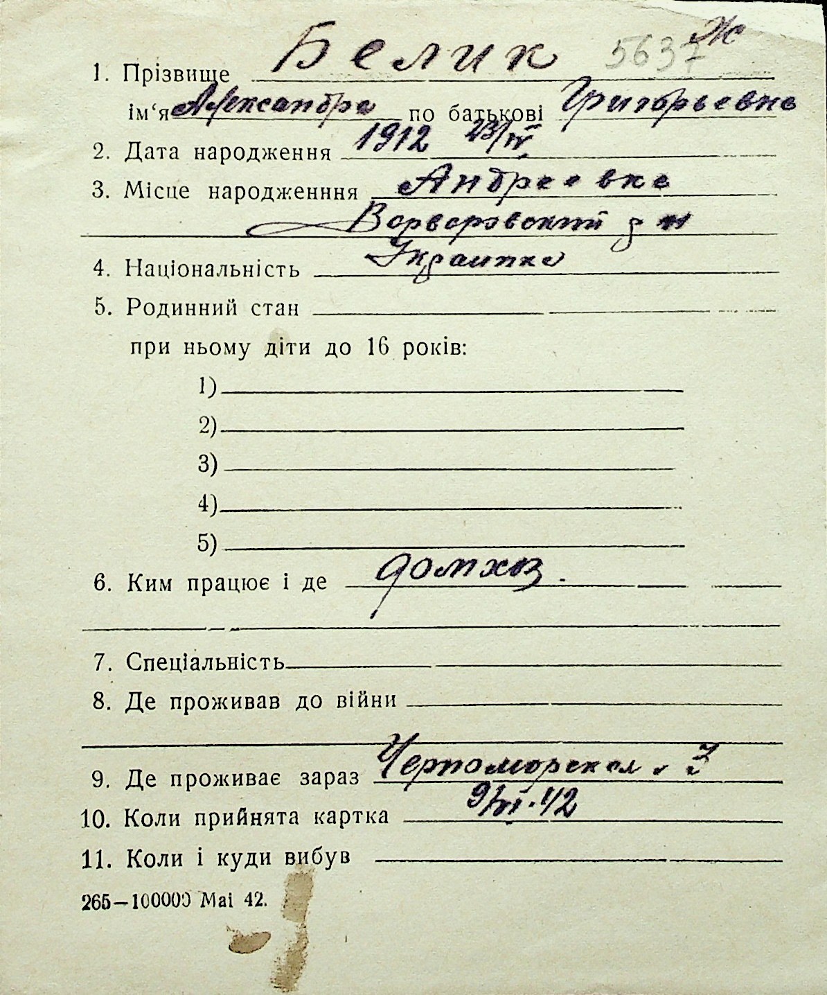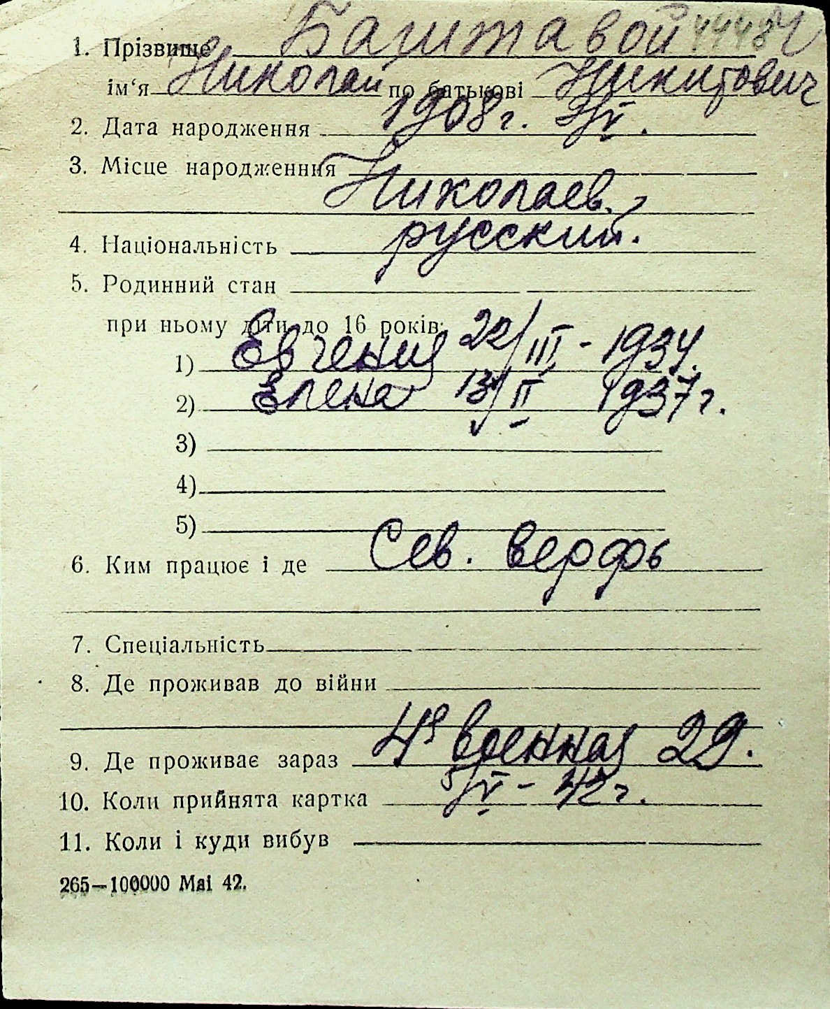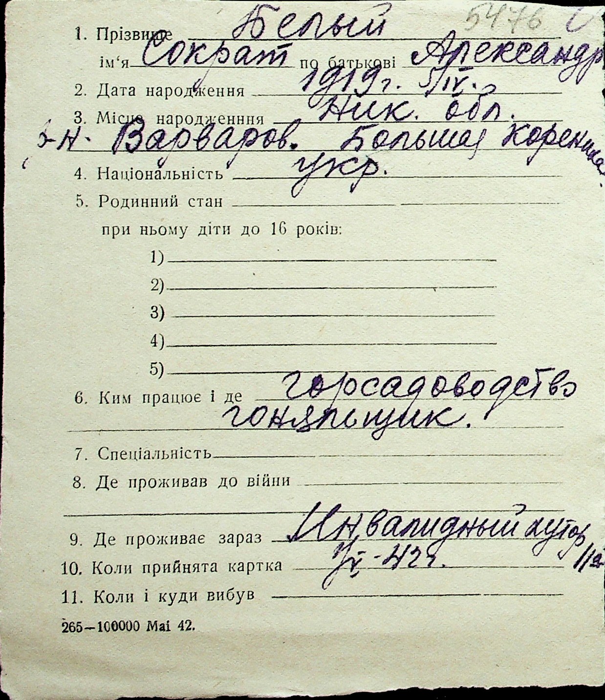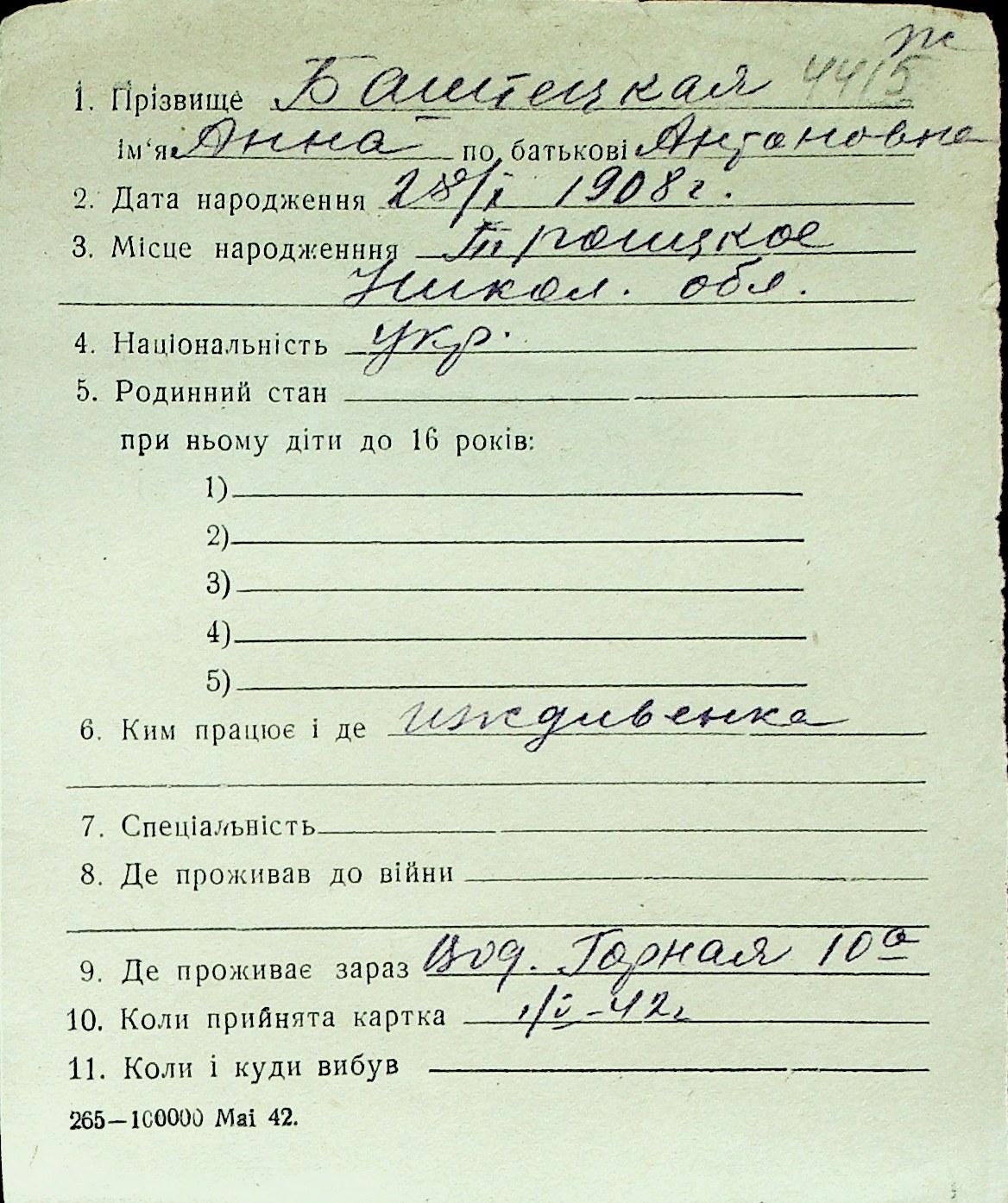 ◦ ◦ Перелік карток на осіб, які мешкали у м. Миколаїв у період окупації 1941–1944 років