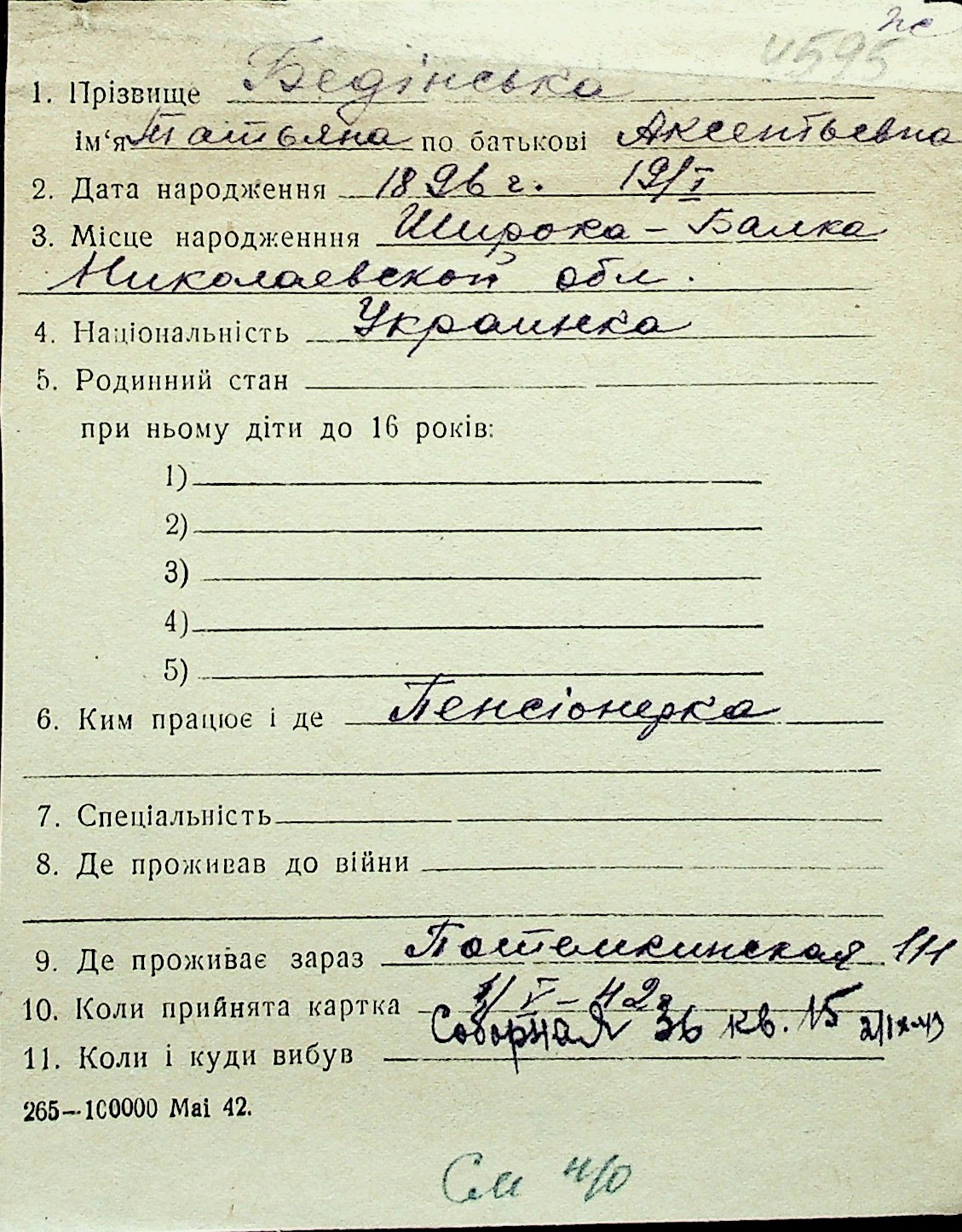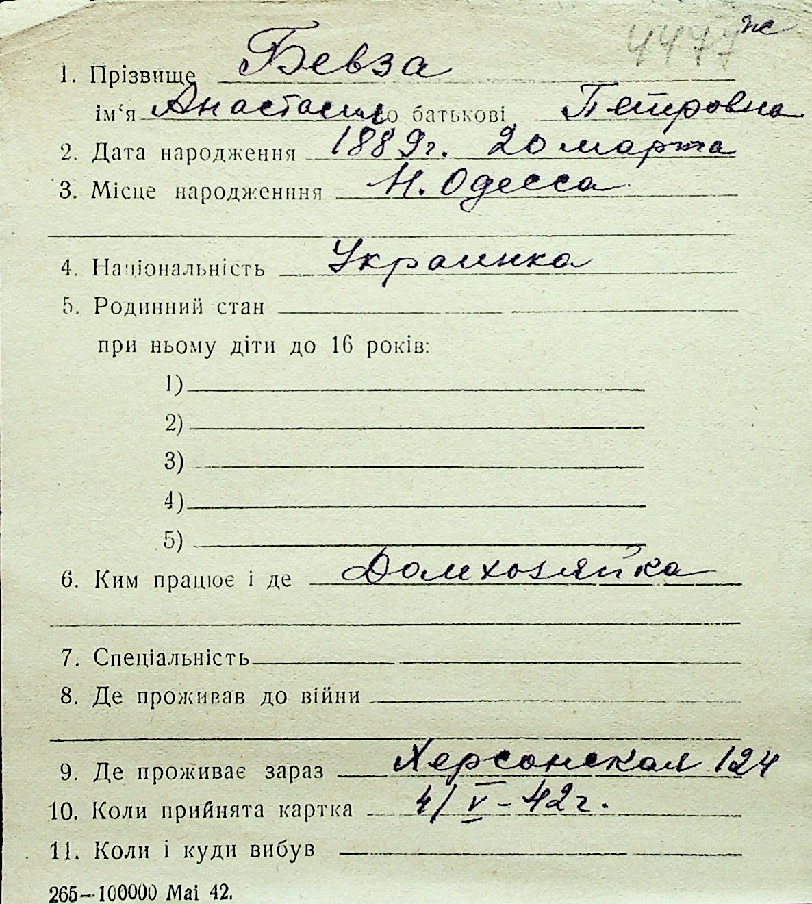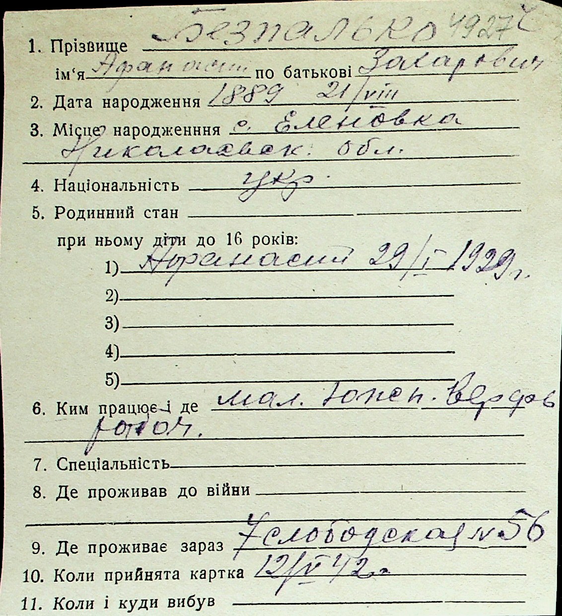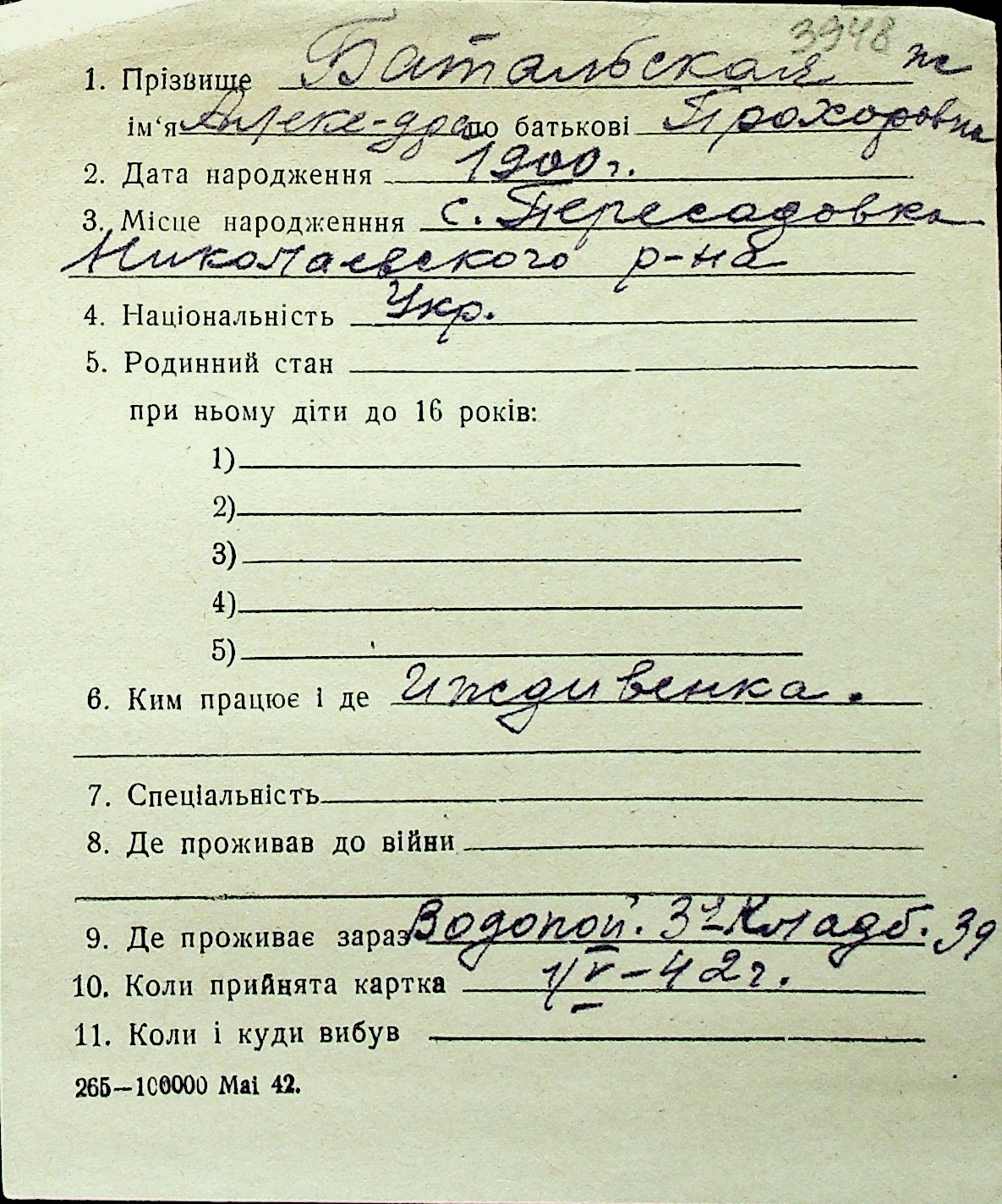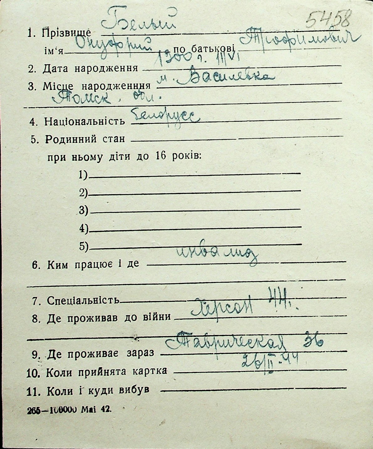 ◦ ◦ Перелік карток на осіб, які мешкали у м. Миколаїв у період окупації 1941–1944 років