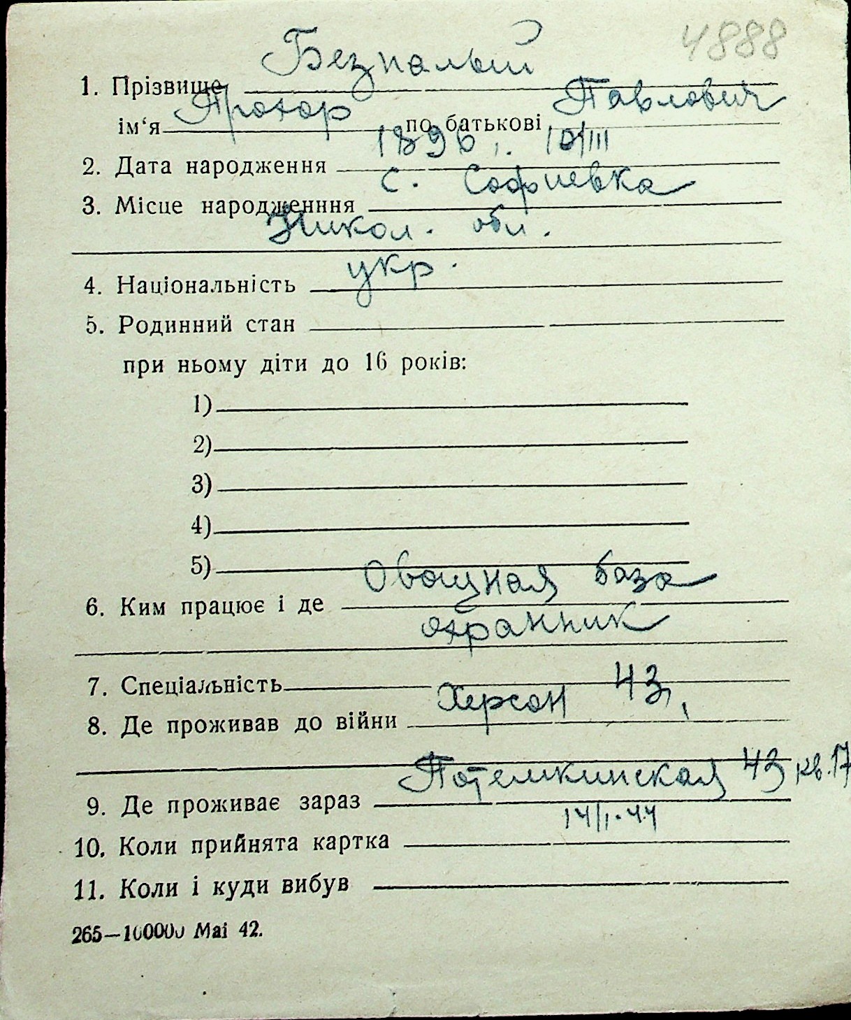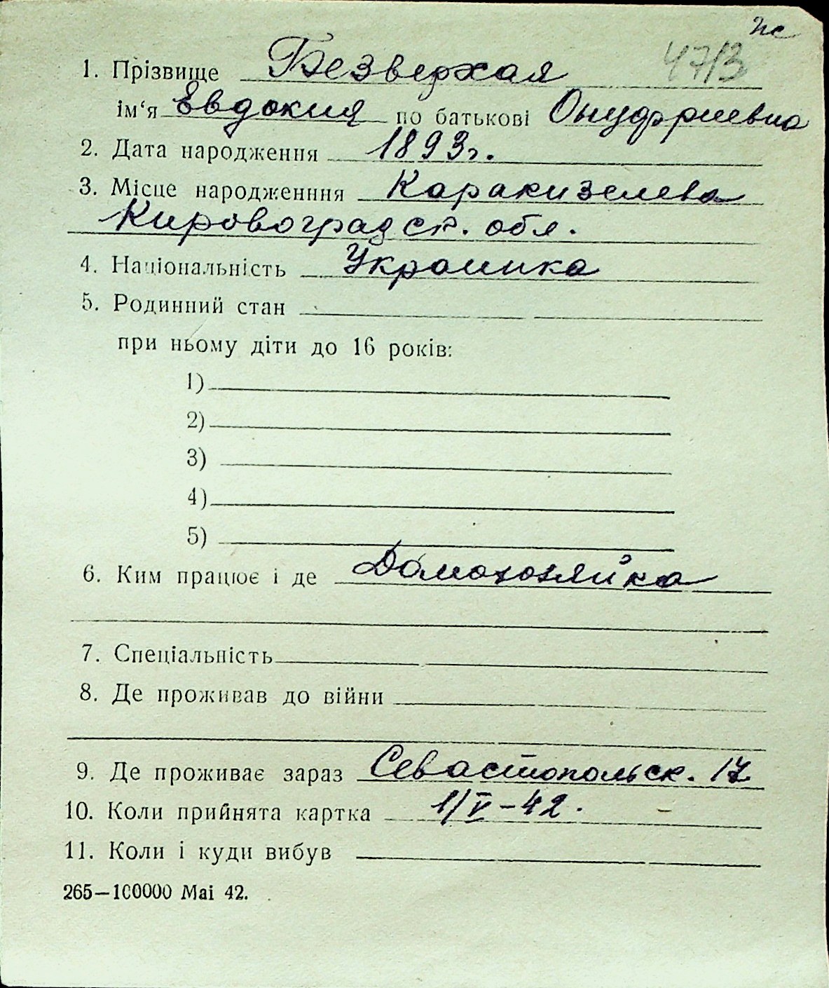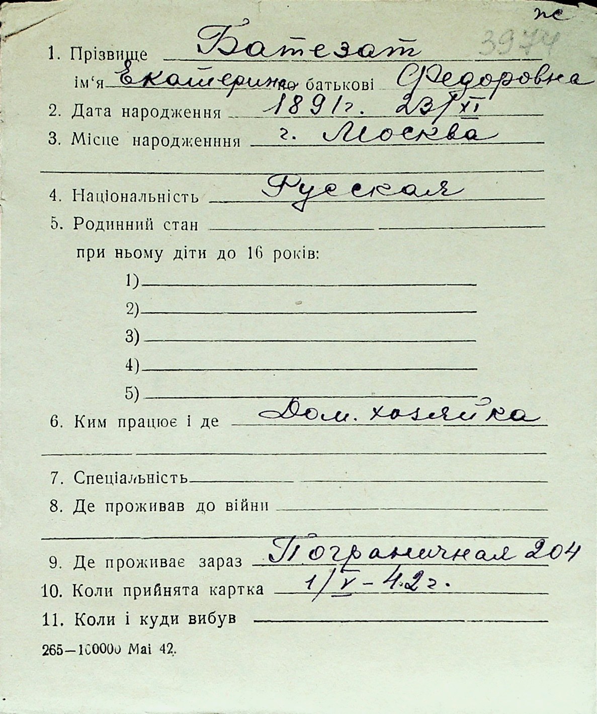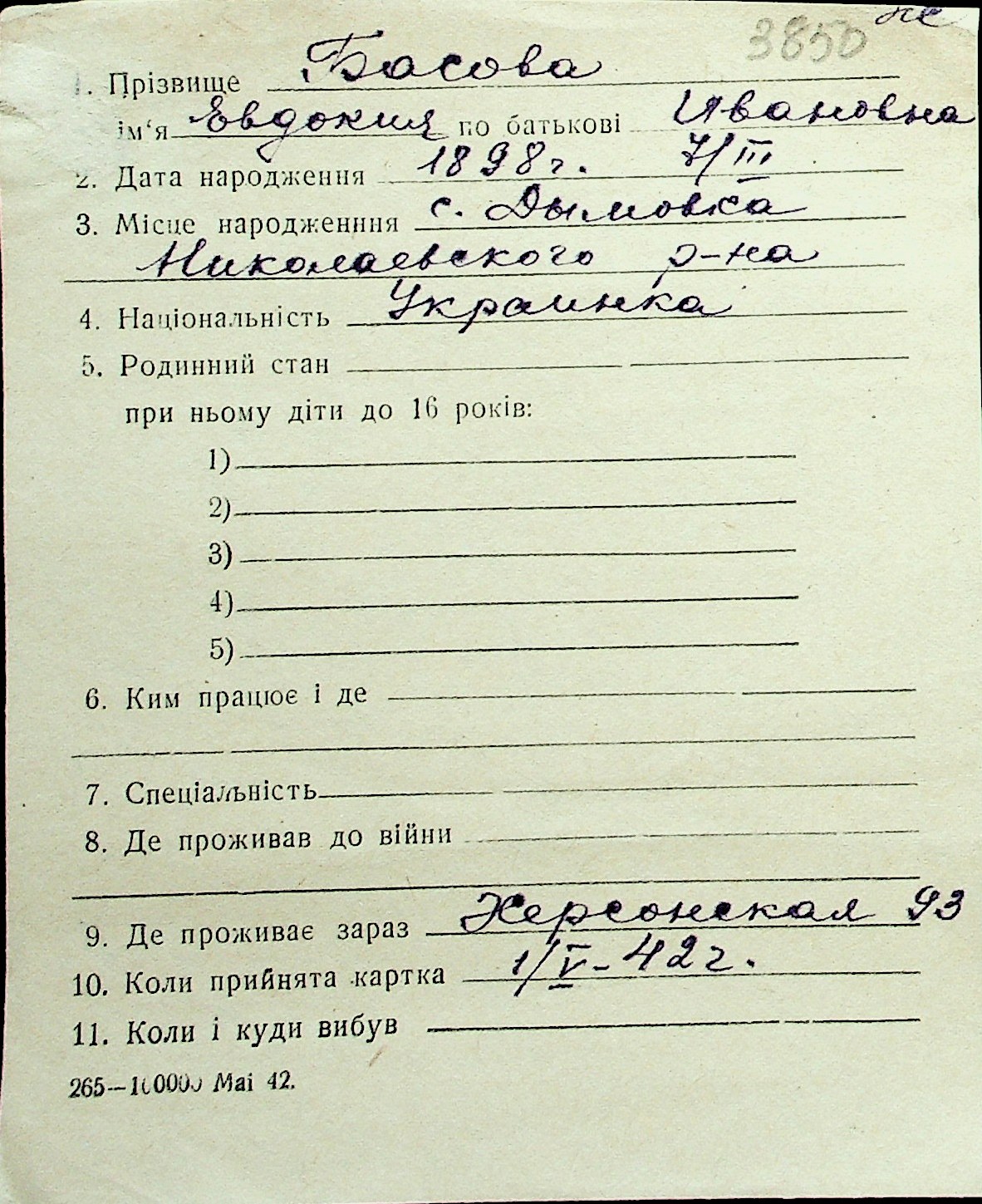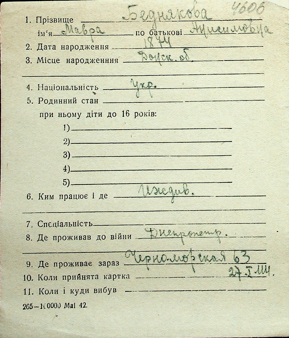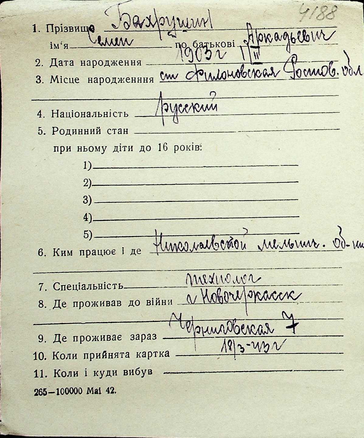 ◦ ◦ Перелік карток на осіб, які мешкали у м. Миколаїв у період окупації 1941–1944 років
