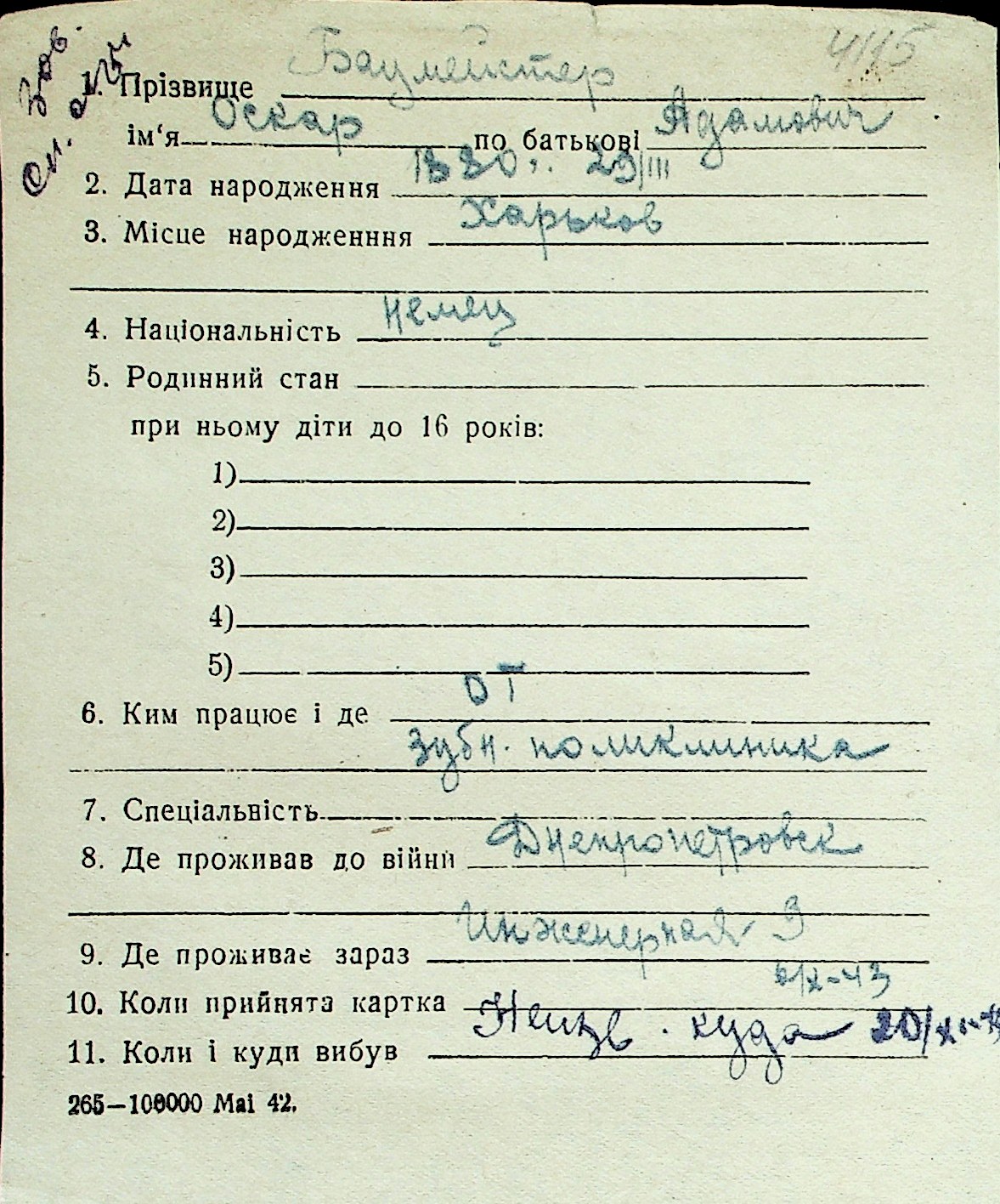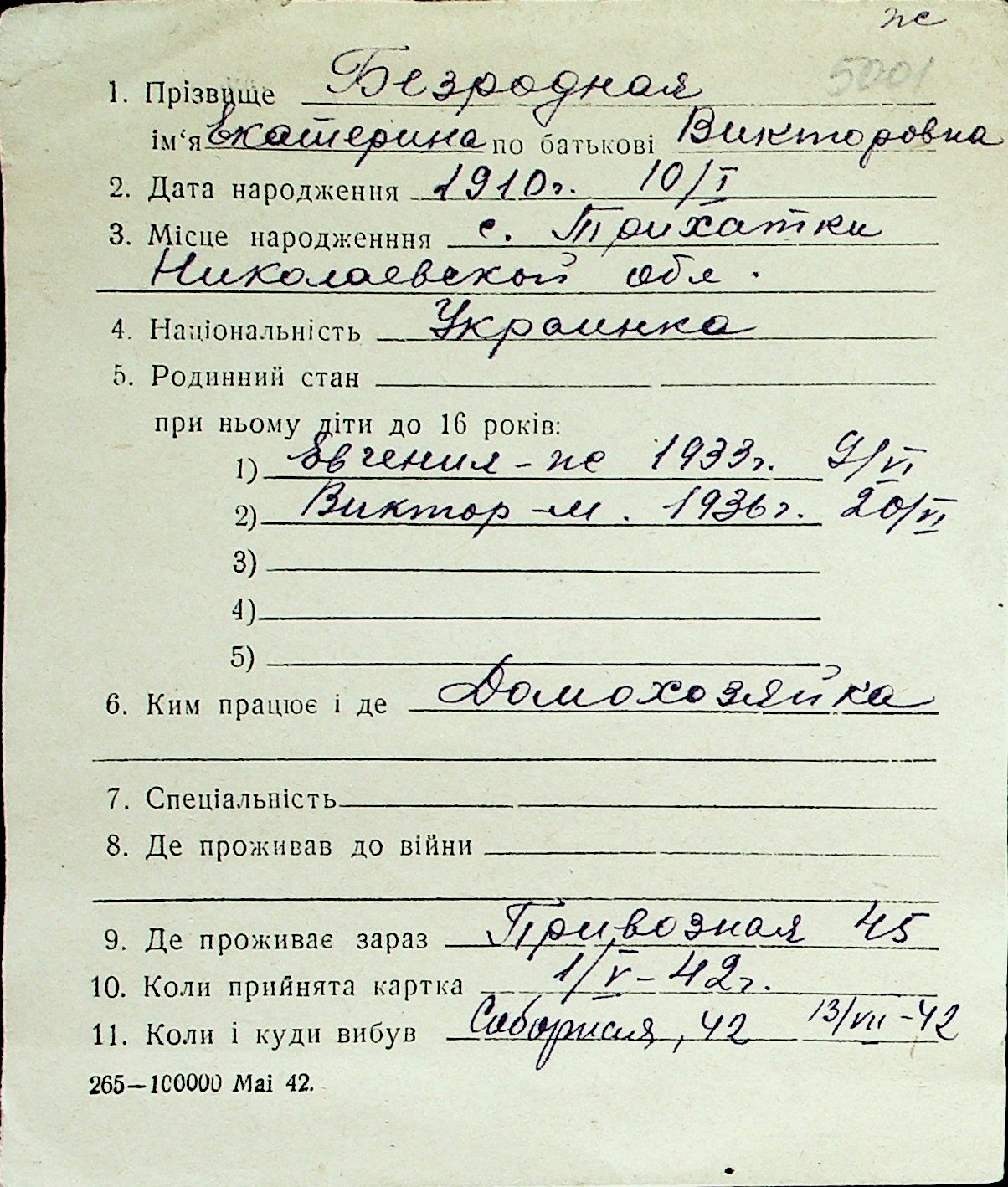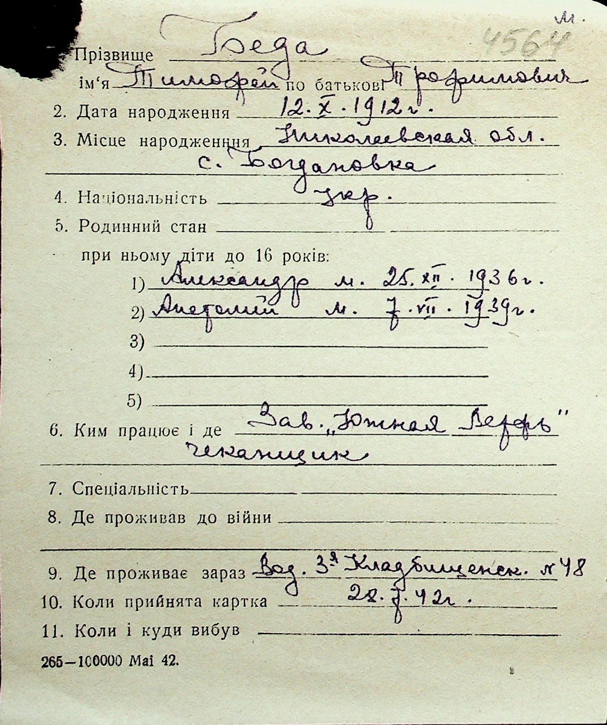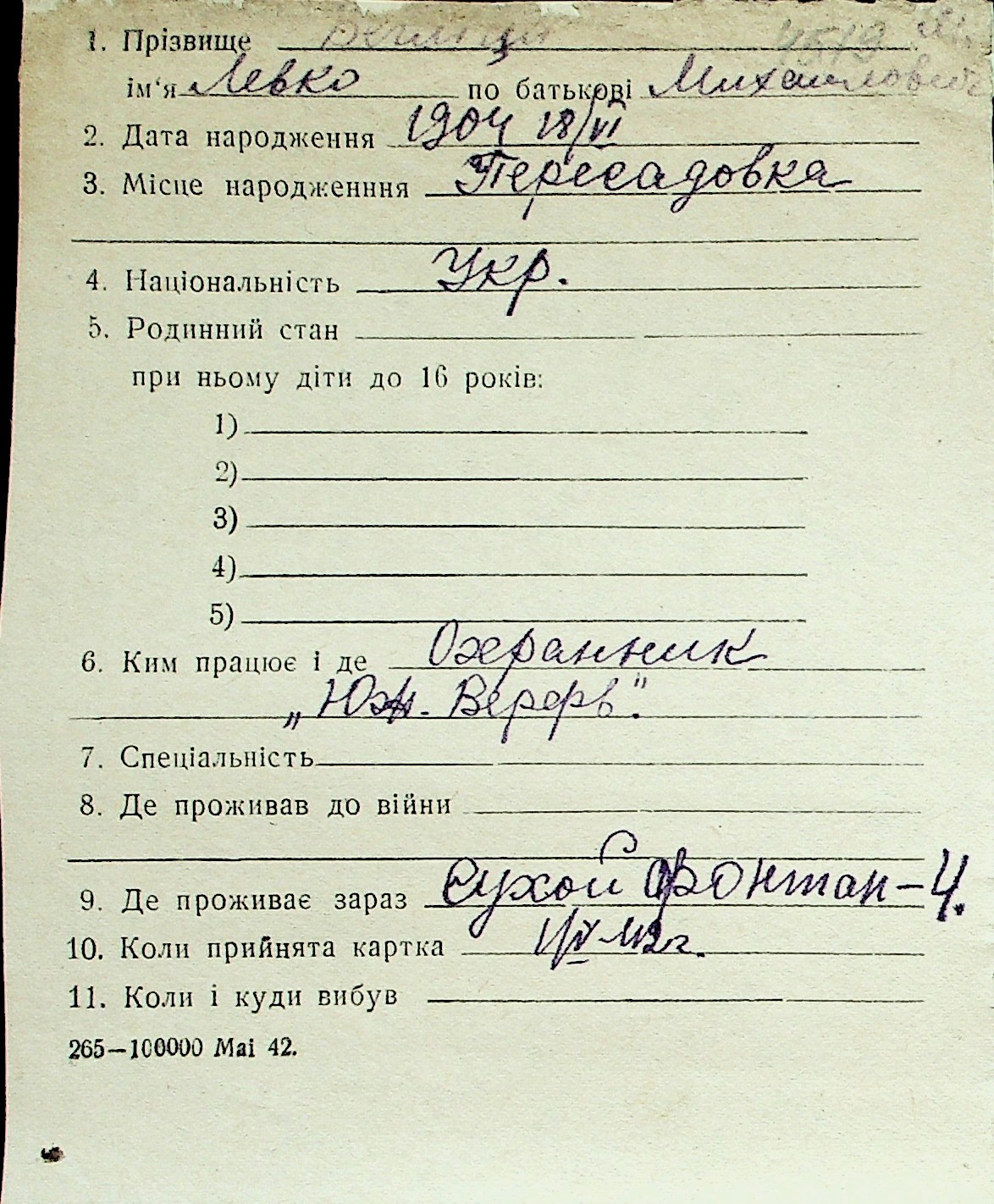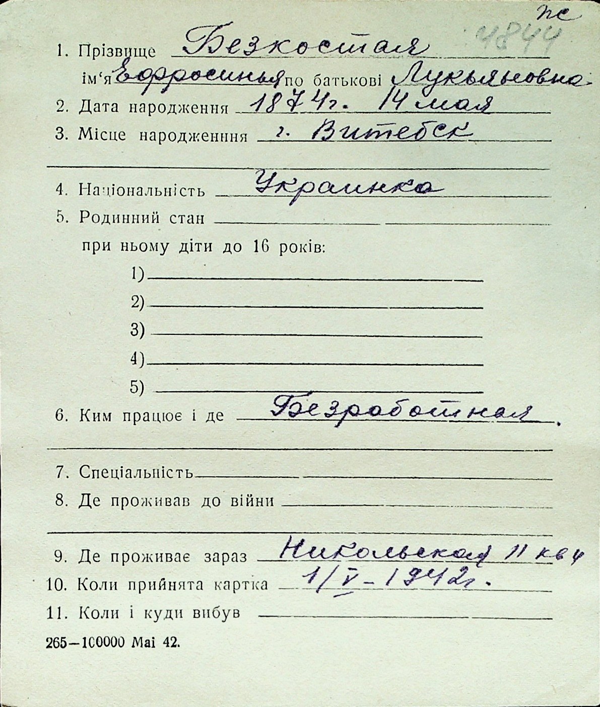 ◦ ◦ Перелік карток на осіб, які мешкали у м. Миколаїв у період окупації 1941–1944 років