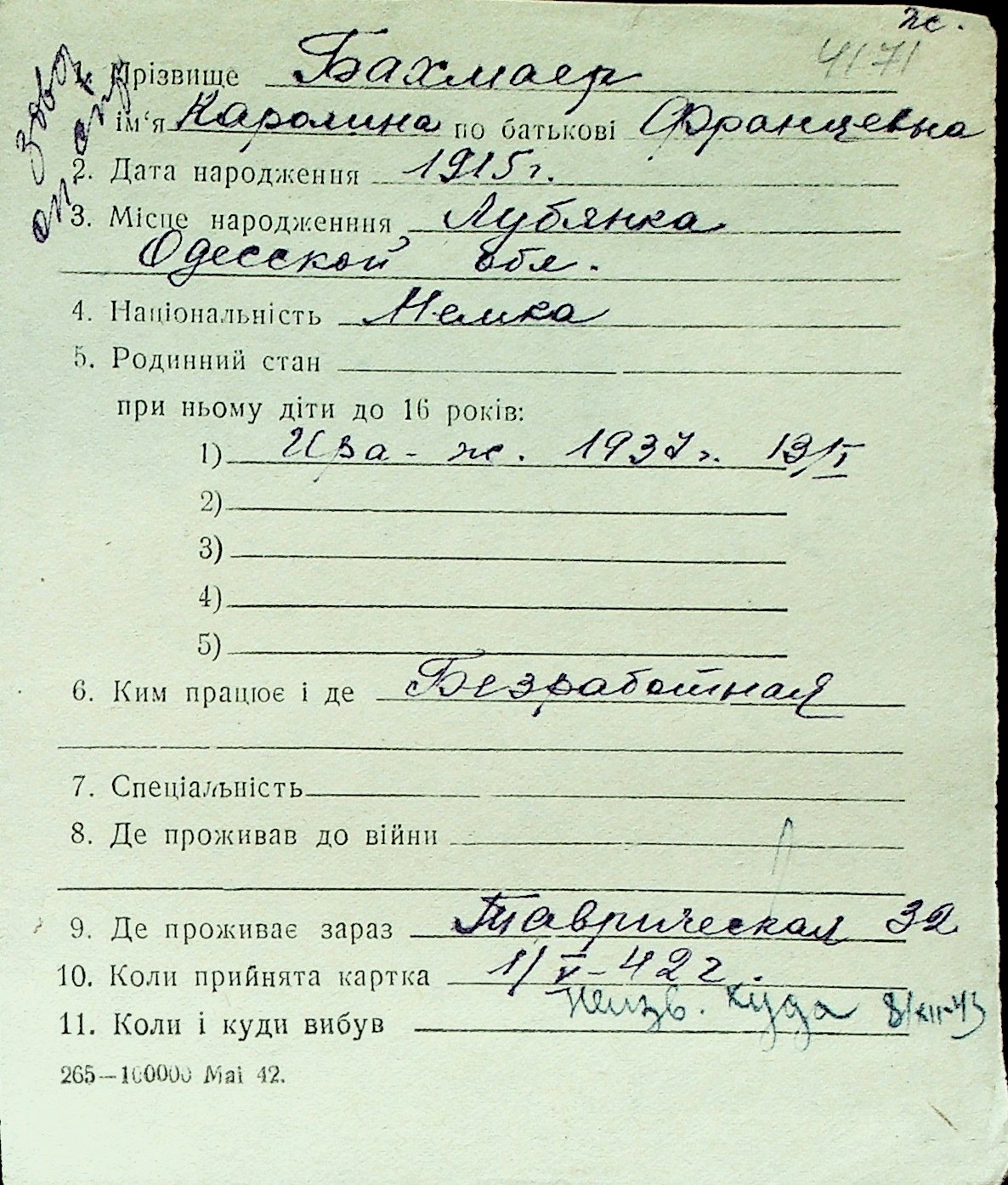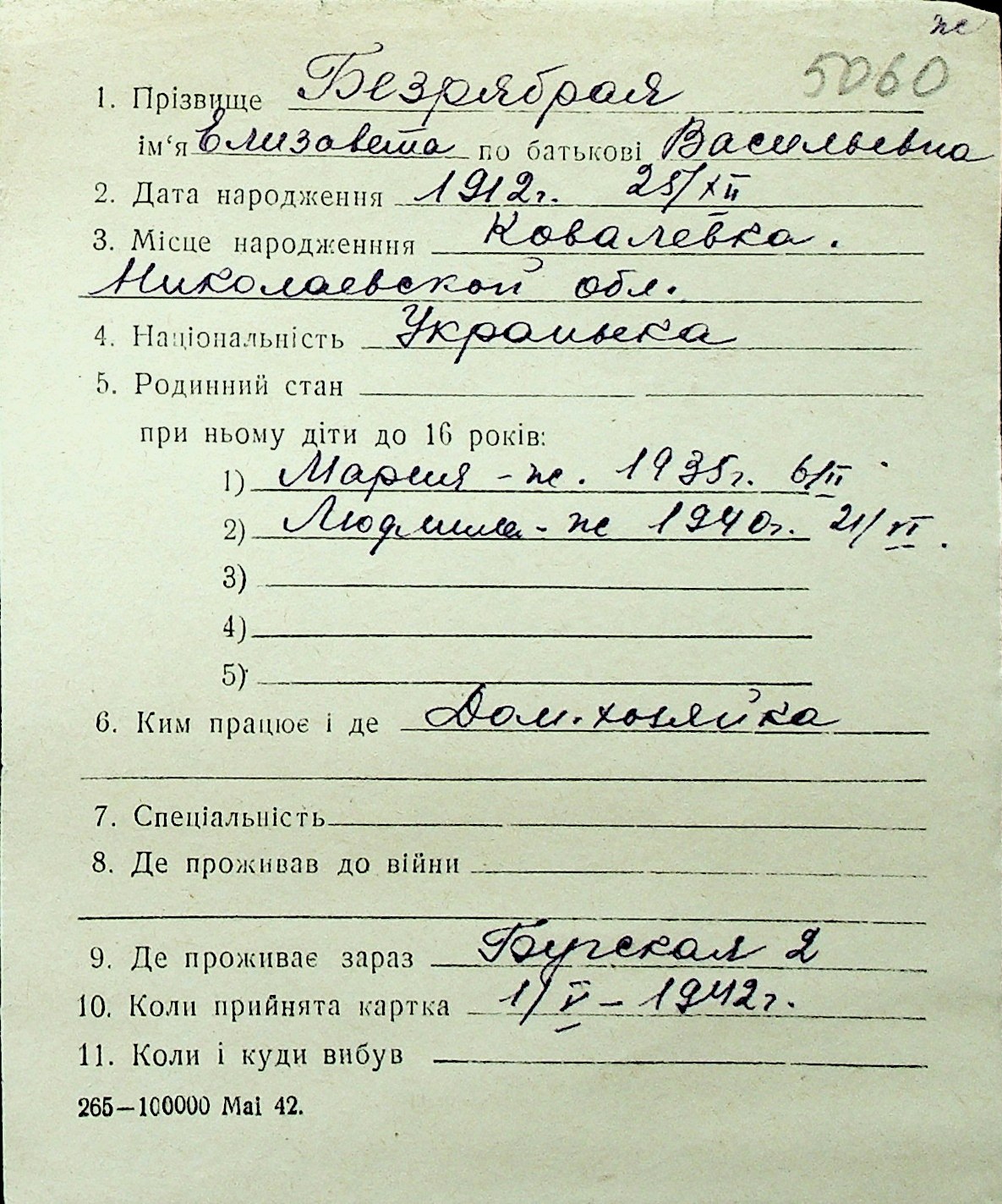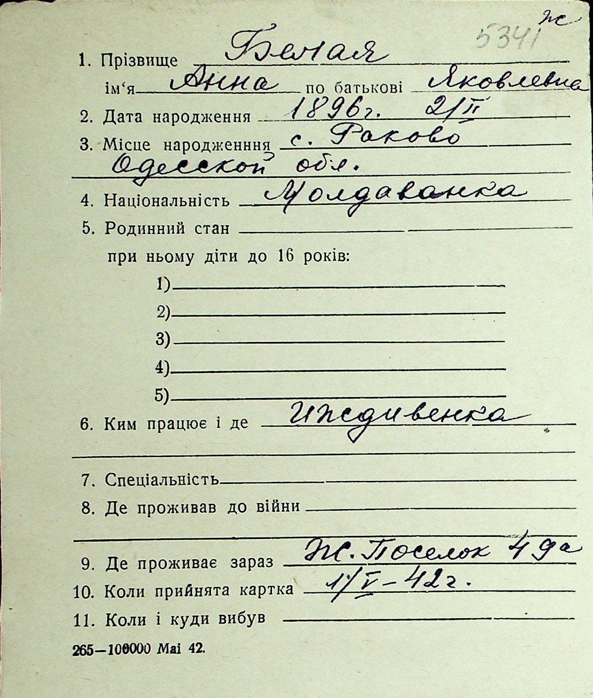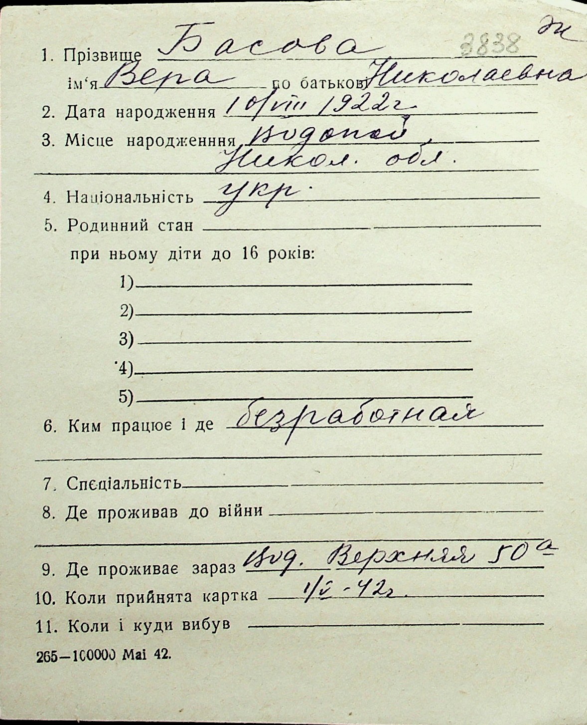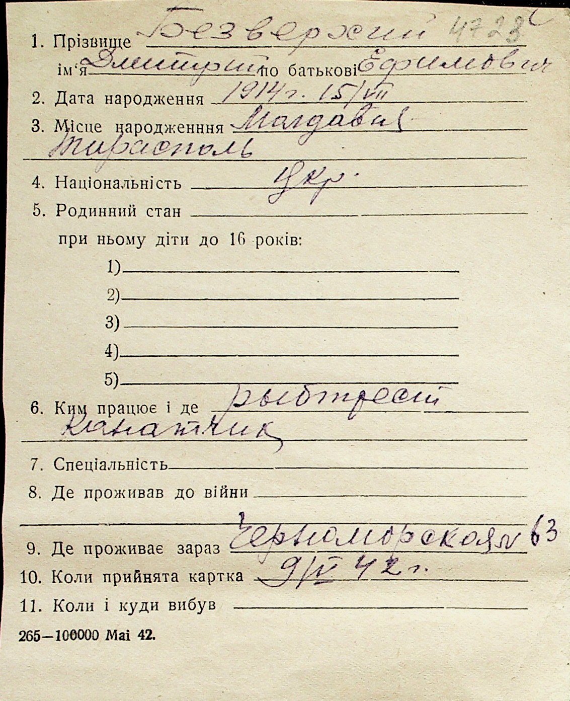 ◦ ◦ Перелік карток на осіб, які мешкали у м. Миколаїв у період окупації 1941–1944 років