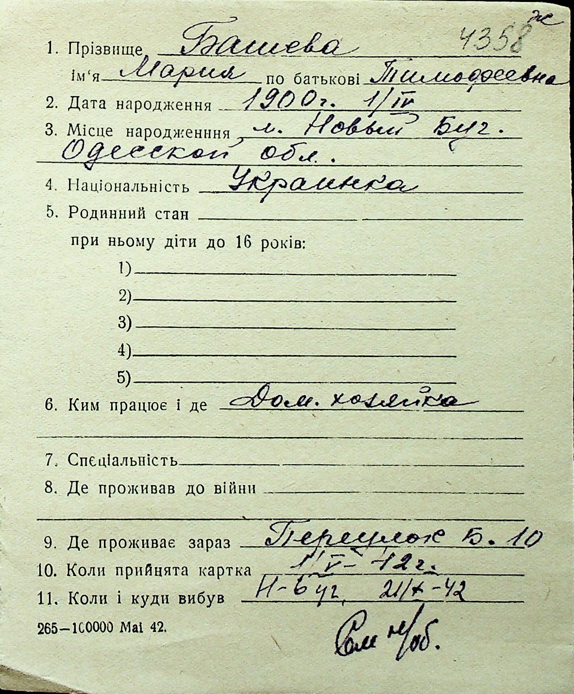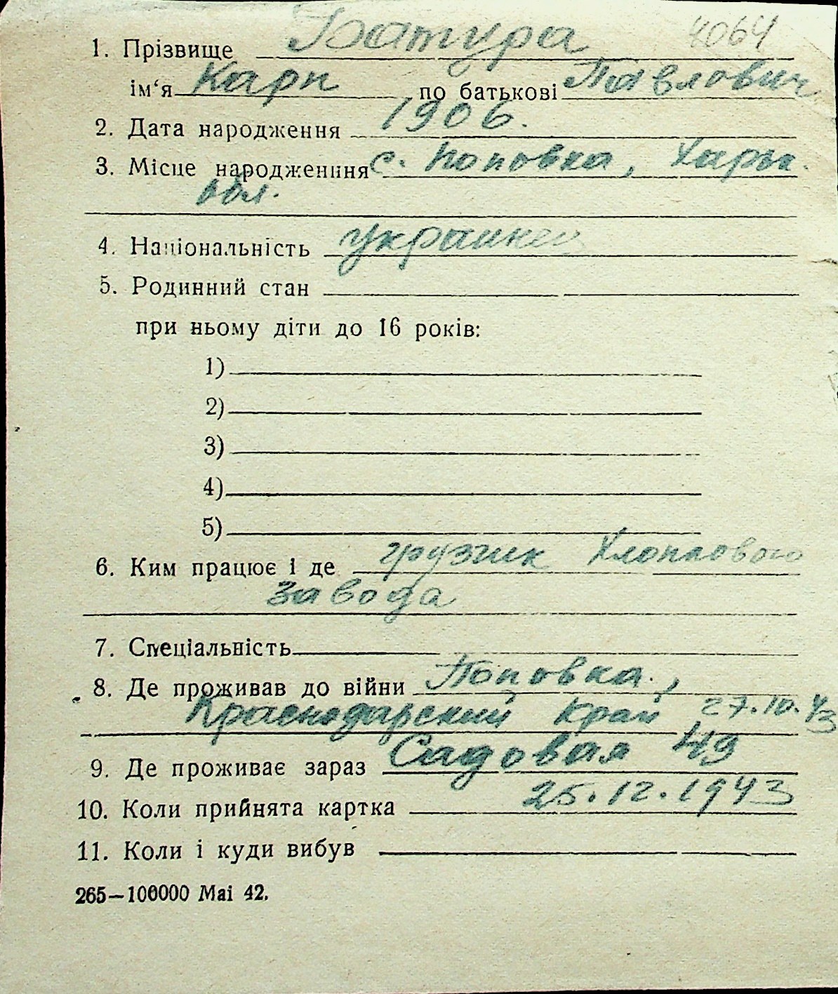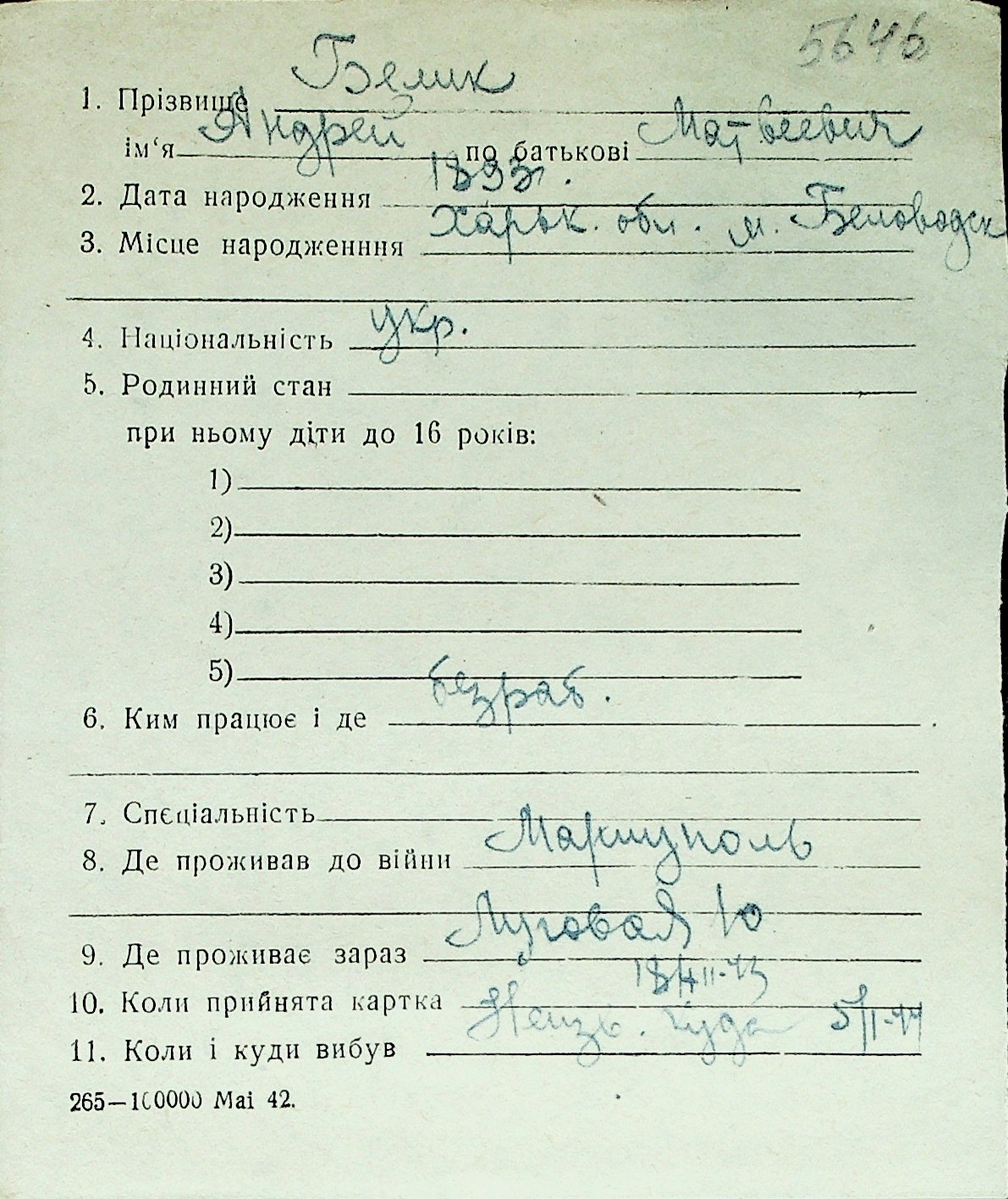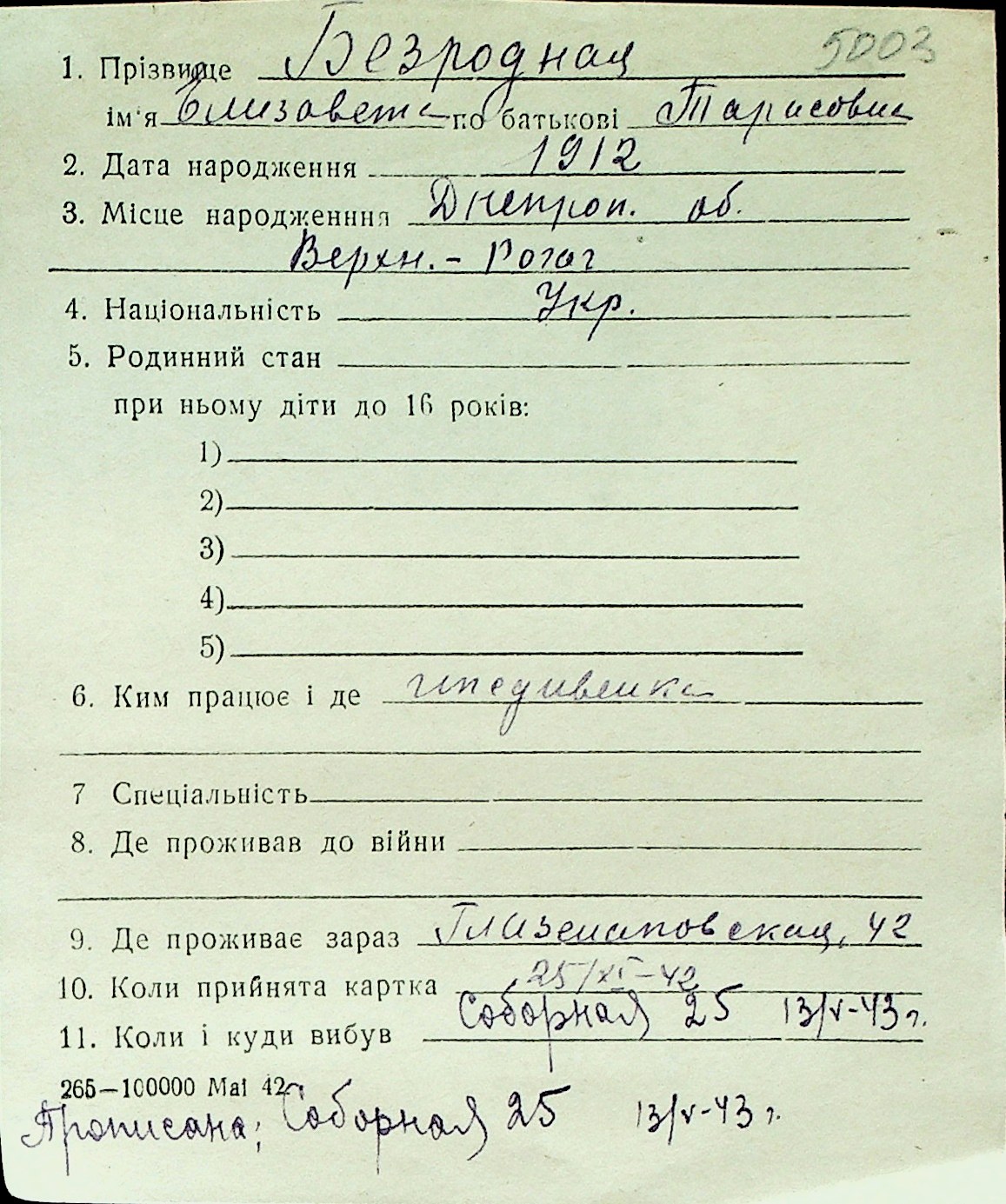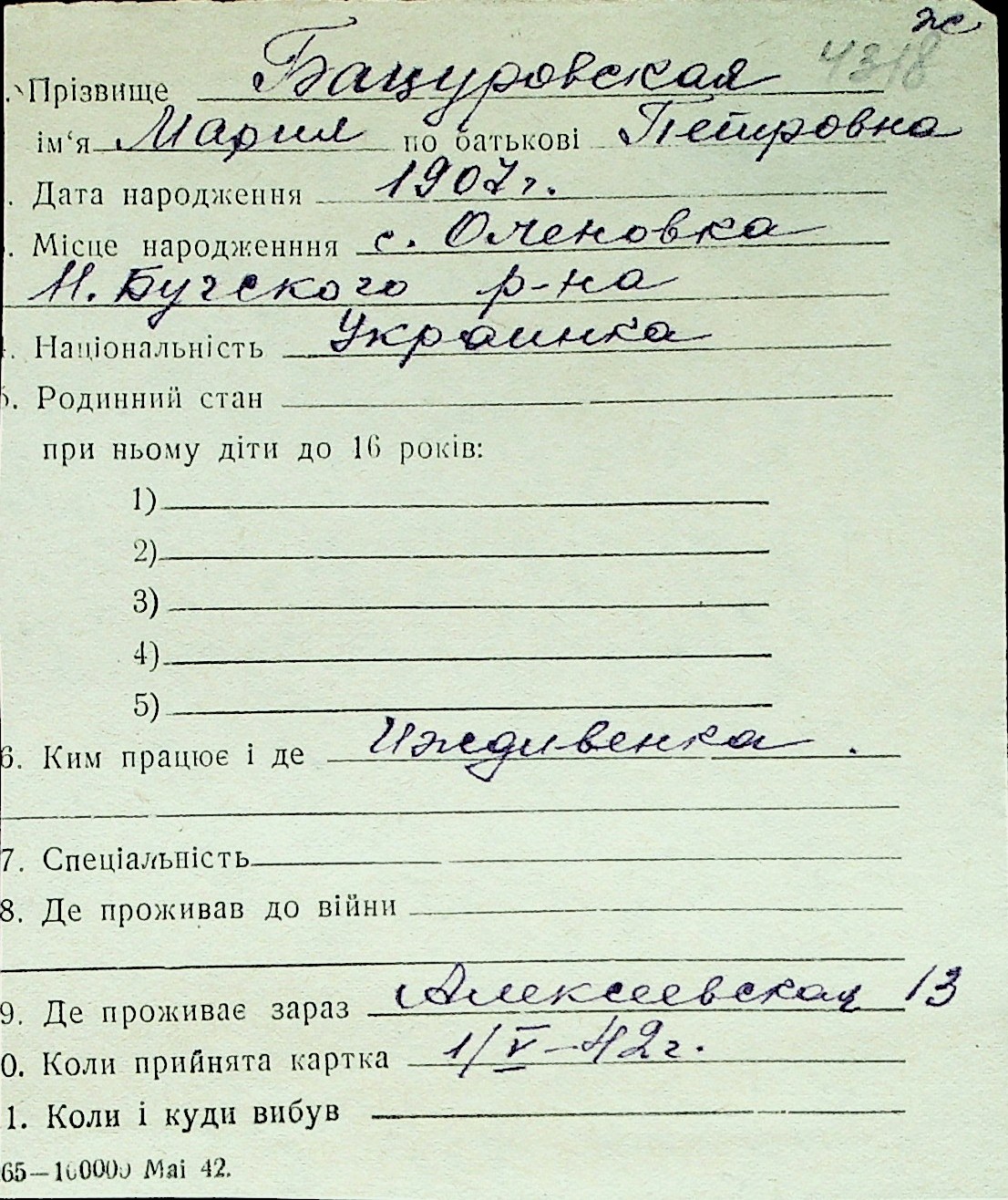 ◦ ◦ Перелік карток на осіб, які мешкали у м. Миколаїв у період окупації 1941–1944 років