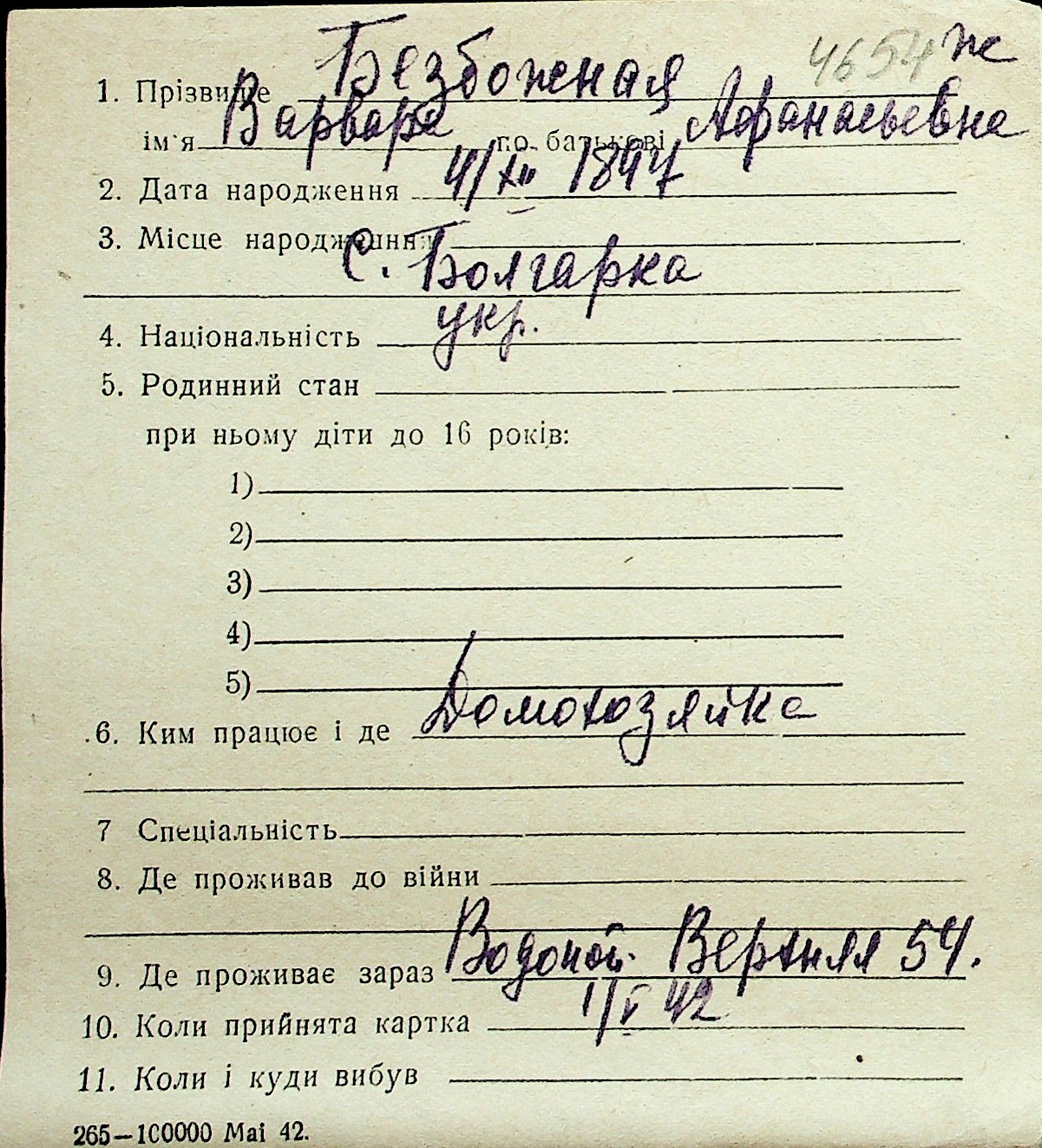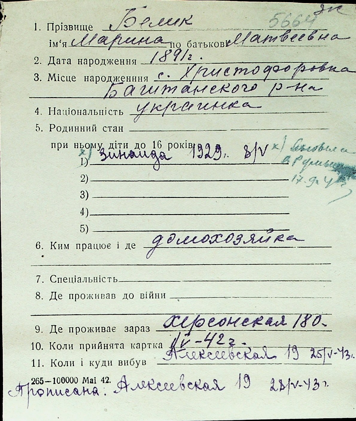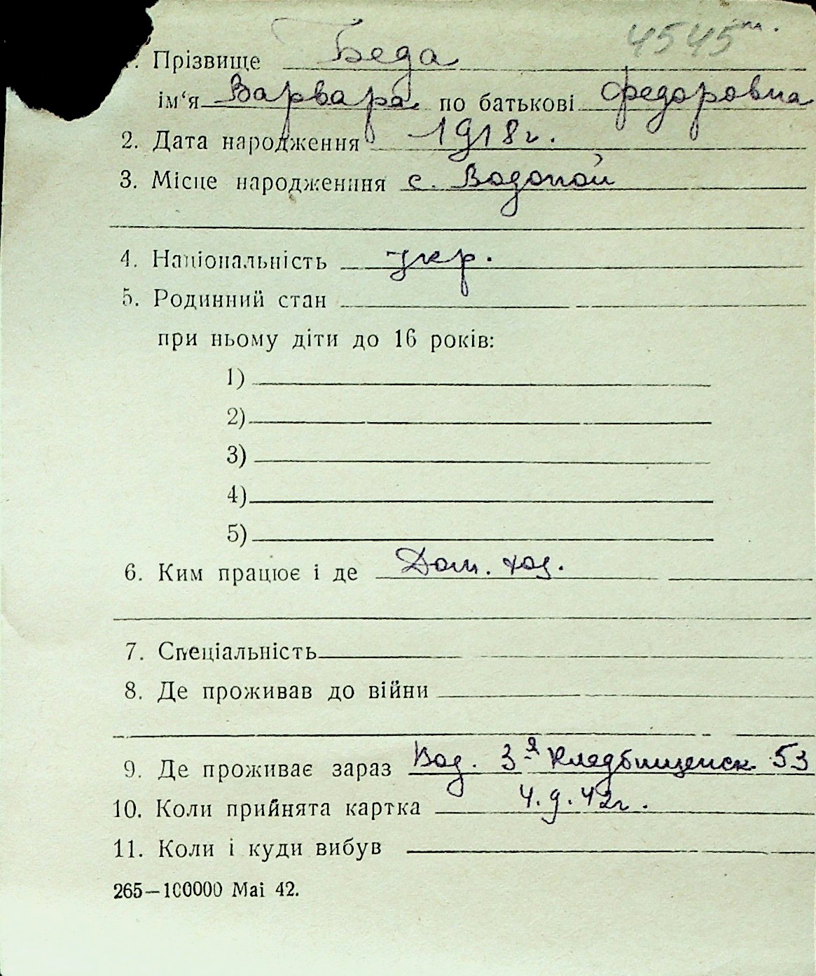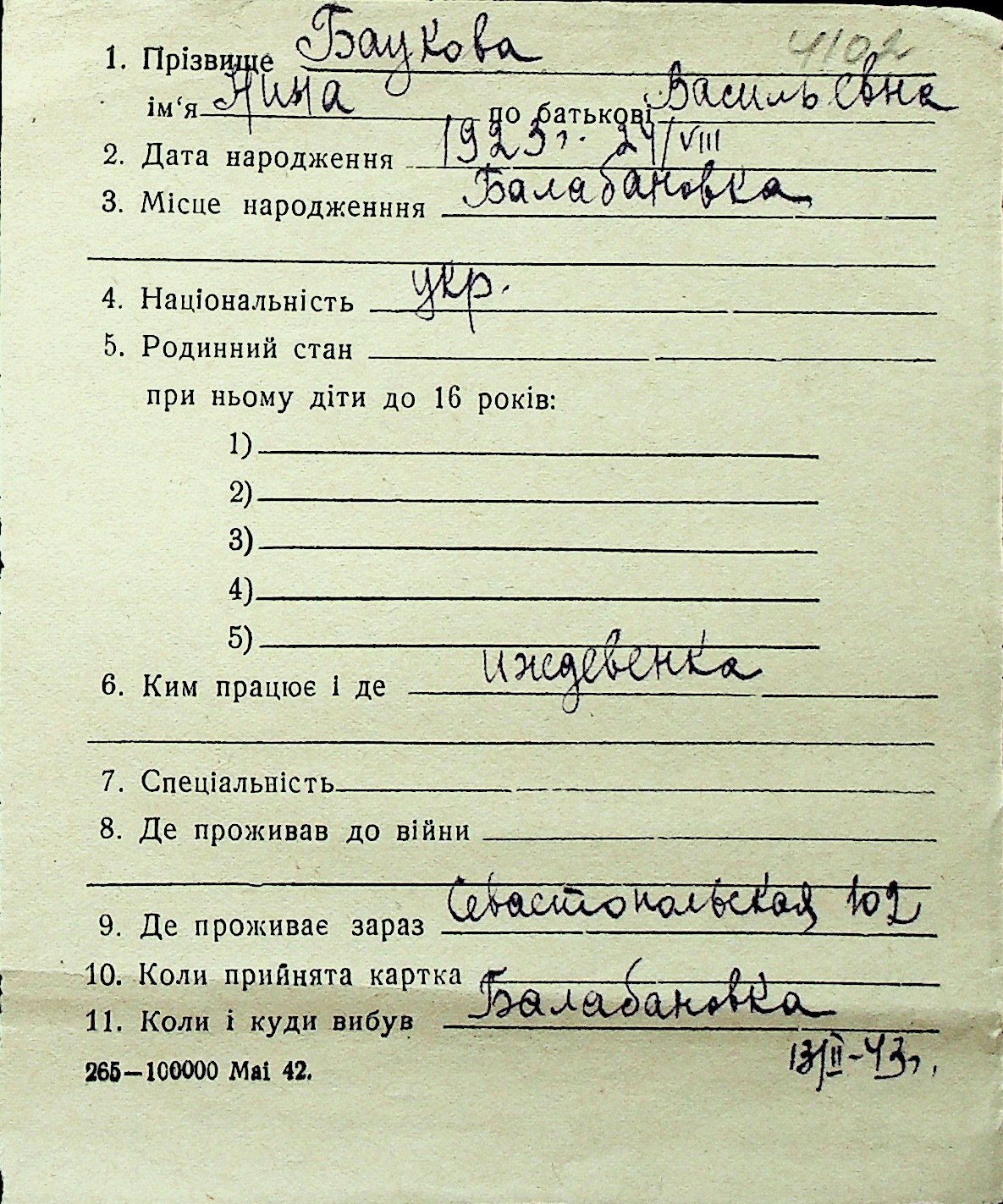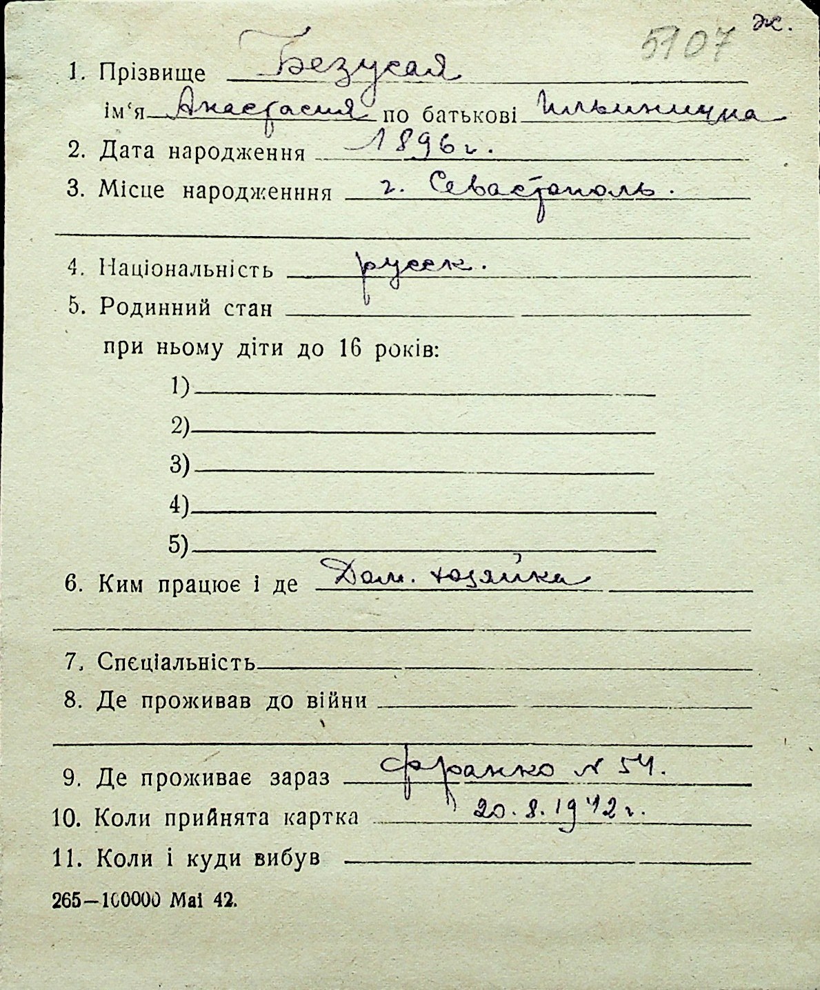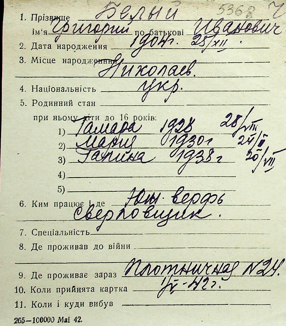 ◦ ◦ Перелік карток на осіб, які мешкали у м. Миколаїв у період окупації 1941–1944 років