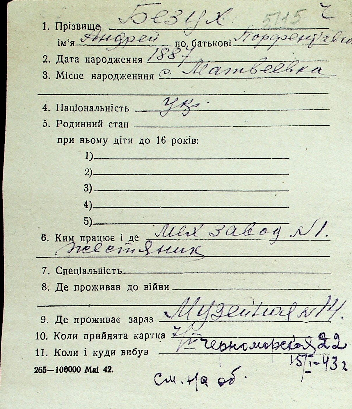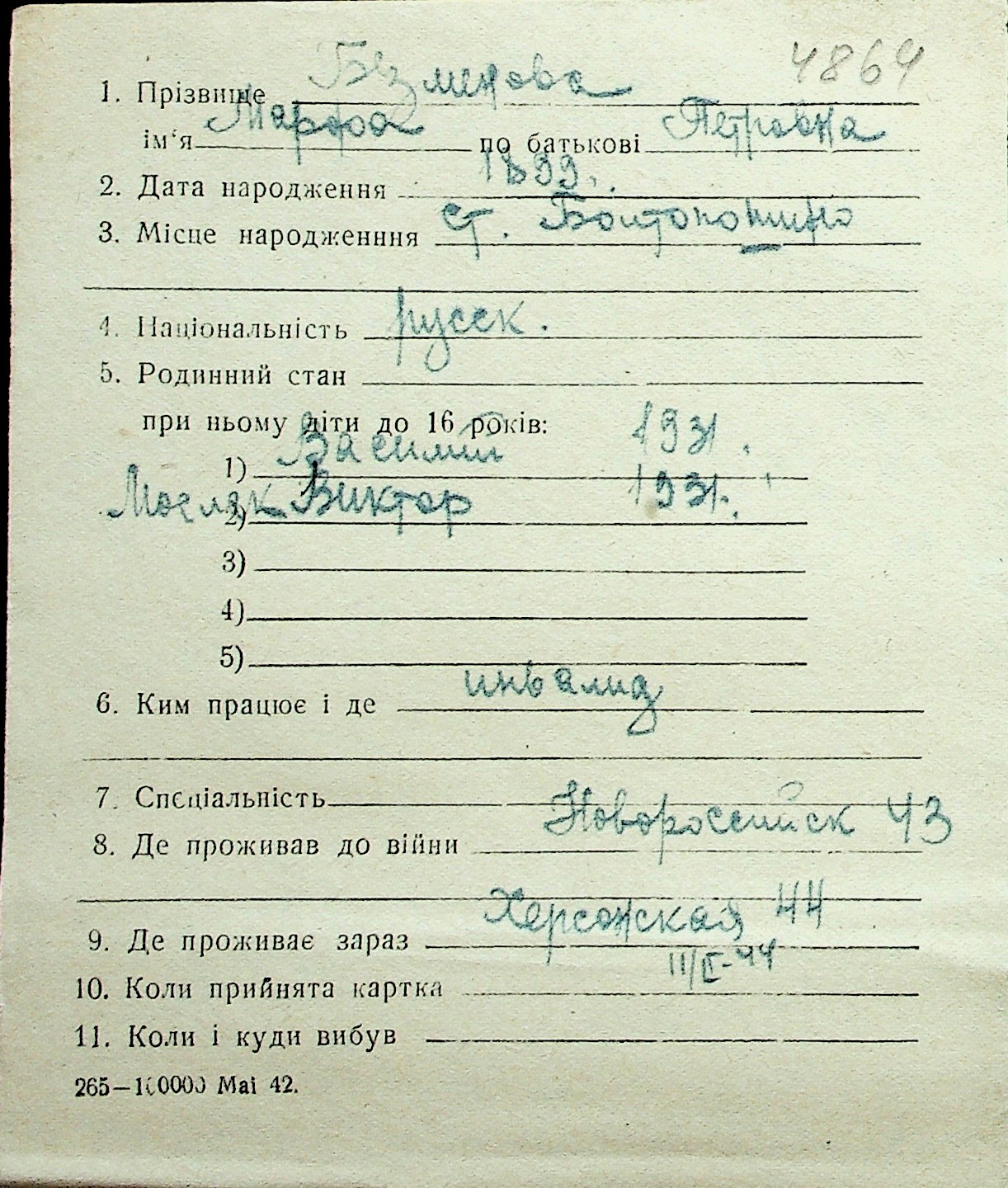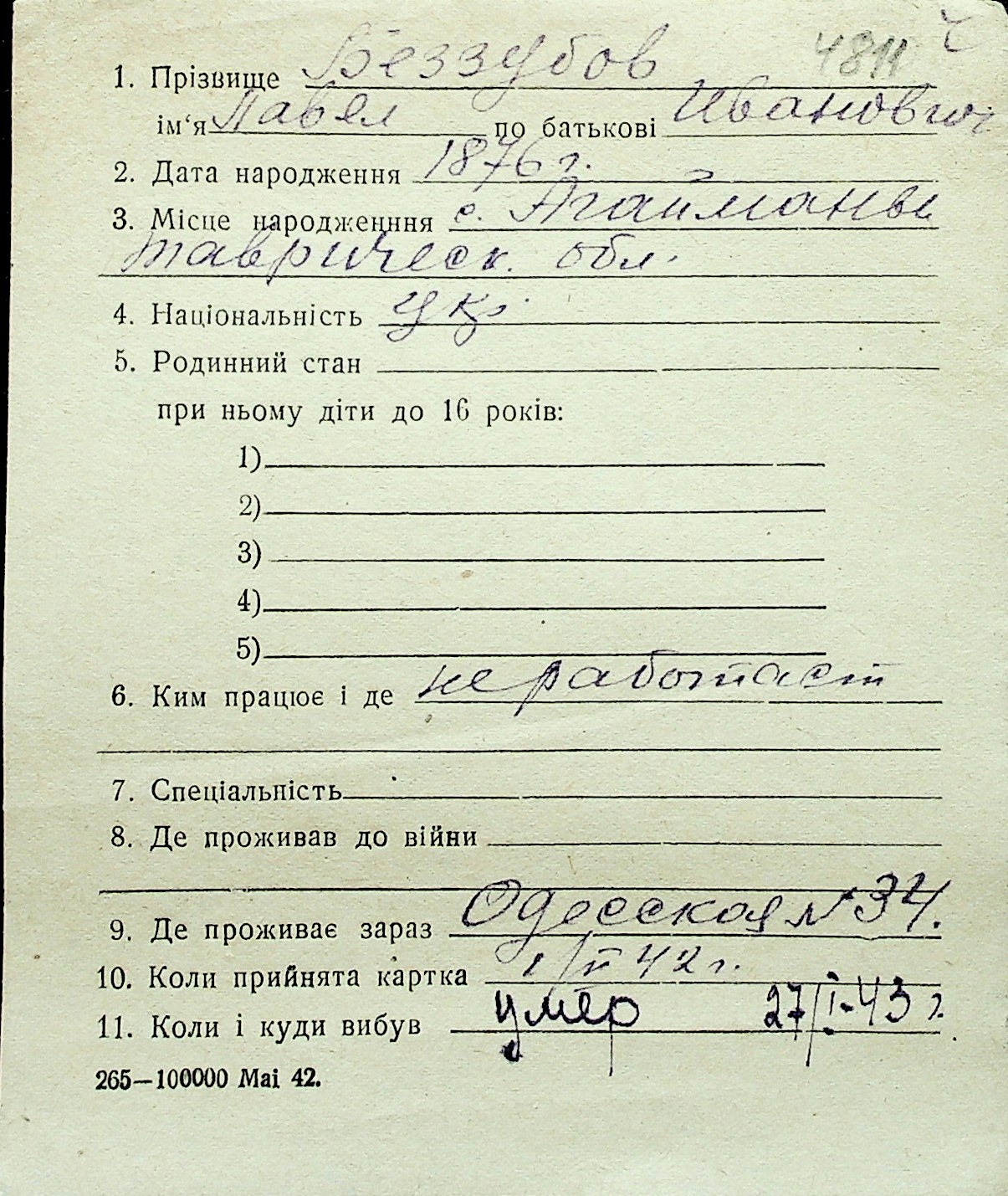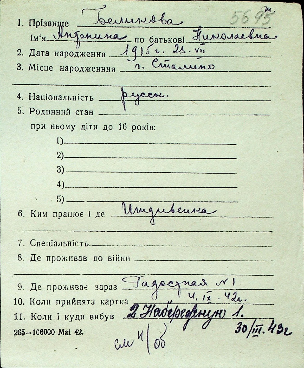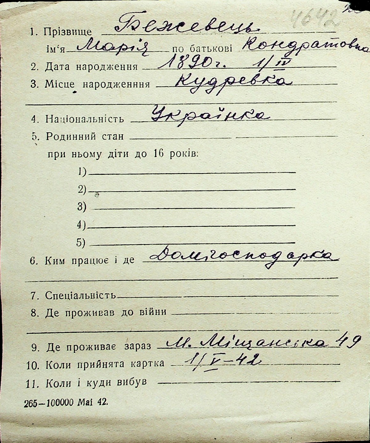 ◦ ◦ Перелік карток на осіб, які мешкали у м. Миколаїв у період окупації 1941–1944 років