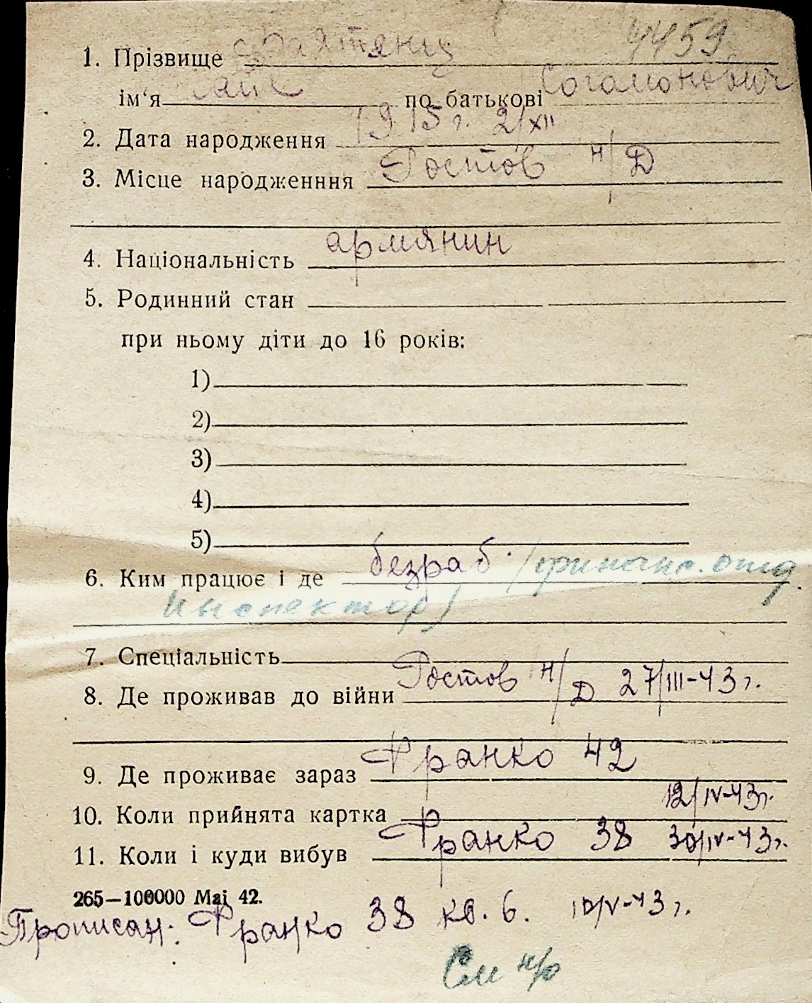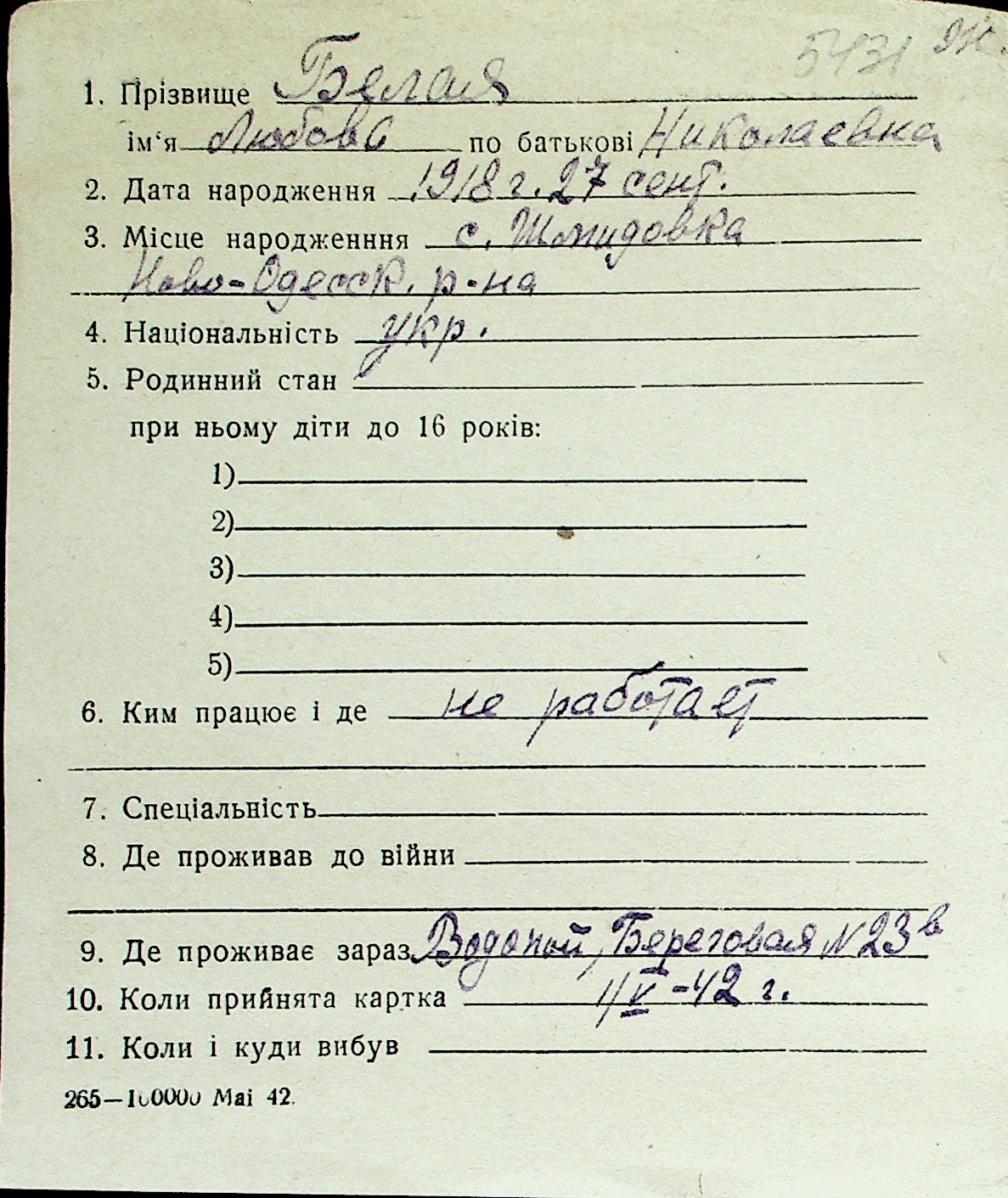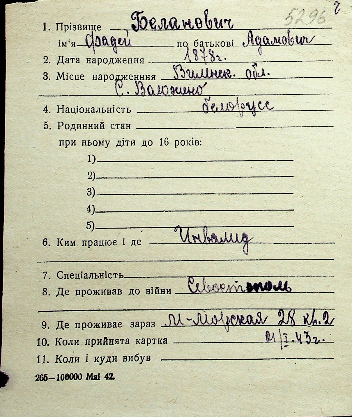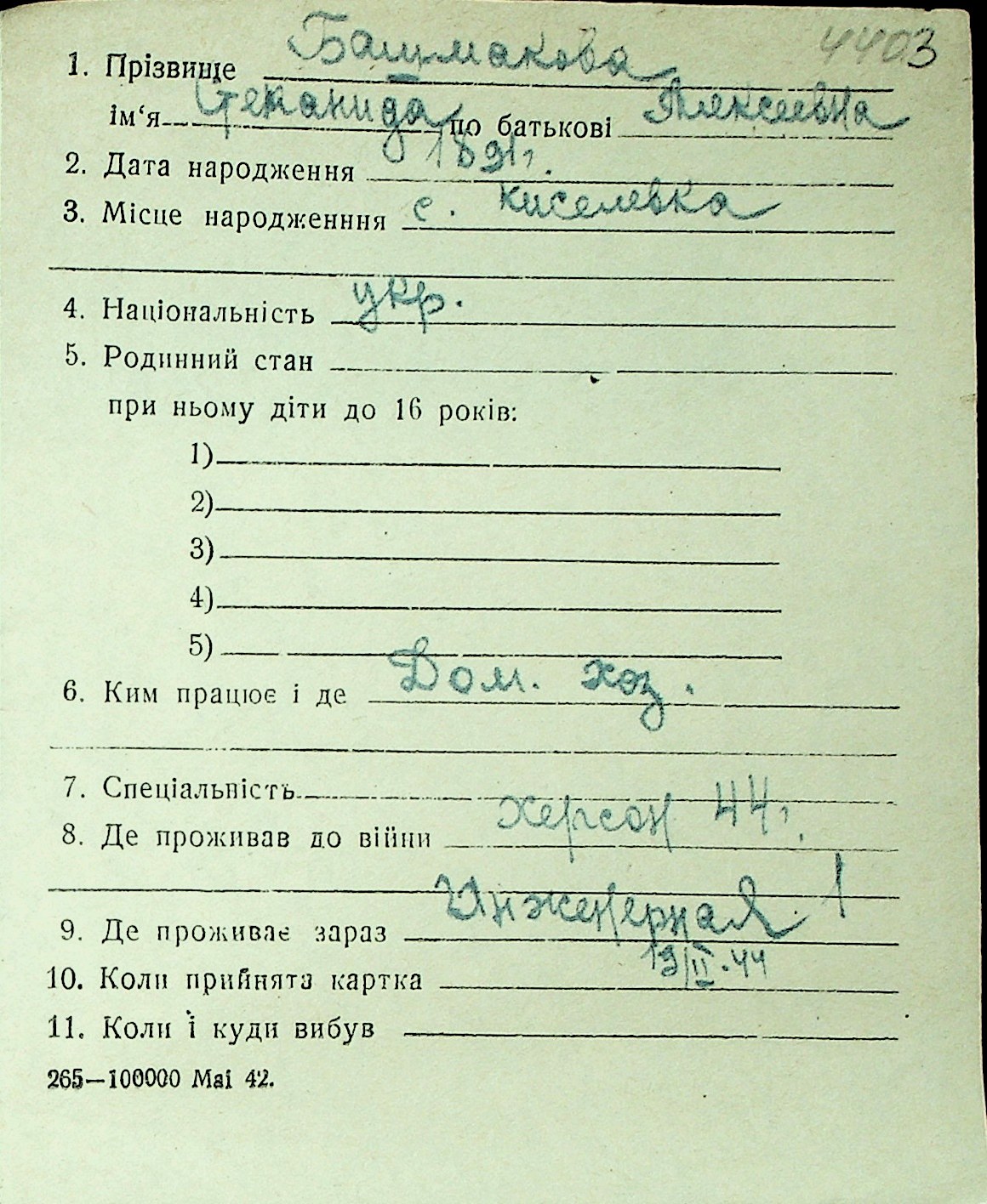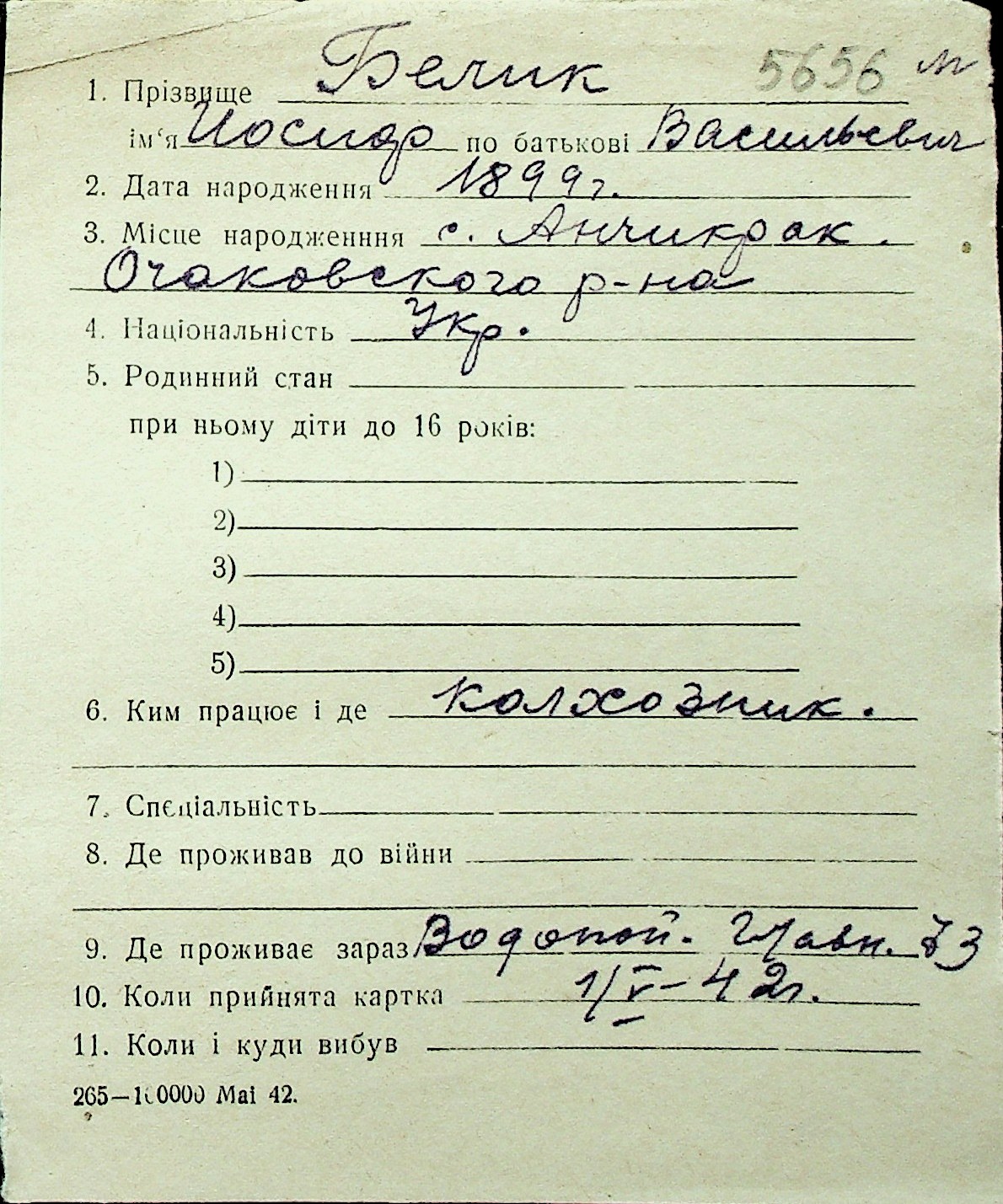 ◦ ◦ Перелік карток на осіб, які мешкали у м. Миколаїв у період окупації 1941–1944 років