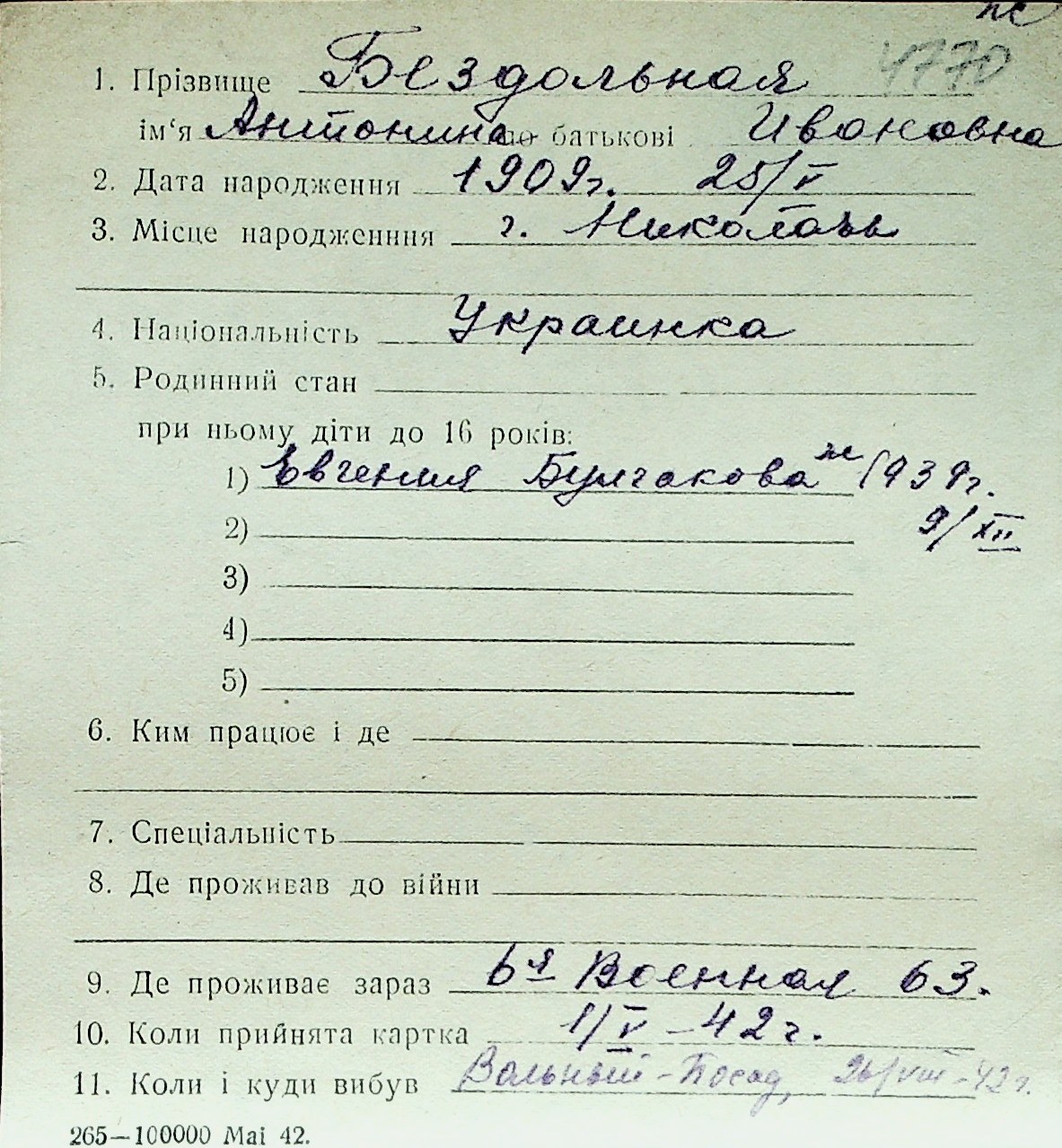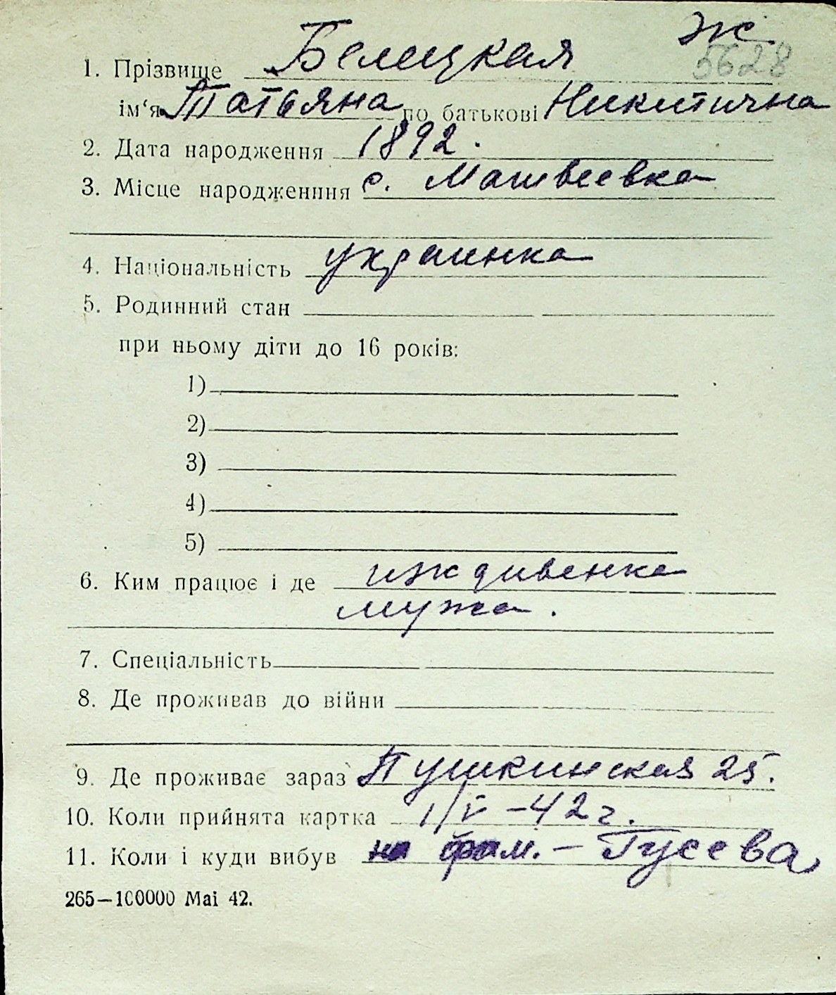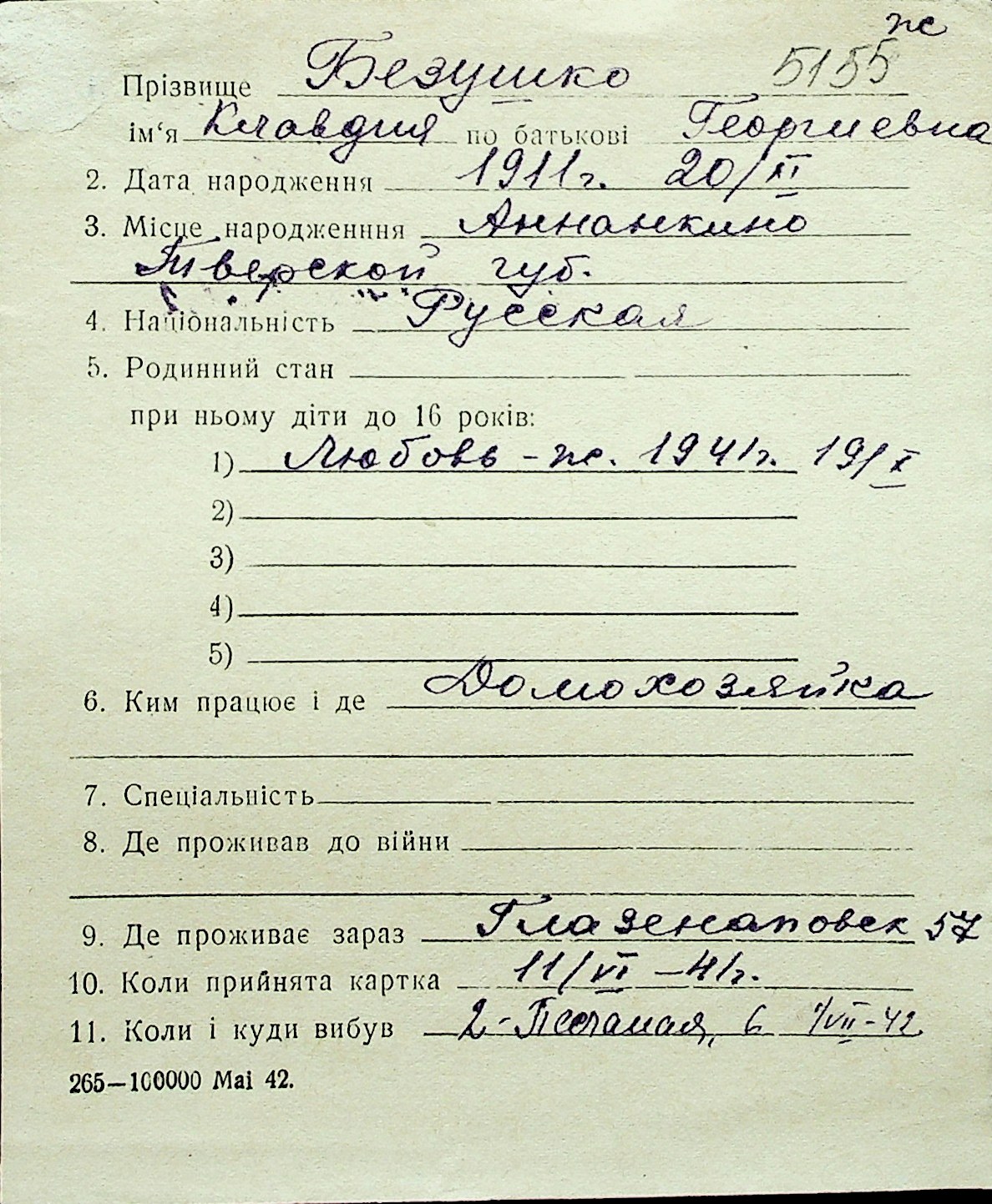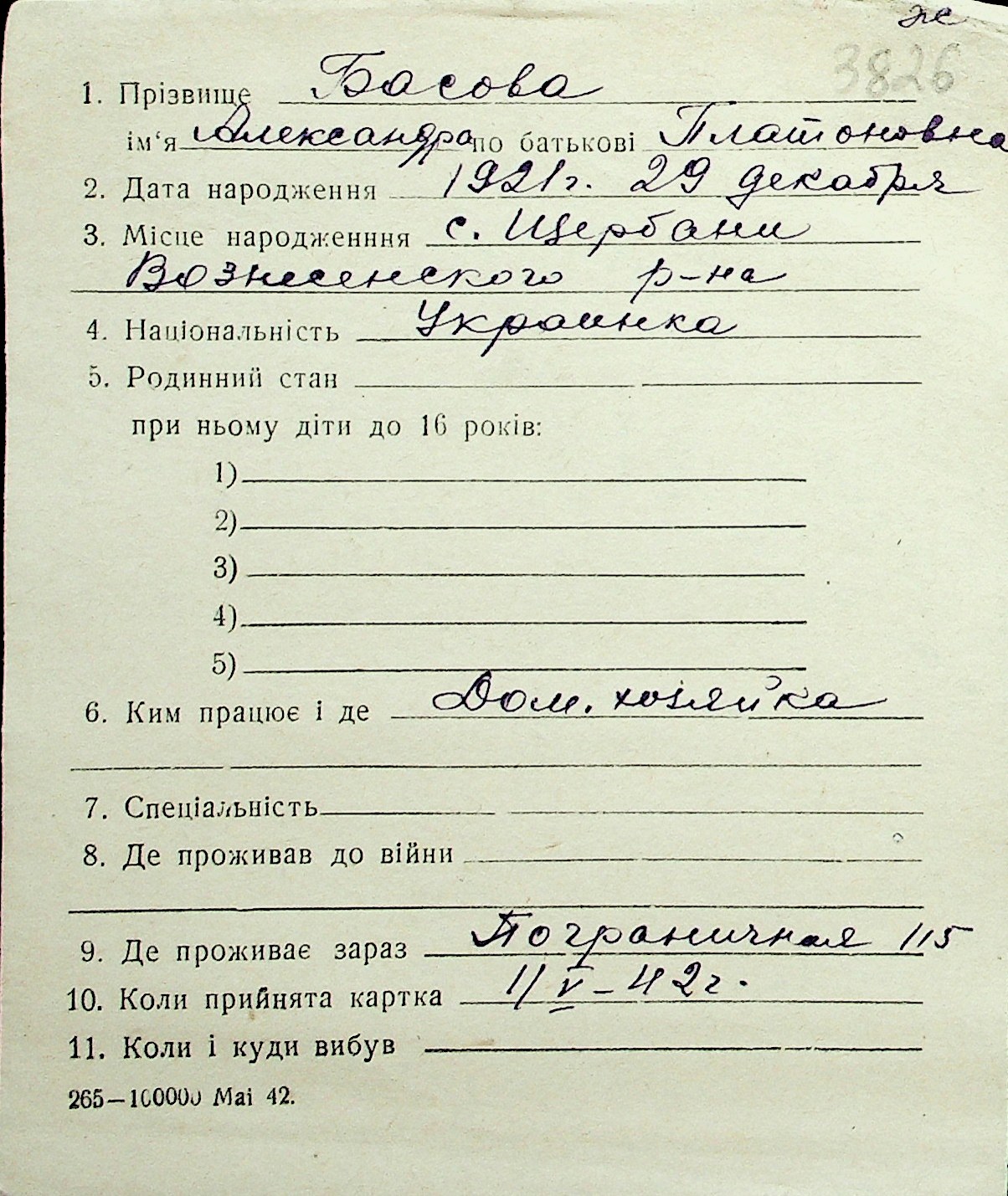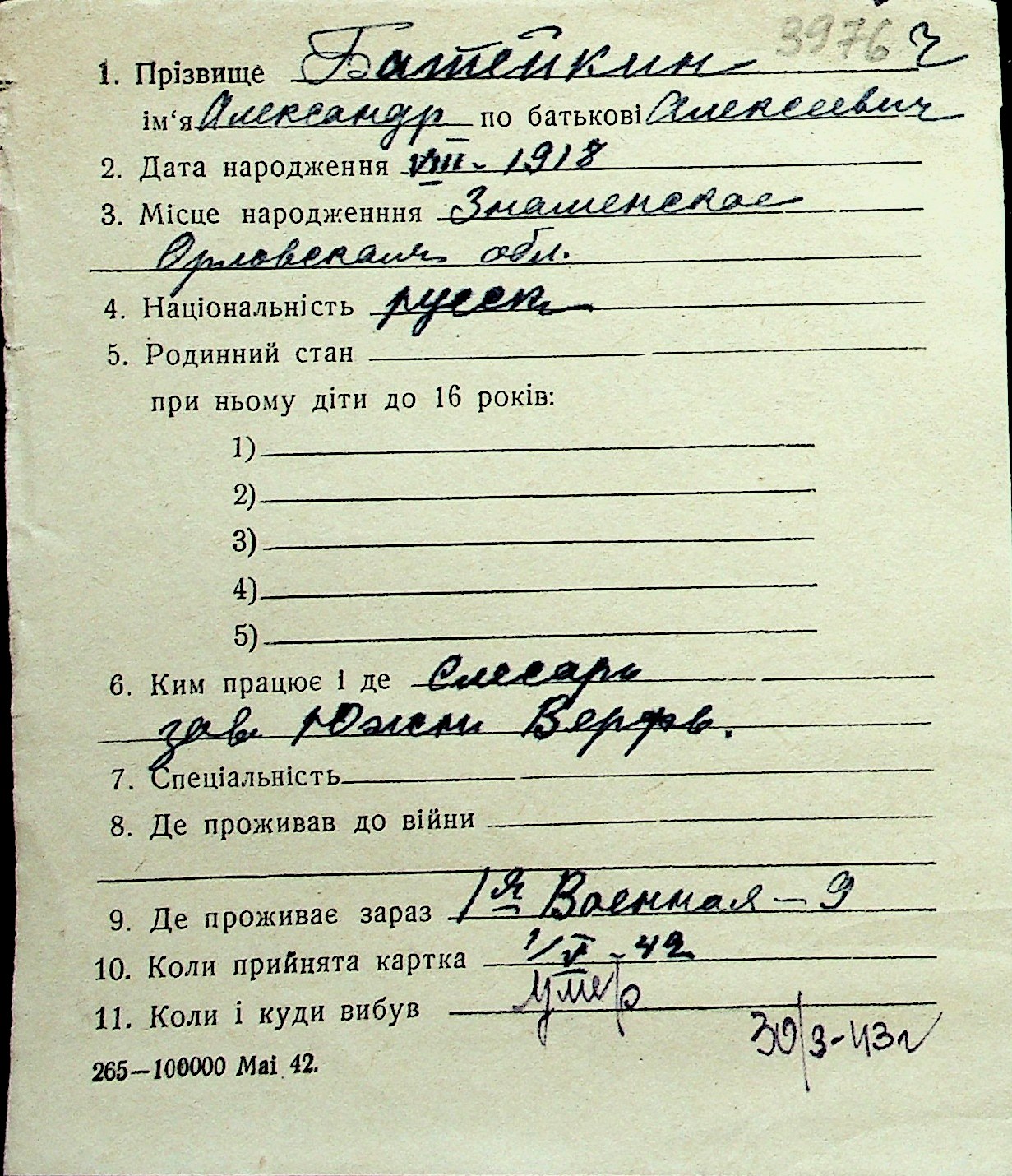 ◦ ◦ Перелік карток на осіб, які мешкали у м. Миколаїв у період окупації 1941–1944 років