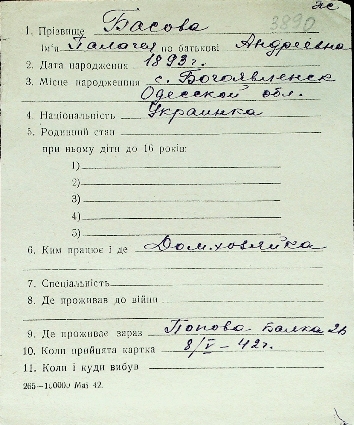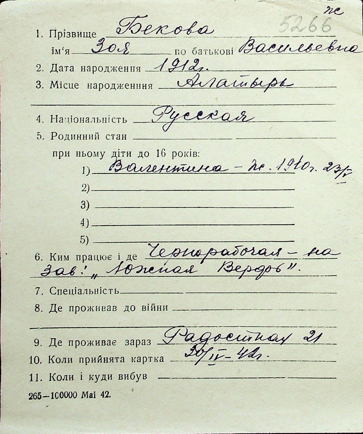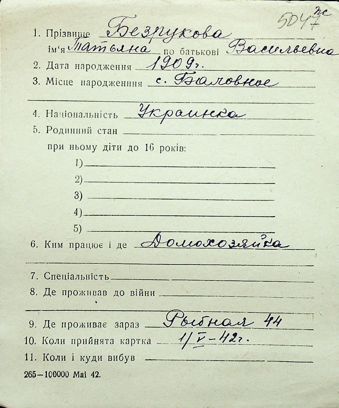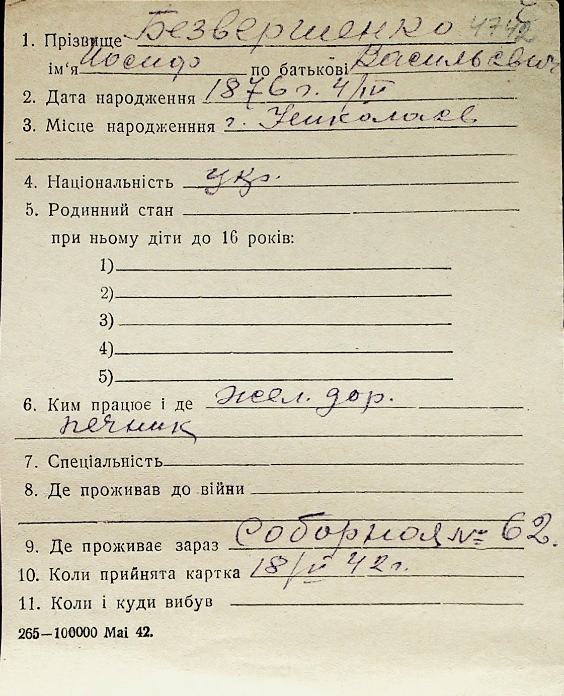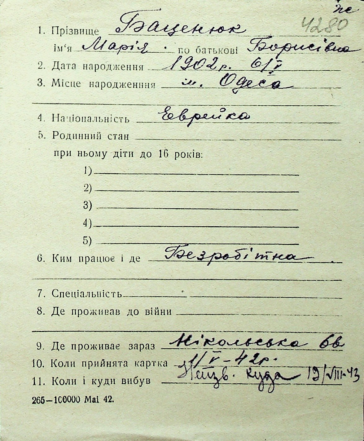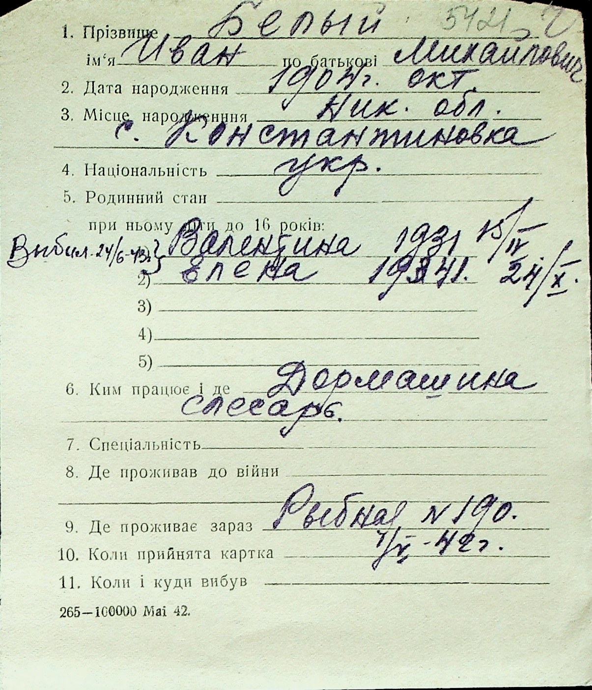 ◦ ◦ Перелік карток на осіб, які мешкали у м. Миколаїв у період окупації 1941–1944 років